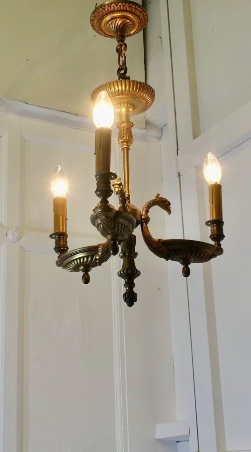 French Gilt Brass Bouillotte Library Ceiling Light A lovely piece, adapted from an original oil lamp, the lamp has 3 brass sconces, we can see the 3 secretary birds set on the oil reservoirs The lamp is now working on electricity and in good condition for its age The lamp is 24” tall, 14” in diameter NG180 Manufacture Date : 19th century Materials : Brass