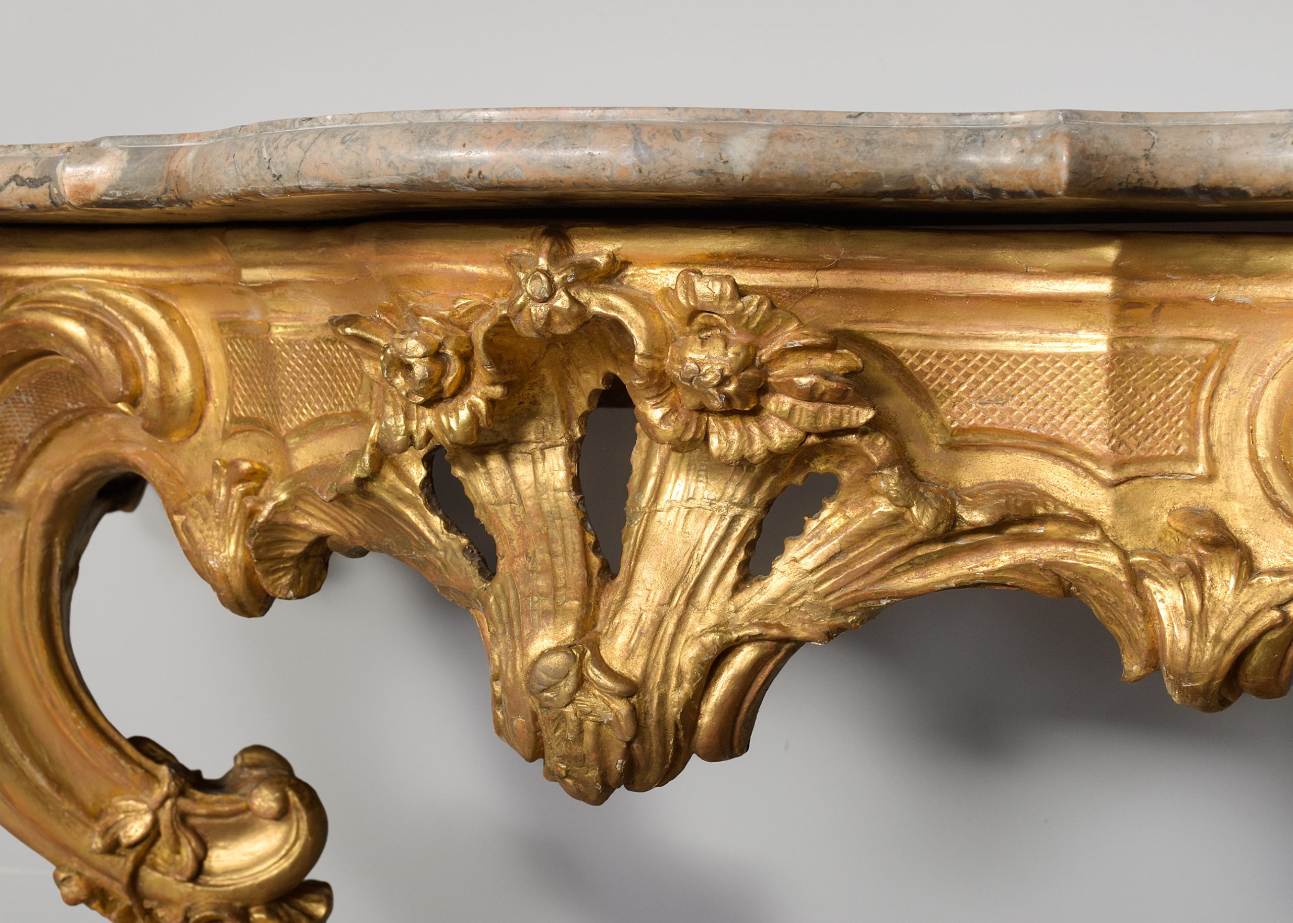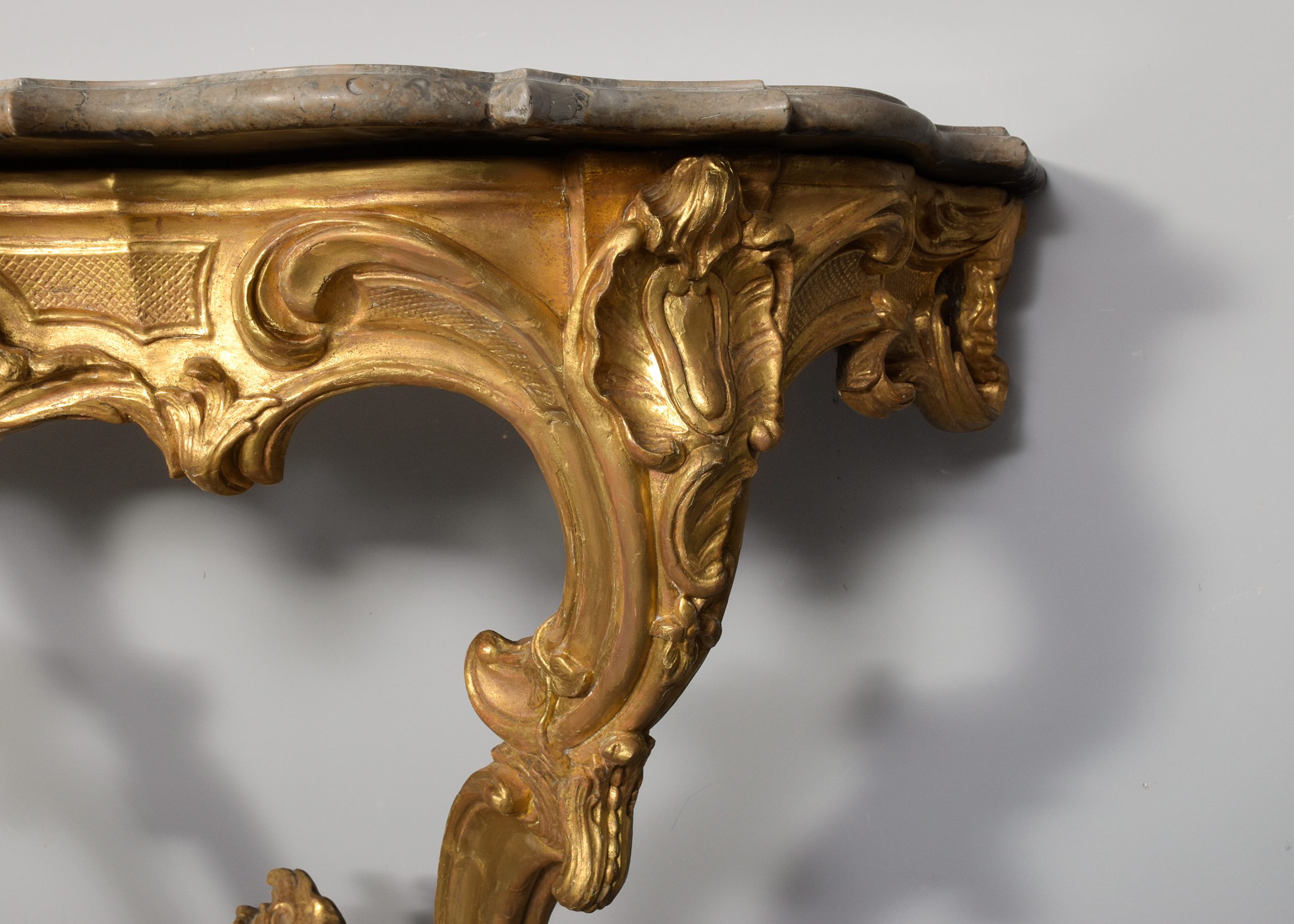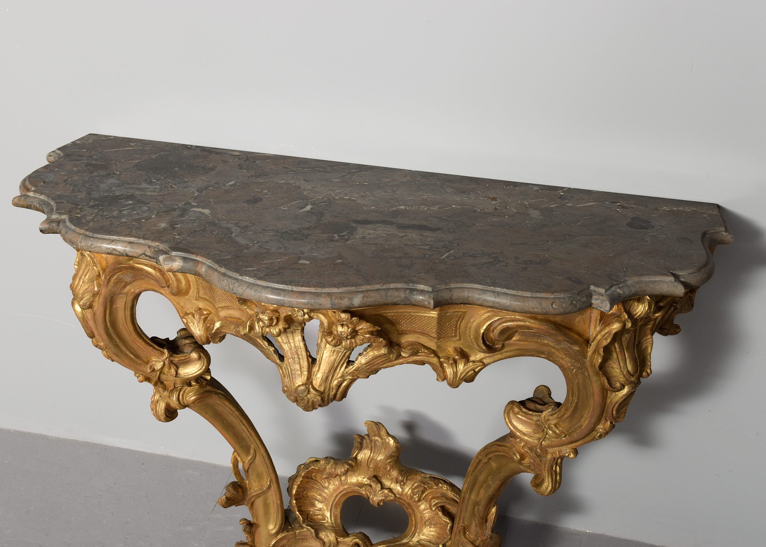 Circa 1780, French Giltwood and Grey Marble-Topped Console Table in the Rococo style, the serpentine variegated grey marble top with a moulded edge, on a well-carved and gilded base with elegant scrolling legs united by a