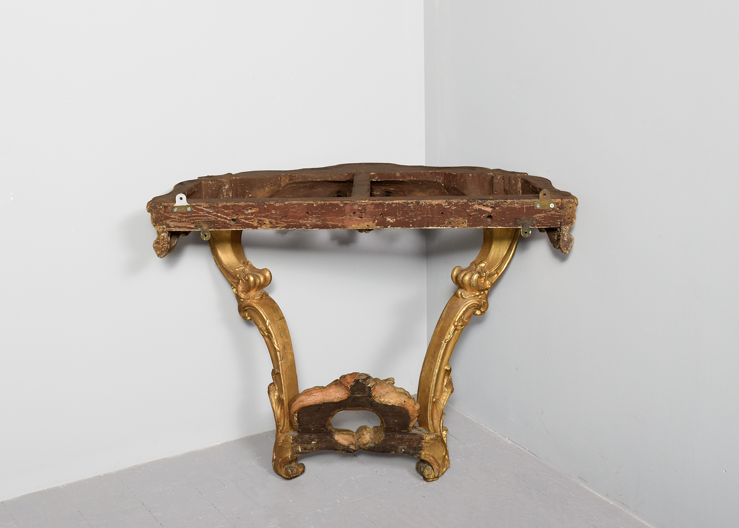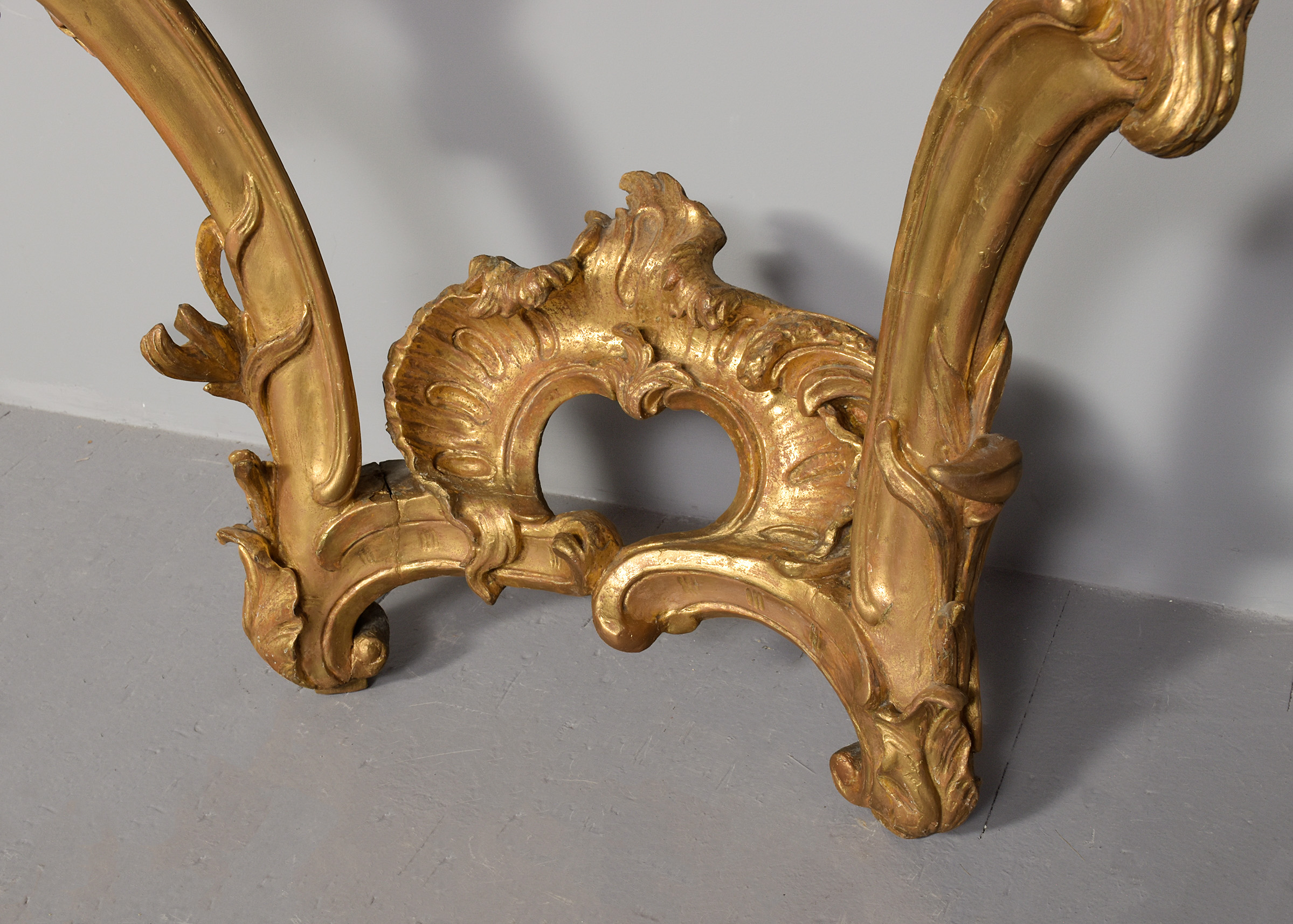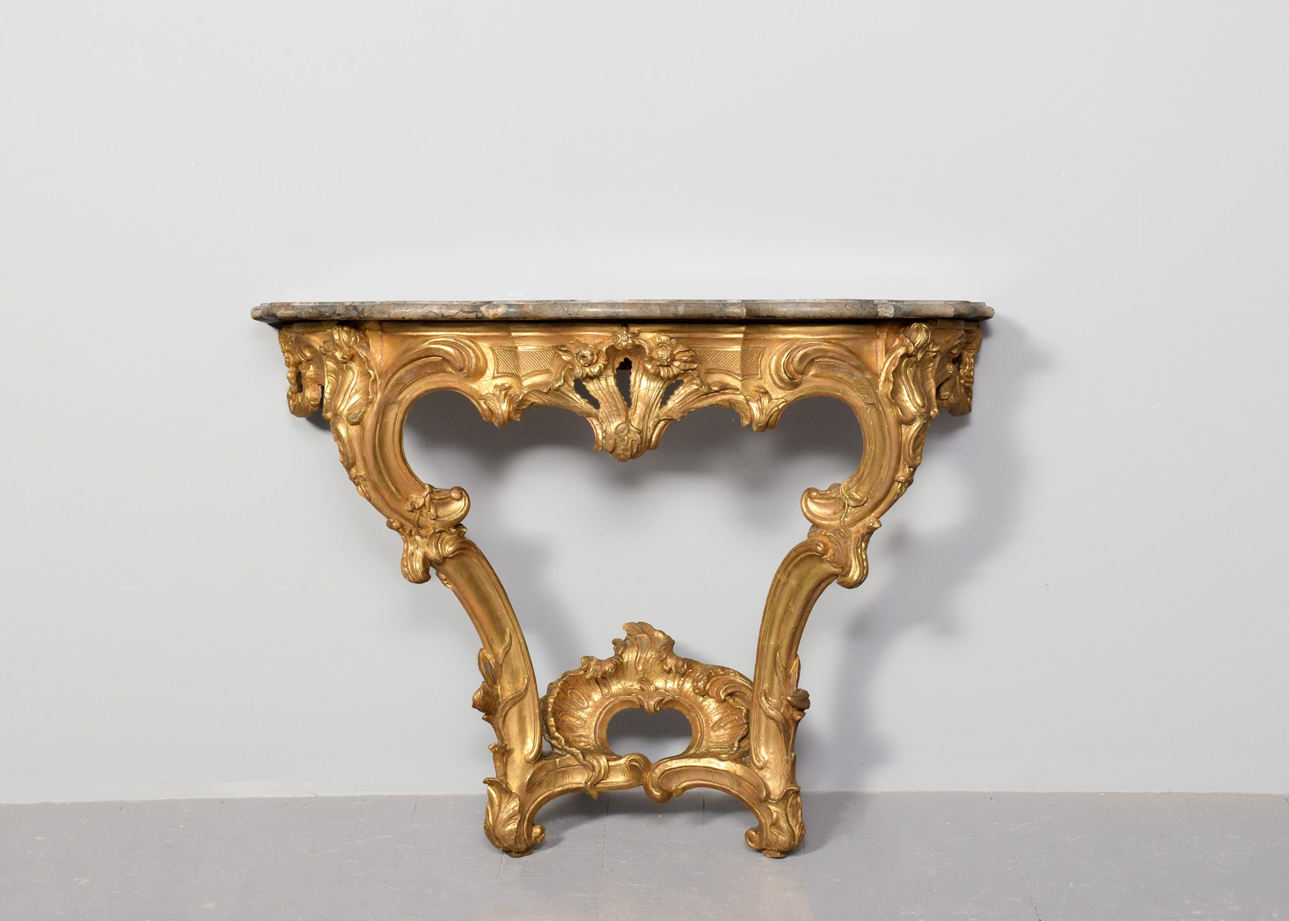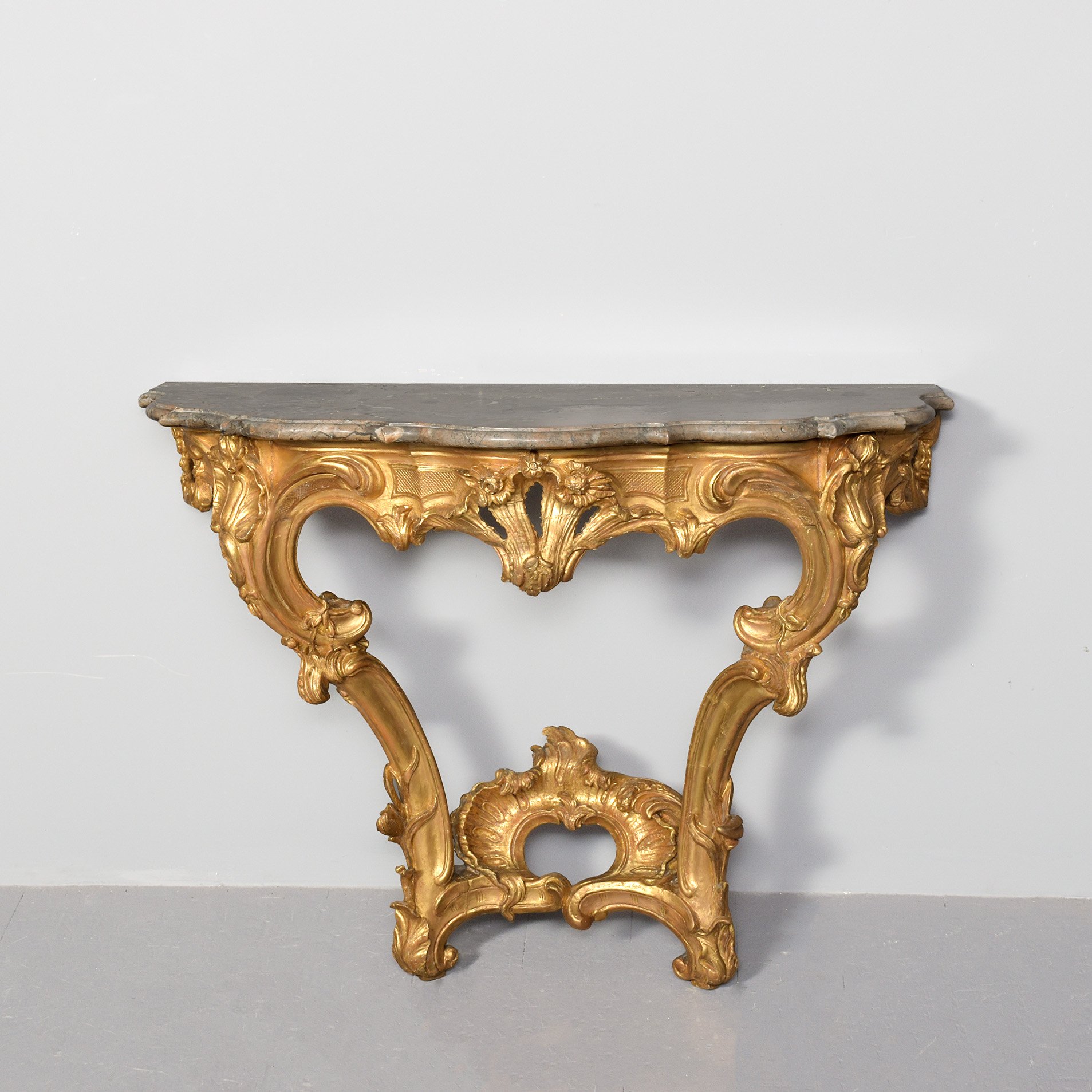 Circa 1780, French Giltwood and Grey Marble-Topped Console Table in the Rococo style, the serpentine variegated grey marble top with a moulded edge, on a well-carved and gilded base with elegant scrolling legs united by a