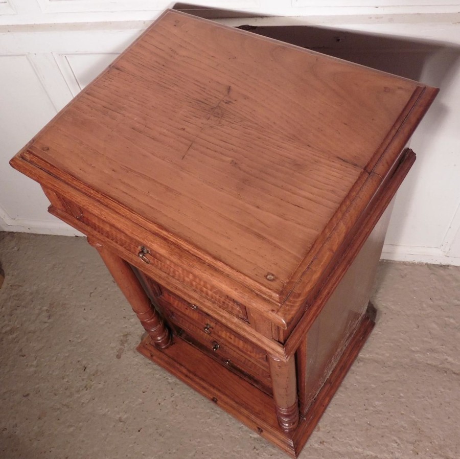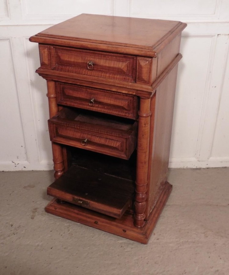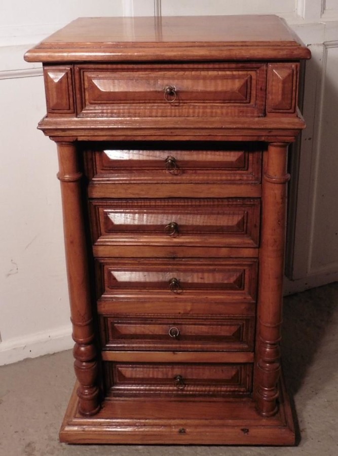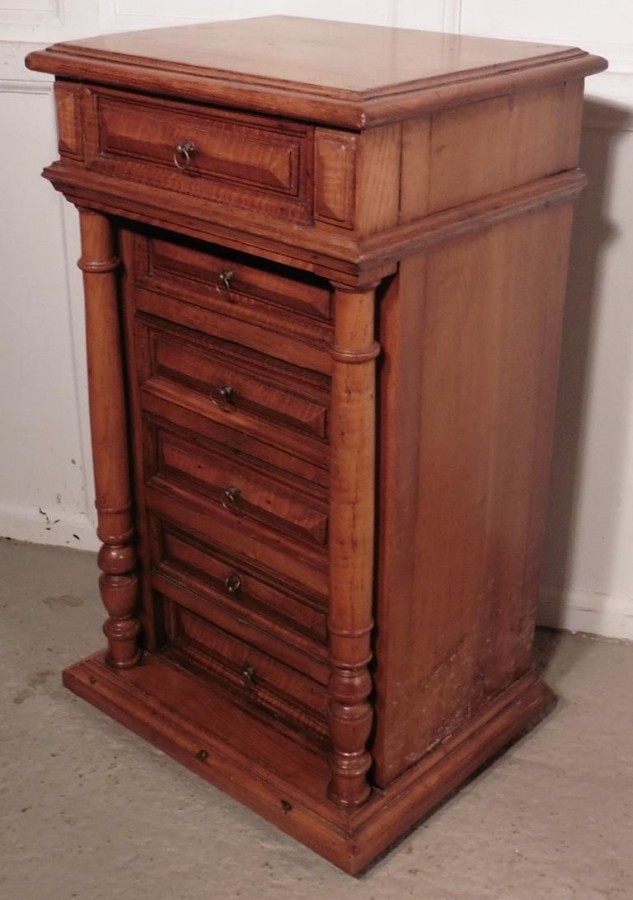 French golden oak bedside cabinet or night table. This piece is a very attractive piece made in Golden Oak and Fruitwood, it appears to have 6 drawers to the front, but 2 of the drawer fronts are in fact a fall front cupboard, the cabinet stands on a raised plinth and has a moulded edge to the top. The Night Table is in good antique condition, it is 31” tall, 18” wide and 15” deep. NC35 Manufacture Date : 1880 Materials : Oak