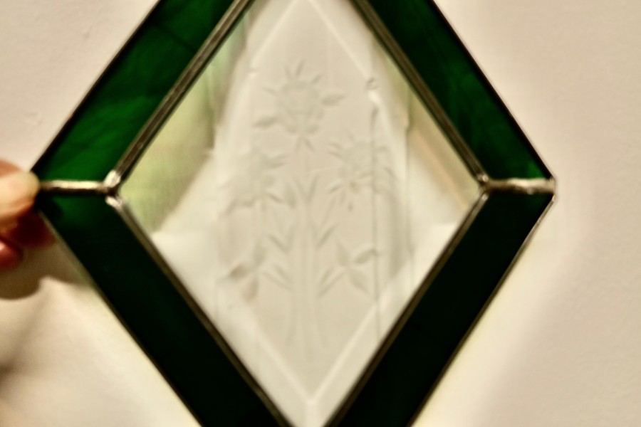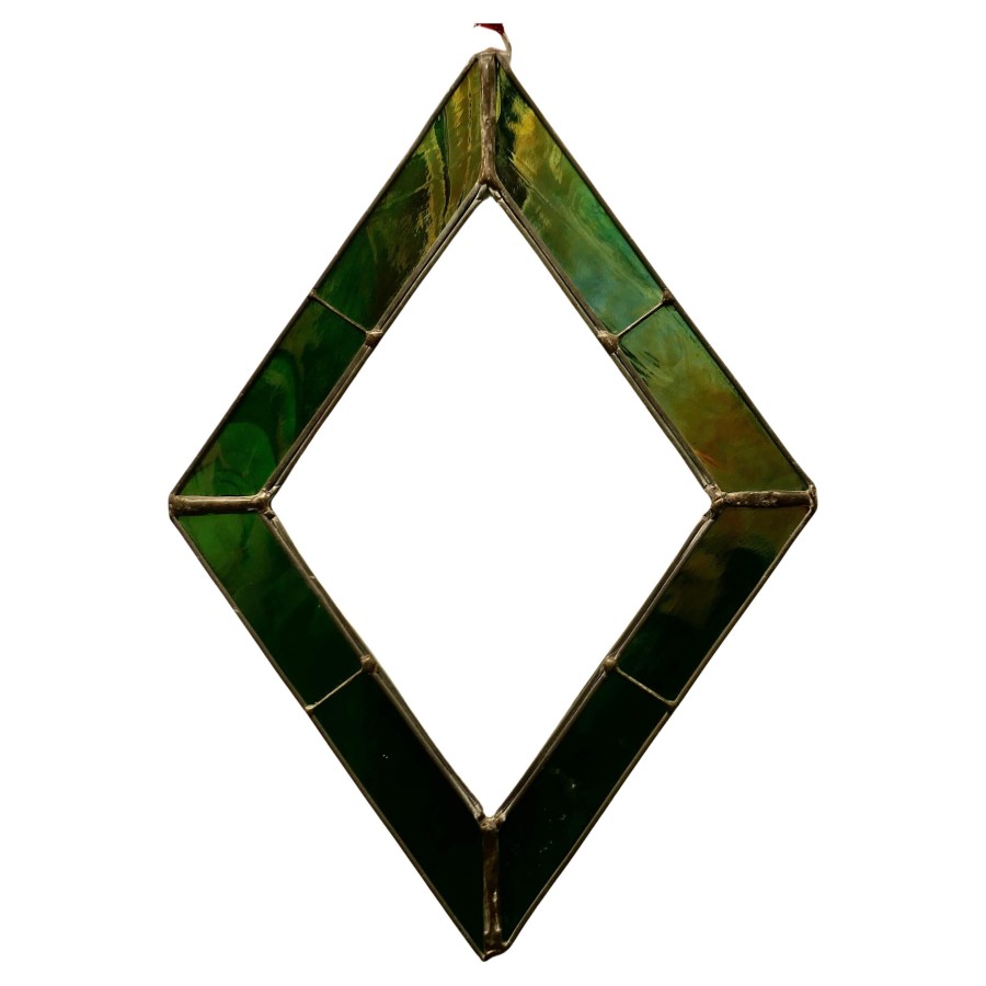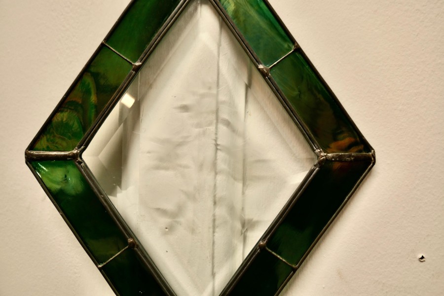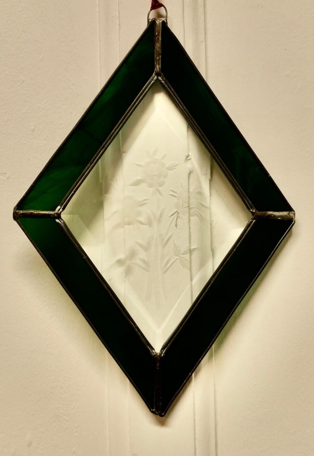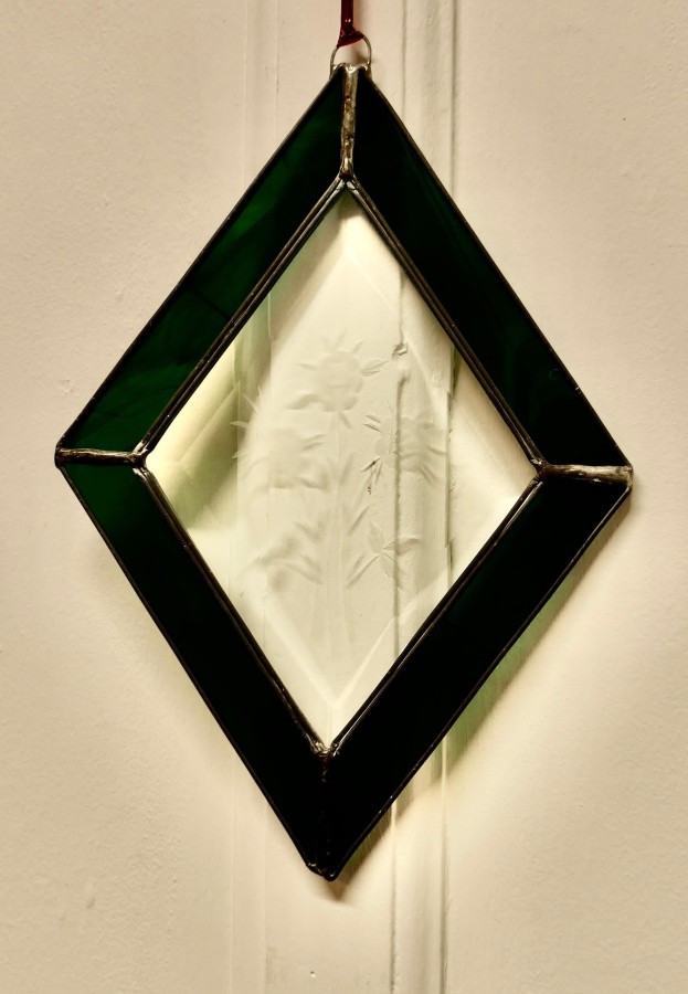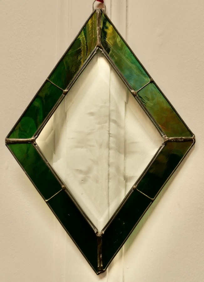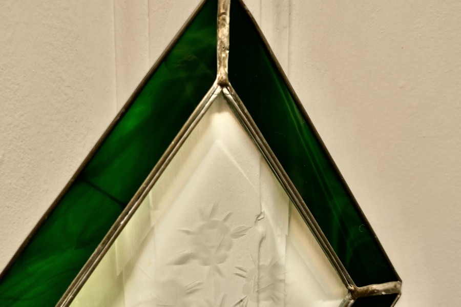 French hand made antique stained glass window panel This lovely Artisan made piece has been made from 19th century Green Iridescent and Etched Glass, skilfully set to make a Diamond shaped pattern The Panel is a one off, there is only one like this one The prettiest Christmas decoration or sun catcher This Panel is 12” long and 9” wide CC183. Manufacture Date : 1960 Materials : Art-glass