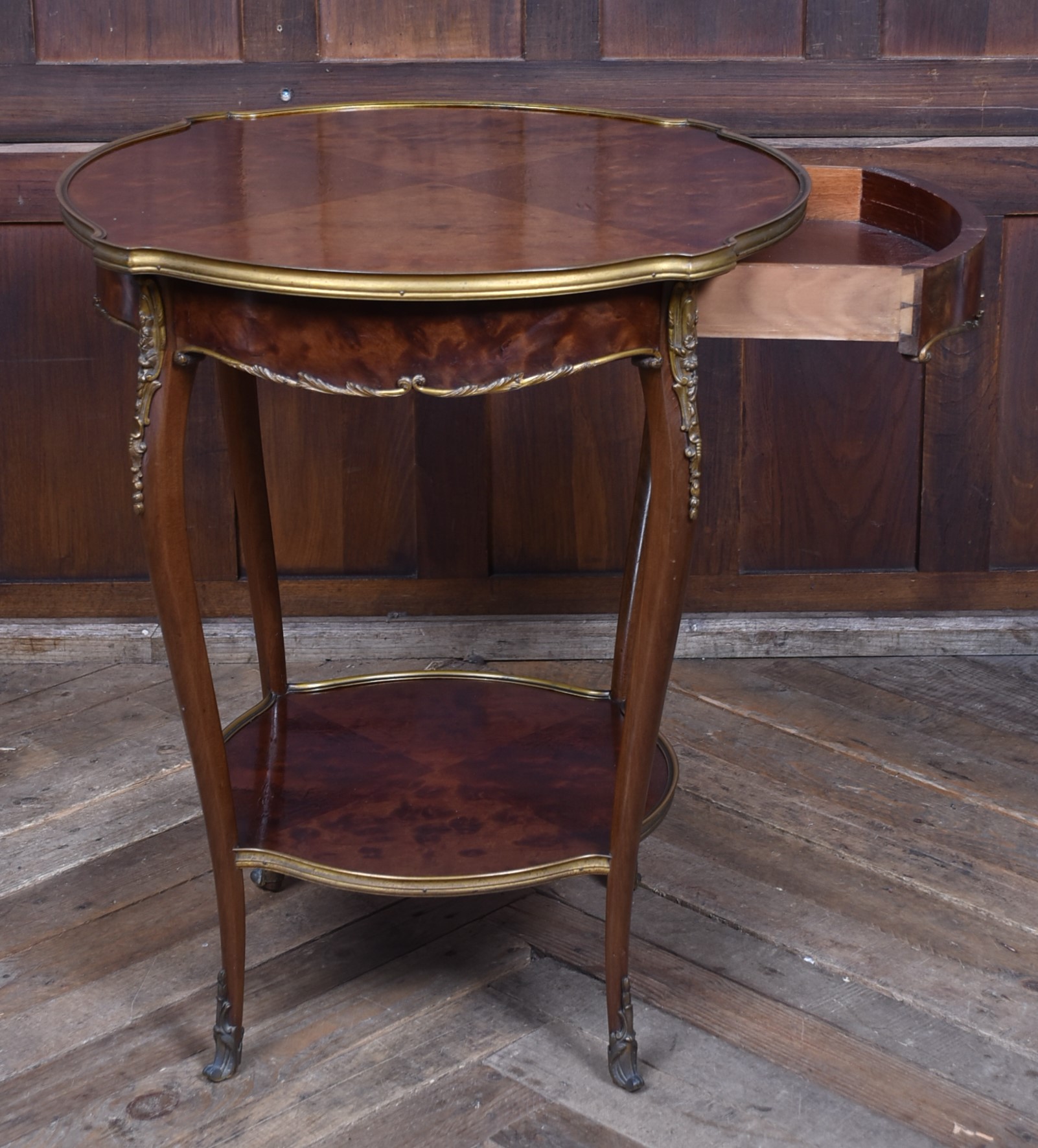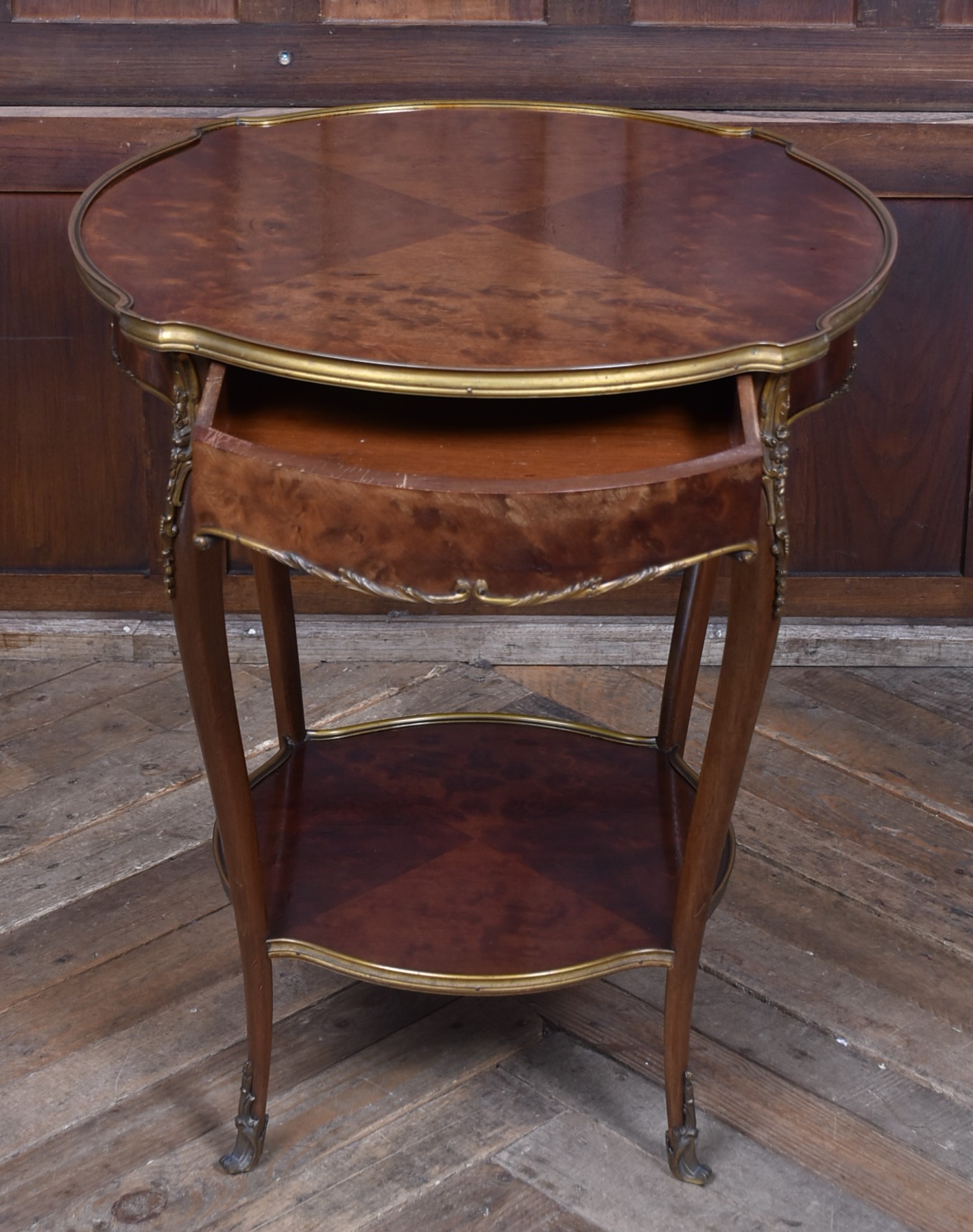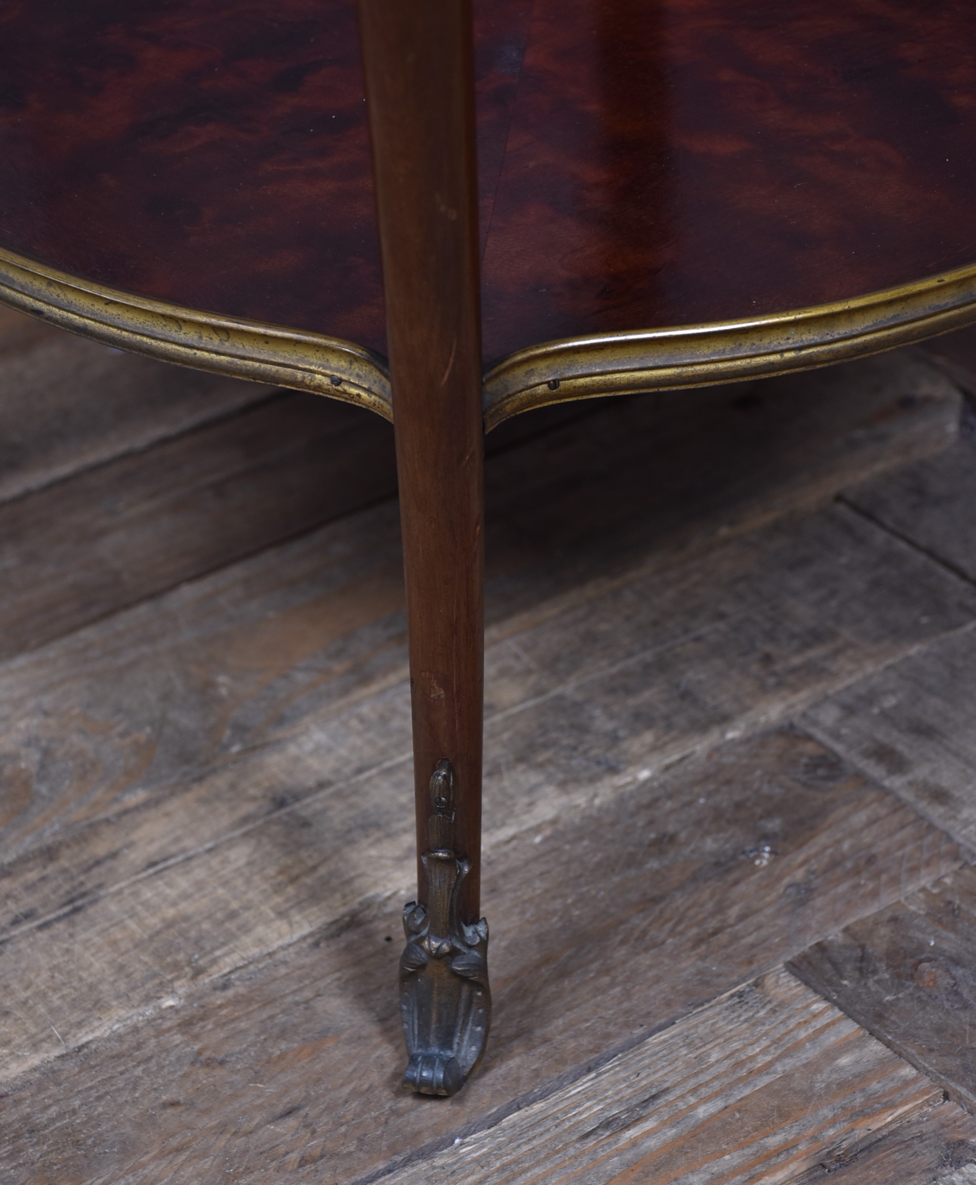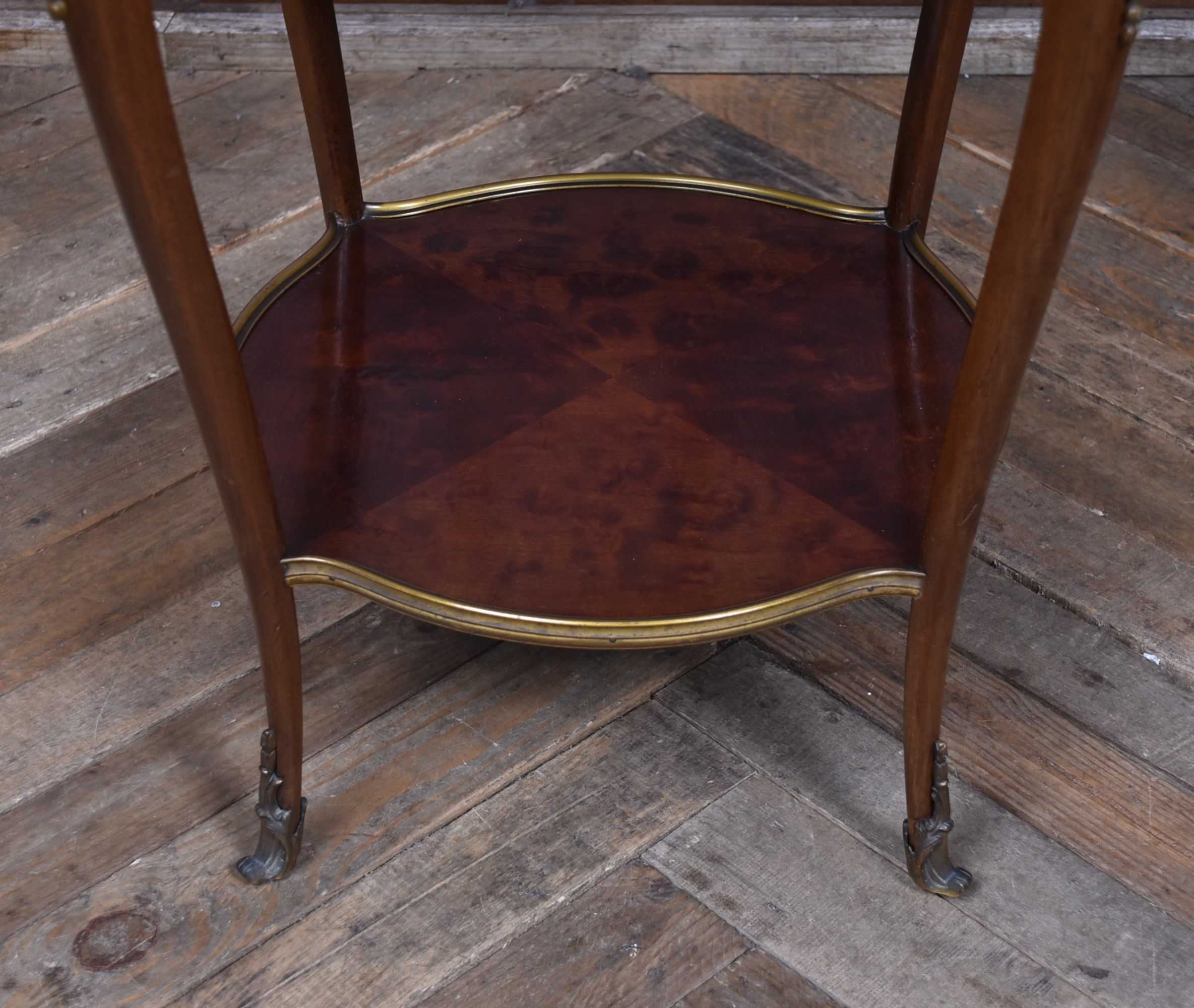 A stunning French Louis XV–style occasional table, beautifully crafted from mahogany and presented in excellent antique condition. The top features striking quadrant veneers that showcase the natural grain, all trimmed with a shaped brass edge. The frieze includes a neatly concealed drawer, seamlessly integrated into the design. The table stands on four graceful cabriole legs, each adorned with decorative brass mounts and finished with ornate sabots at the feet. A shaped lower tier mirrors the form of the top, providing both stability and an additional decorative element, also edged with brass. Elegant, well‑proportioned, and full of classic French charm, this piece works beautifully as a lamp table, bedside, or accent table in both traditional and eclectic interiors.