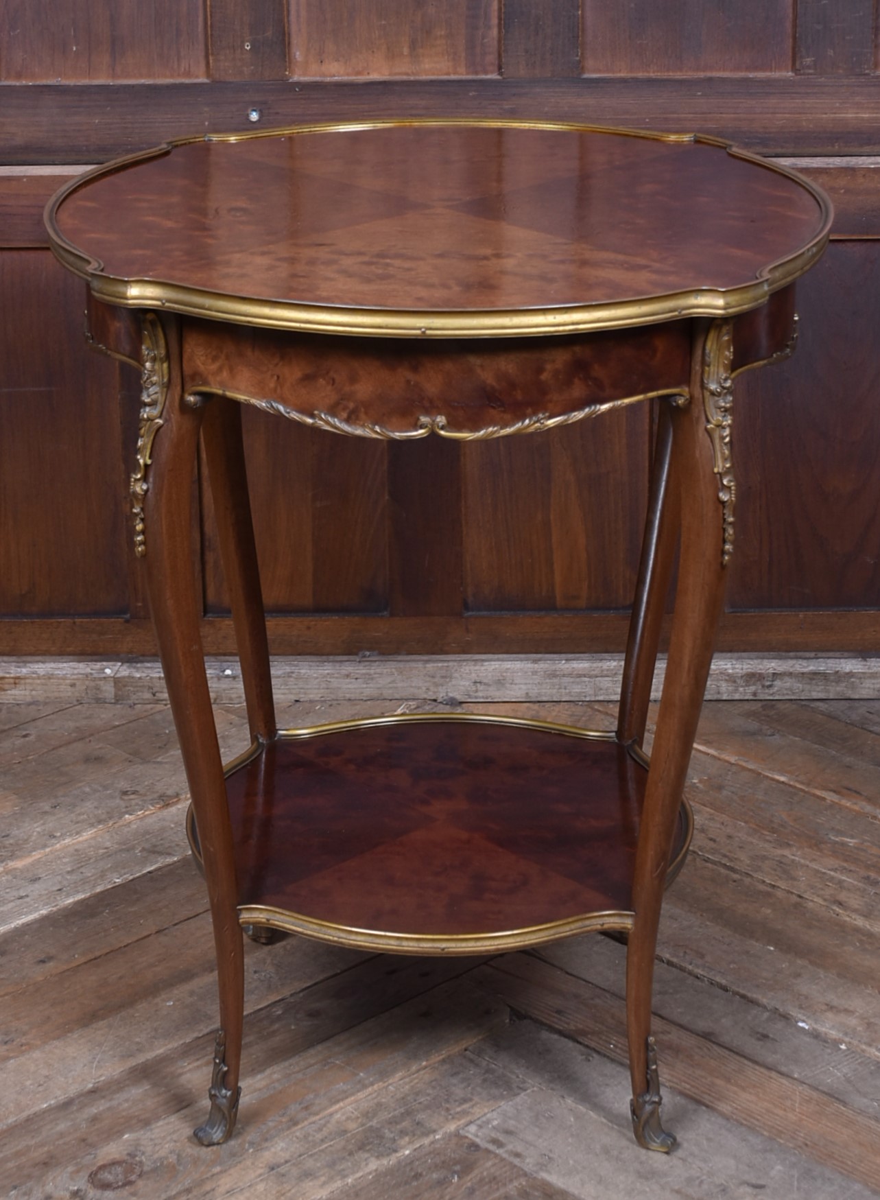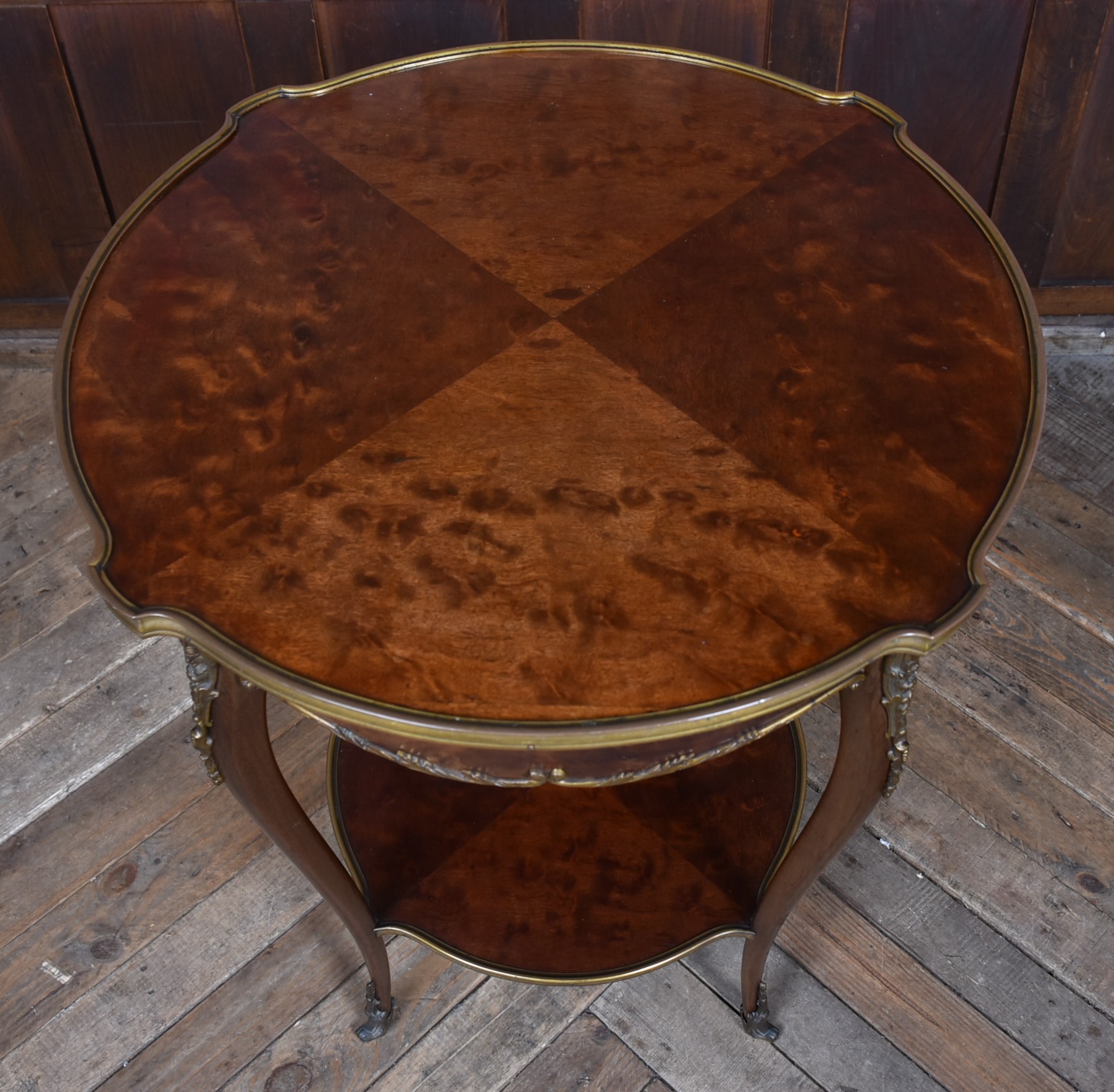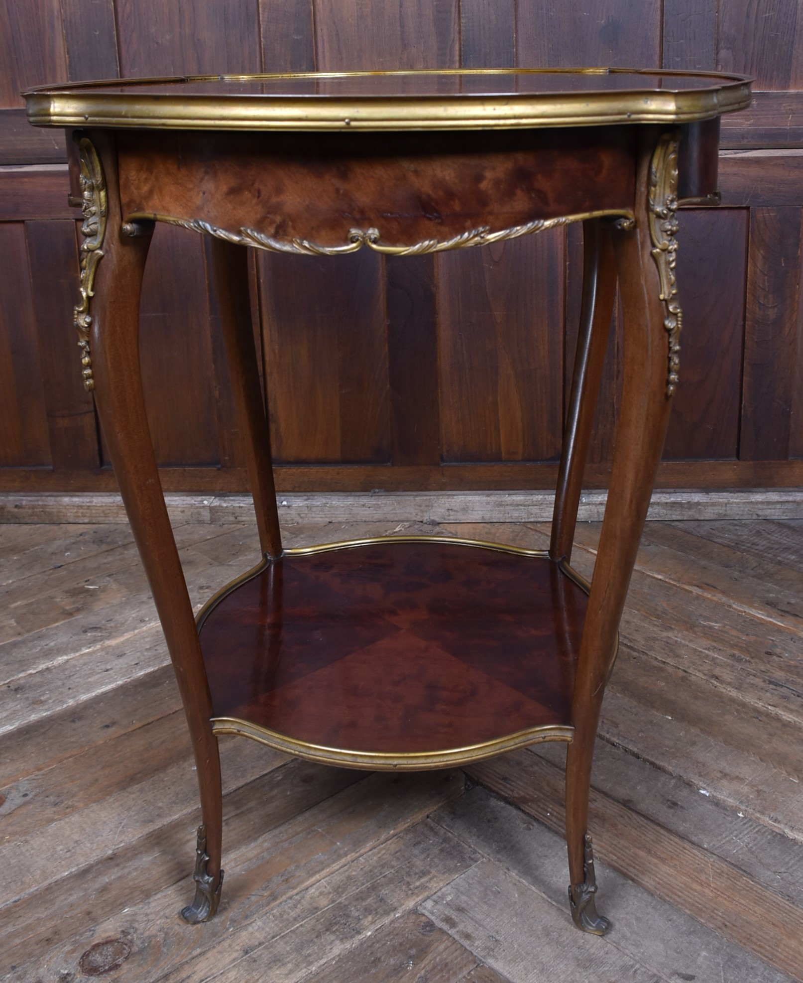 A stunning French Louis XV–style occasional table, beautifully crafted from mahogany and presented in excellent antique condition. The top features striking quadrant veneers that showcase the natural grain, all trimmed with a shaped brass edge. The frieze includes a neatly concealed drawer, seamlessly integrated into the design. The table stands on four graceful cabriole legs, each adorned with decorative brass mounts and finished with ornate sabots at the feet. A shaped lower tier mirrors the form of the top, providing both stability and an additional decorative element, also edged with brass. Elegant, well‑proportioned, and full of classic French charm, this piece works beautifully as a lamp table, bedside, or accent table in both traditional and eclectic interiors.