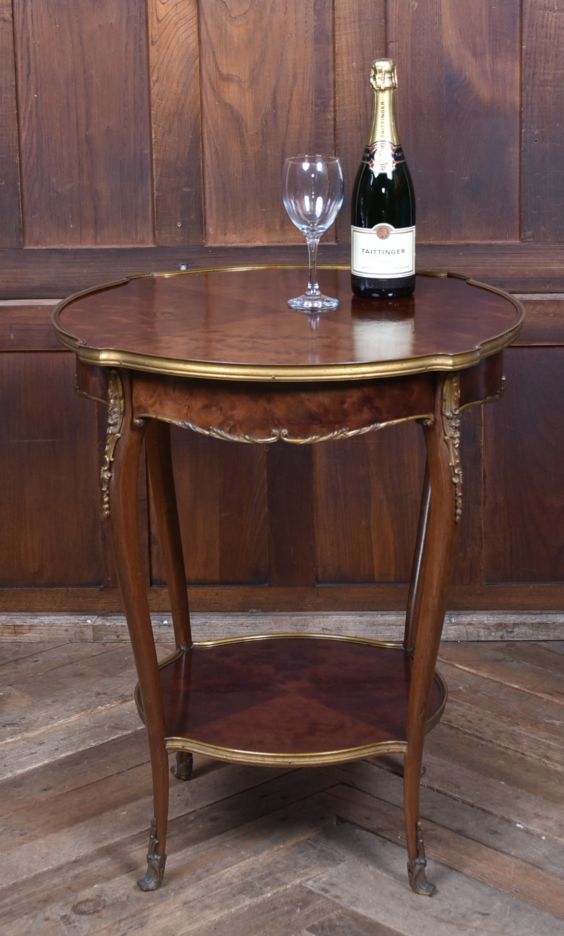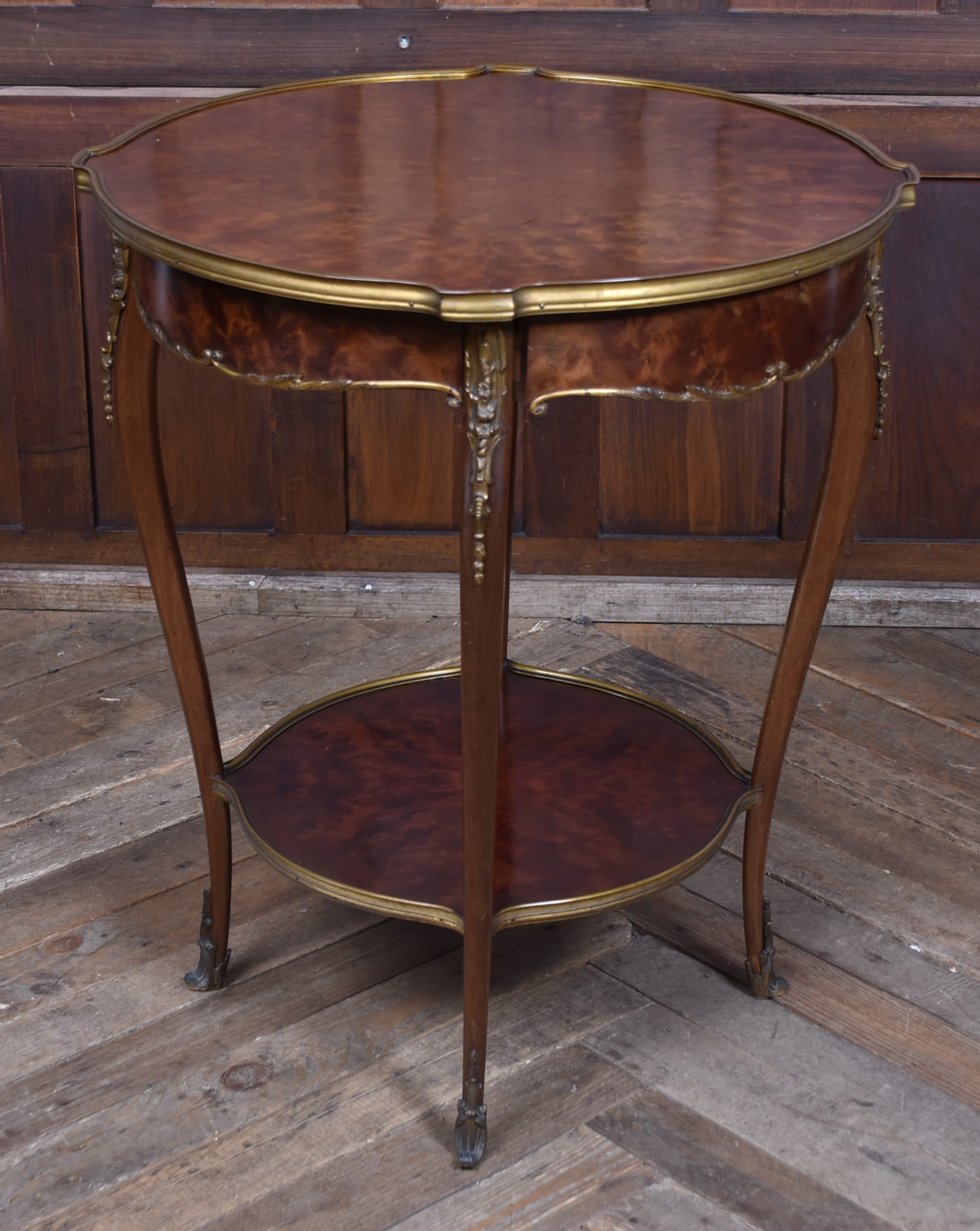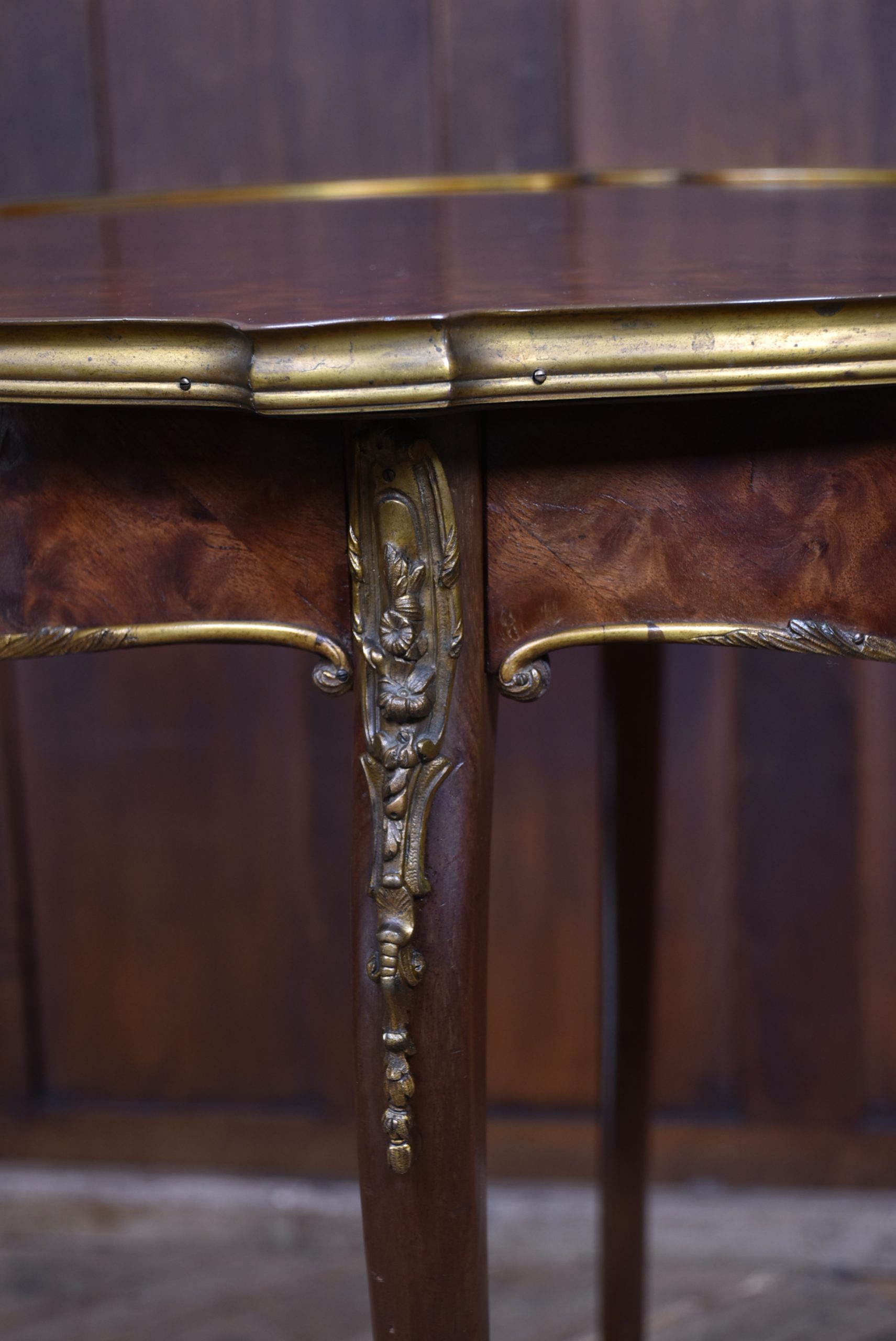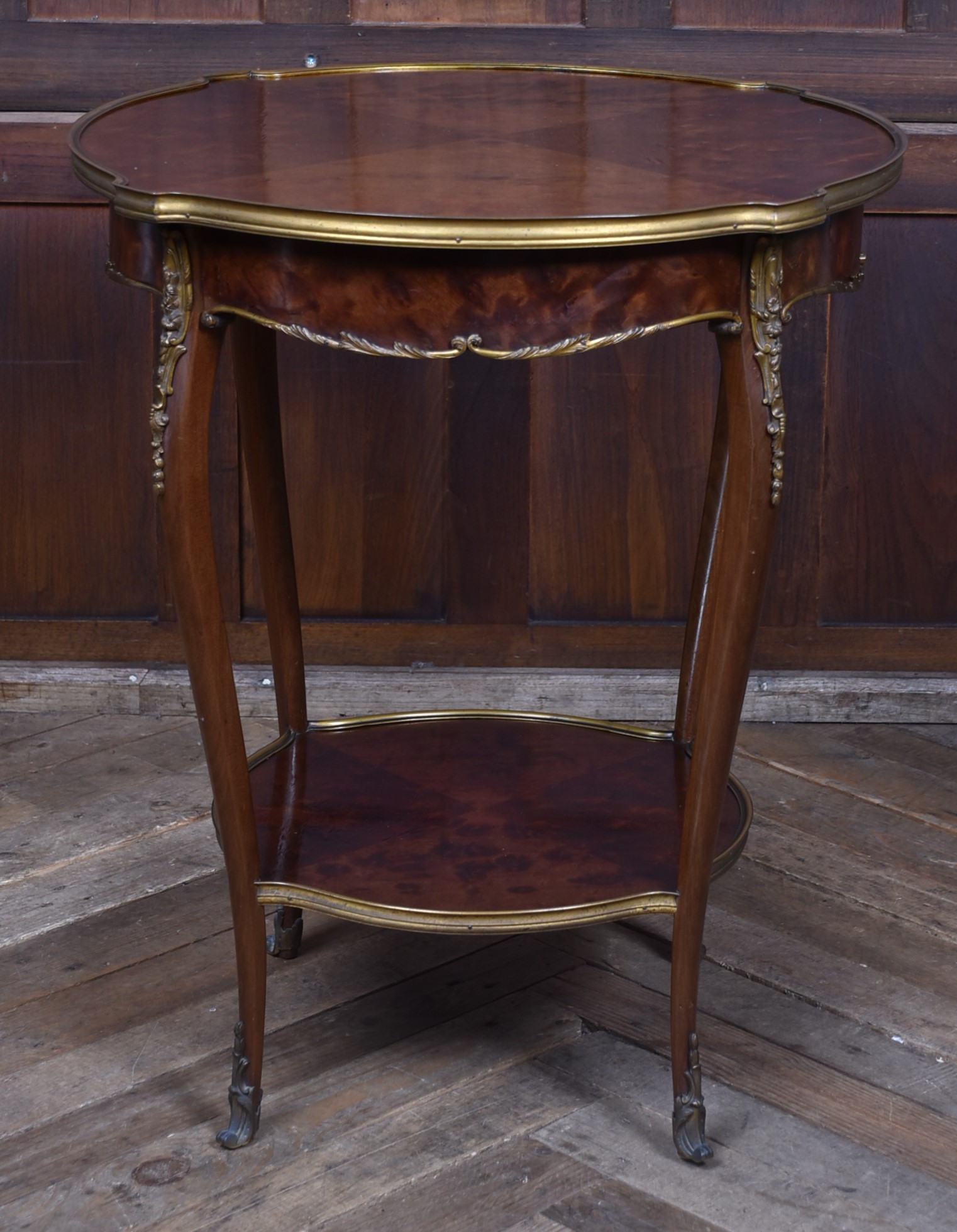A stunning French Louis XV–style occasional table, beautifully crafted from mahogany and presented in excellent antique condition. The top features striking quadrant veneers that showcase the natural grain, all trimmed with a shaped brass edge. The frieze includes a neatly concealed drawer, seamlessly integrated into the design. The table stands on four graceful cabriole legs, each adorned with decorative brass mounts and finished with ornate sabots at the feet. A shaped lower tier mirrors the form of the top, providing both stability and an additional decorative element, also edged with brass. Elegant, well‑proportioned, and full of classic French charm, this piece works beautifully as a lamp table, bedside, or accent table in both traditional and eclectic interiors.