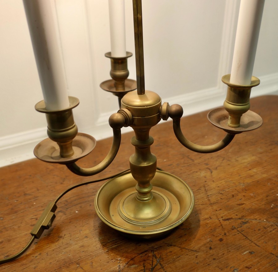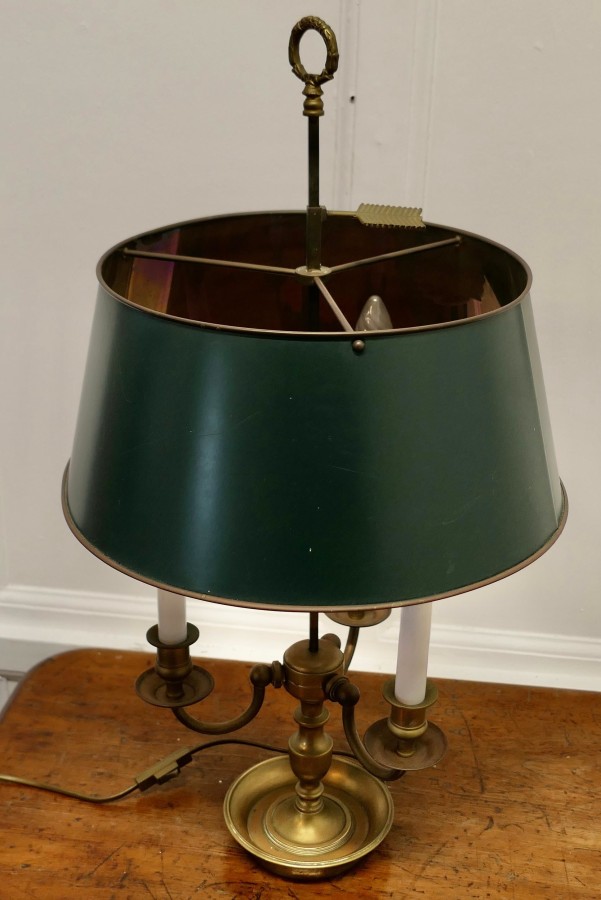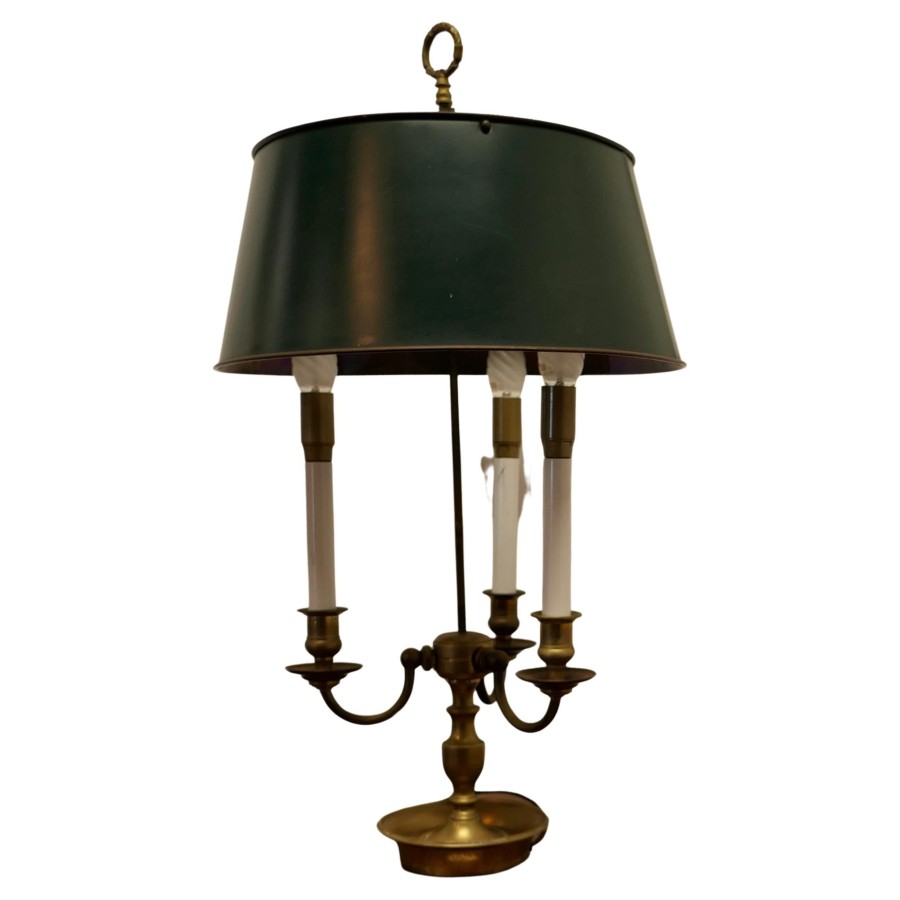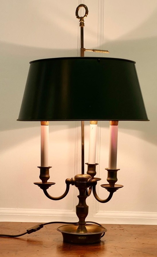 French Painted Toleware and Brass Triple Desk Lamp A lovely piece, a brass triple sconce lamp with its original adjustable toleware shade A Very Traditional Design with three candles and the arrow shaped grip to adjust the shade The shade is in its original slightly shabby Dark Green and Gold The lamp is all working and in good condition for its age The lamp is 27” tall, 15” in diameter TMS97. Manufacture Date : 1880 Materials : Brass