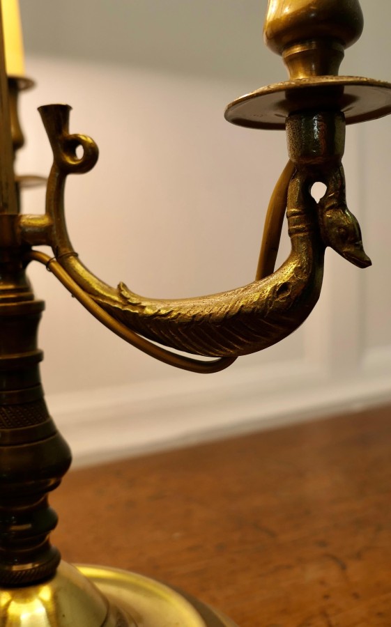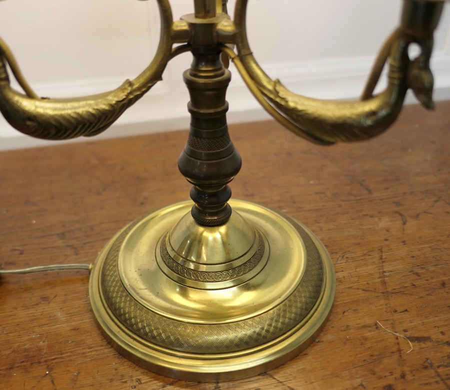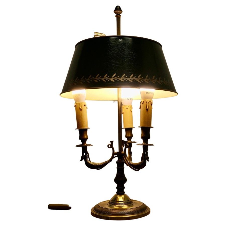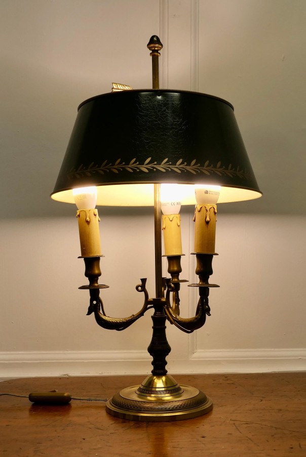 French Painted Toleware and Brass Triple Desk Lamp A lovely piece, a brass triple sconce lamp with its original adjustable toleware shade A Very traditional design with three large birds presumably those who provide the quills and the arrow shaped grip to adjust the shade The shade is in its original Dark Green and Gold The lamp is all working and in good condition for its age The lamp is 23” tall, 13” in diameter MS99. Manufacture Date : 1880 Materials : Brass