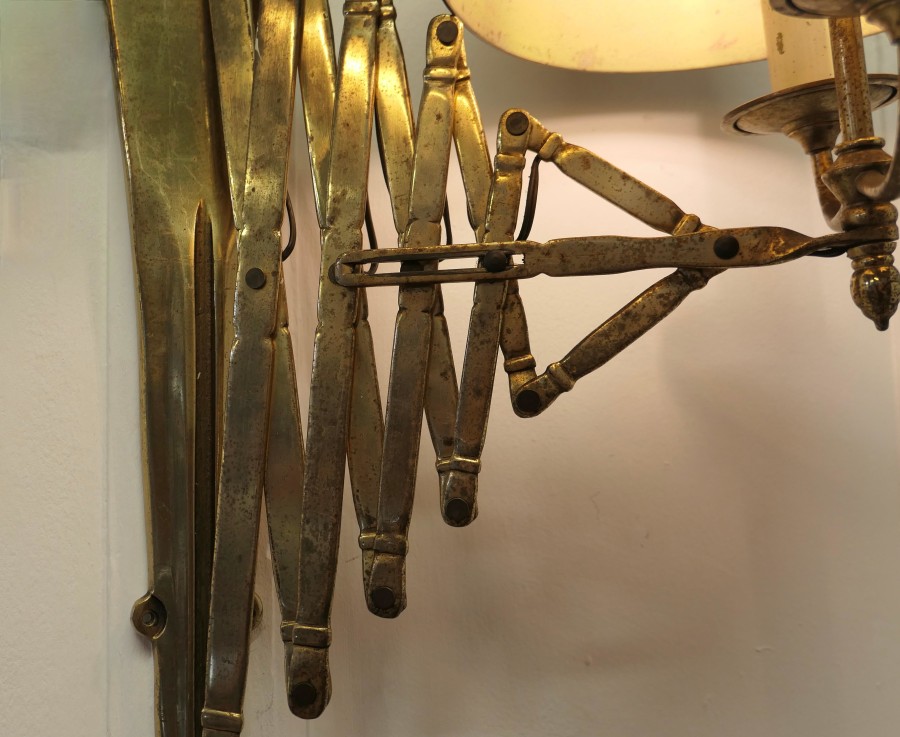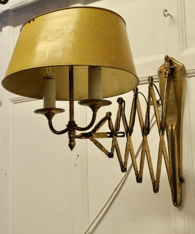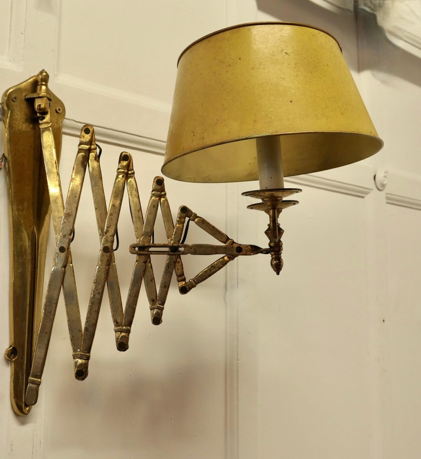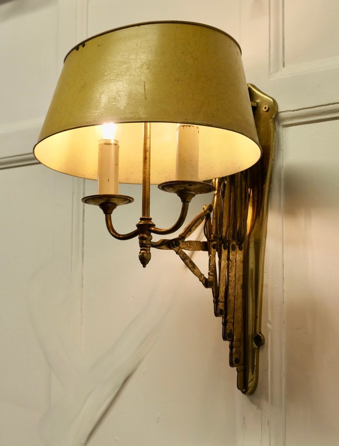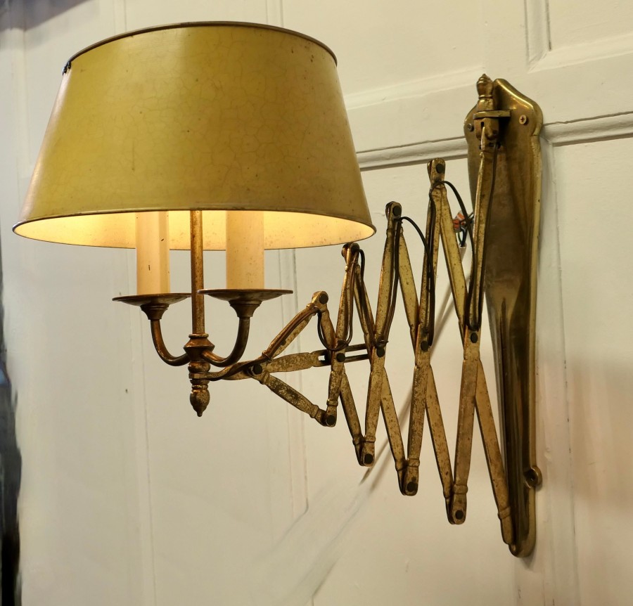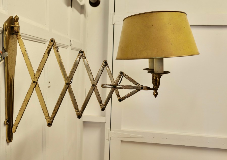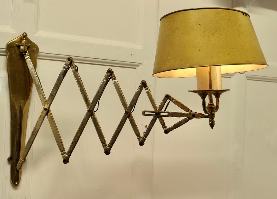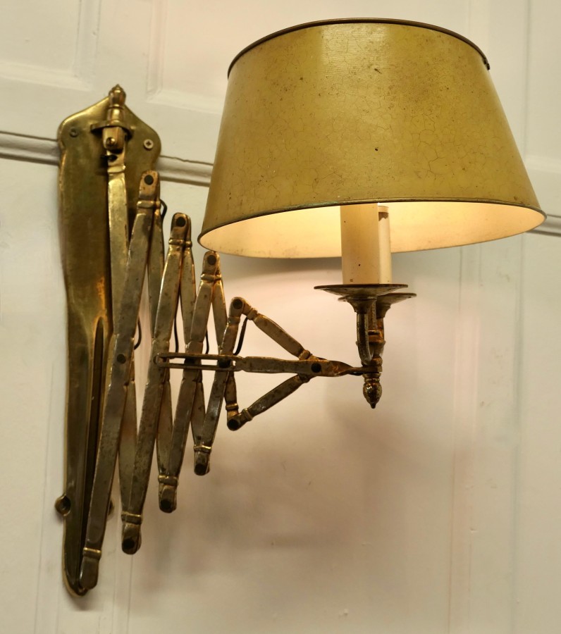French Painted Toleware and Brass Twin Scissor Lamp A lovely piece, the brass twin sconce lamp comes with its original adjustable oval toleware shade, this is in cream with crackle finish paint The lamp fixed to the wall by a brass scissor bracket, allowing the lamp to slide in and out and twist a little from each side A lovely piece in good working condition The lamp is 18” tall, 13” wide and 13” deep TMS217. Manufacture Date : 1900 Materials : Brass
