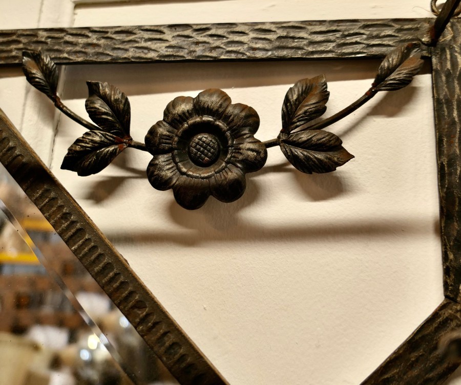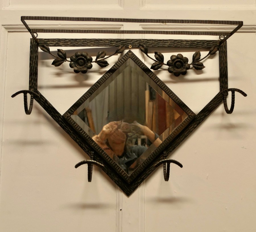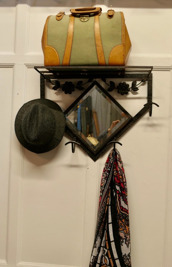 French Retro Chic Iron and Toleware Hat and Coat Rack with Mirror This delightful French 60s coat rack has a Diamond shaped bevelled mirror and it is decorated with toleware flowers, it has 4 curved iron hooks and a luggage shelf over the top A useful piece for a bathroom or cloakroom anywhere where space is limited The rack is in all-round good condition, it is 18” tall, 25” wide and 4” deep TSW70 Manufacture Date : 1950 Materials : Iron