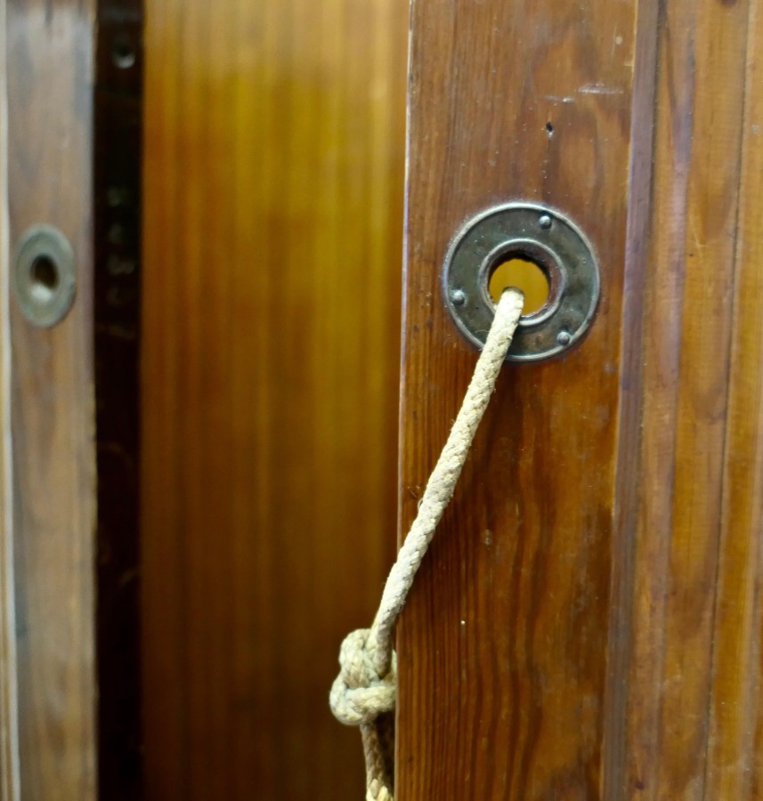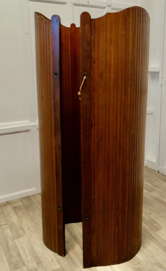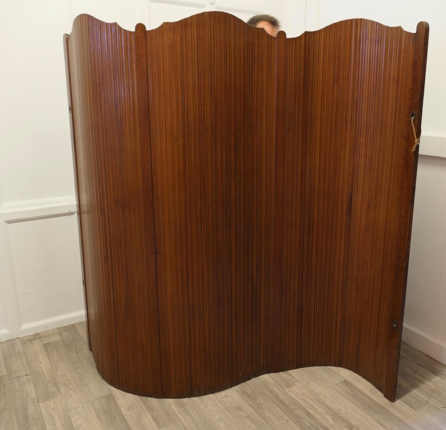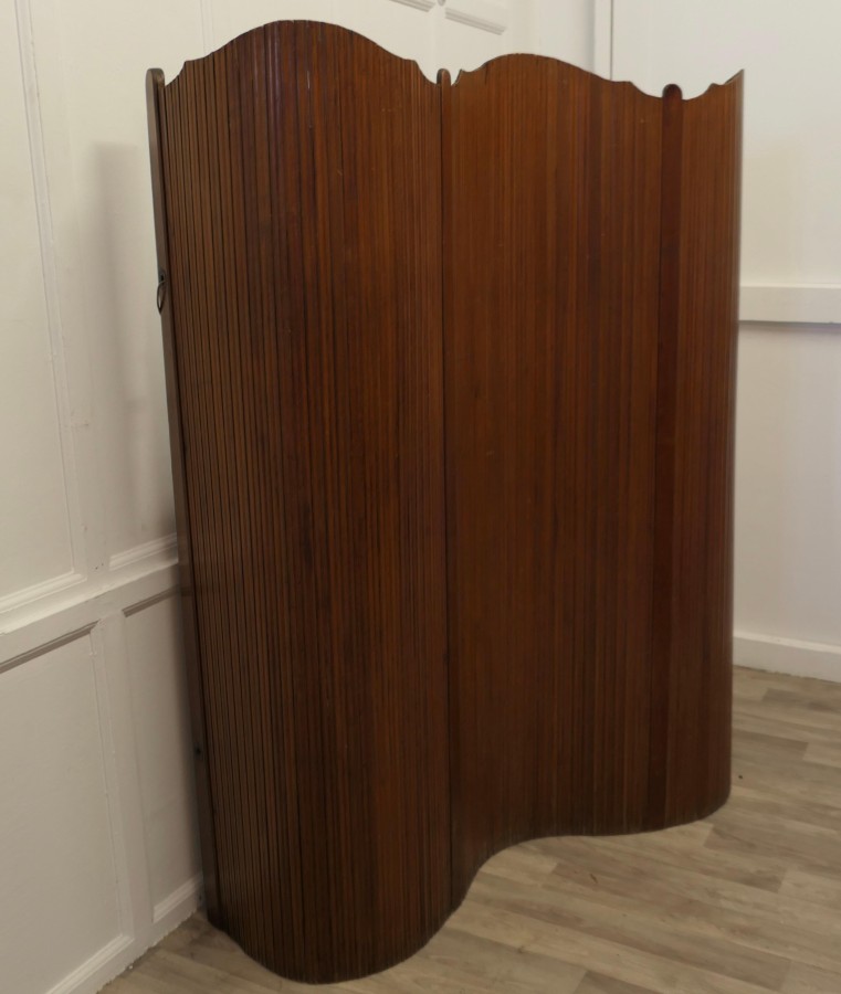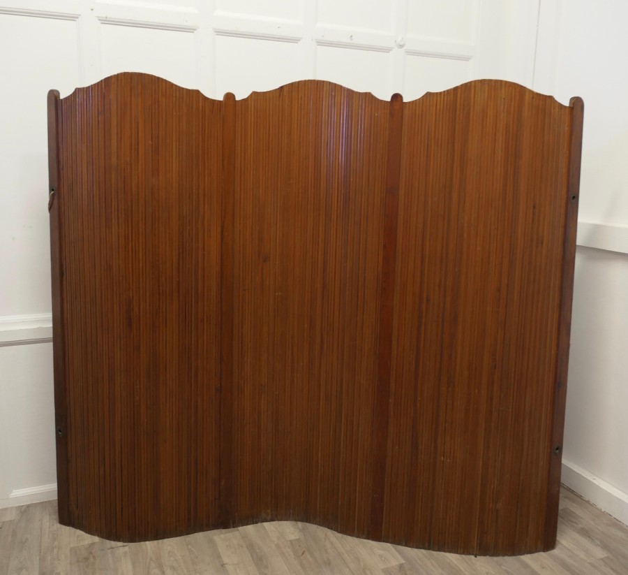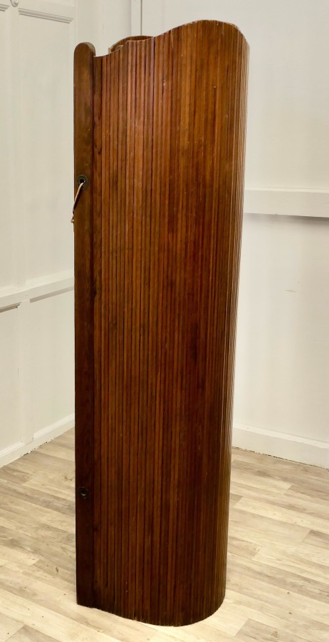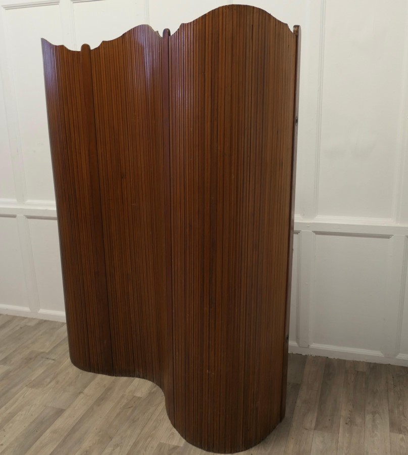 French Self Supporting Vertical Tambour Screen, Room Divider This is a French Art Deco Style Self-Supporting Vertical Tambour Room Divider or Screen made with vertical strips of pitch pine which gives an articulated flexible structure and allows it to be used as a dressing screen or as a room divider, there are brass eyelets which can be threaded to enclose or roll up the screen The Screen dates from the mid 20th Century it is in good vintage condition with very little separation in the wood The Screen is 65” high mad 74” long unrolled NG239 Manufacture Date : 1950 Materials : Pine
