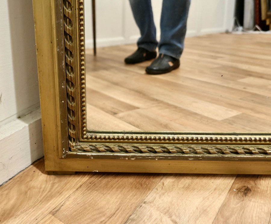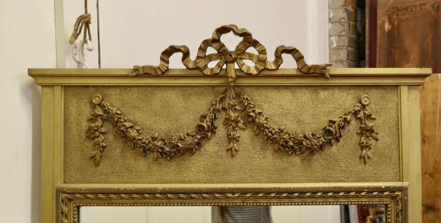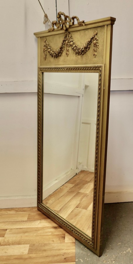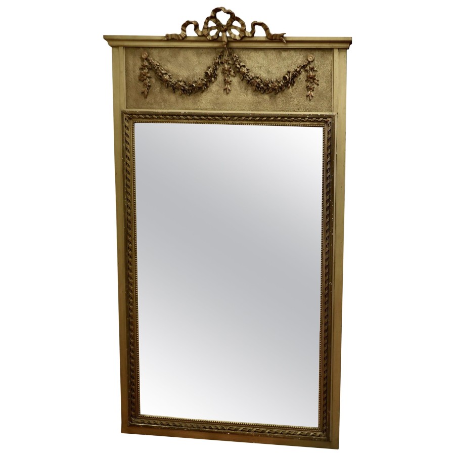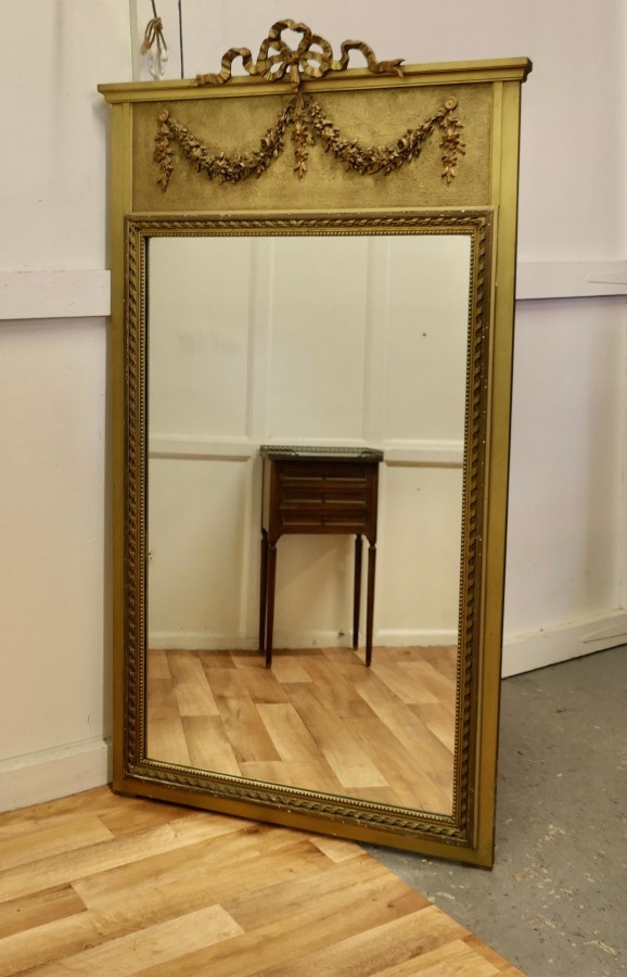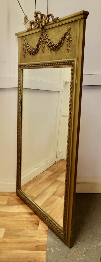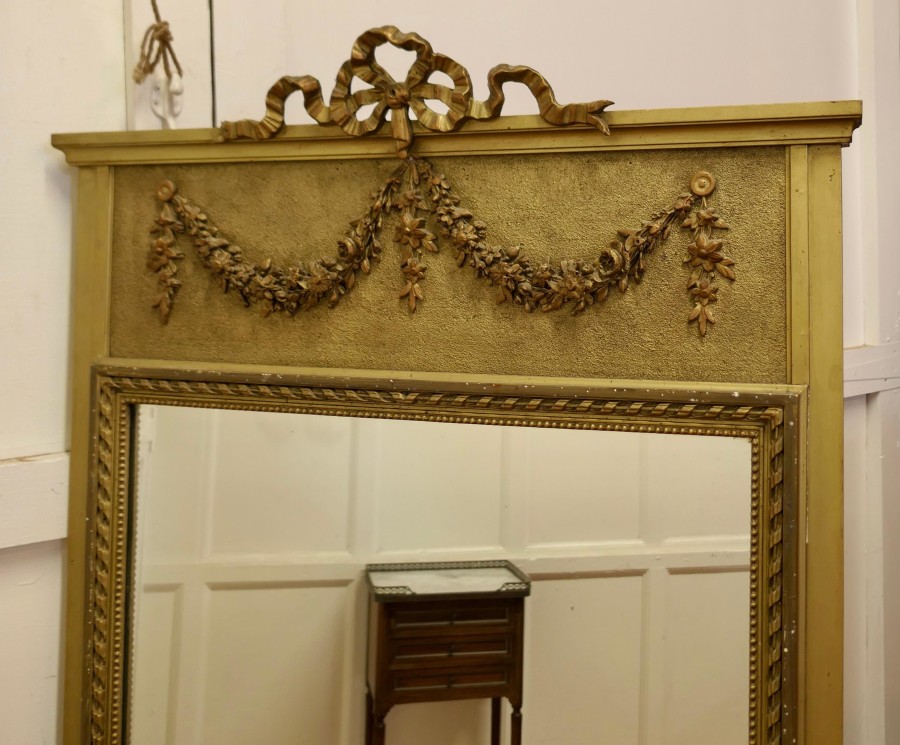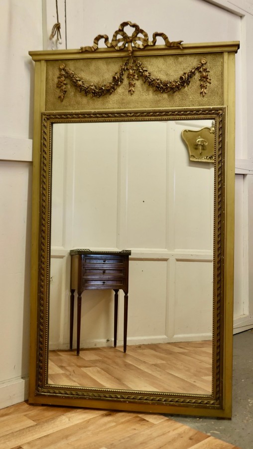 French Trumeau Style Pier Console Mirror This tall Mirror is an elegant piece, it has an aged gilt frame with swags, garlands and ribbons decorating the top and the wide moulded frame has a gold decorative rope edging The mirror dates from the mid 19th century, the mercury glass is in good condition for its age The mirror 64” high and it is 36” wide HM23 Manufacture Date : 1870 Materials : Giltwood
