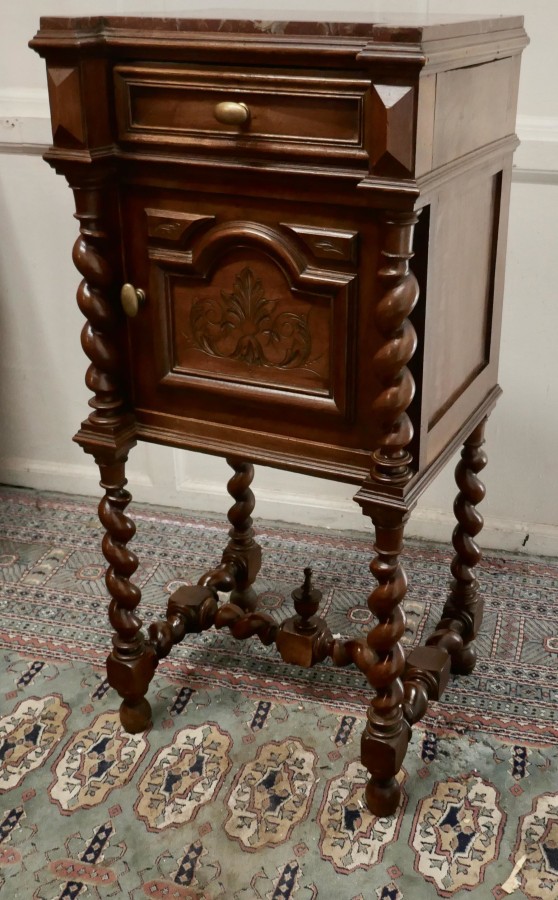 French walnut Barleytwist night table or side cupboard This is a very attractive piece of furniture from Brittany, the cabinet has a small drawer at the top with a cupboard beneath and it has attractive Barley twist turnings on the front and legs The cabinet has a pretty dark pink marble top, the drawer and the cupboard door have brass knobs. The cabinet is in good sound condition, it is 36” tall, 17” wide and 16” deep TNV257. Manufacture Date : 1880 Materials : Walnut
