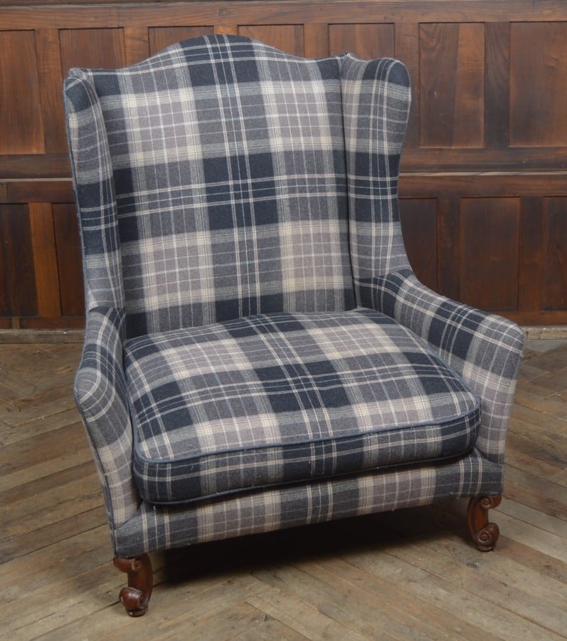 Superb oversized wing back arm chair with C scroll walnut legs in excellent condition with only imperfections in line with age and use. The chair is solid with no creeks or wobbles and upholstered in a fabulous grey tartan fabric which is clean with no rips or holes. The seat height and broad back with shapely arms offers a comfortable seating position. A very stylish chair that will look amazing in any location.