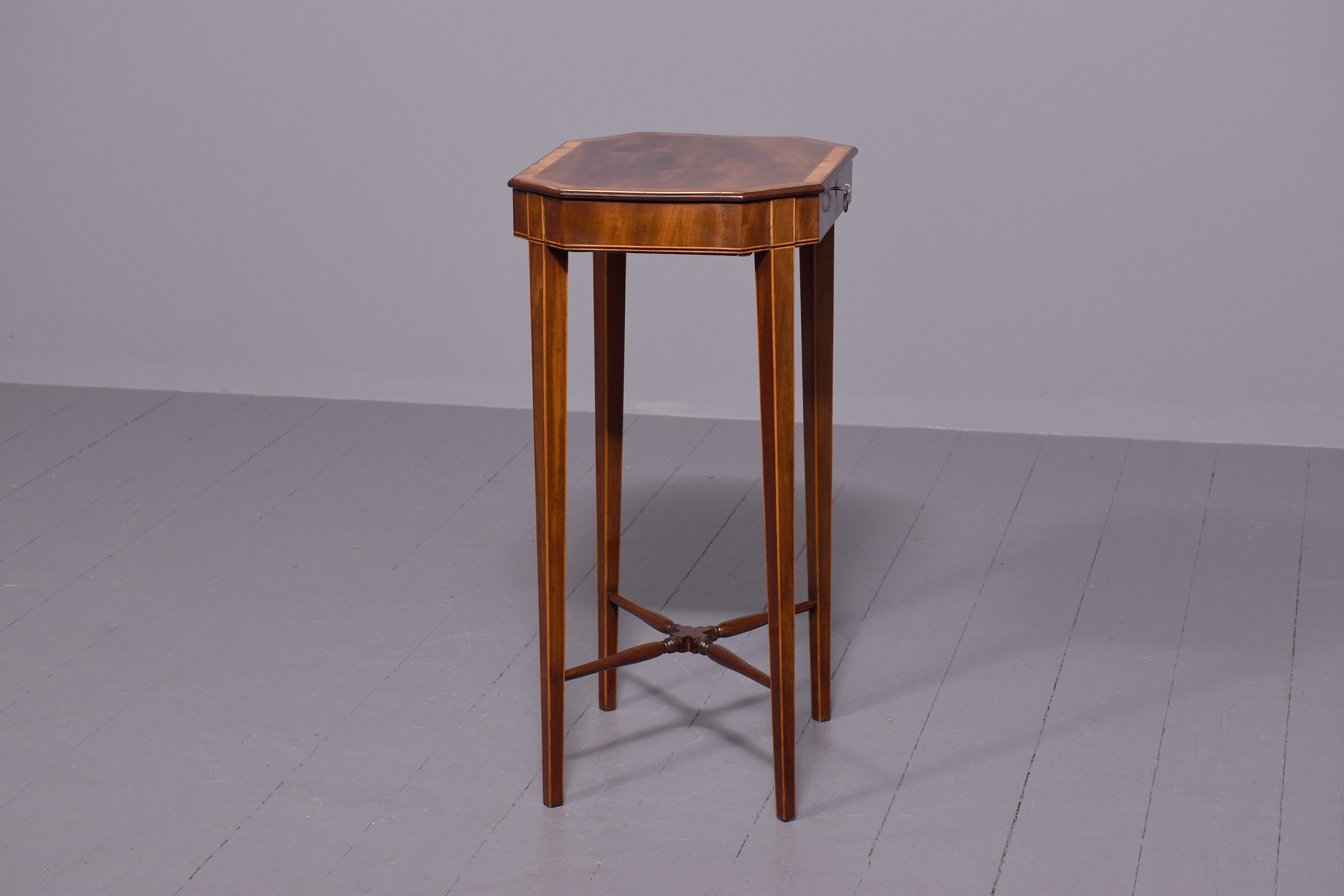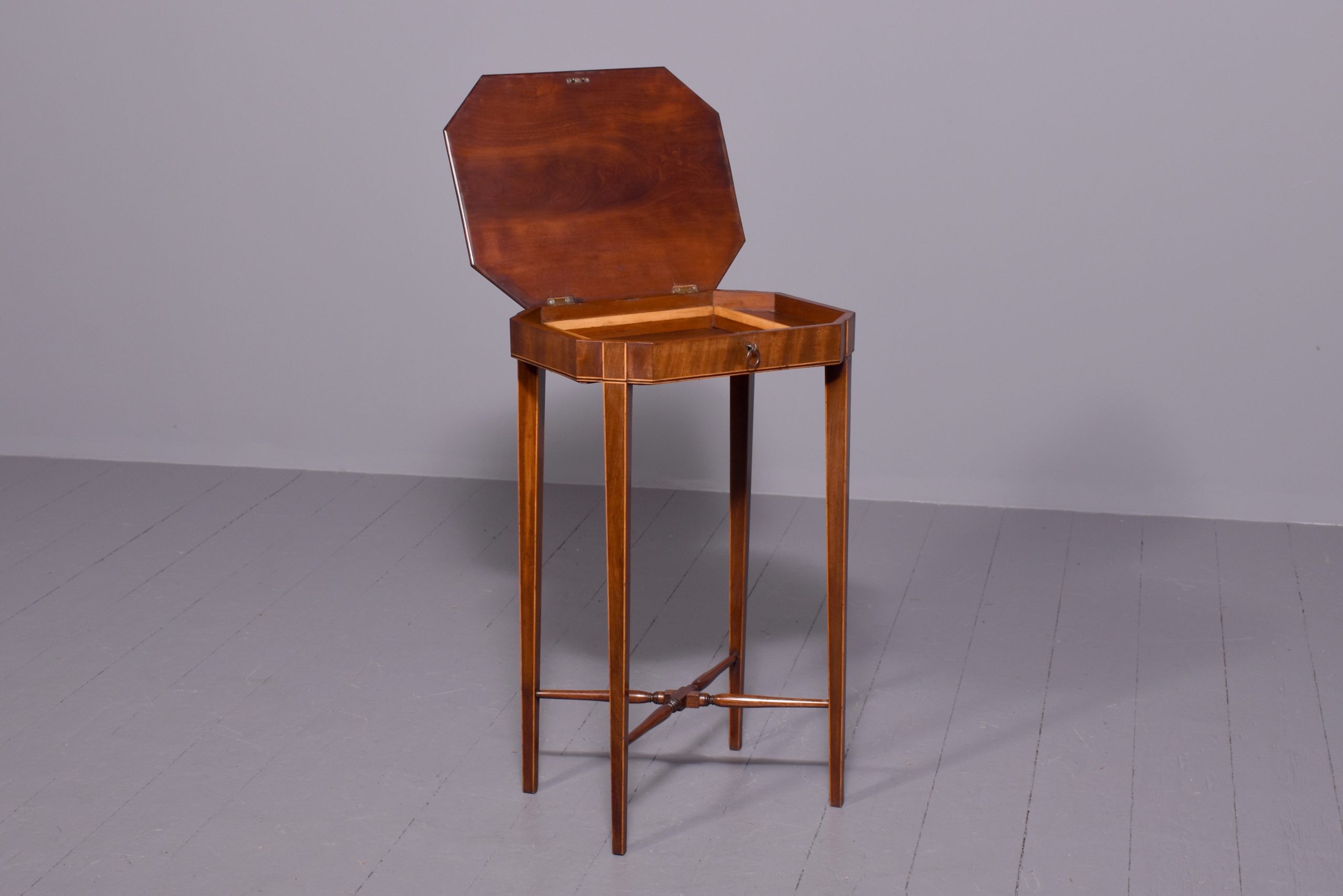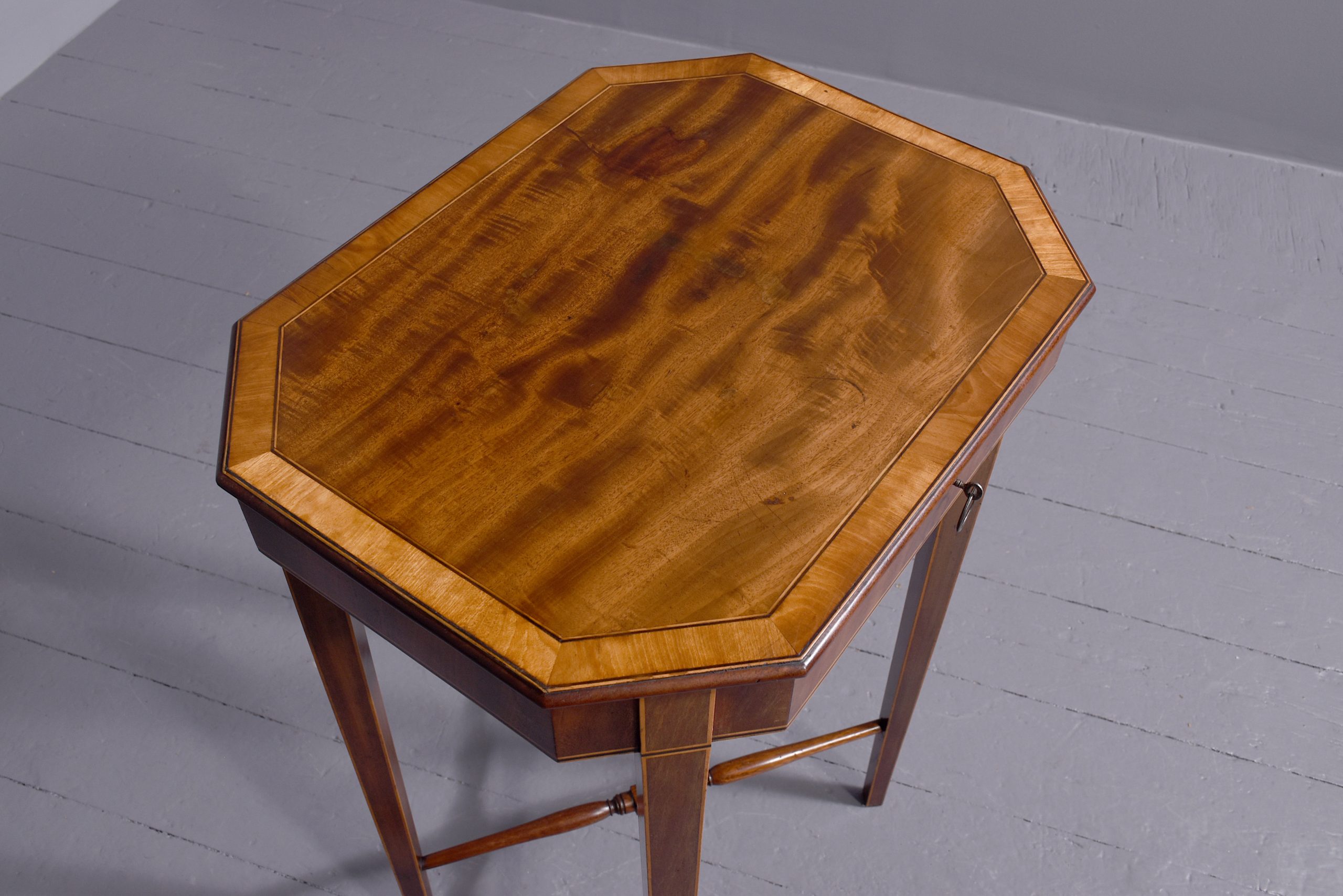 Circa 1810 Attractive, George 111 satinwood banded, mahogany occasional or lamp table. The rectangular figured mahogany top with canted corners and moulded fore-edges with satinwood banding, with boxwood and ebony inlay. The top lifts to a storage area underneath, with an inlaid frieze on all sides (free standing). All supported on boxwood inlaid tapering square legs with turned x stretcher