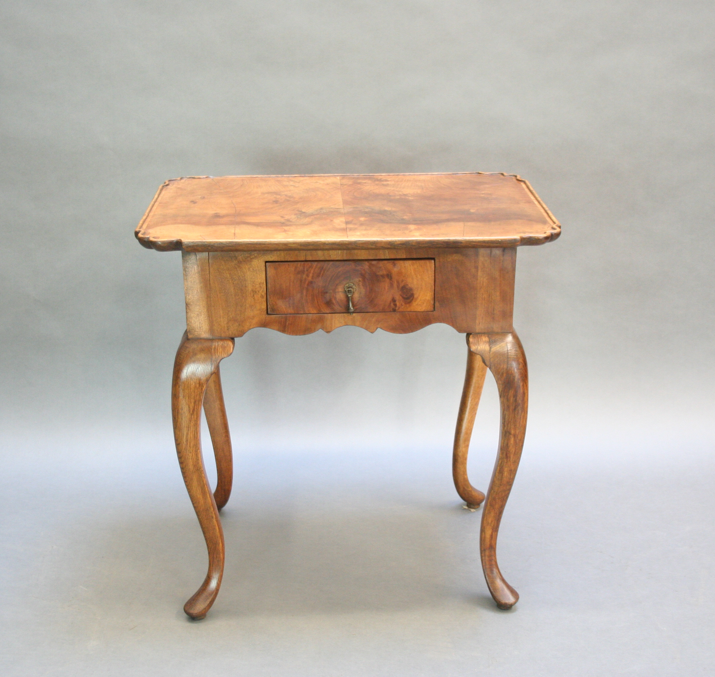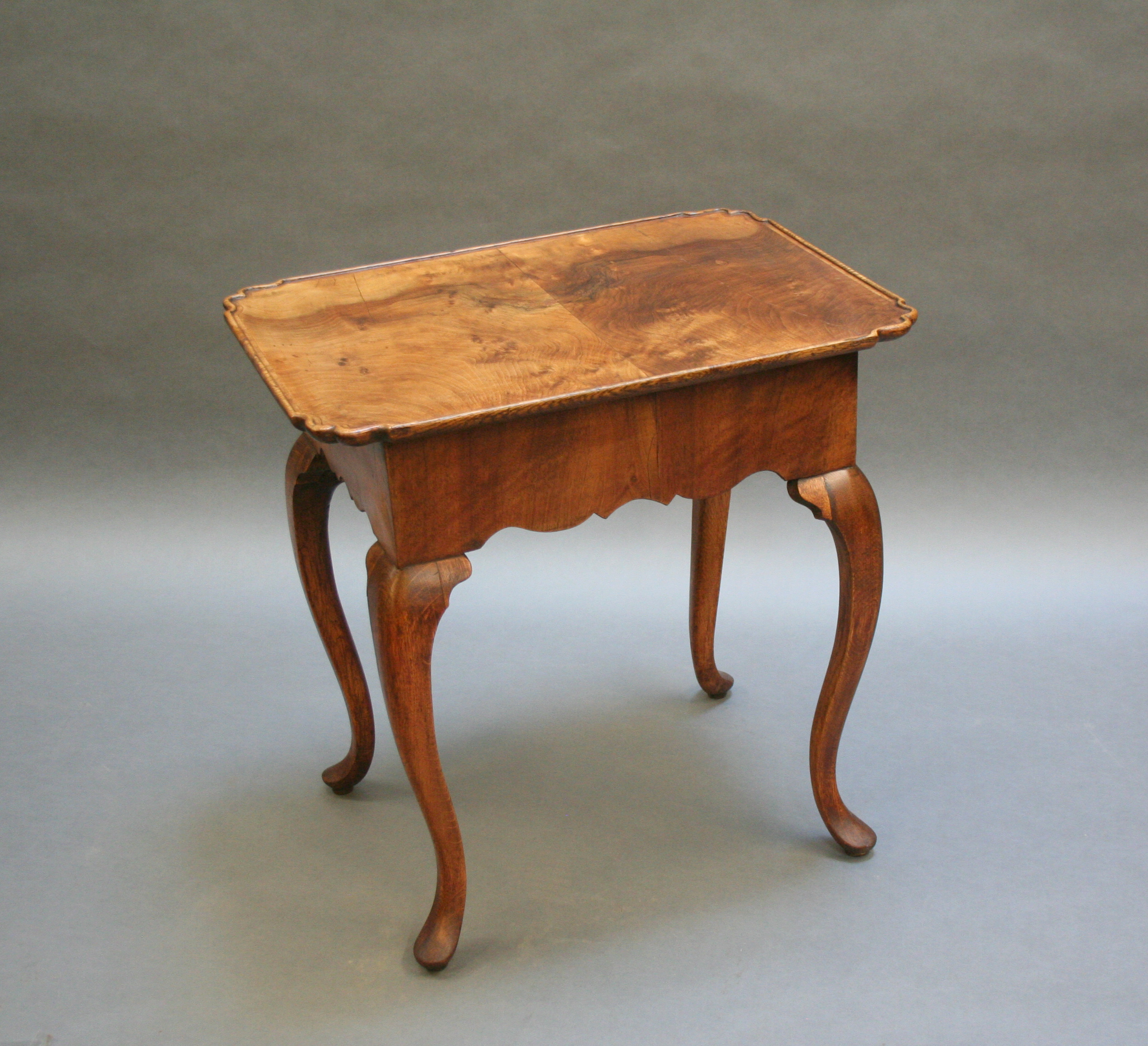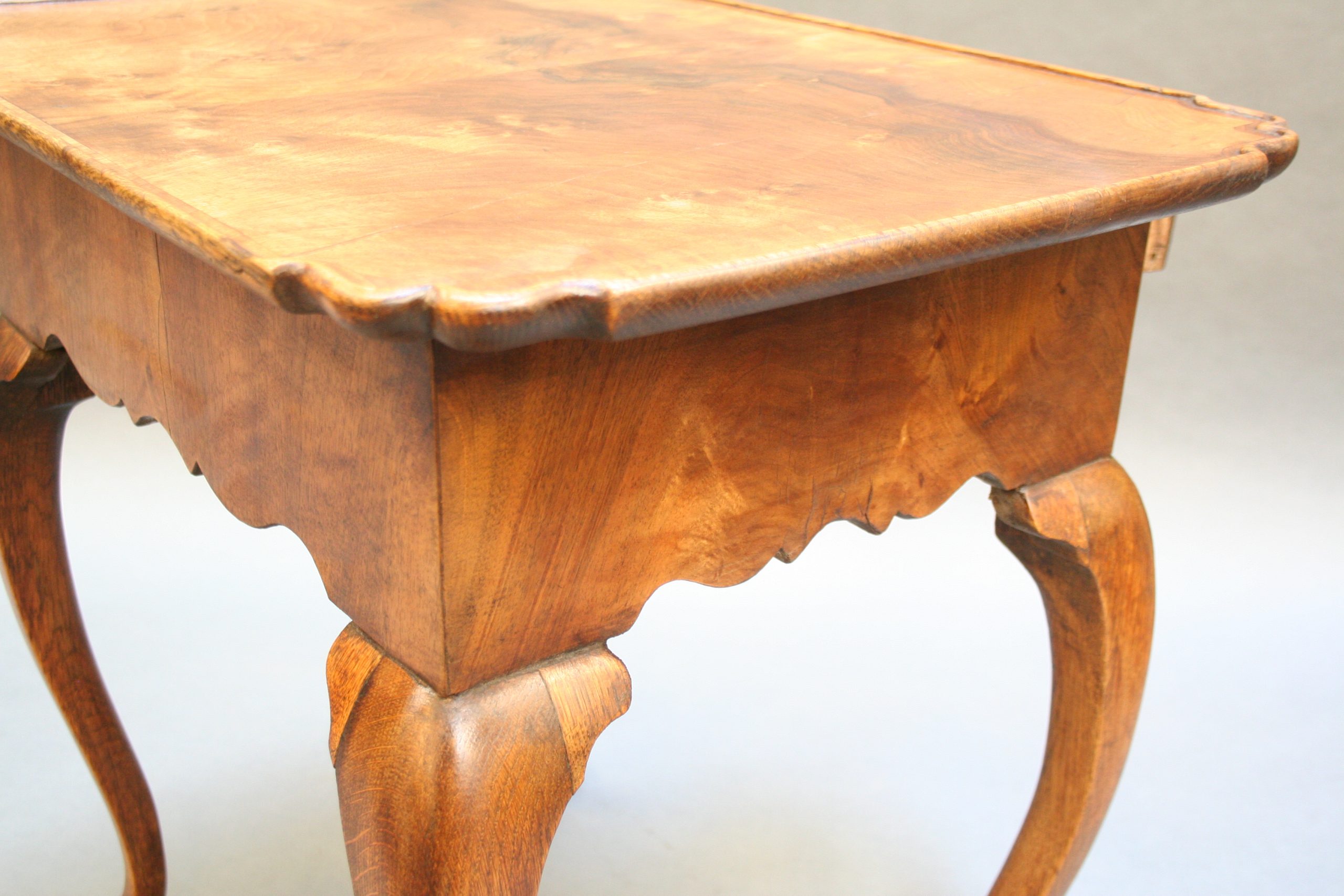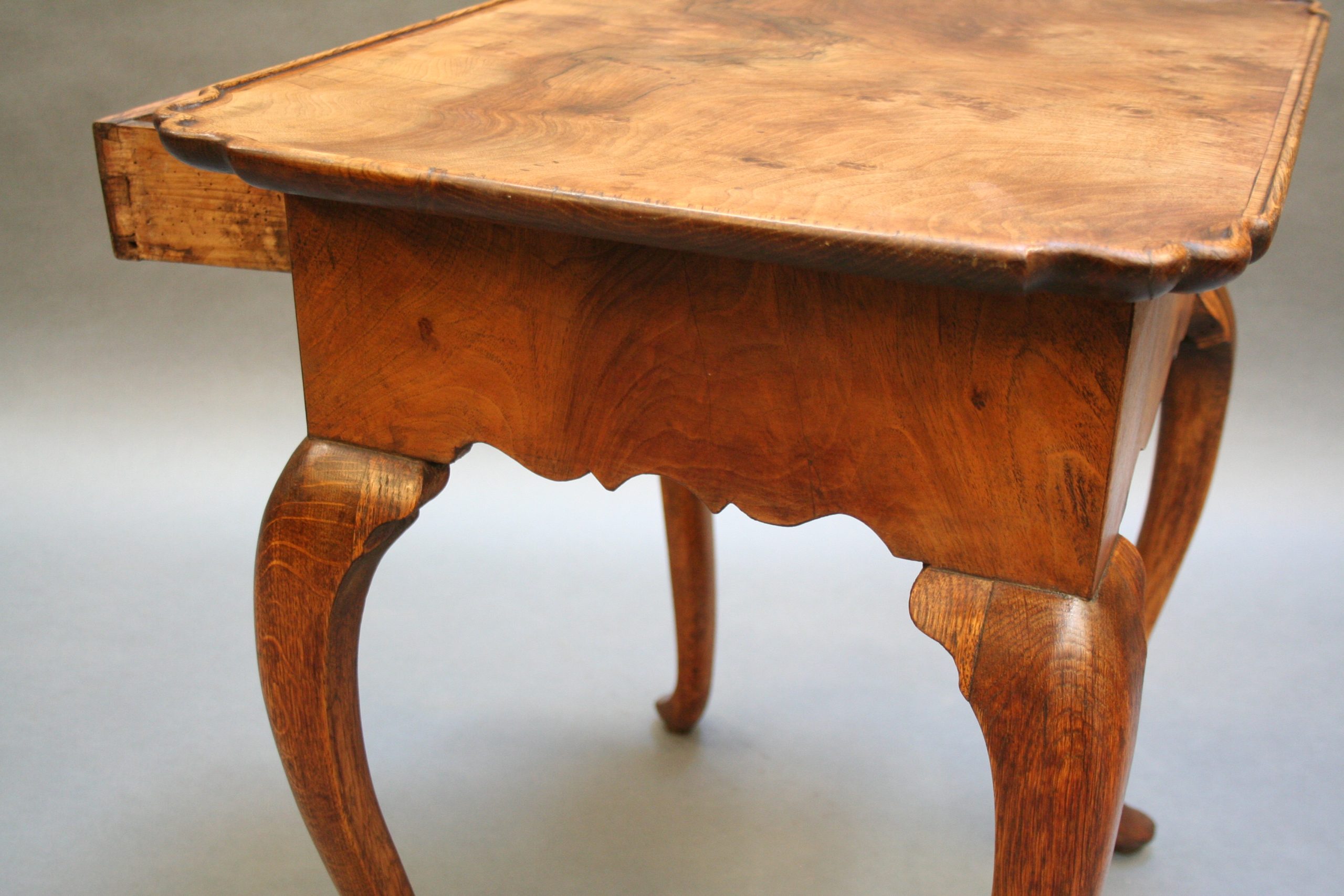 Late C18th well figured walnut, the lipped rectangular top over single drawer and deep shaped frieze raised on oak cabriole supports