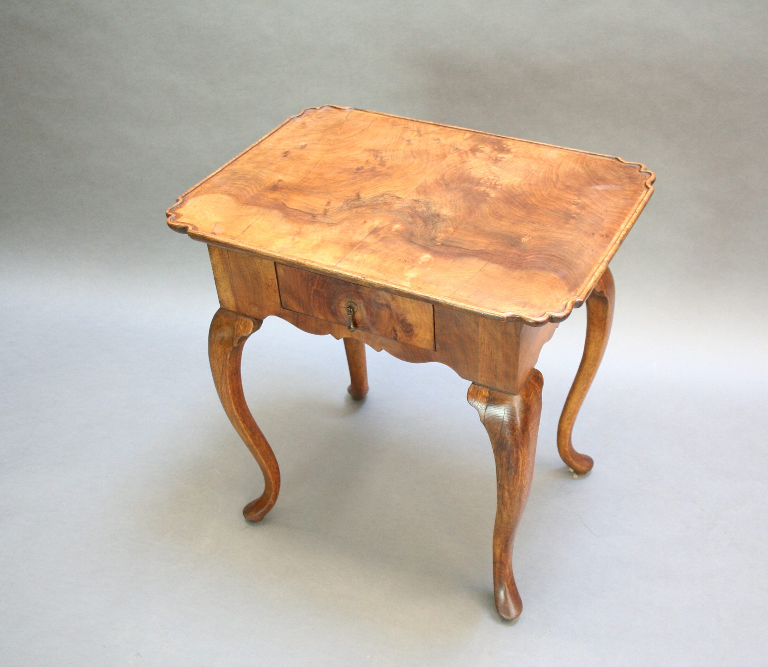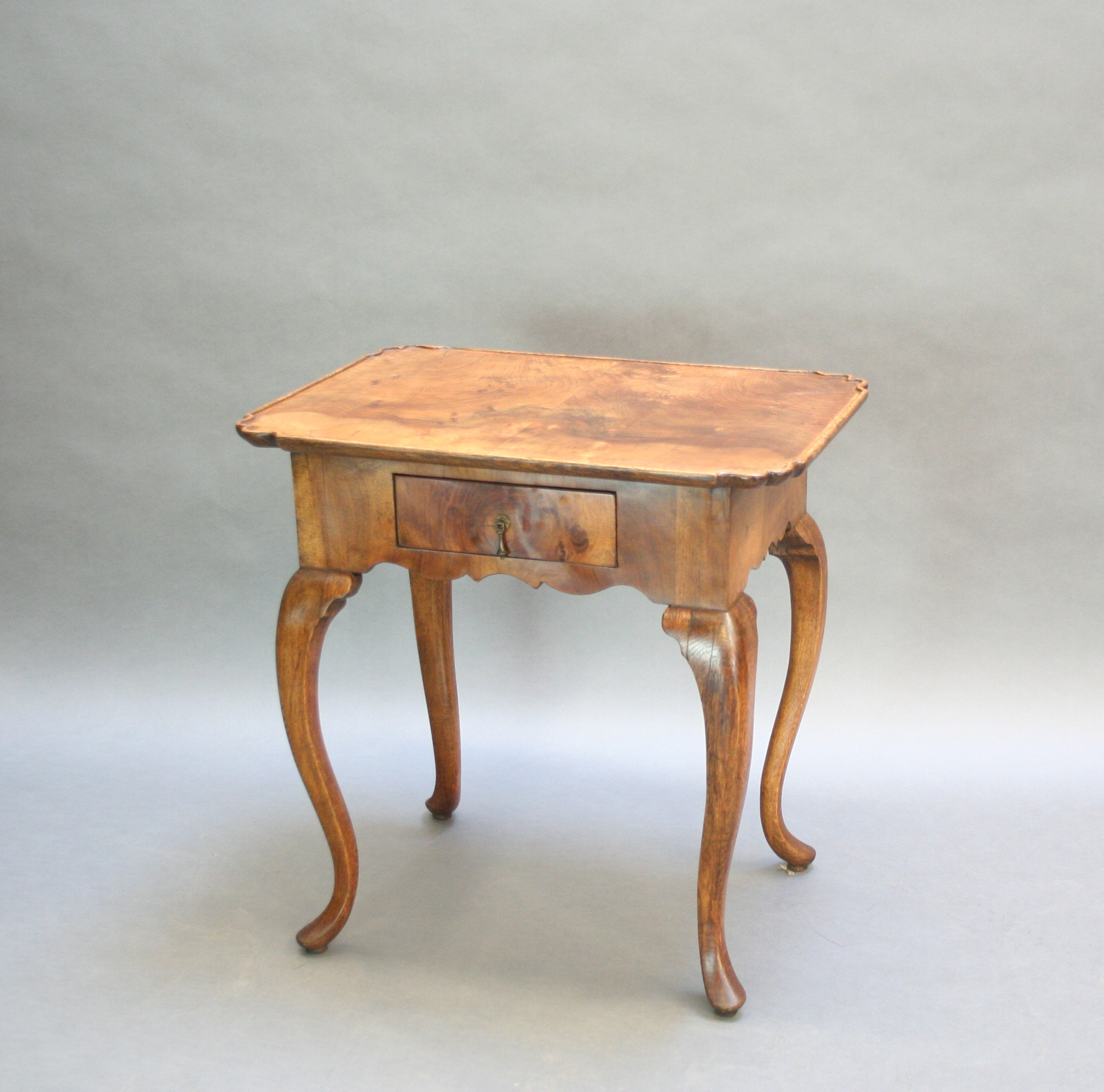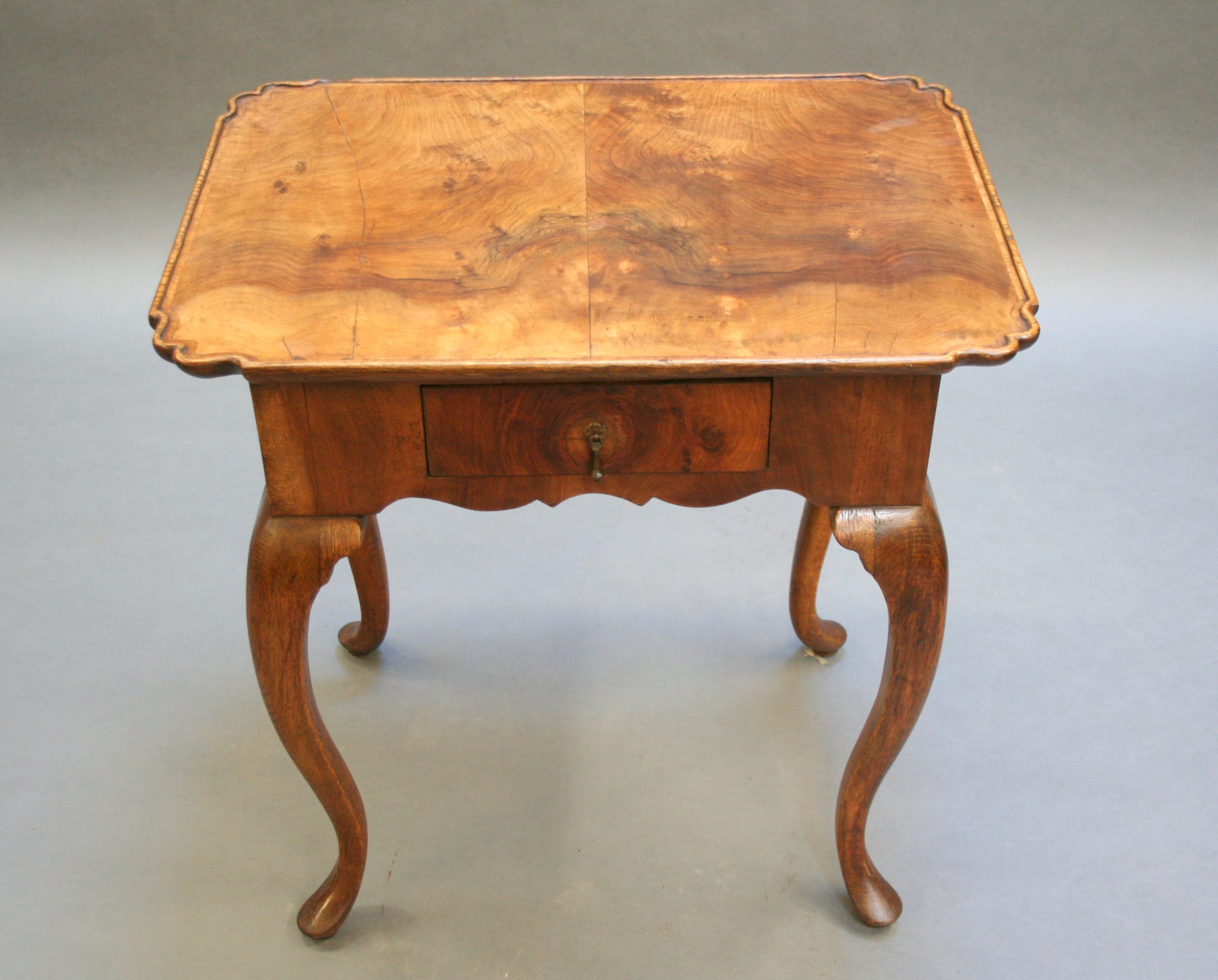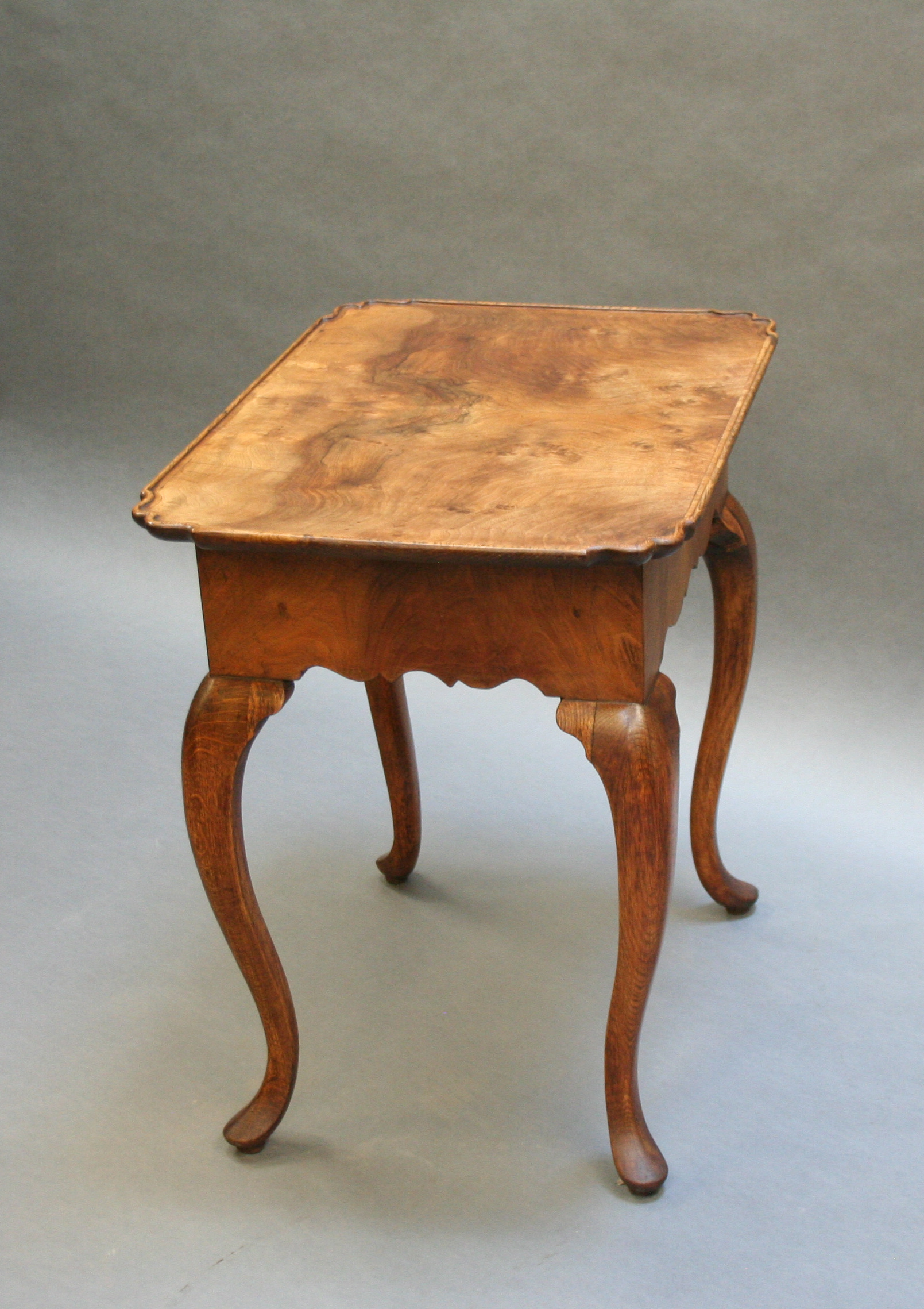 Late C18th well figured walnut, the lipped rectangular top over single drawer and deep shaped frieze raised on oak cabriole supports
