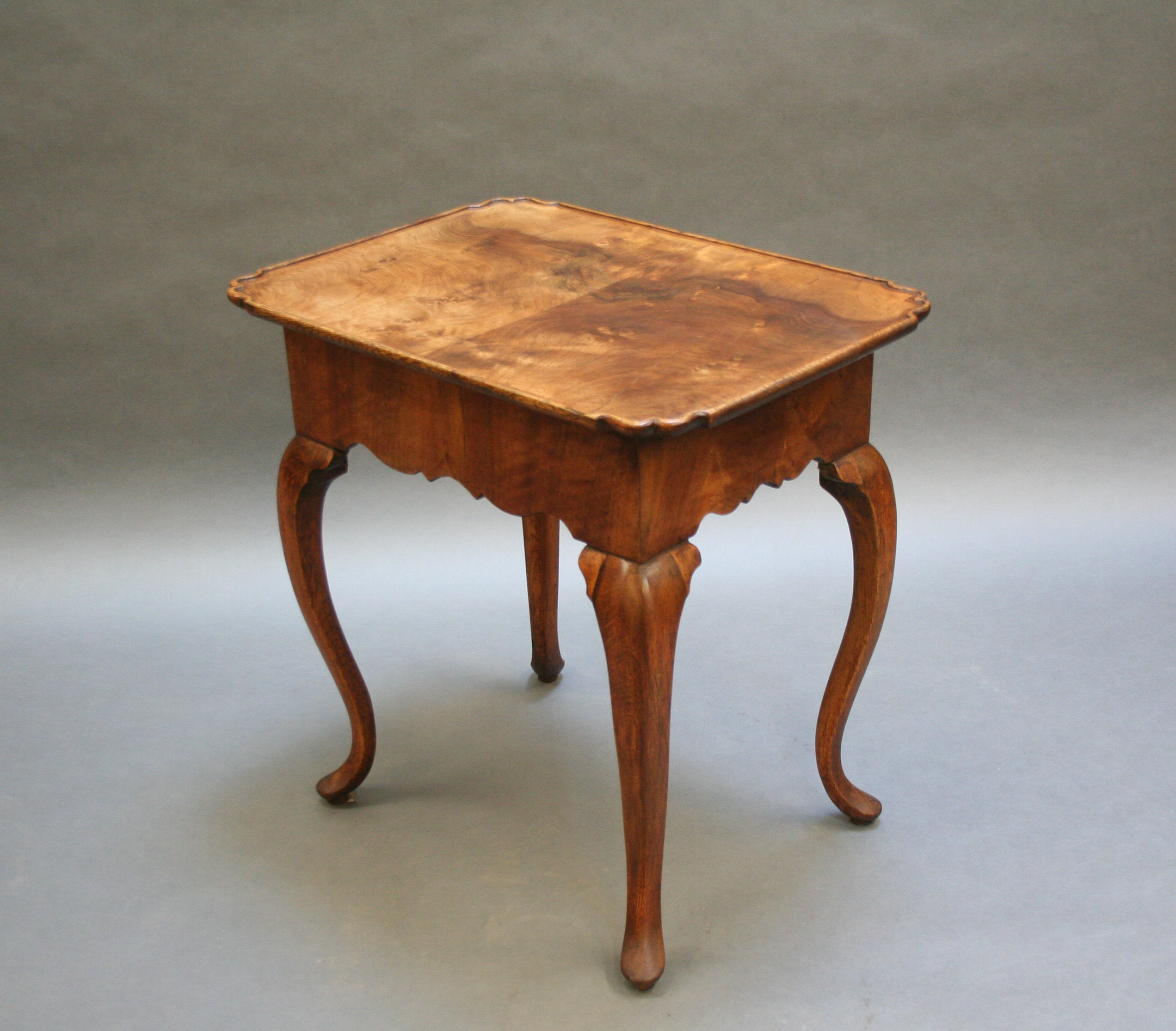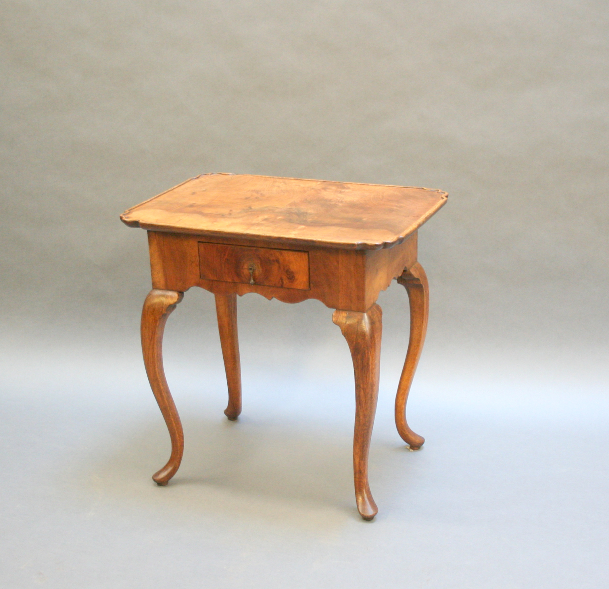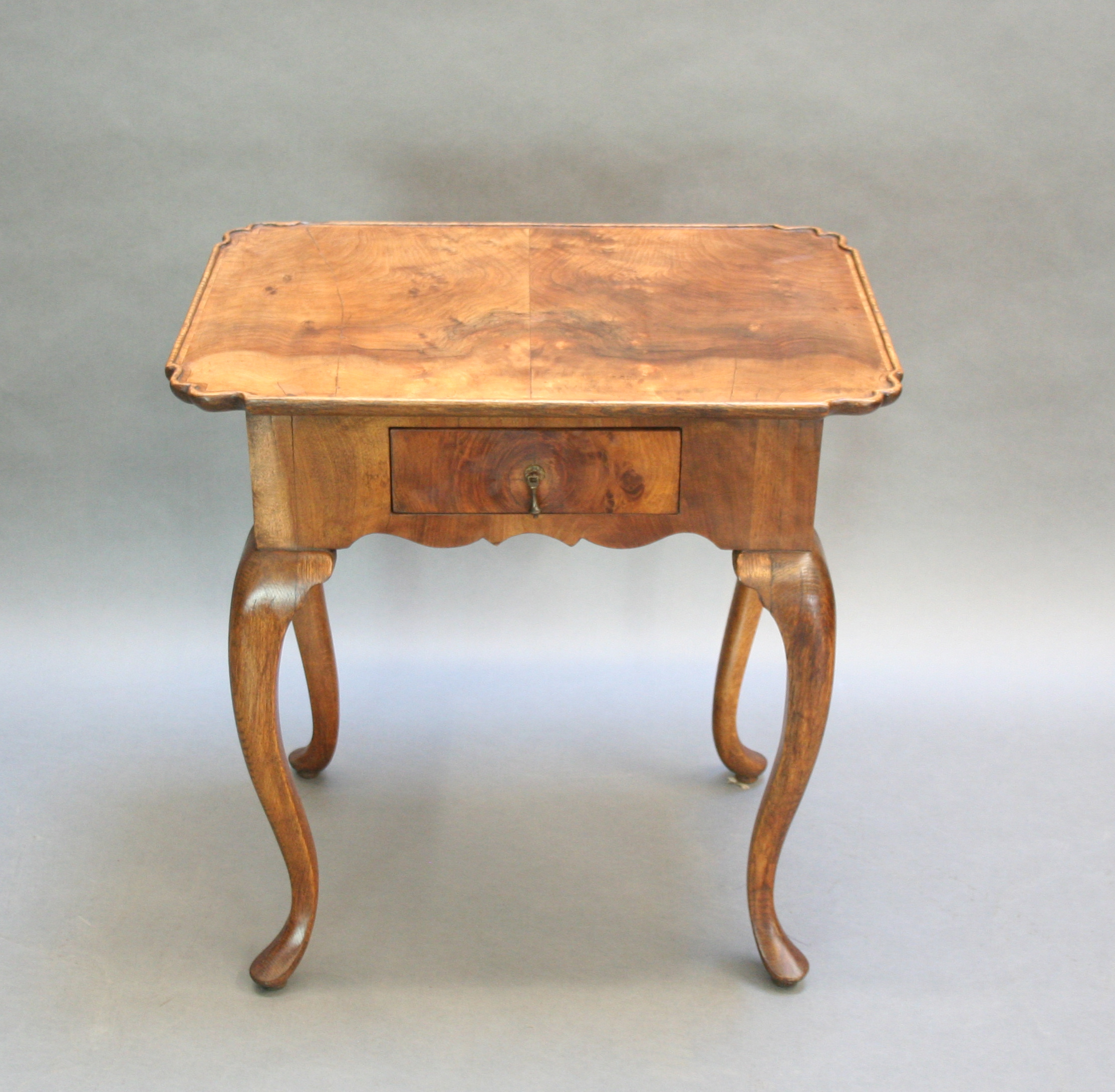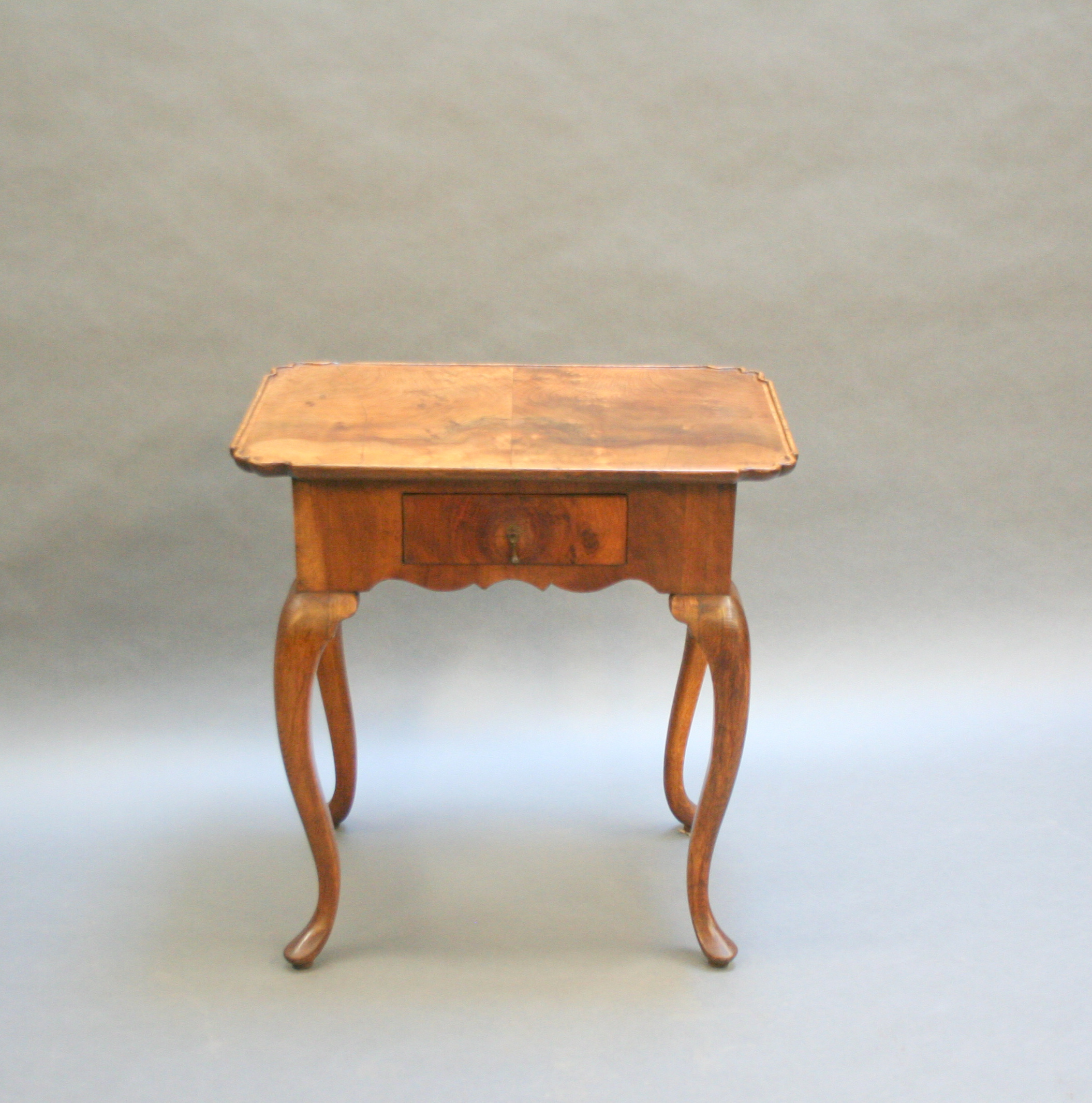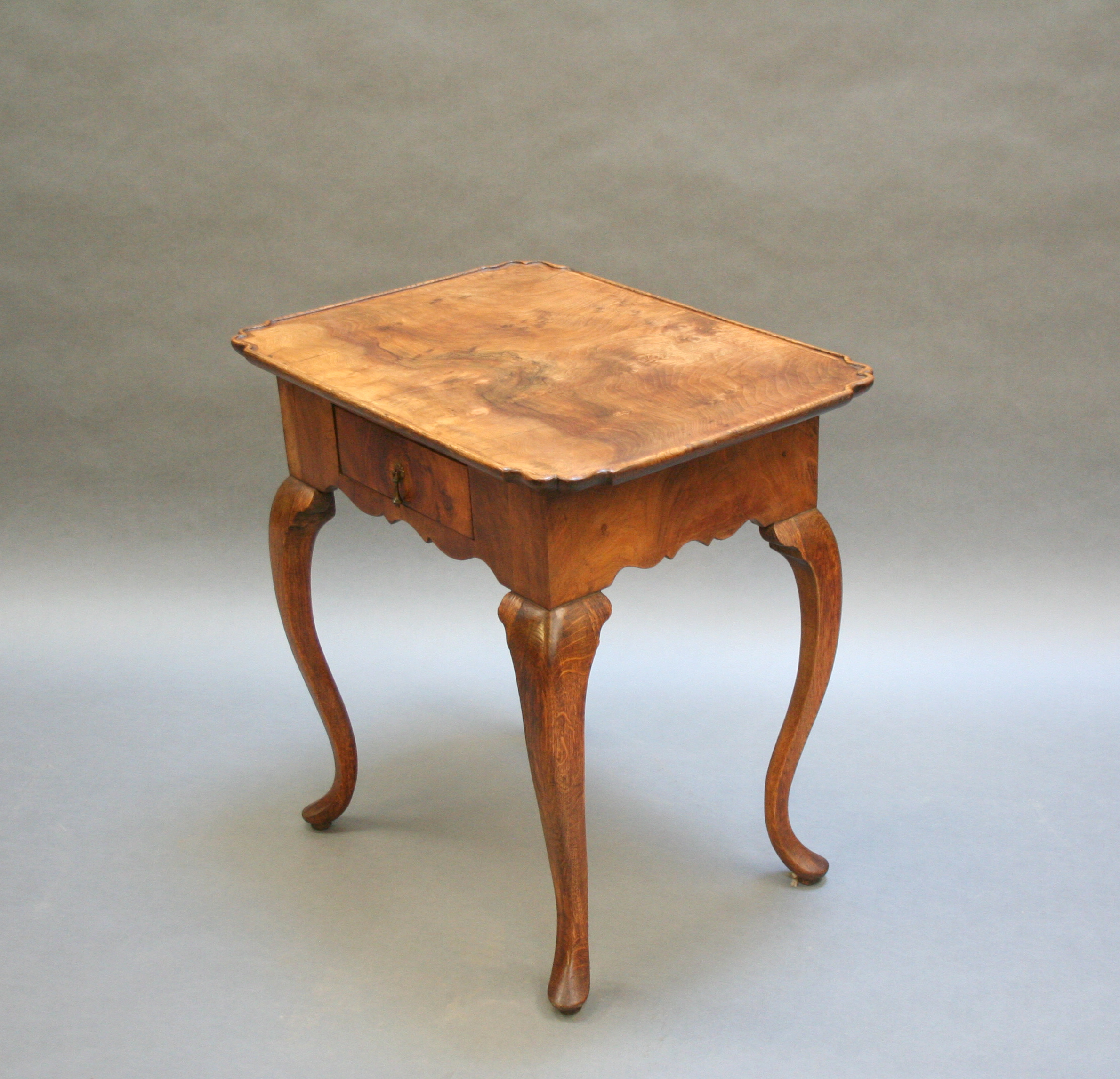 Late C18th well figured walnut, the lipped rectangular top over single drawer and deep shaped frieze raised on oak cabriole supports