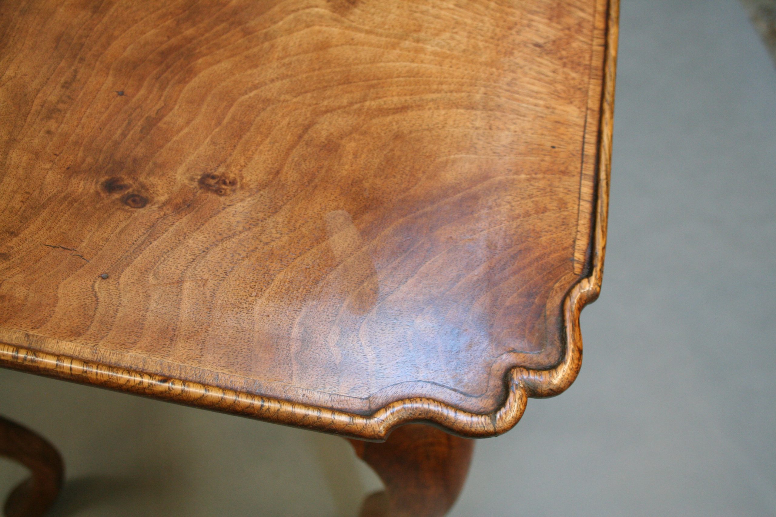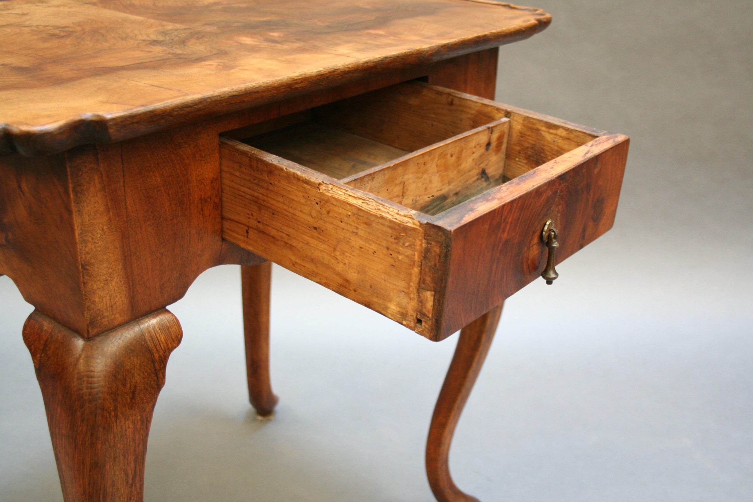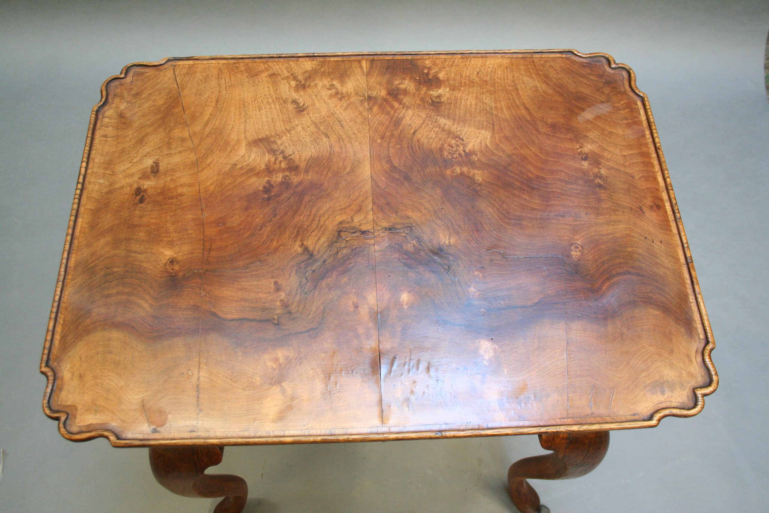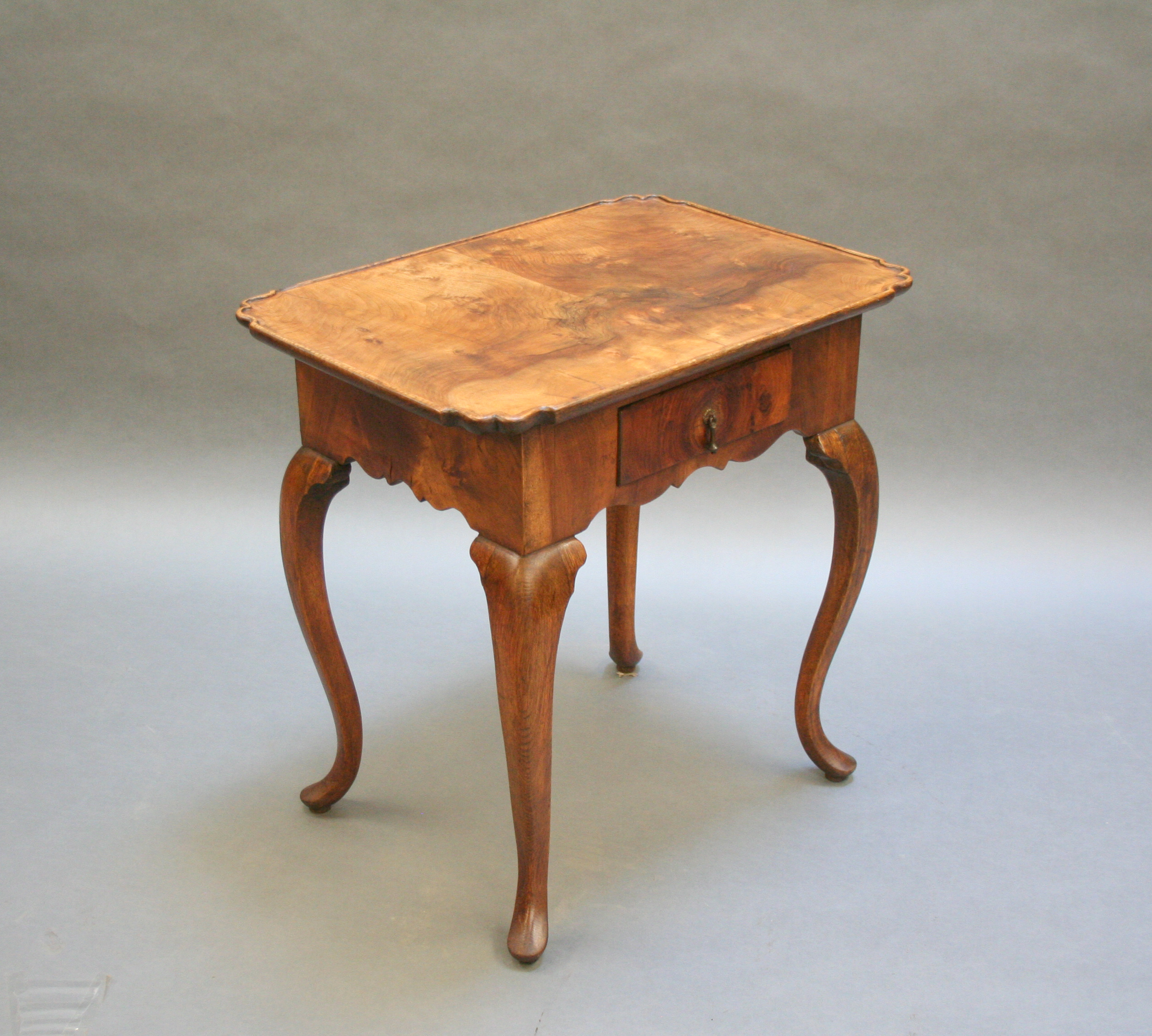 Late C18th well figured walnut, the lipped rectangular top over single drawer and deep shaped frieze raised on oak cabriole supports