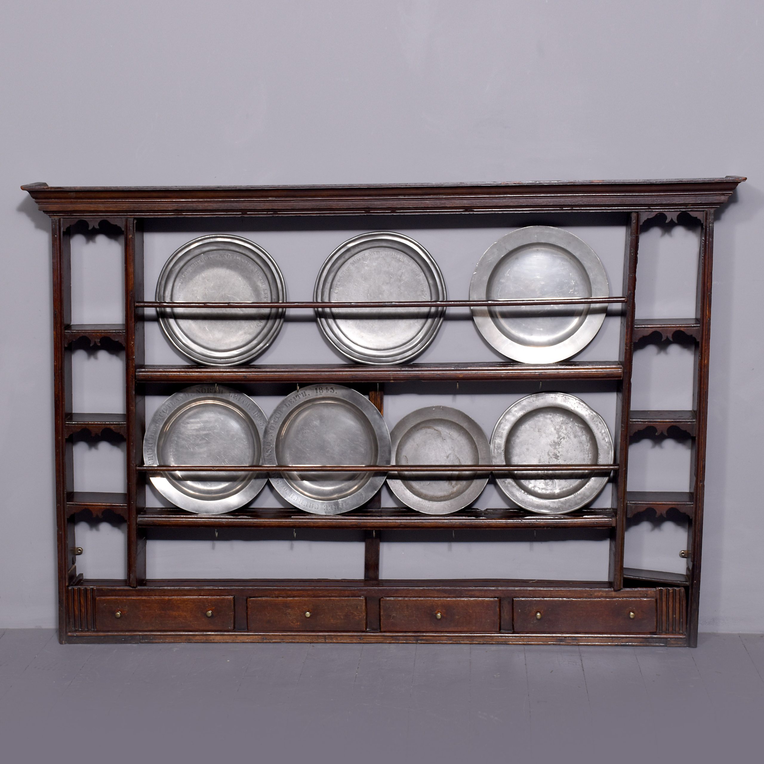 Circa 1760. George 3rd wall mounted oak plate rack/dresser. Surmounted by a classic moulded cornice, the central part with three plate racks with grooves (for plates) and the sides with four shelves with shaped skirts, all above a row of four oak drawers with brass handles. With fluted decorations to the side, lovely original colour and patina.