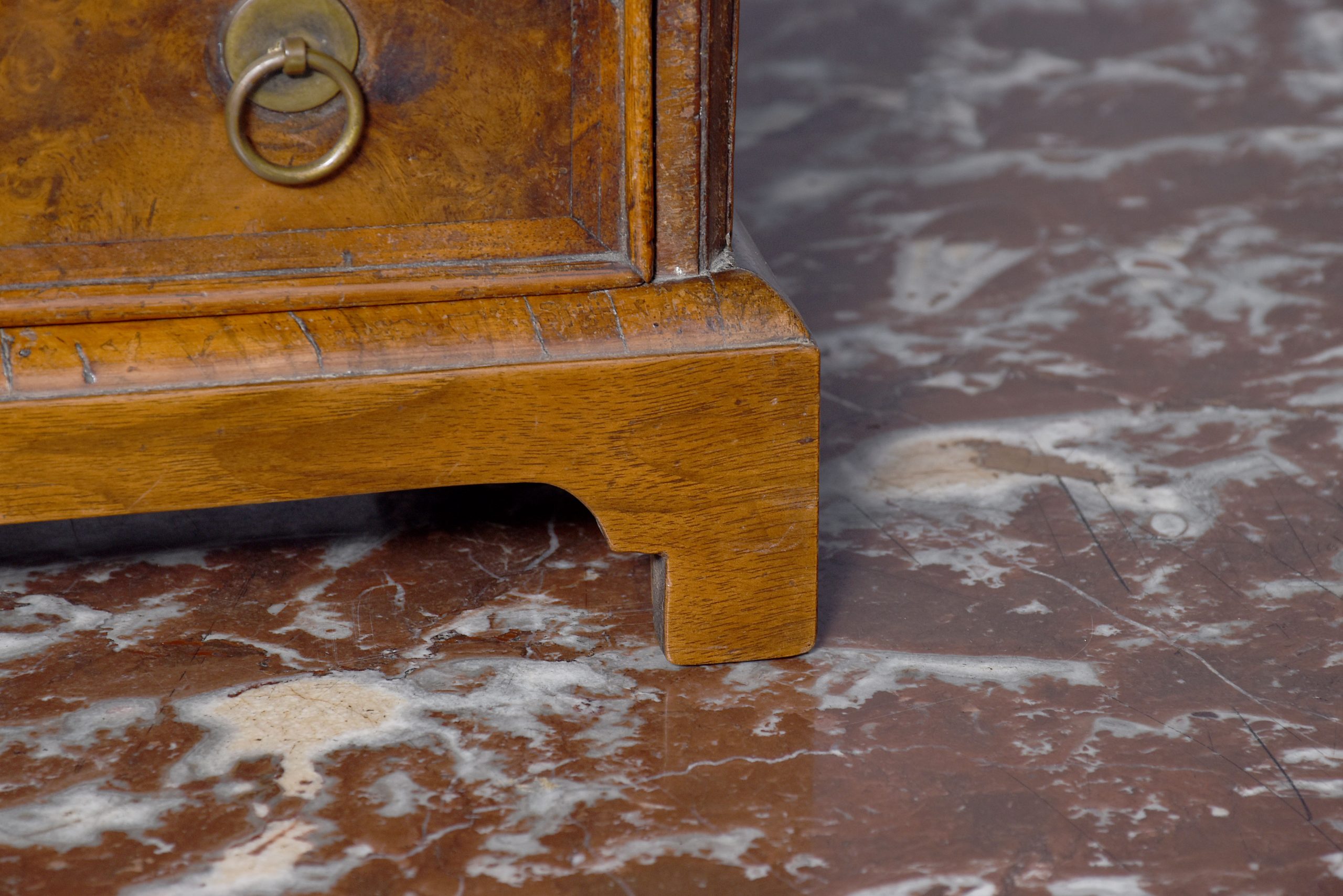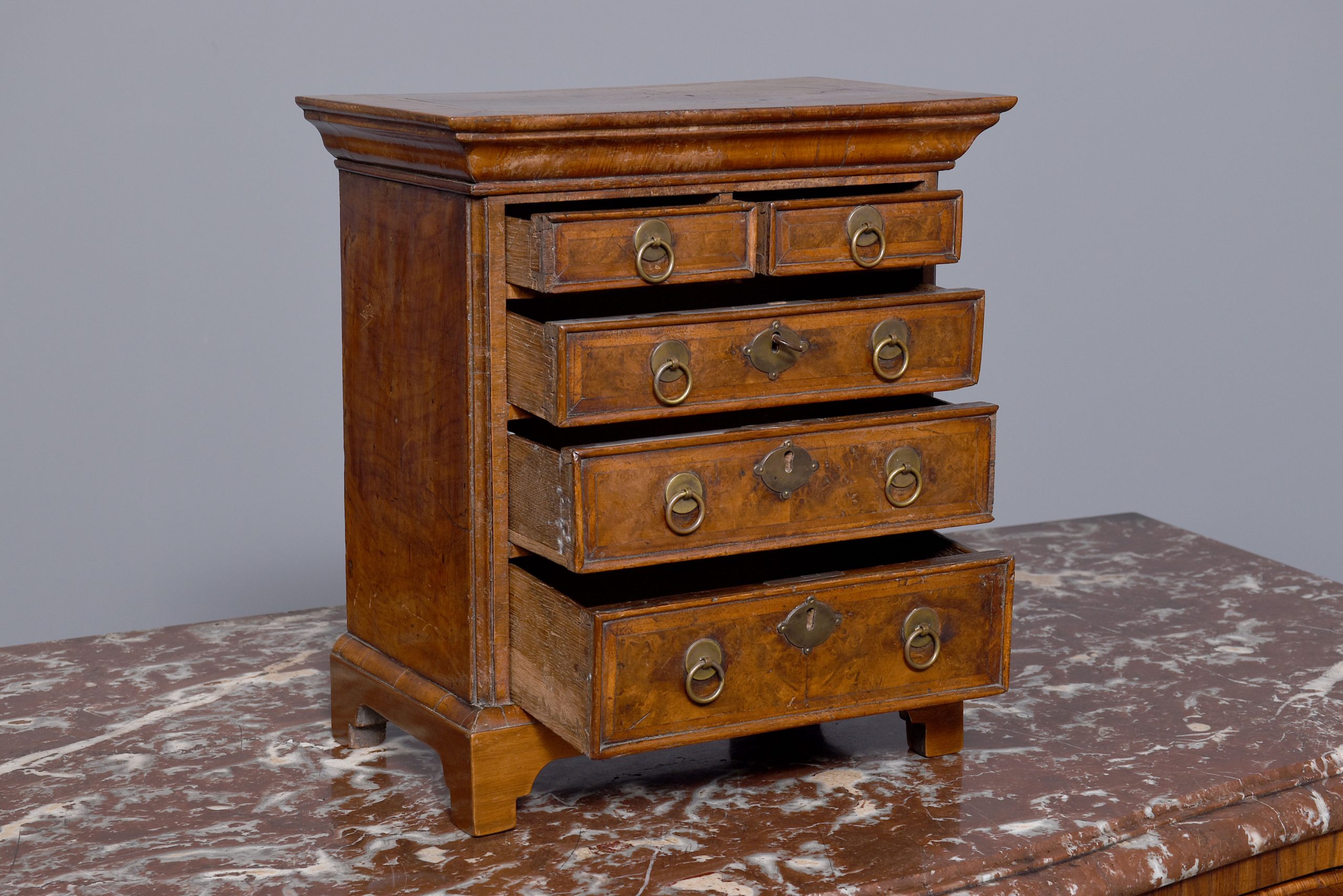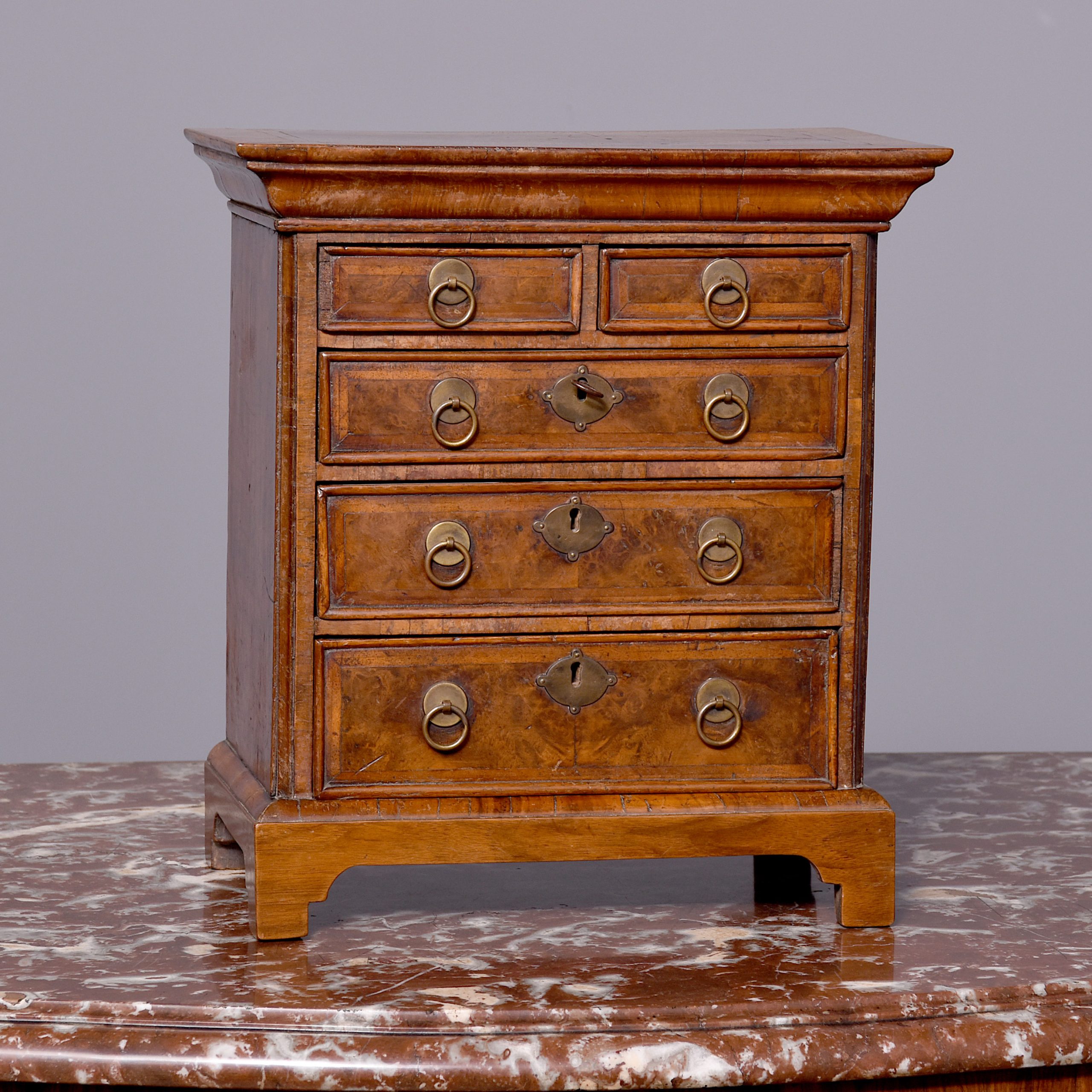 Circa 1790. A George I style walnut chest of diminutive proportions, the top in fine burr walnut framed with herringbone and broad banding, the front with stylish curved moulding, with a configuration of two short over three full length graduating drawers, each with a circular back plate and circular ring pull handle, the larger drawers with elegant escutcheon’s with working locks, all drawers lined in oak, beneath the bottom drawer there is a shaped moulding, all resting on four bracket feet.