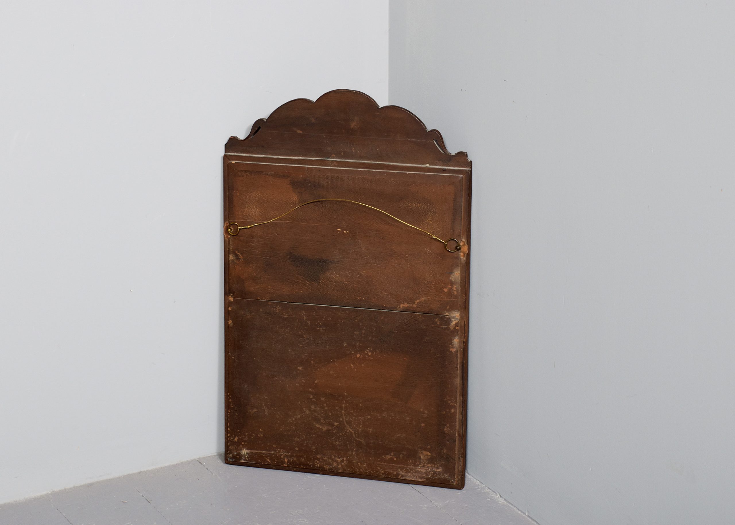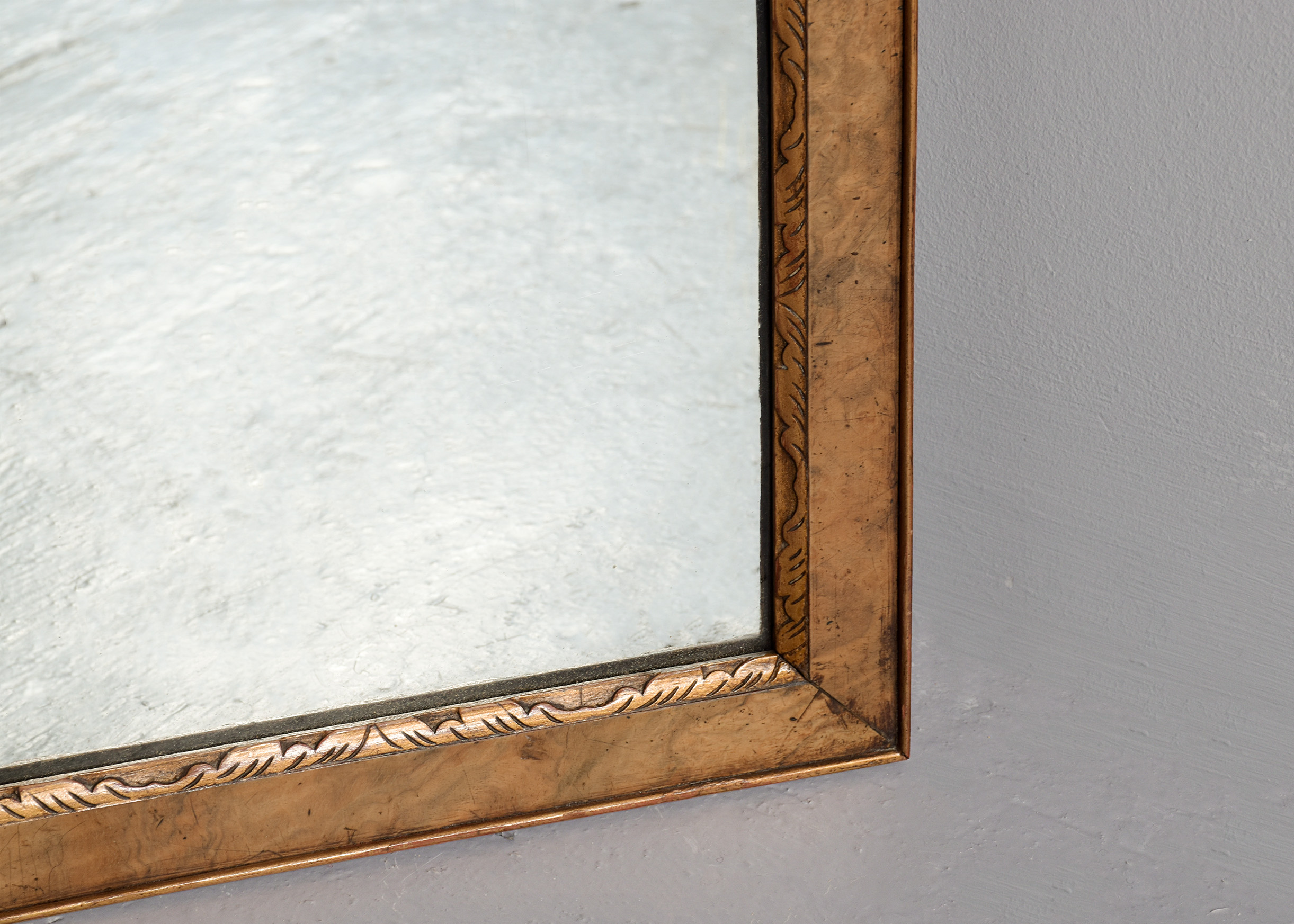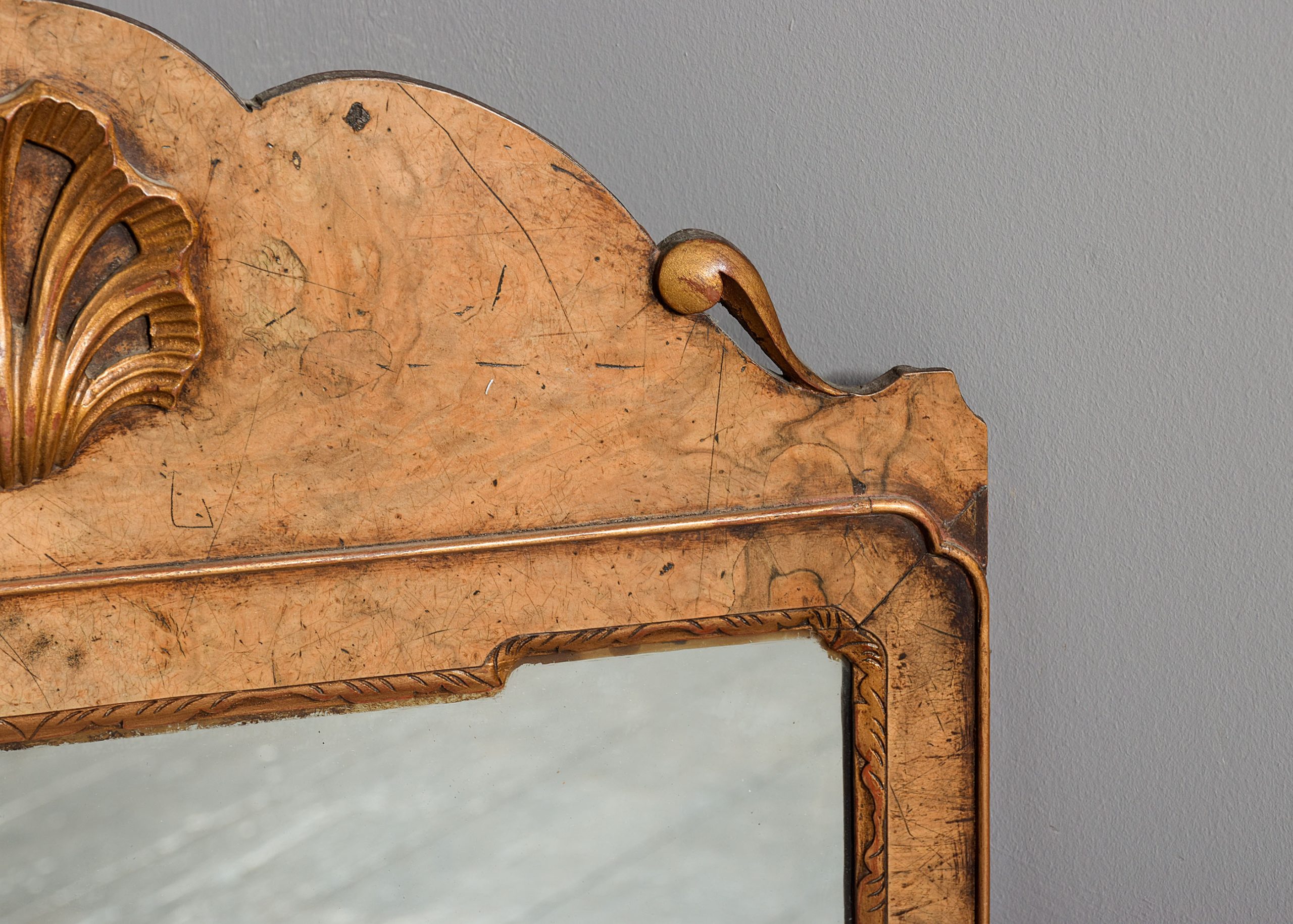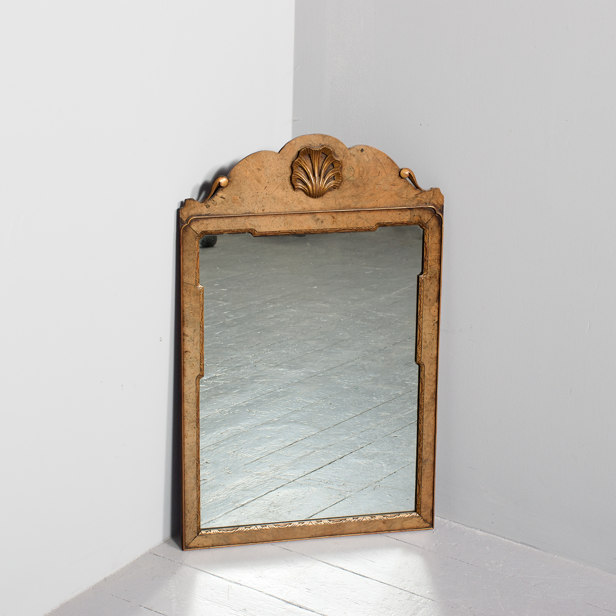 Circa 1900. George I style walnut and gilded mirror, the shaped cresting rail with gilded shell in the center and two small pierced scrolling’s to the end, the original mirror in a carved and gilded shaped slip with burr walnut panel to the outside and a small raised gilded beading which continues around the frame, the burr walnut is mellow in colour and the gilding with excellent patination.