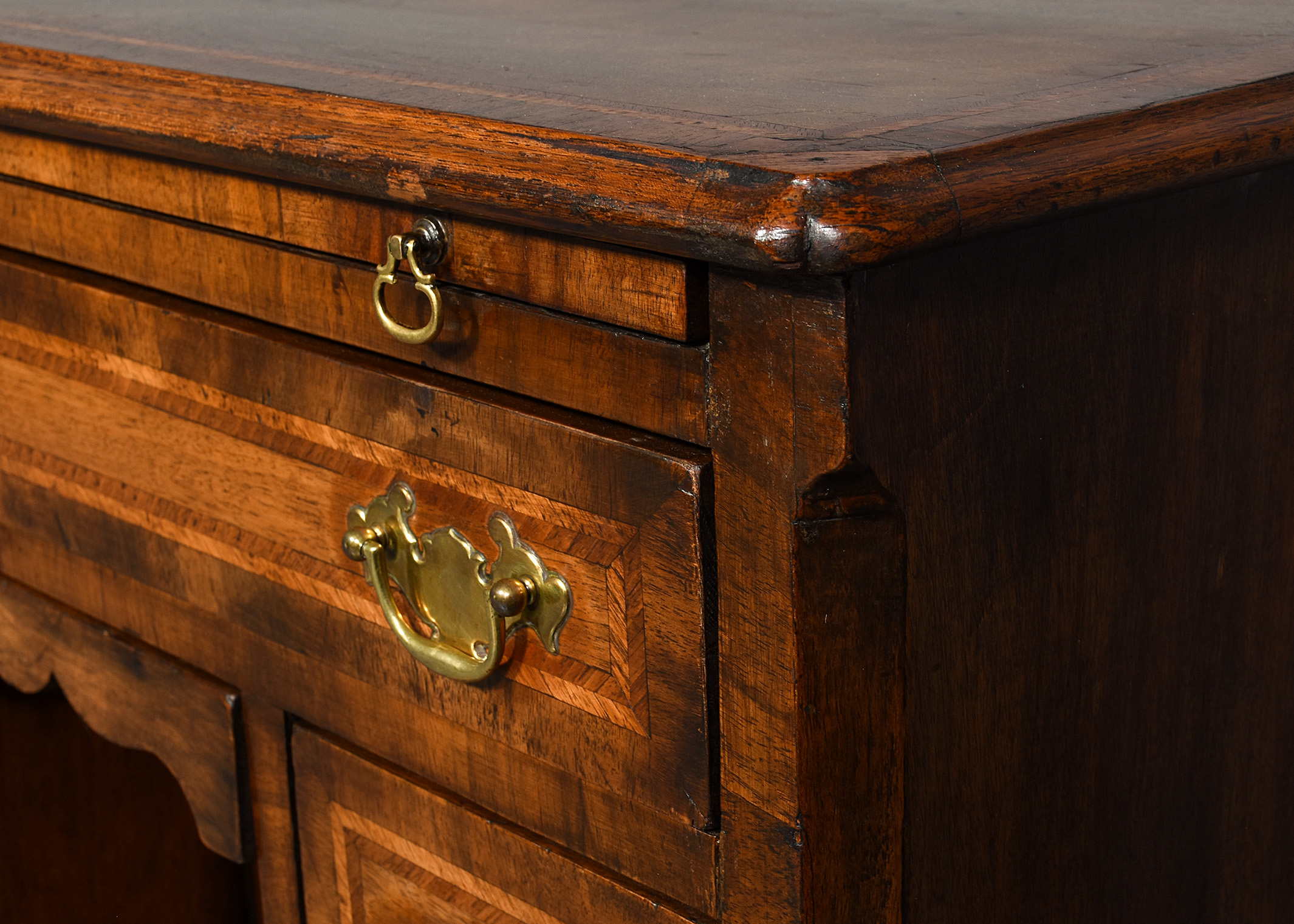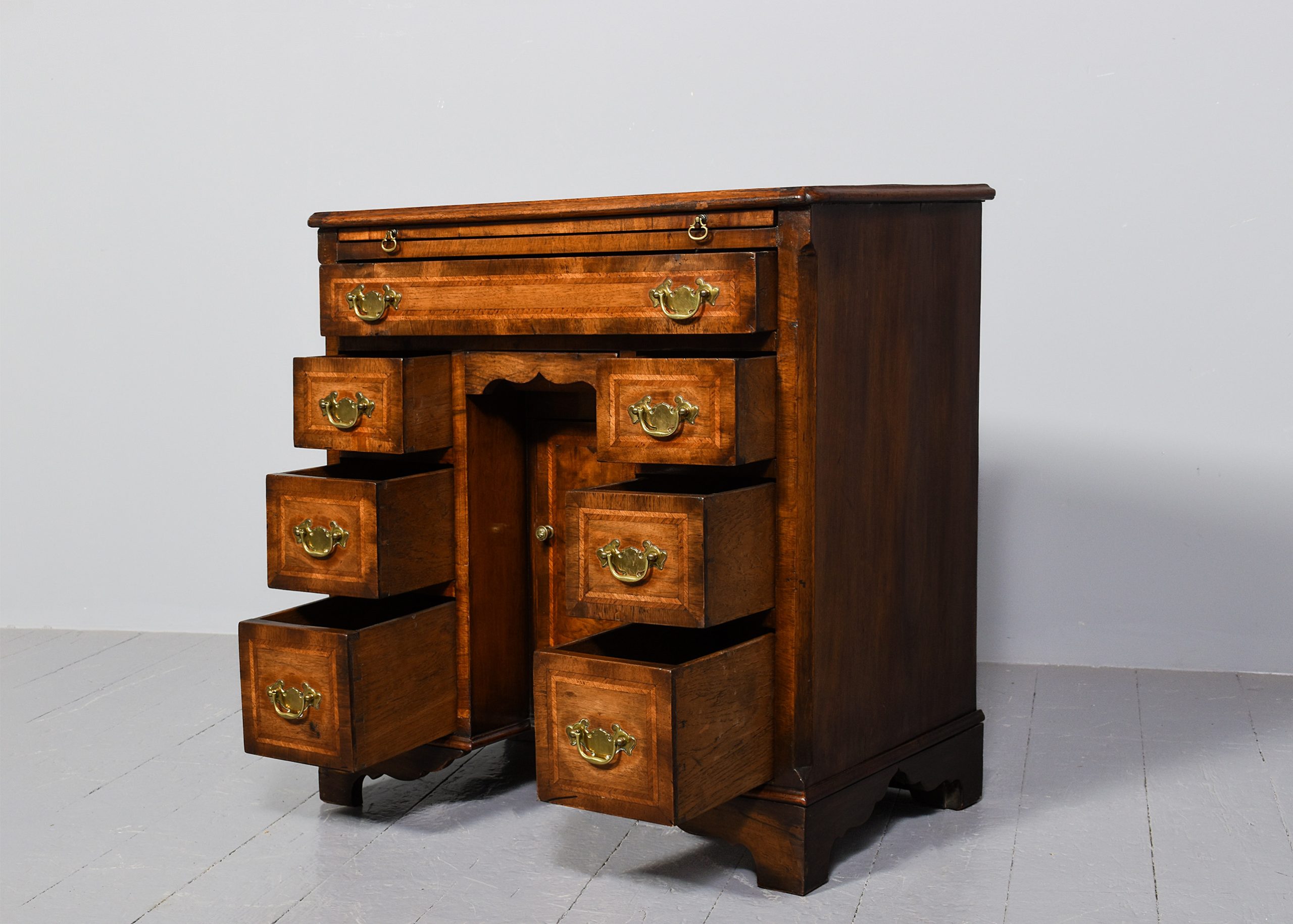 Circa 1880. George II style inlaid figured walnut kneehole dressing chest. The rectangular top with inset corners in mirror-matched figured walnut, herringbone inlay and crossbanding and a moulded fore-edge, bearing a hidden pop-up mirror when the brushing slide is pulled out. Beneath the brushing slide is a long crossbanded and herringbone inlaid drawer with cut brass handles above banks of three smaller drawers on each side of the knee hole with a cupboard. All supported on shaped bracket feet.