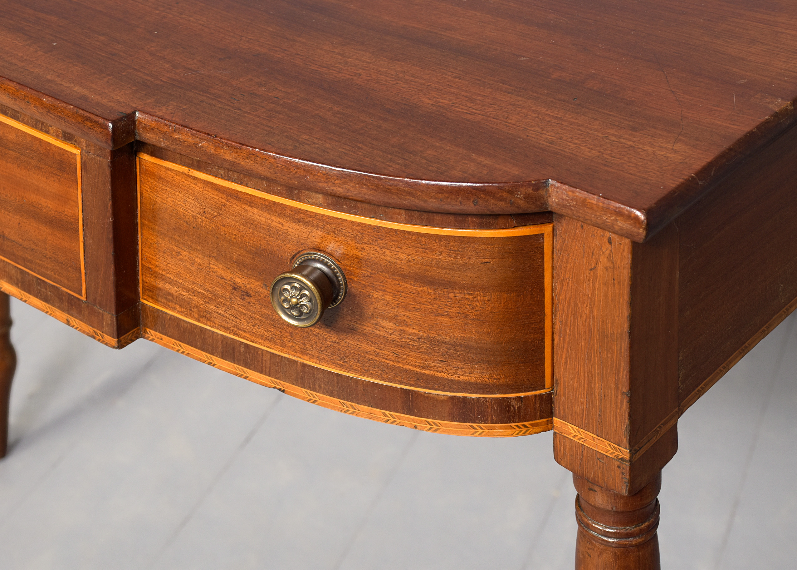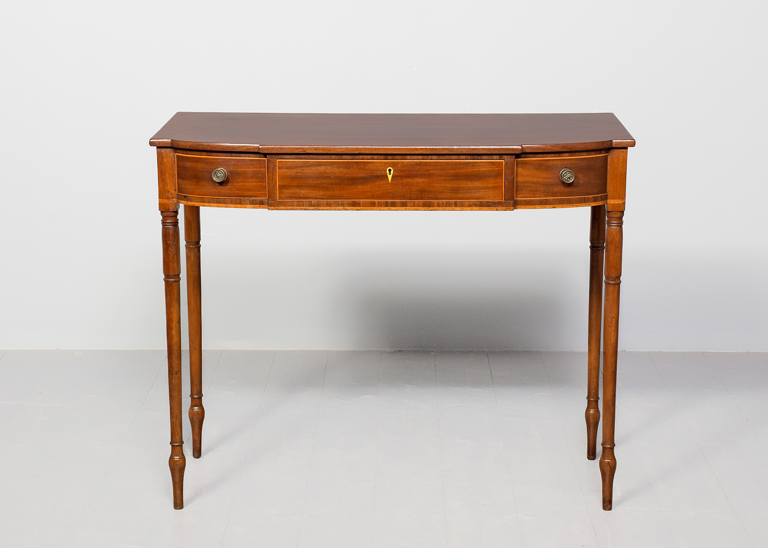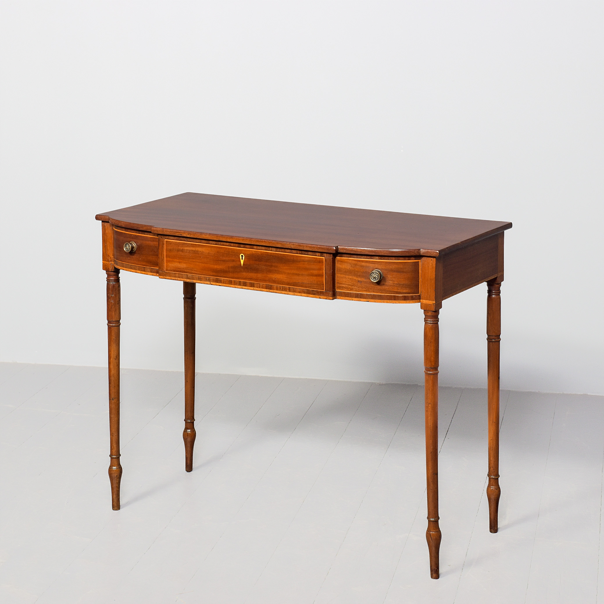 Circa 1800. A late George III mahogany inlaid breakfront side table, the top in well figured mahogany with a simple fore-edge, the front with one full length drawer with boxwood banding and a heraldic shaped escutcheon, flanked by 2 bow front drawers with cast brass knob handles, the frieze with herringbone banding which continues around the sides, the table rests on four elegant turned ring turned and tapering legs finishing on an extended bulbous section finishing on an elegant toe.