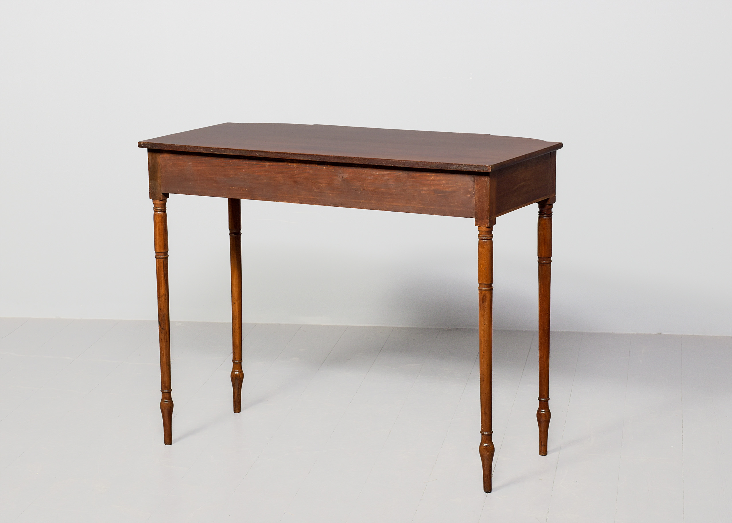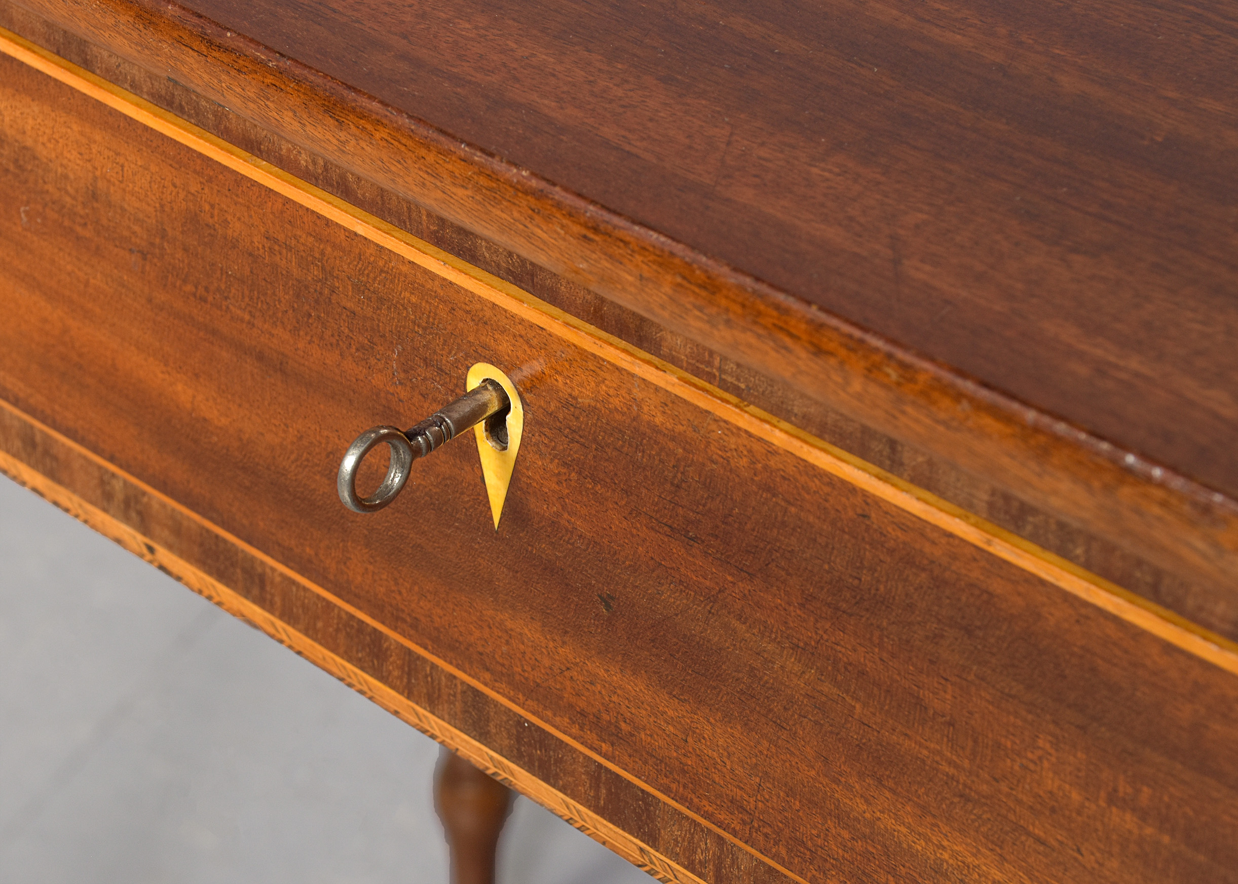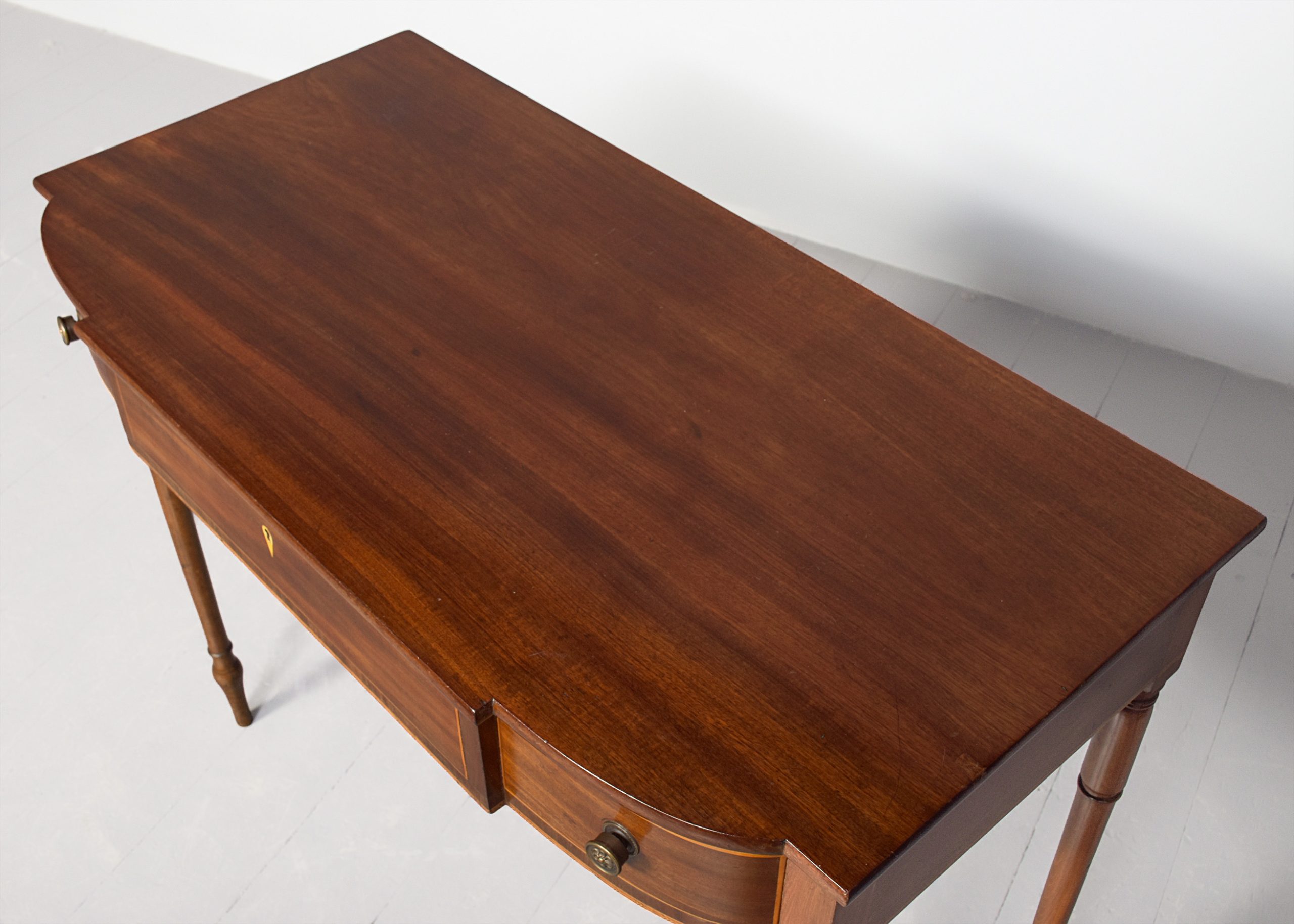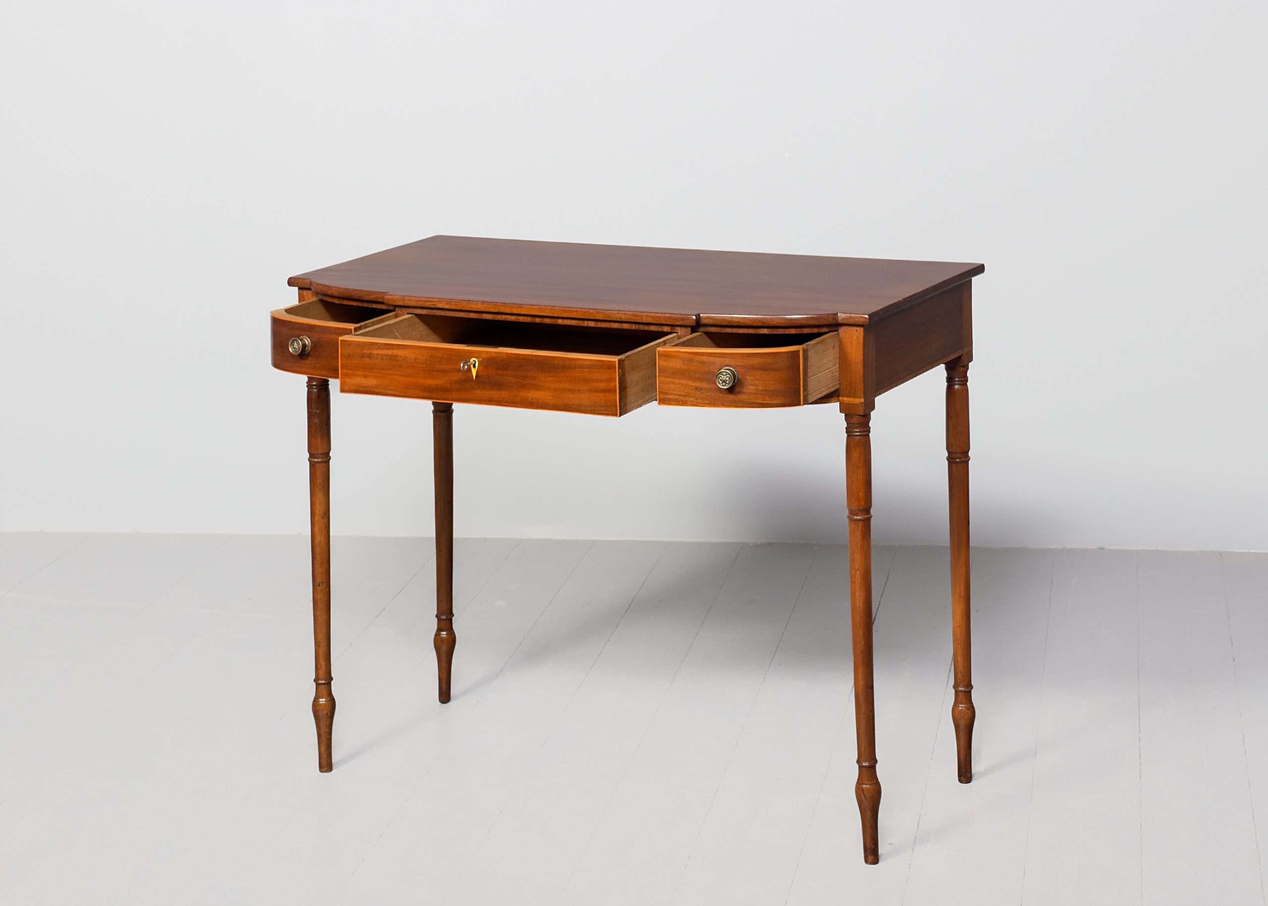 Circa 1800. A late George III mahogany inlaid breakfront side table, the top in well figured mahogany with a simple fore-edge, the front with one full length drawer with boxwood banding and a heraldic shaped escutcheon, flanked by 2 bow front drawers with cast brass knob handles, the frieze with herringbone banding which continues around the sides, the table rests on four elegant turned ring turned and tapering legs finishing on an extended bulbous section finishing on an elegant toe.