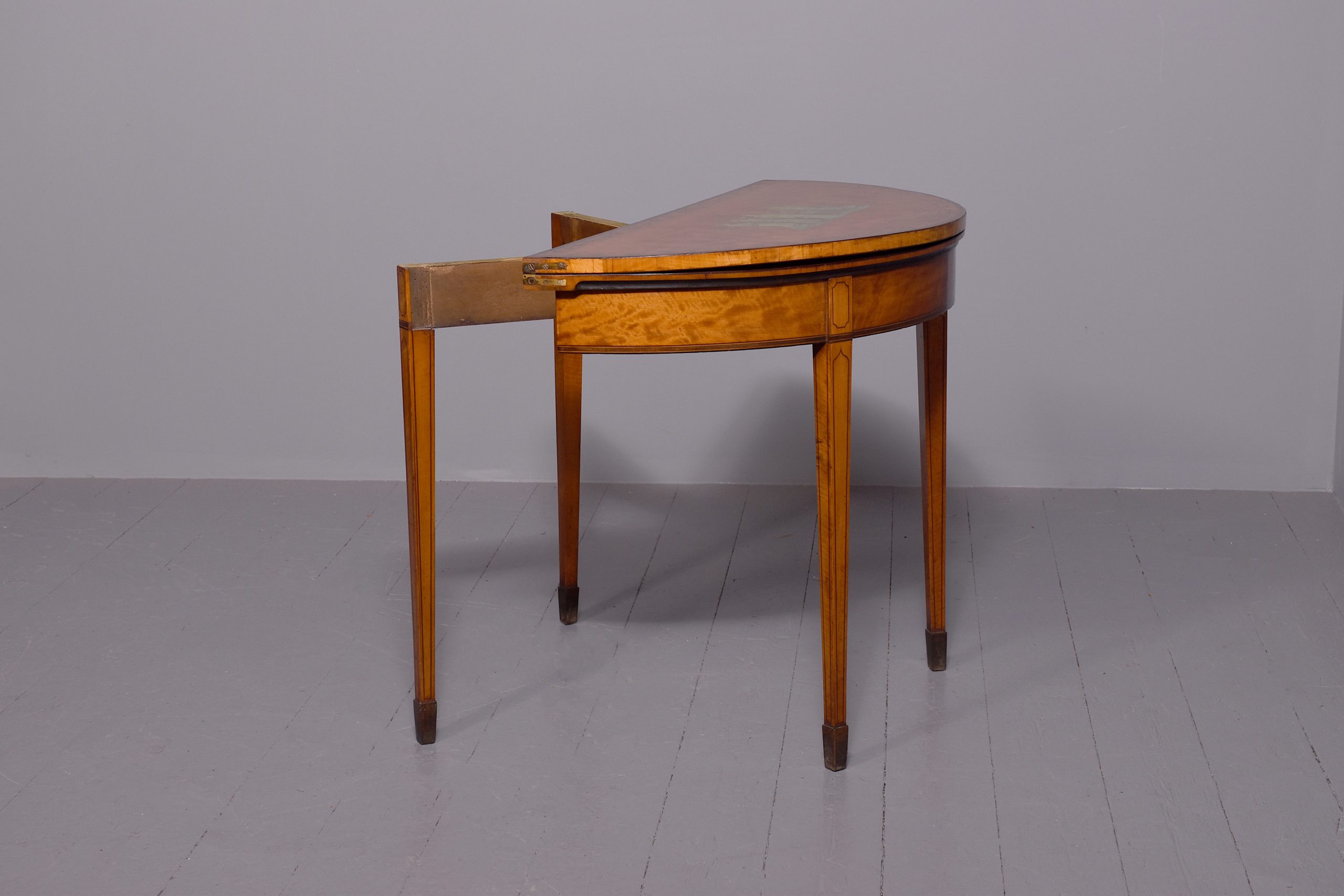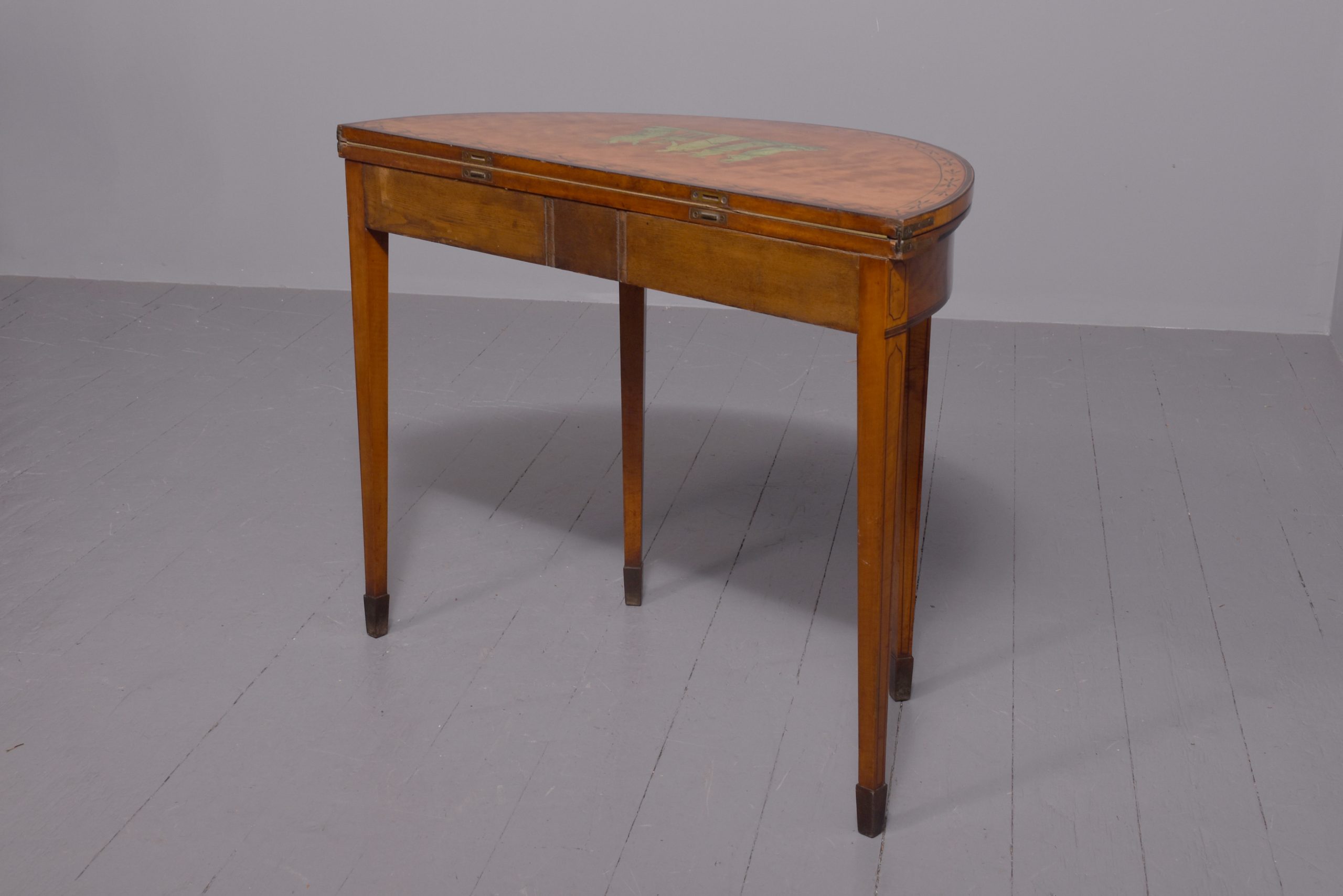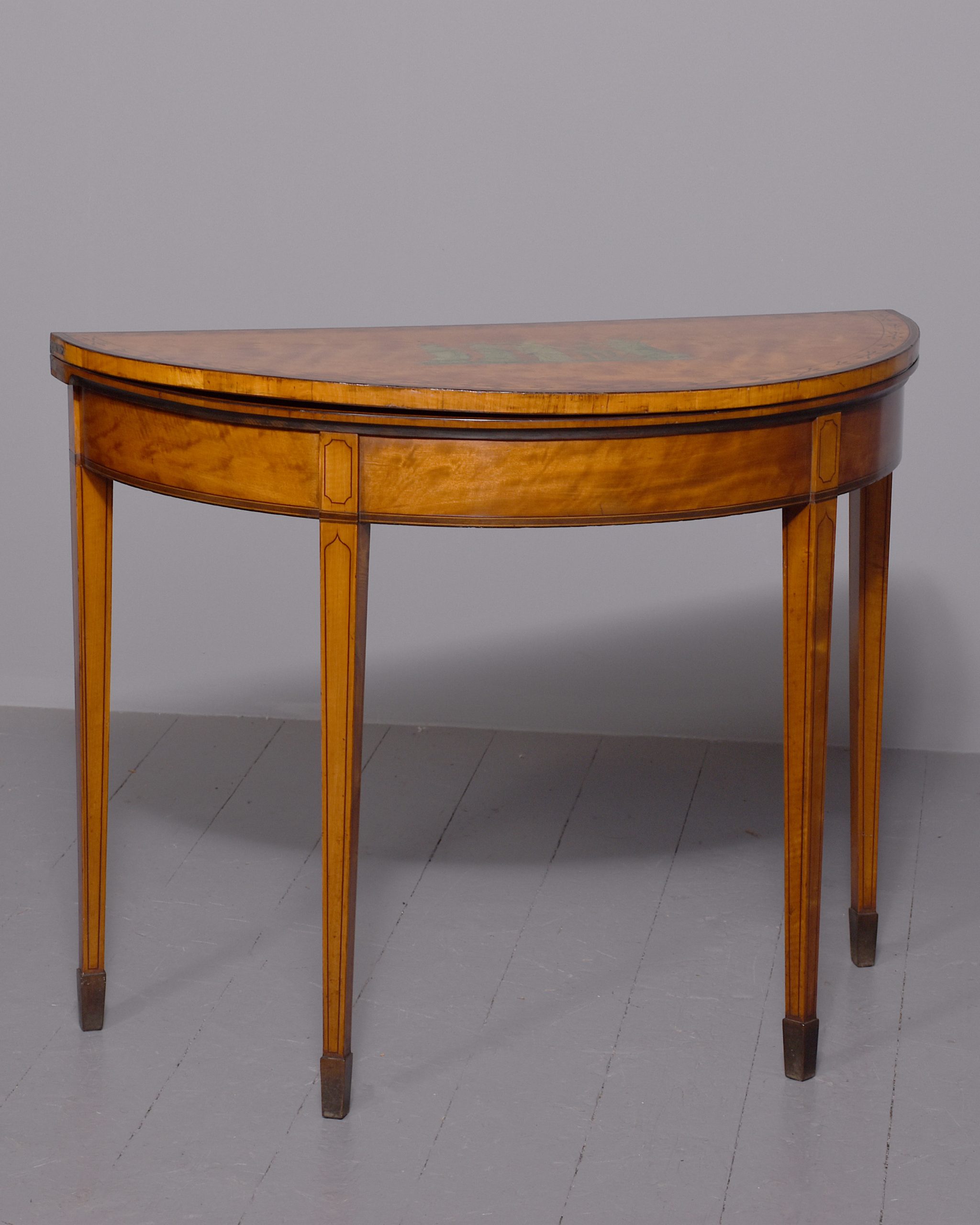 Circa 1790. A late George III satinwood and painted demi lune fold over card table, the top in silky satinwood with a painted classical scene of Greek goddesses, the border with foliate painted pattern in rosewood with boxwood banding, the hinged top opens to reveal a crossbanded and felt lined interior, the back legs are hinged and swing out to support the table when open, the frieze with inlay on the top and bottom, resting on four square tapering legs with raised panels above the legs with a small gothic arch beneath, with string inlay on all sides finishing on an extended splayed toe.