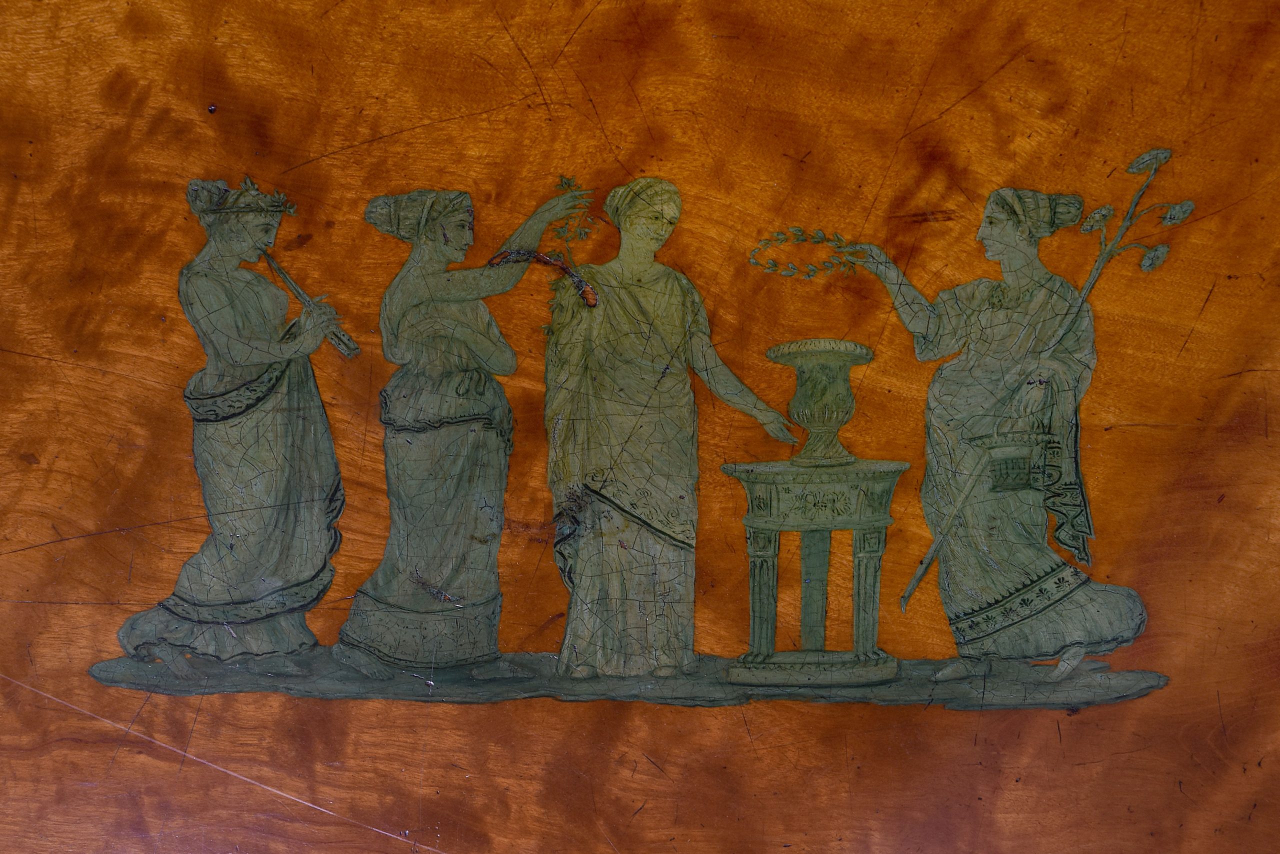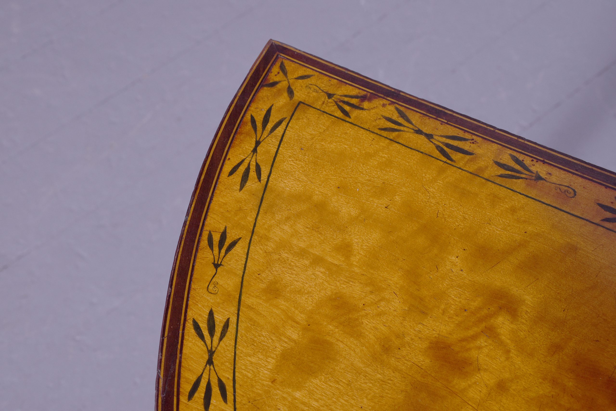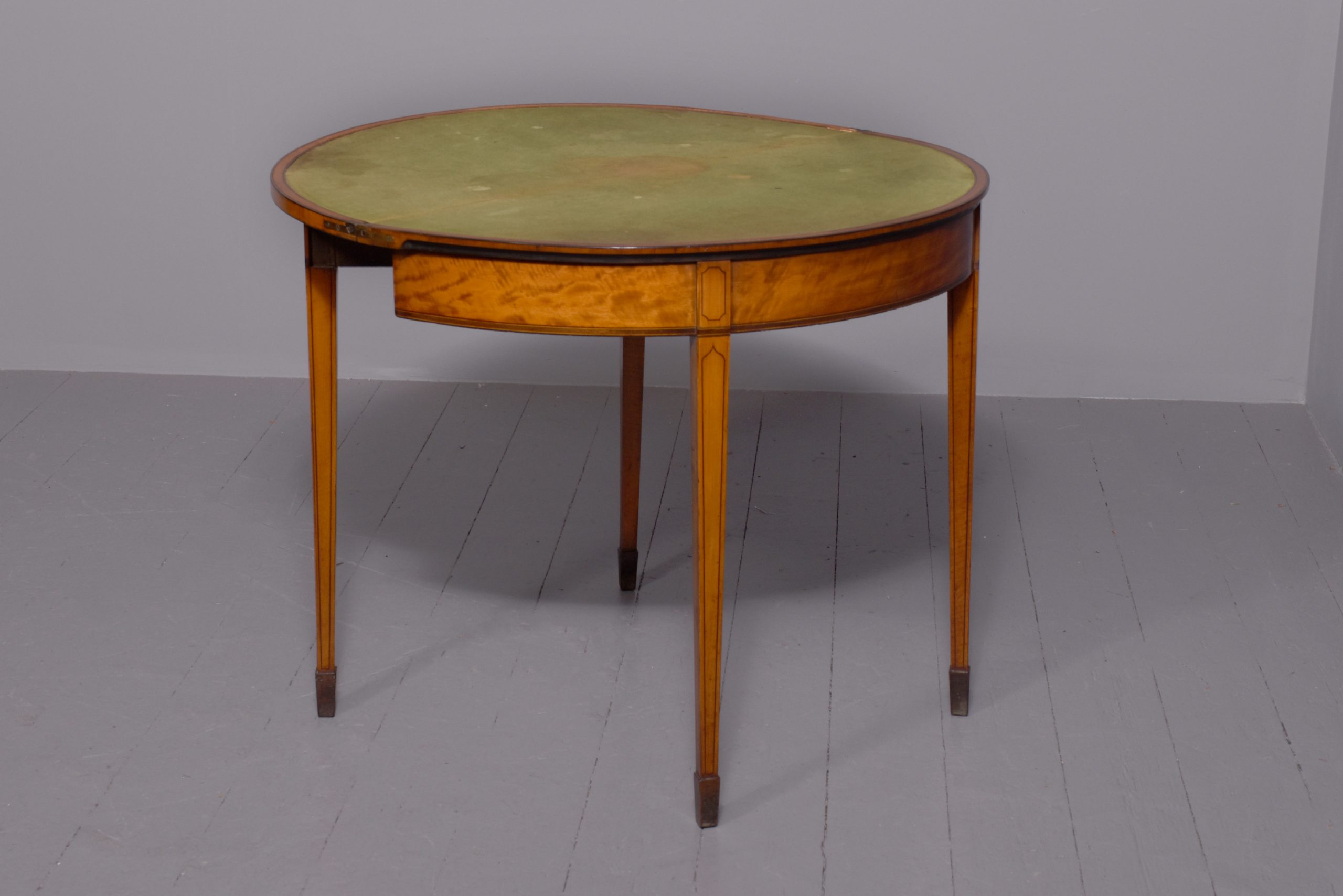 Circa 1790. A late George III satinwood and painted demi lune fold over card table, the top in silky satinwood with a painted classical scene of Greek goddesses, the border with foliate painted pattern in rosewood with boxwood banding, the hinged top opens to reveal a crossbanded and felt lined interior, the back legs are hinged and swing out to support the table when open, the frieze with inlay on the top and bottom, resting on four square tapering legs with raised panels above the legs with a small gothic arch beneath, with string inlay on all sides finishing on an extended splayed toe.