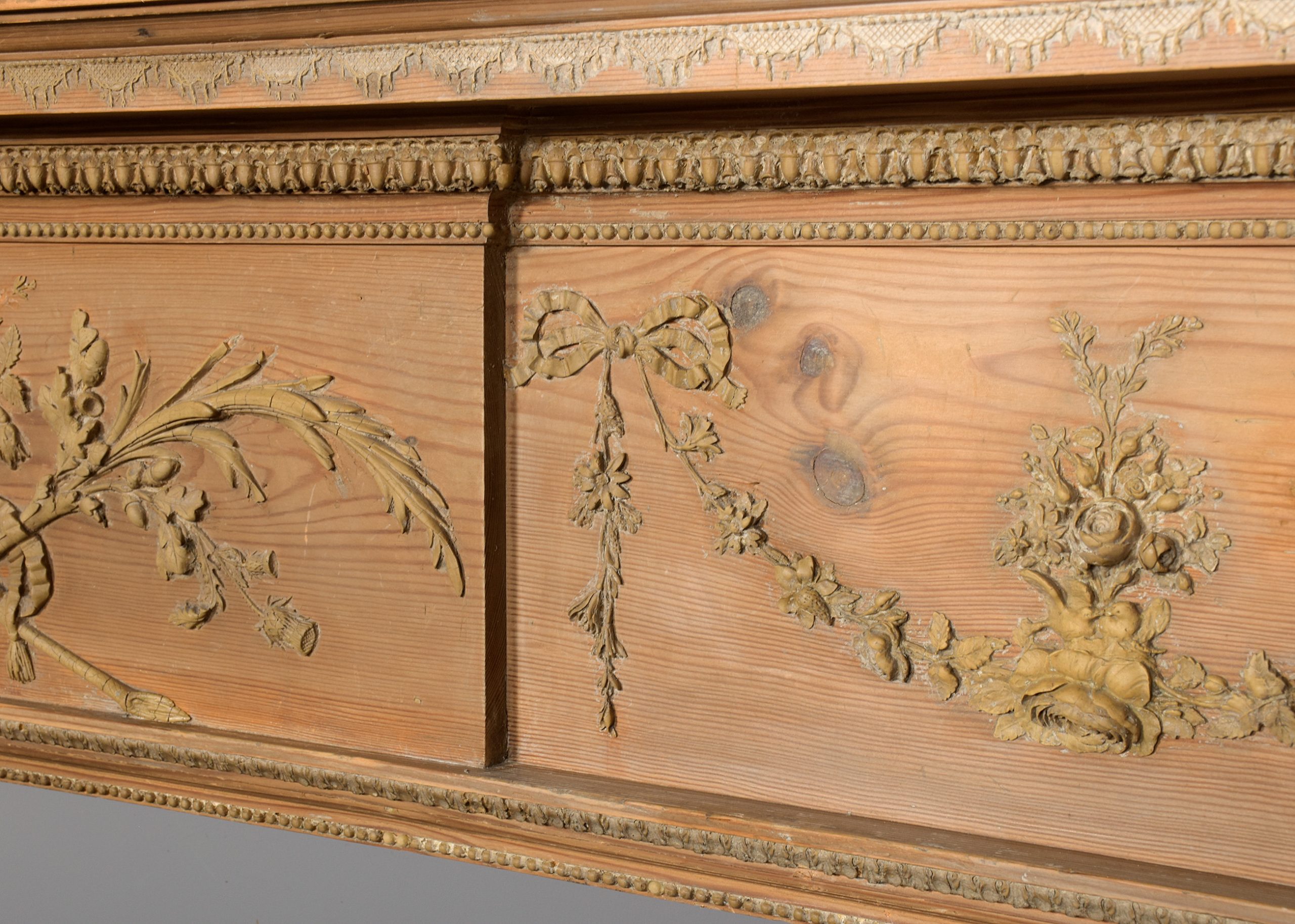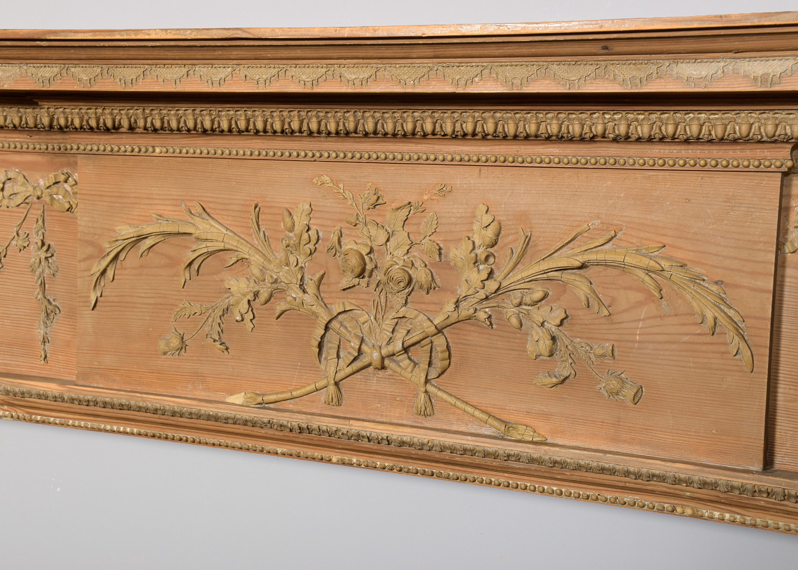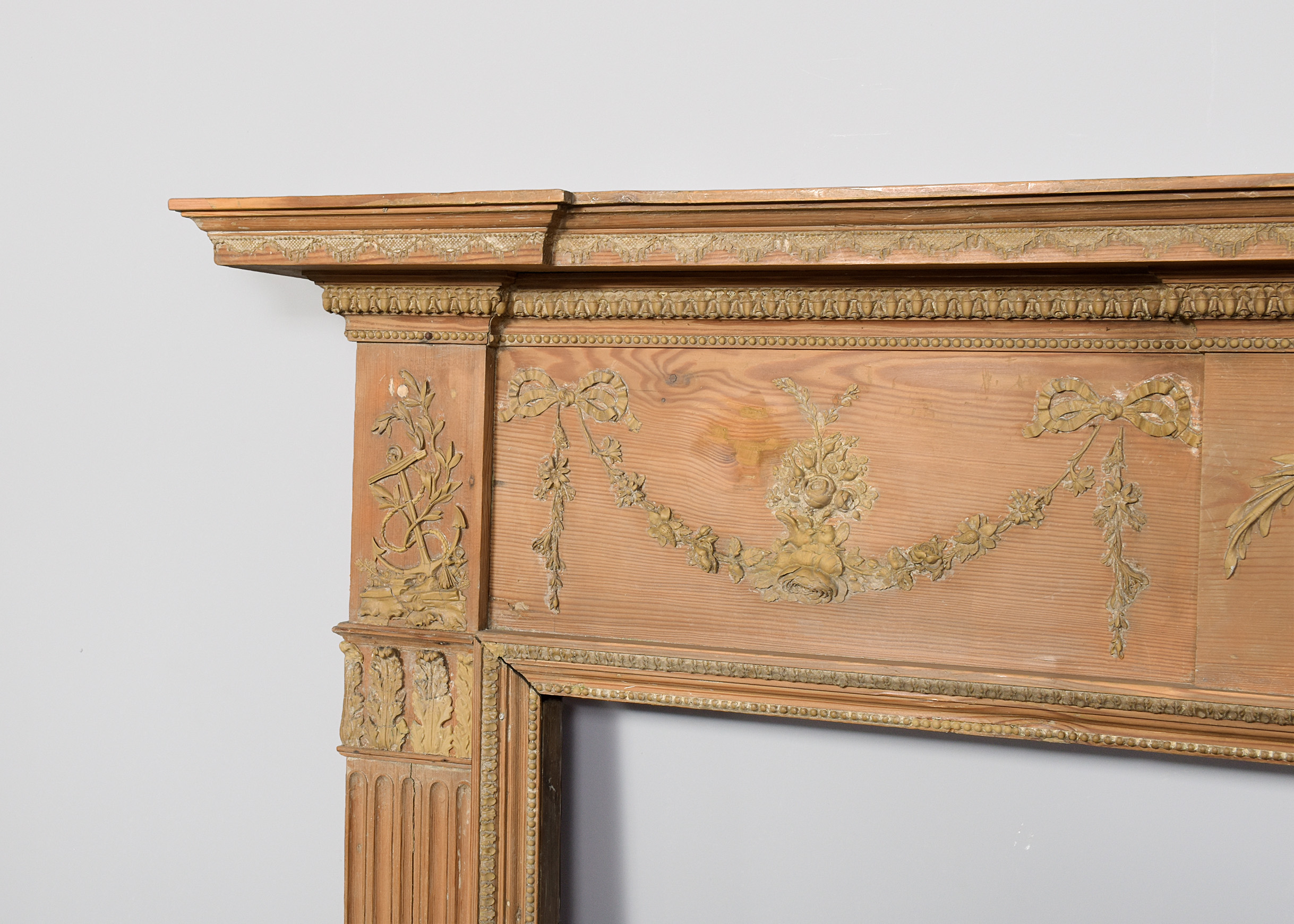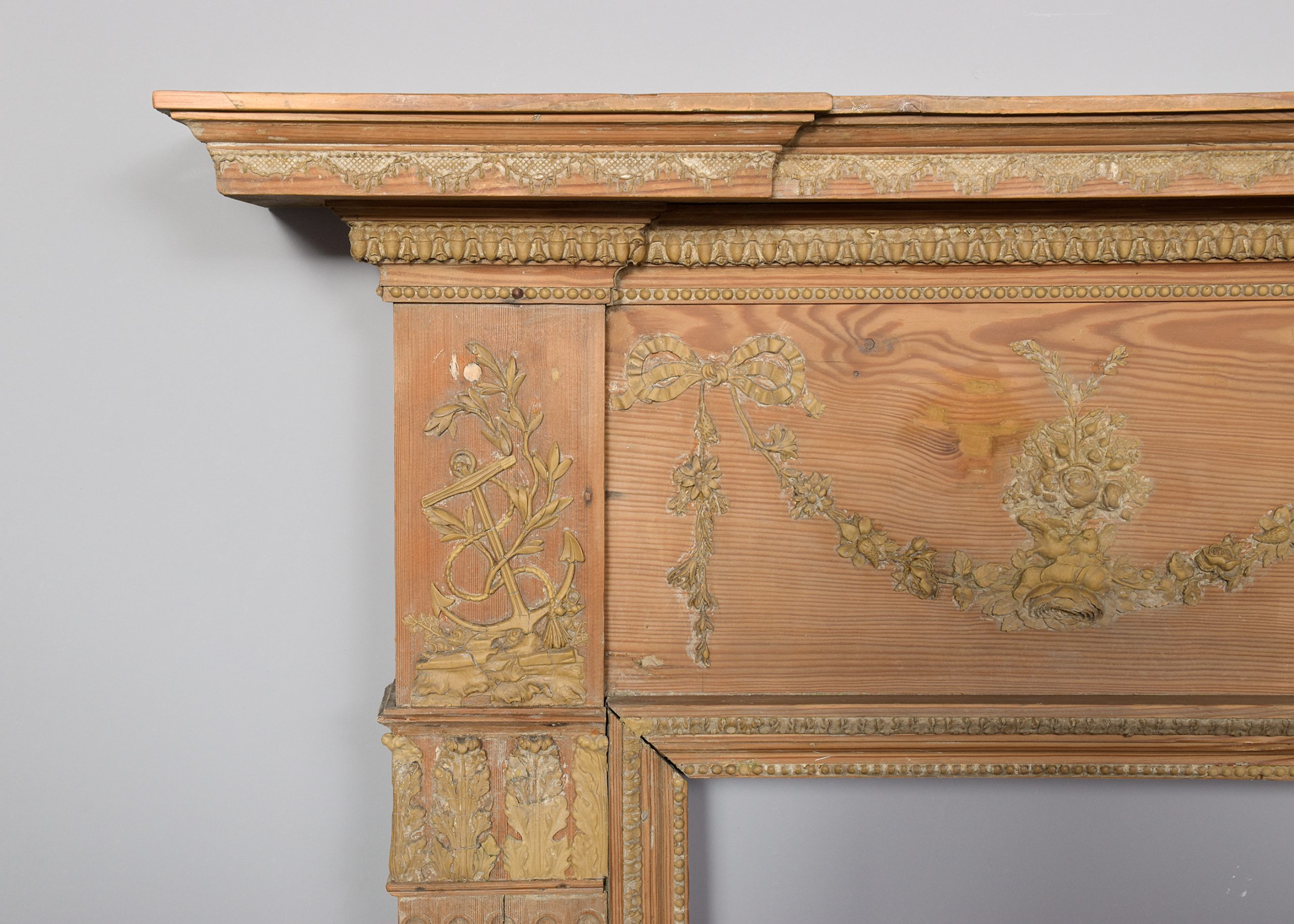 Circa 1800. A classic Edinburgh George III pine and gesso mantelpiece, the shaped flat top with a stylish frieze of drapes with trellis work in finely carved gesso, the frieze with carved acorns with beading beneath, the large panel with a swag with roses, thistles and foliate carving with a ribbon at the base with swags and tails to the sides, and the tops of the uprights with a carved anchor (indicating it could have been made for a Leith merchant), supported on a pair of fluted uprights headed by carved acanthus leaves and resting on a block base.