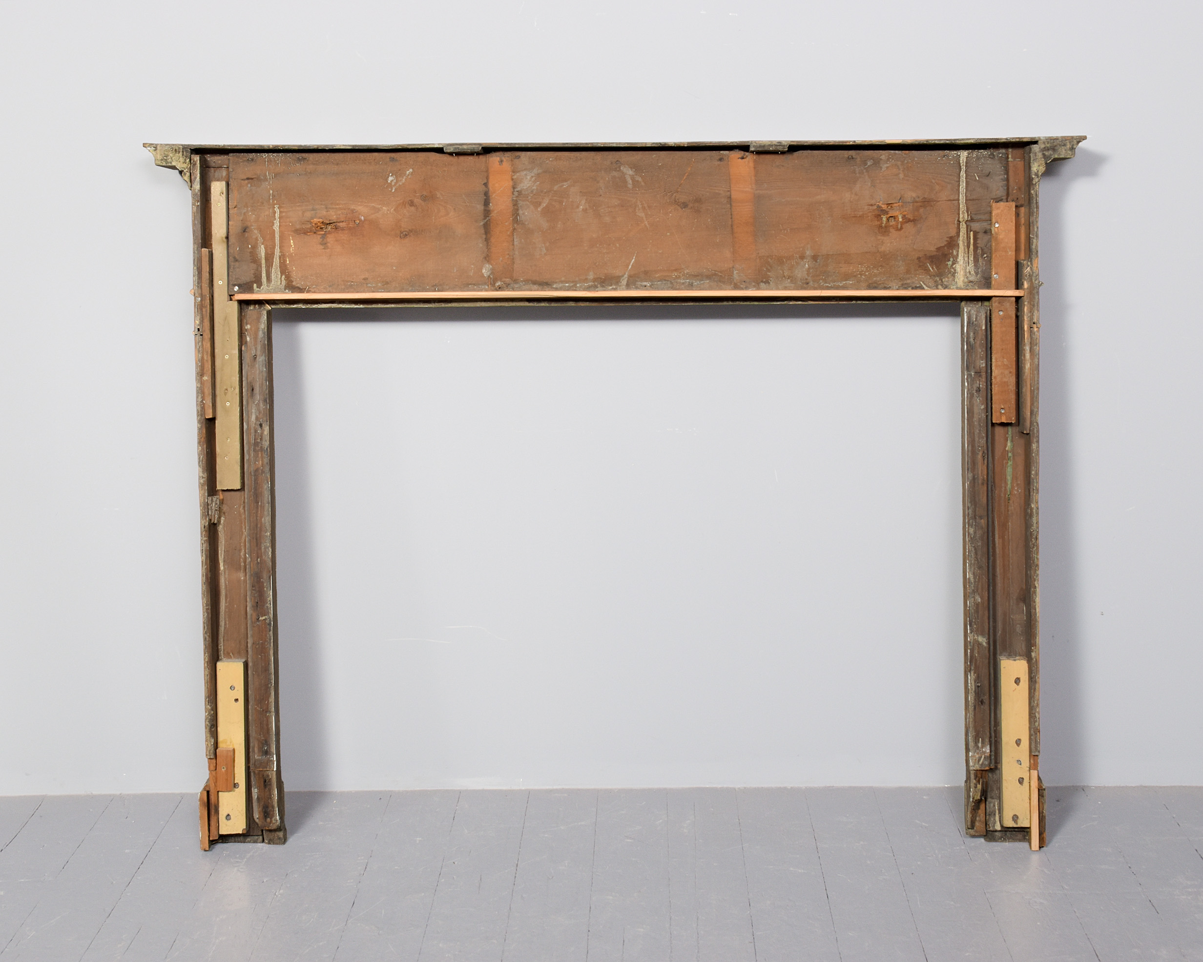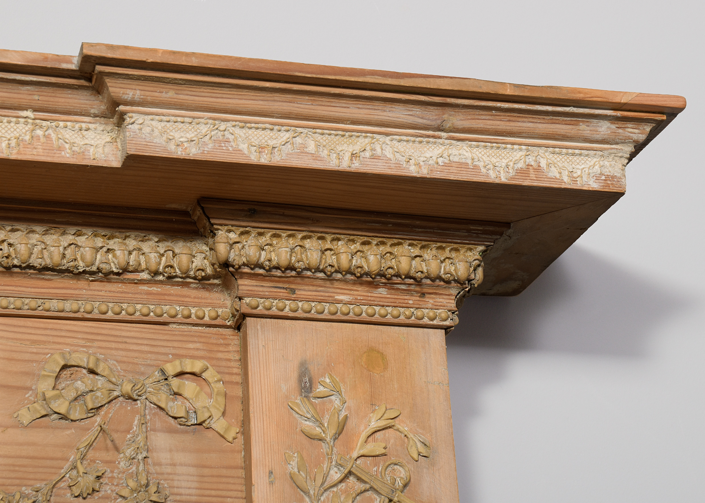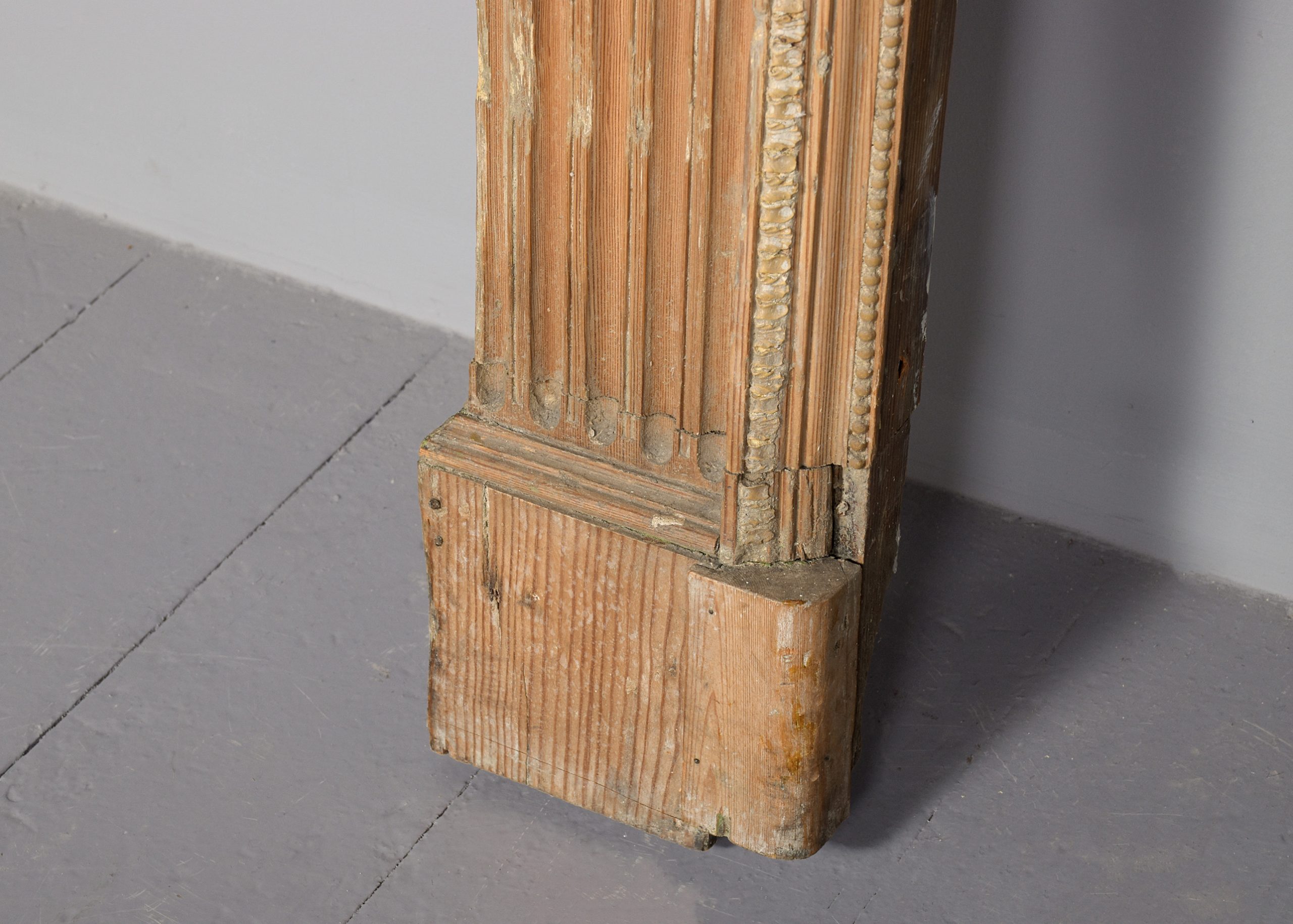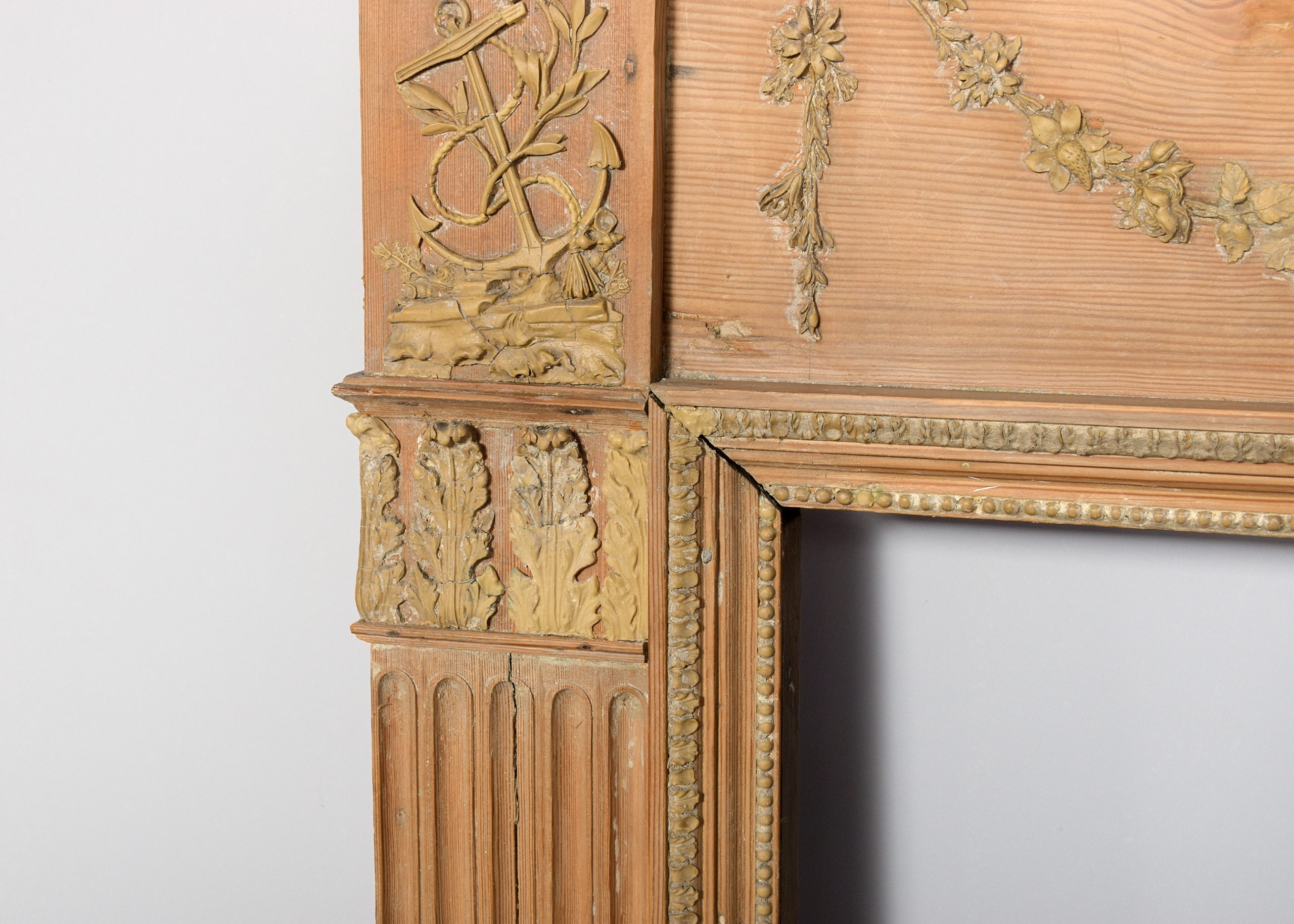 Circa 1800. A classic Edinburgh George III pine and gesso mantelpiece, the shaped flat top with a stylish frieze of drapes with trellis work in finely carved gesso, the frieze with carved acorns with beading beneath, the large panel with a swag with roses, thistles and foliate carving with a ribbon at the base with swags and tails to the sides, and the tops of the uprights with a carved anchor (indicating it could have been made for a Leith merchant), supported on a pair of fluted uprights headed by carved acanthus leaves and resting on a block base.