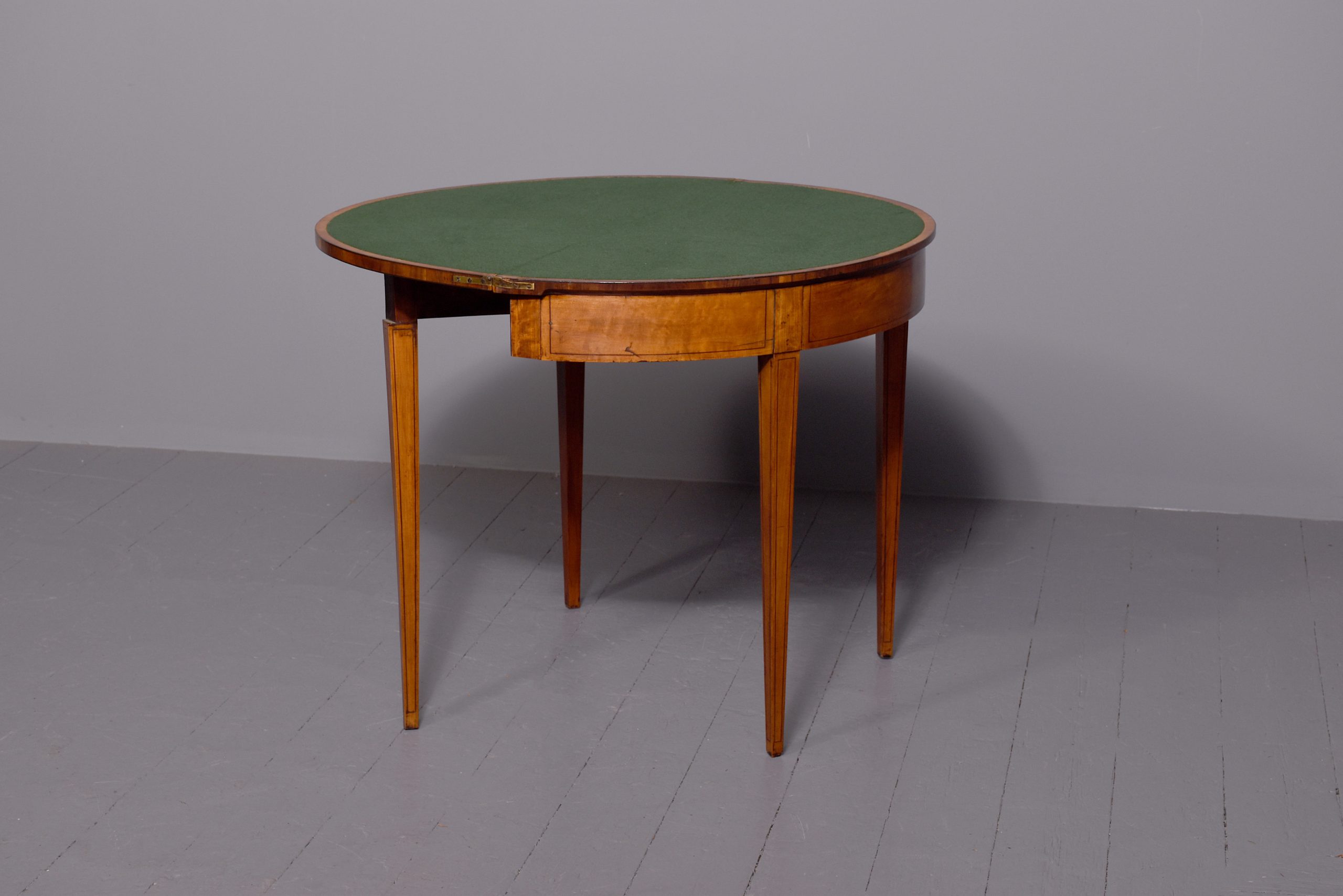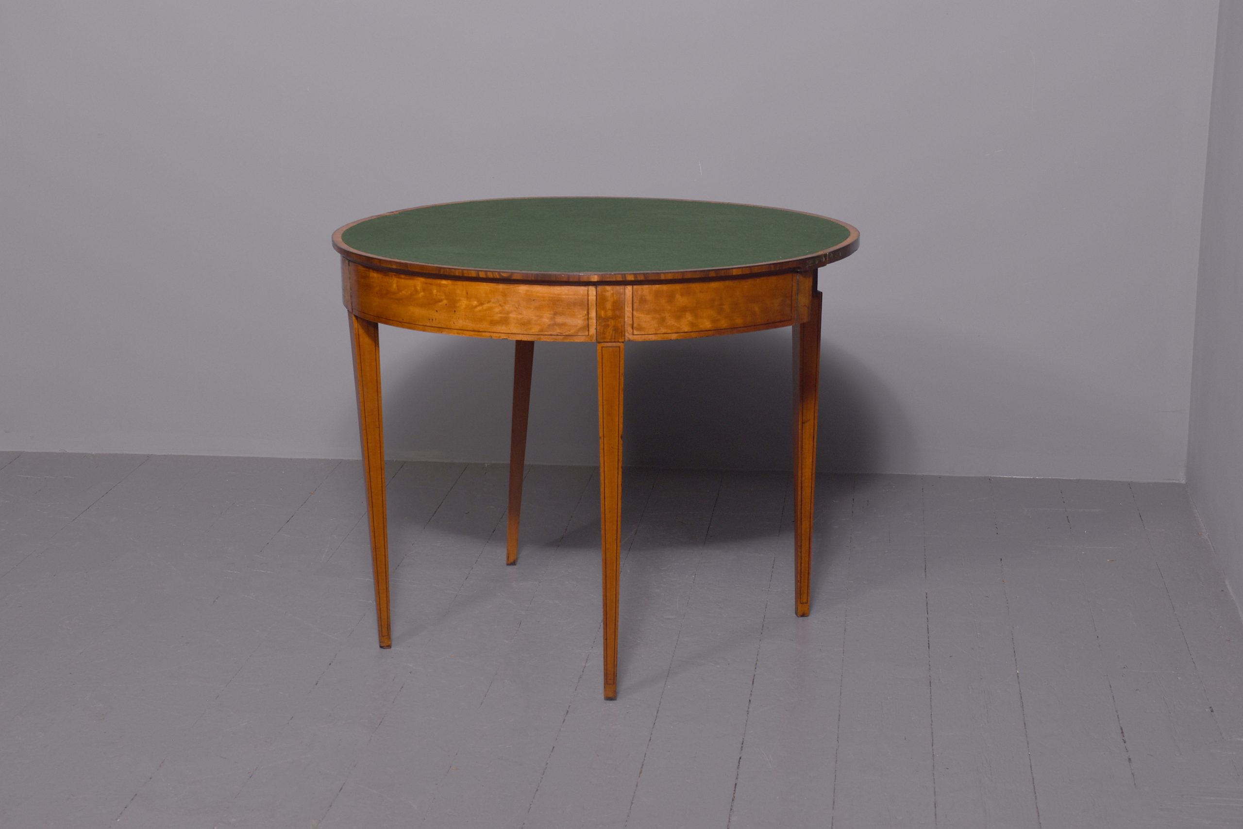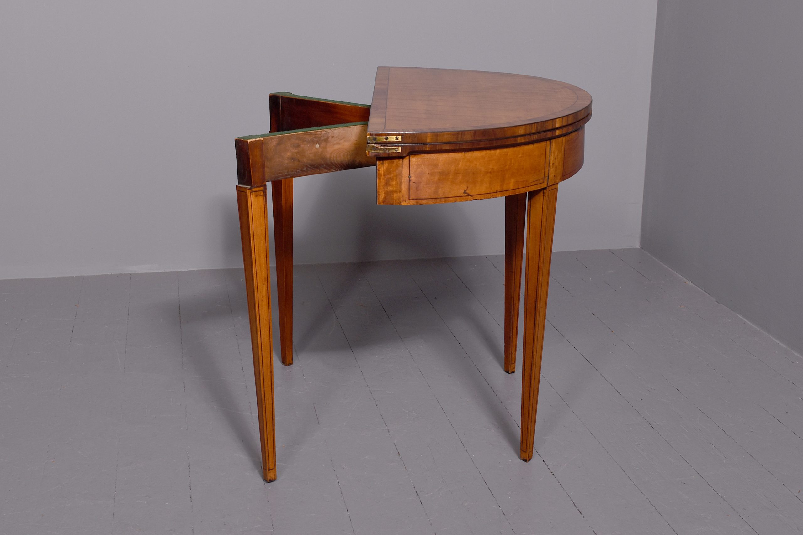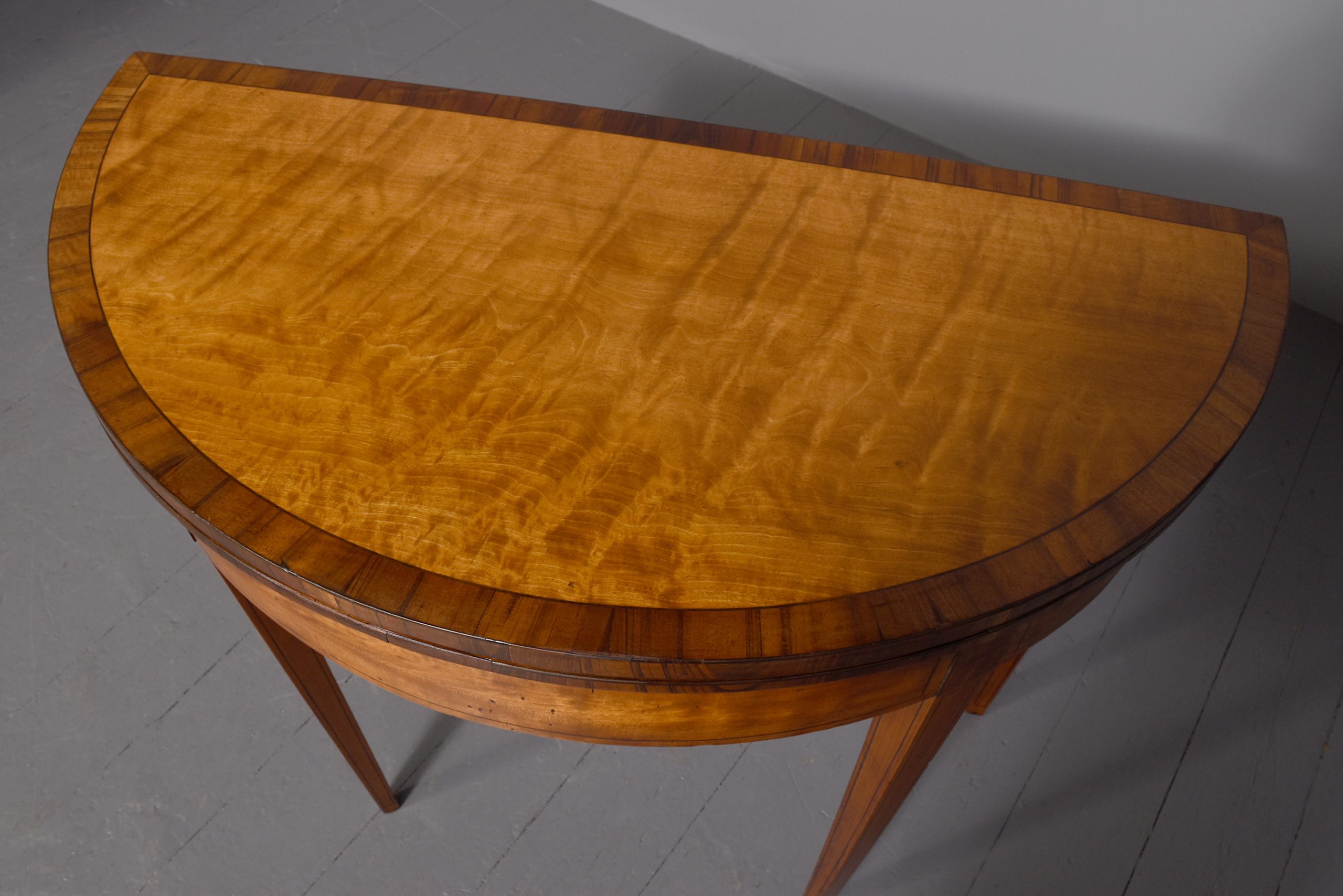 Circa 1790. A late George III satinwood and walnut inlaid demi lune fold over card table, the top in fine satinwood with ebony string inlay and broad walnut banding, is hinged and opens to reveal a baize lined interior with broad cross banding, the back legs are hinged and swing out to support the table when opened, the frieze with ebony inlay framing each of the panels, resting on four simple square tapering legs with ebony inlay on the front.