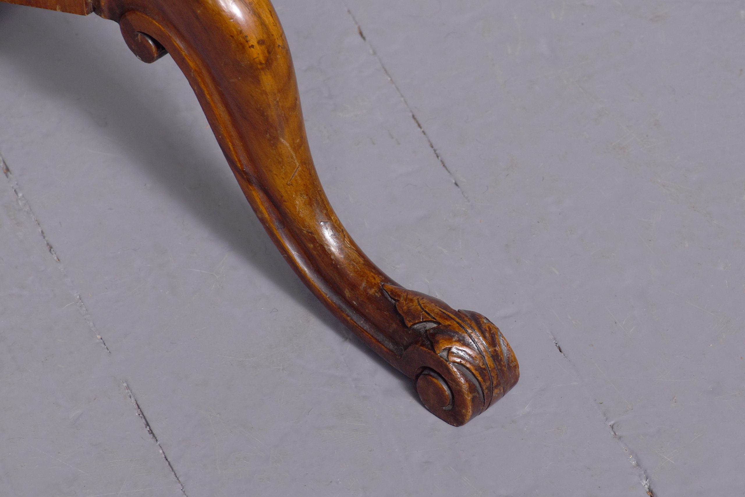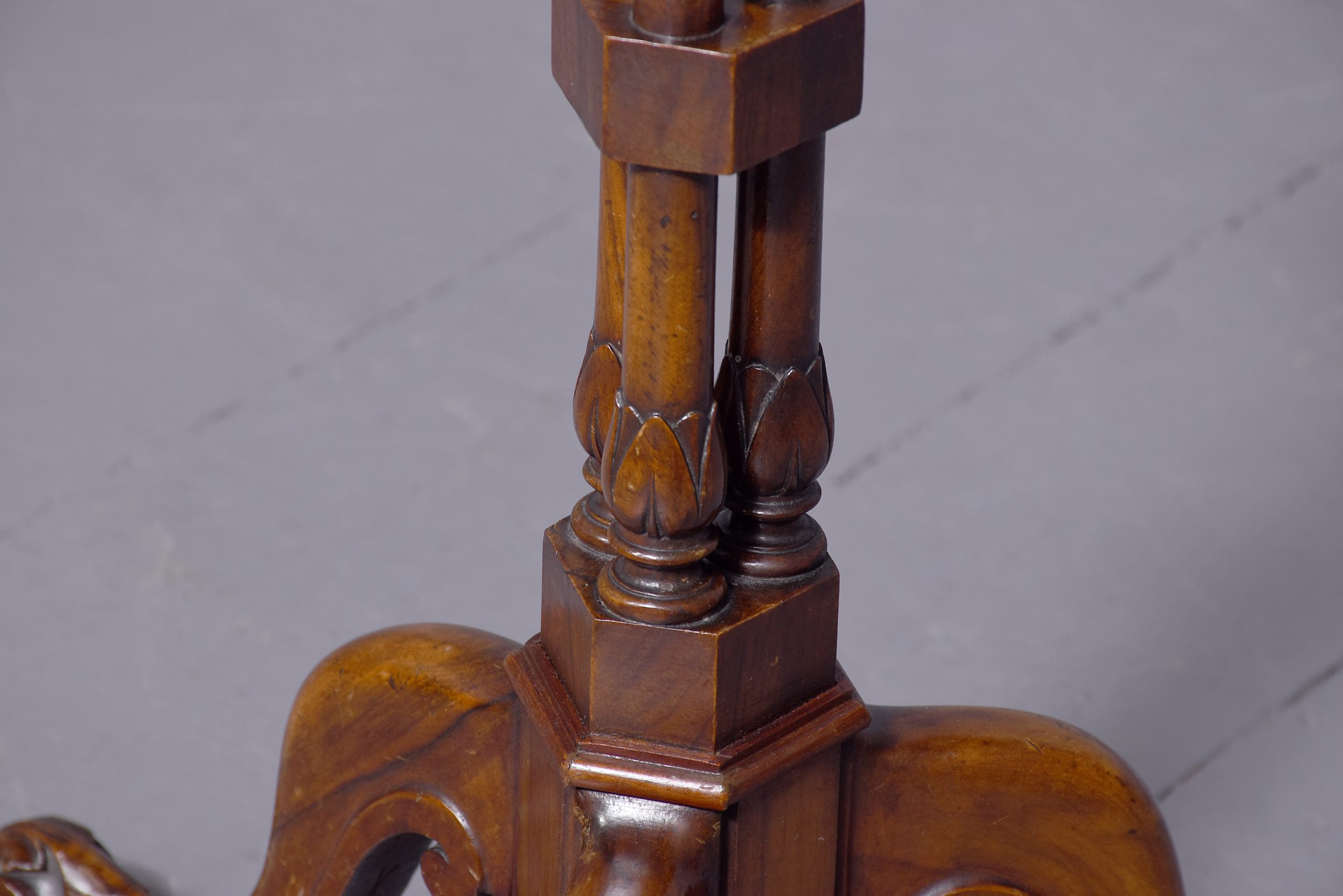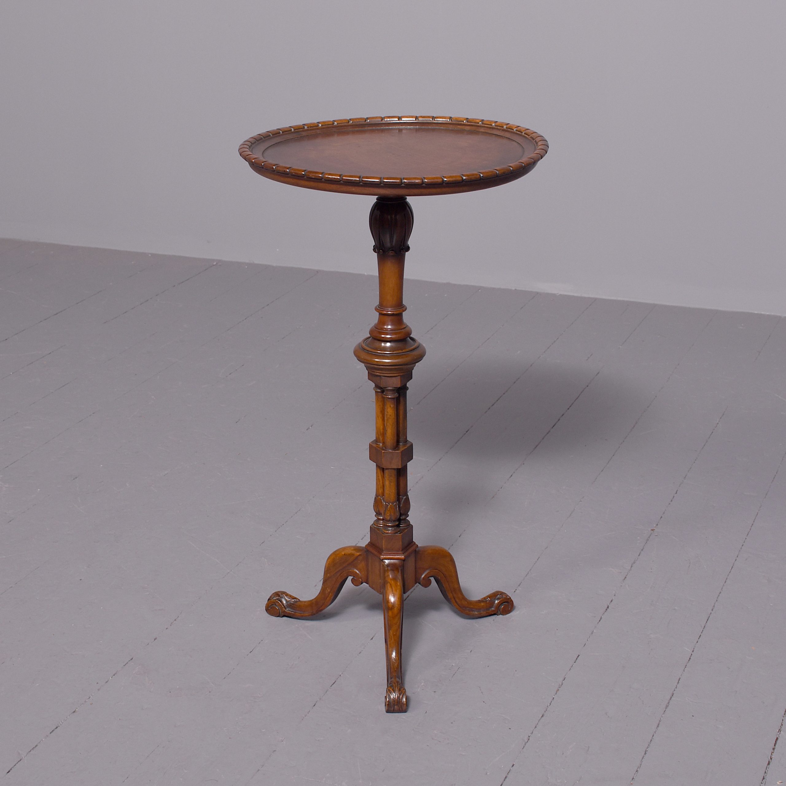 Circa 1870, a George III style occasion table, the deep dished circular top with a lovely patterned fore-edge, resting on an elegant and stylish stem, including foliate carving, turned and tapering columns, with a cluster of three columns braced with foliate carving, issuing three elegant cabriole legs with extended S scroll into the underside, foliate carving on the toe, finishing on a well-curved foot.