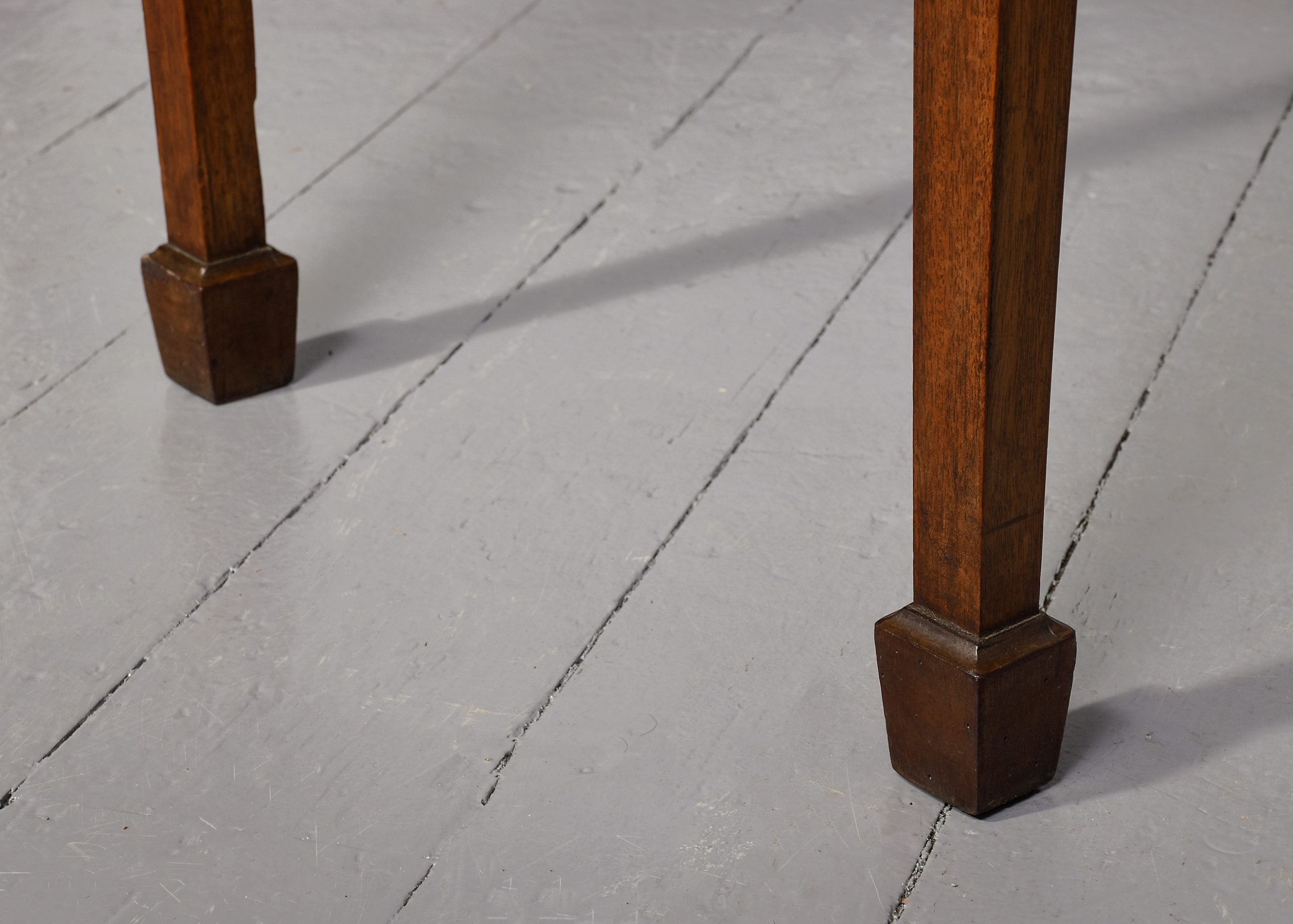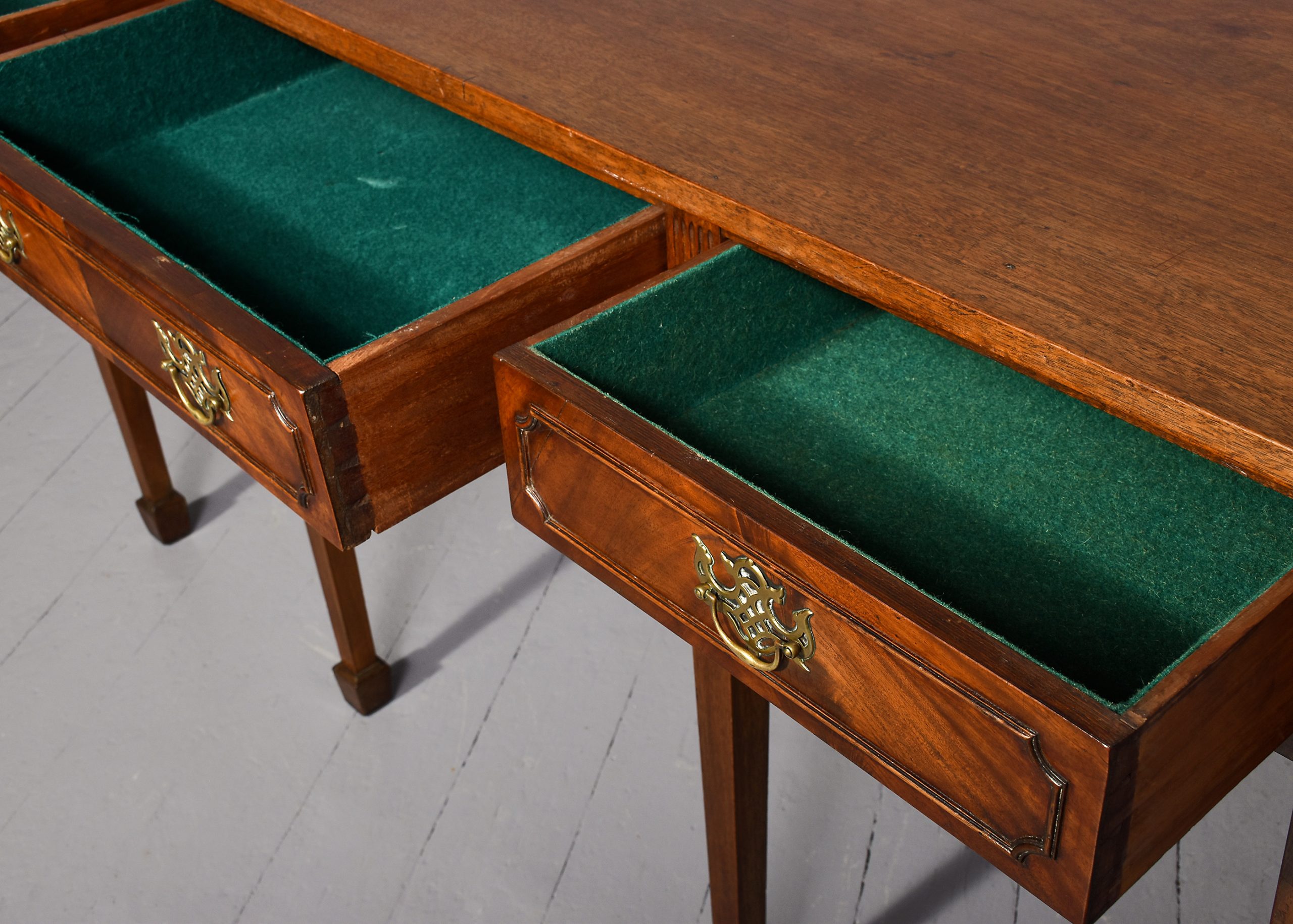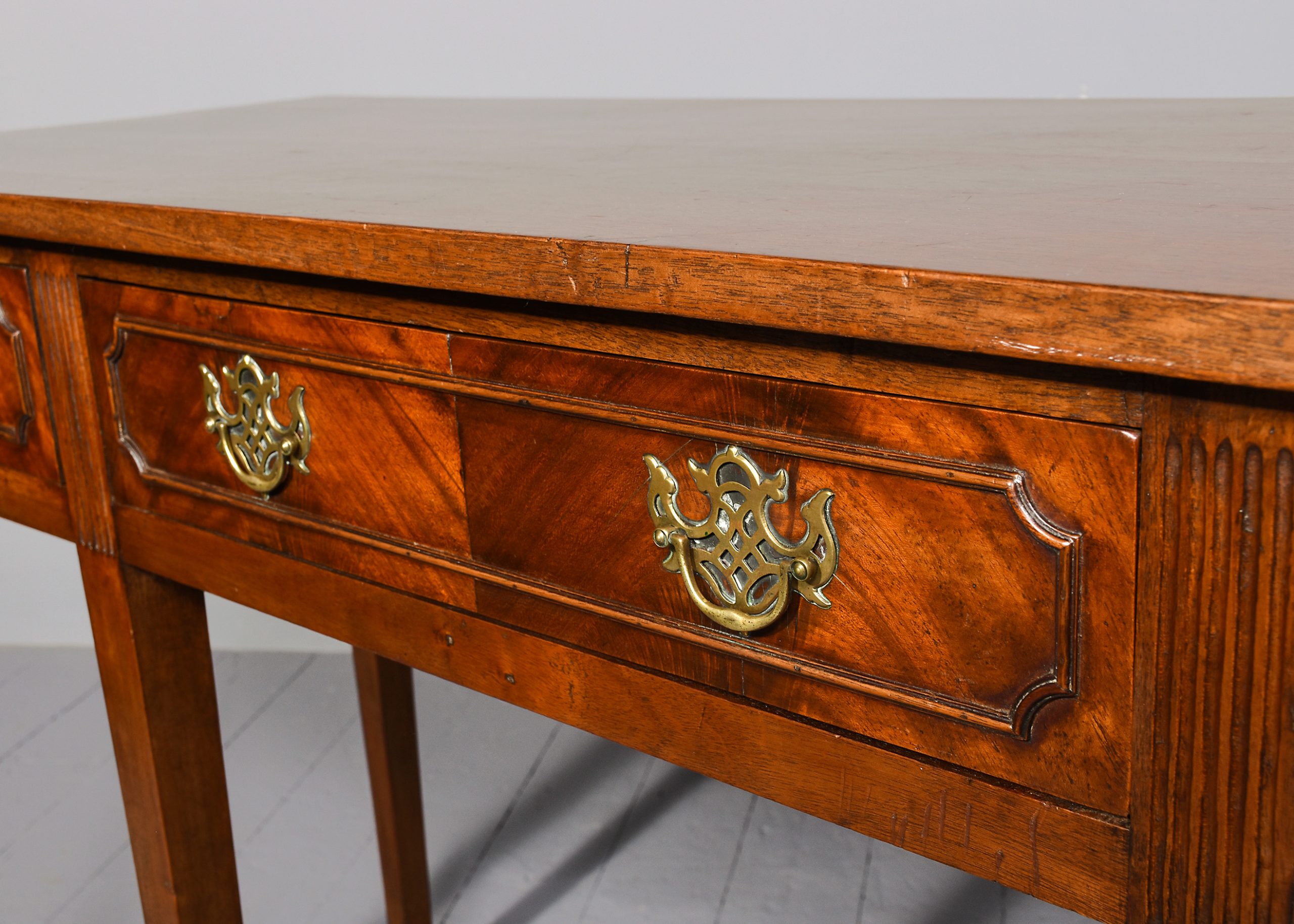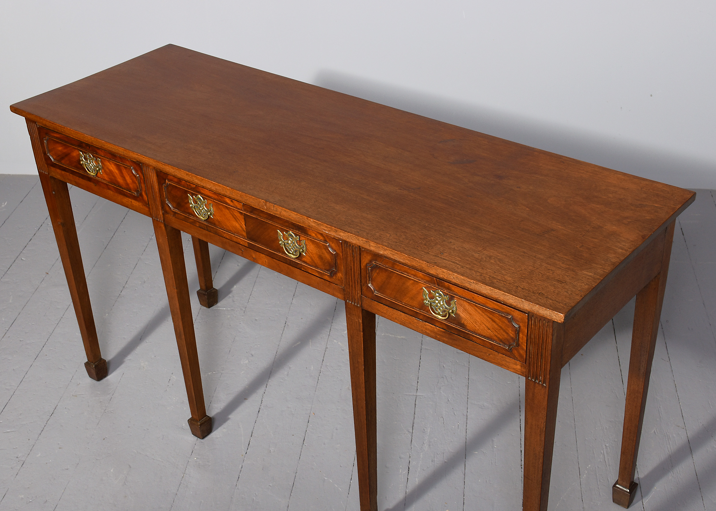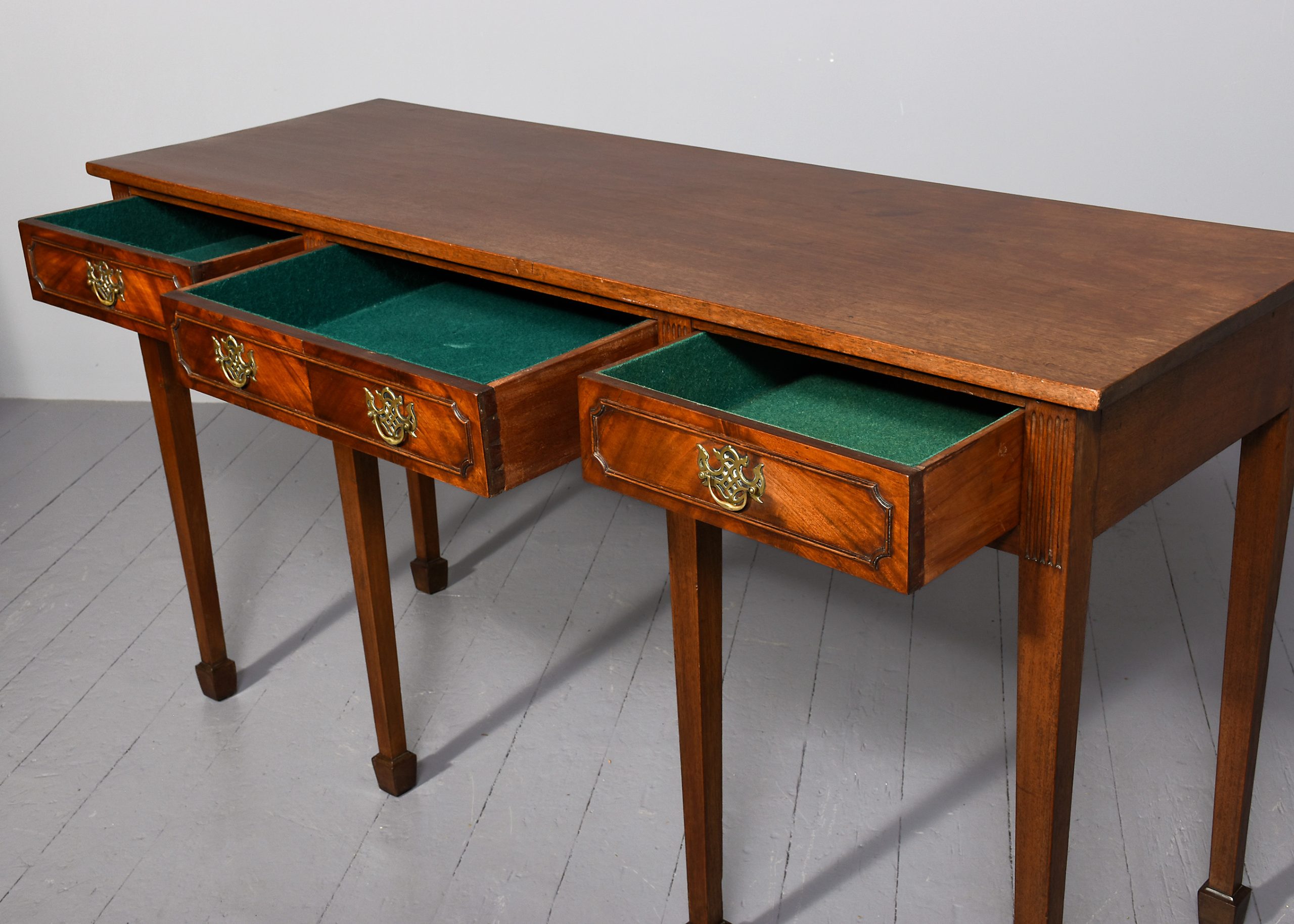 Circa 1900. George III style mahogany hall table or serving table. The rectangular top in a nice, figured mahogany with flat fore edges above three frieze drawers with moulded fronts and engraved cut brass handles and green baize linings. Supported on six tapering square legs with fluted capitals and ending on splayed toes.