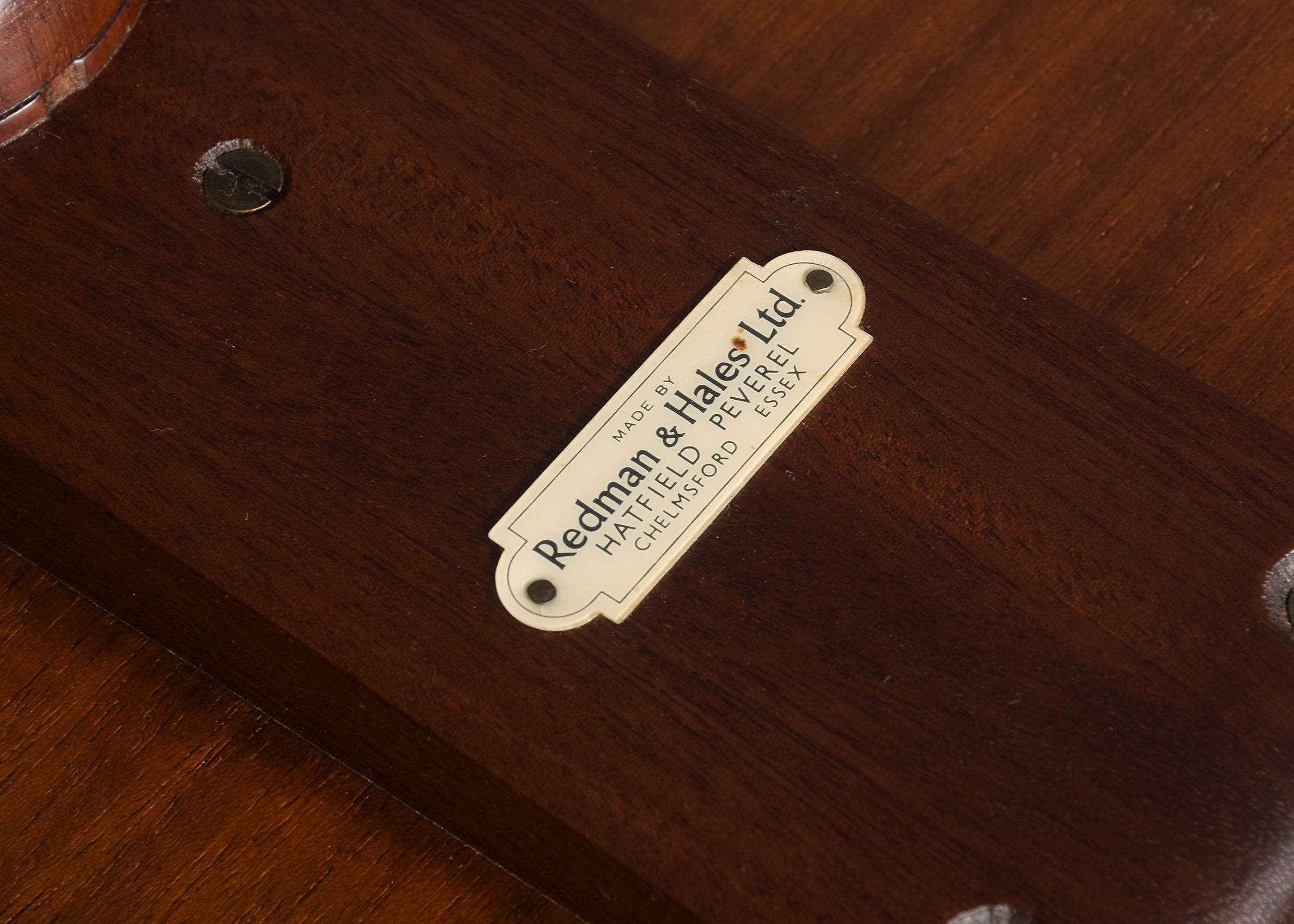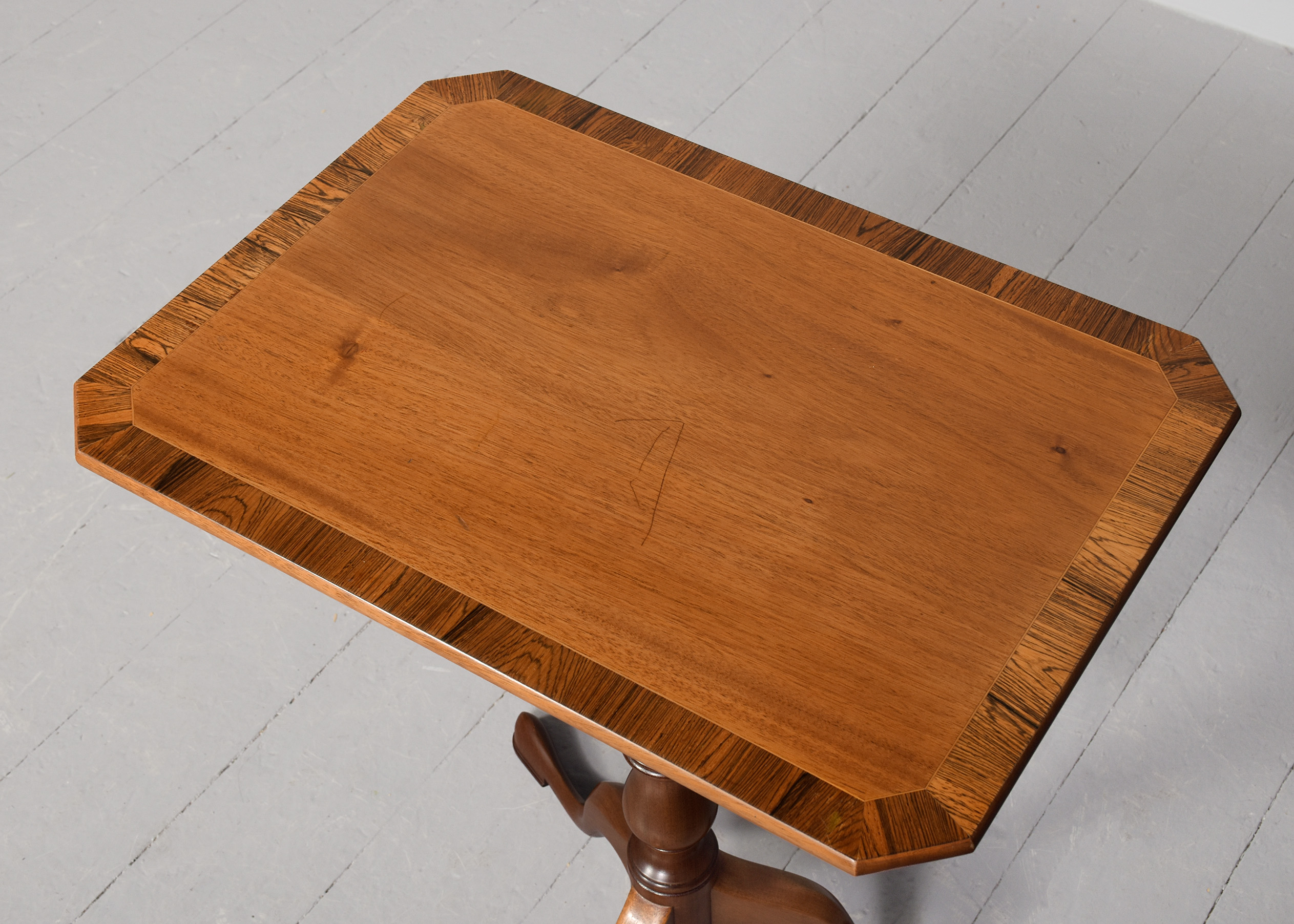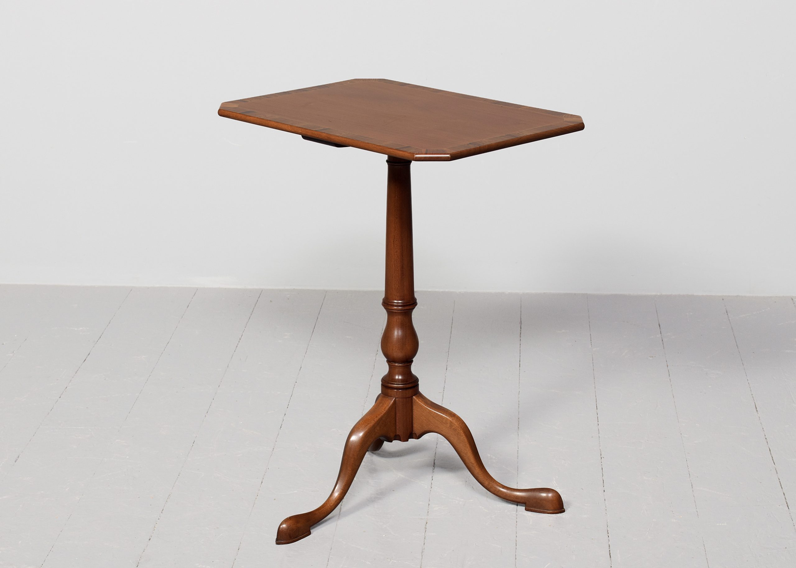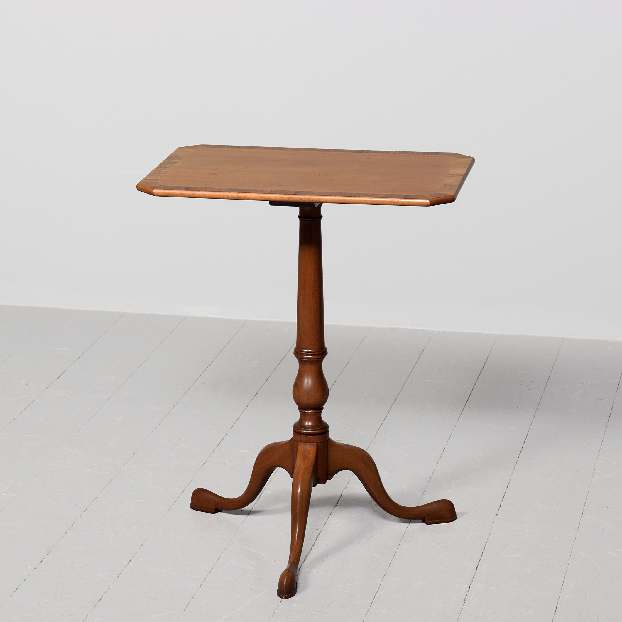Circa 1900. A stylish George III style mahogany and rosewood banded occasional table, the rectangular top with canted corners with string inlay and broad rosewood crossbanding, with simple rounded fore-edge, resting on a classic cannon barrel stem with urn shape towards the base, issuing three hipped cabriole legs and finishing on an elegant extended foot, to the underside of the top there’s a makers label ‘Redman and Hales Ltd, Hatfield, Chelmsford, Essex’, the neat size table has great colour and style.