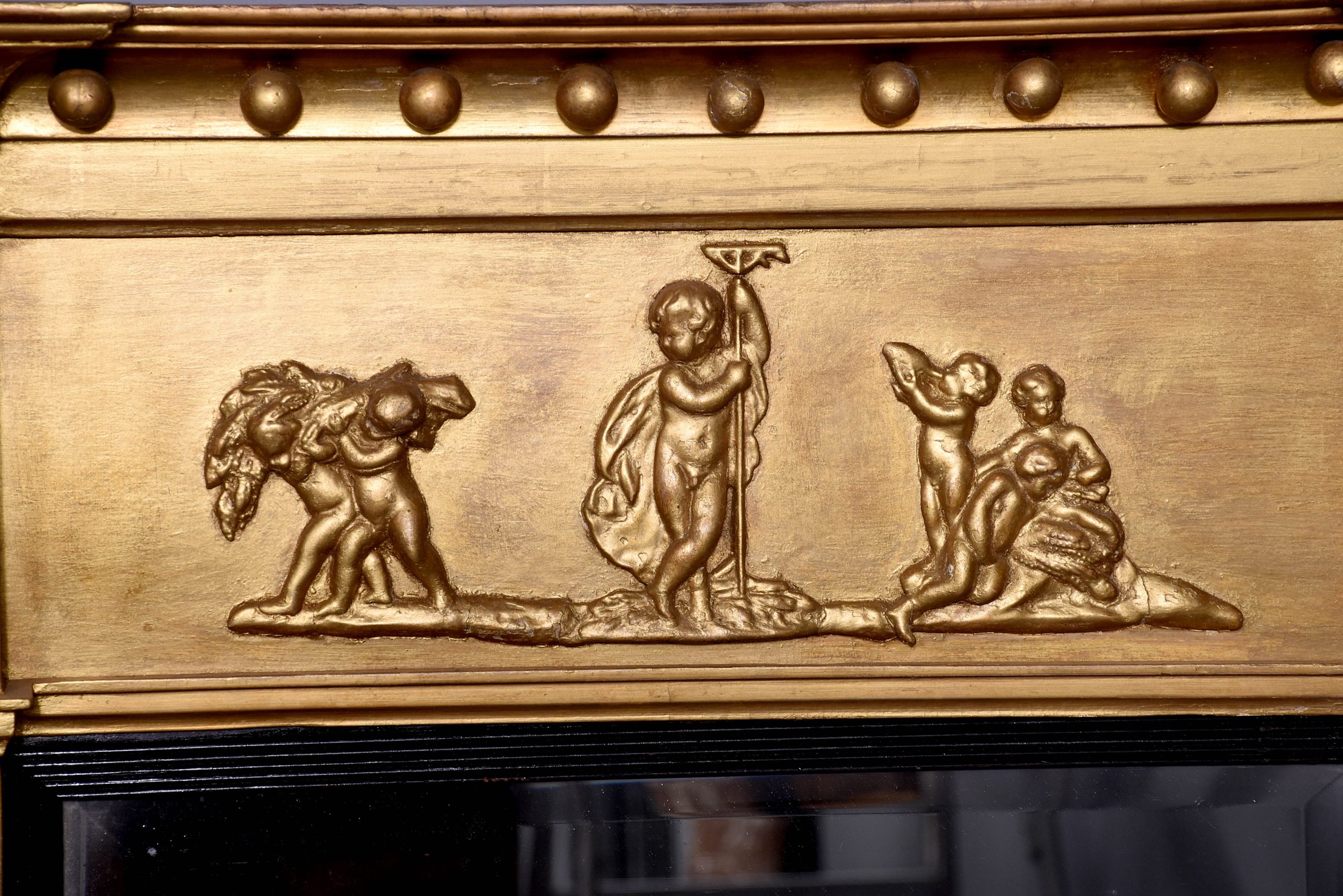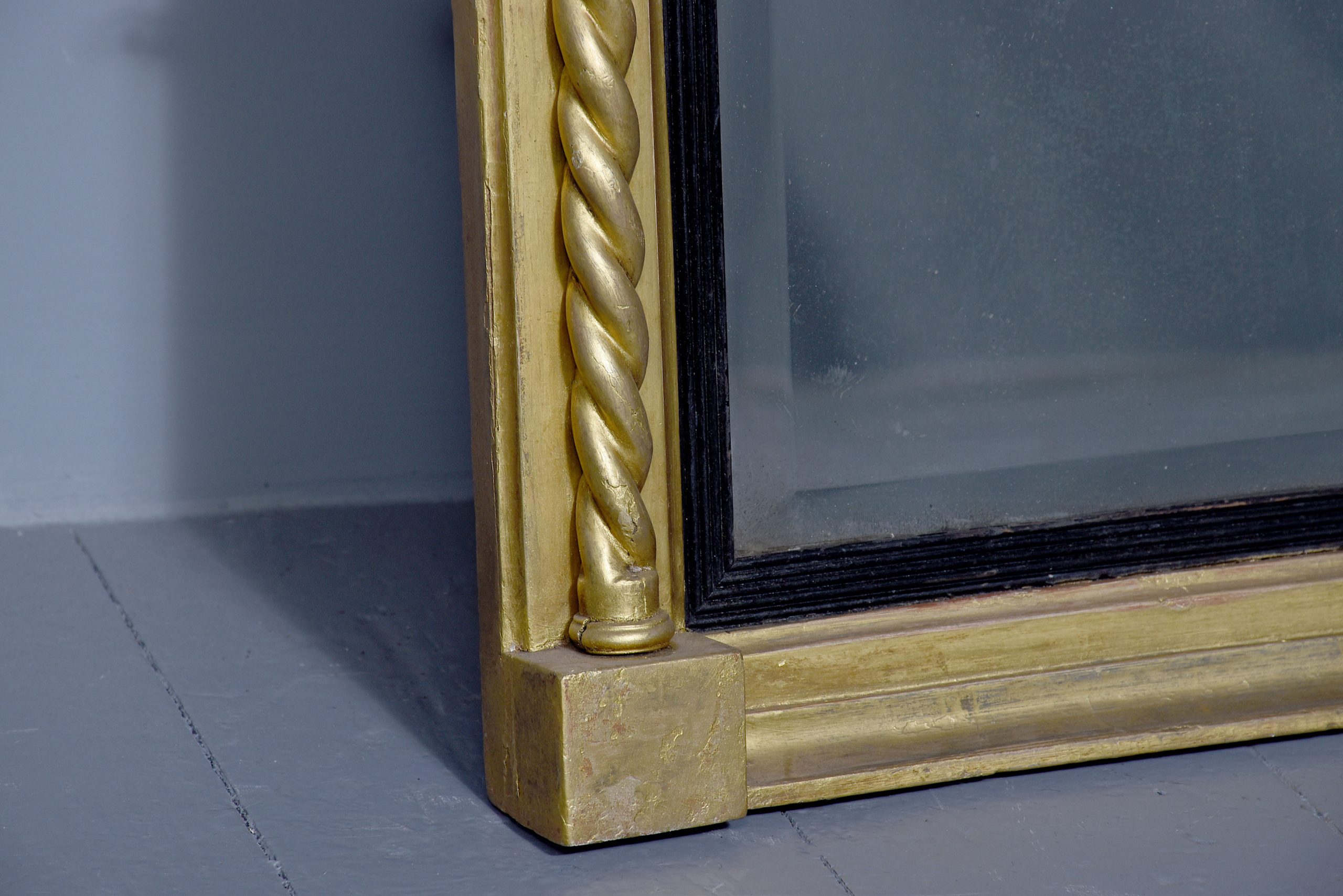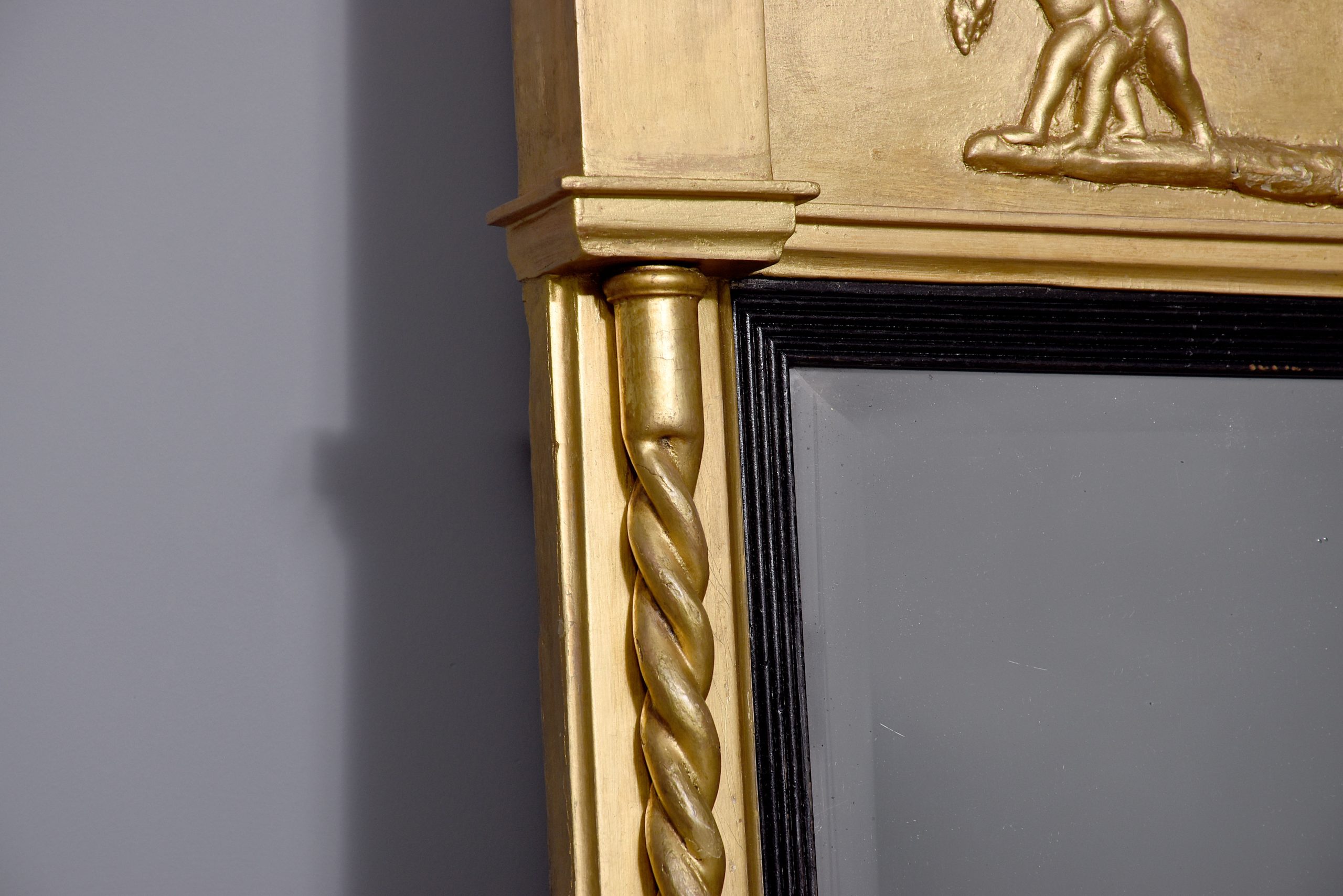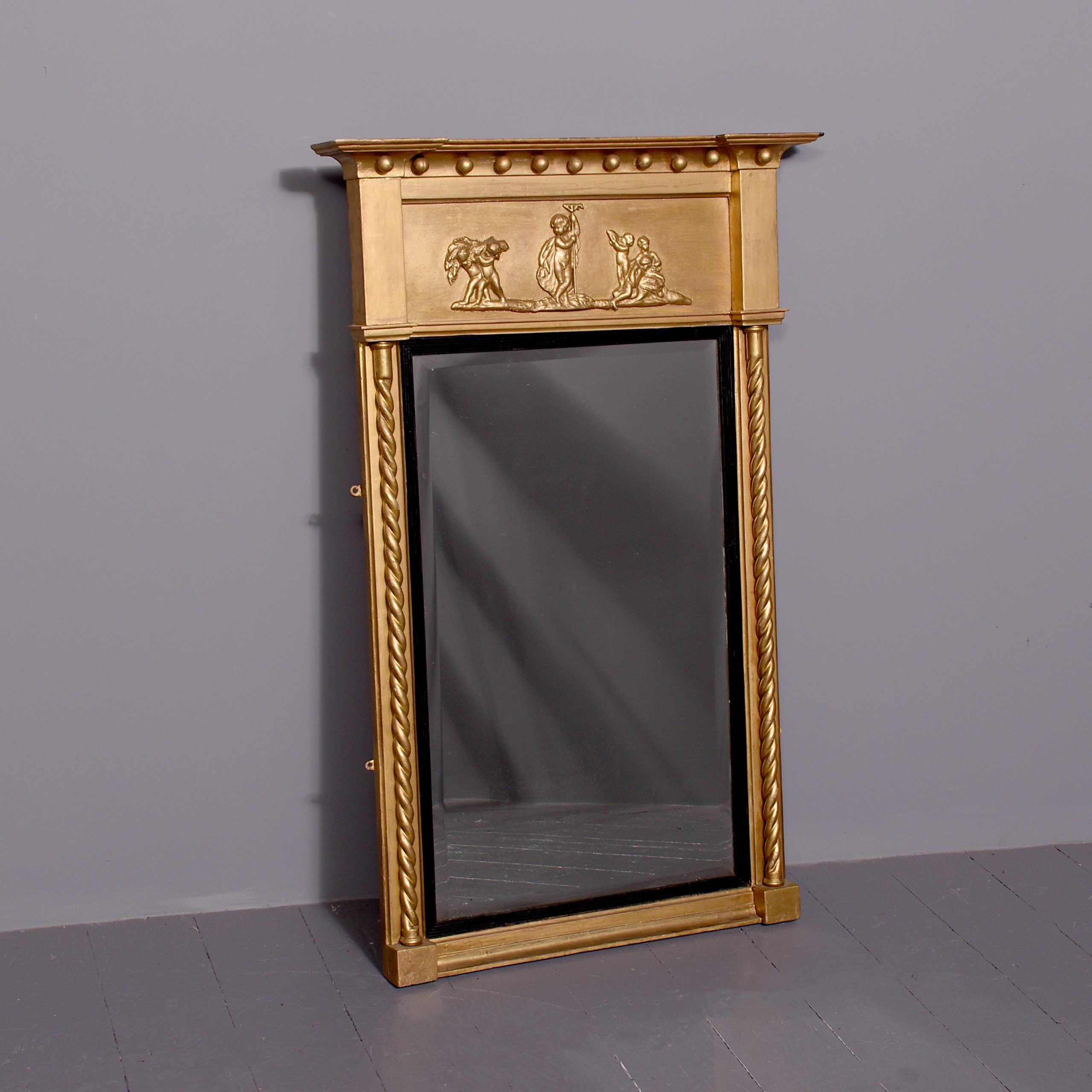 A stylish George IV gilded and ebonized pier mirror. The moulded top with breakfront section on each end, with ribbing on the fore-edge with gilded balls on the underside, and a frieze depicting cherubs at harvest. The original rectangular bevel edged mirror, contained in a stylish ebonized ribbed slip with a gilded moulding to the outside and a pair of barley sugar columns running from the top to the bottom, resting on simple blocks with further mouldings.