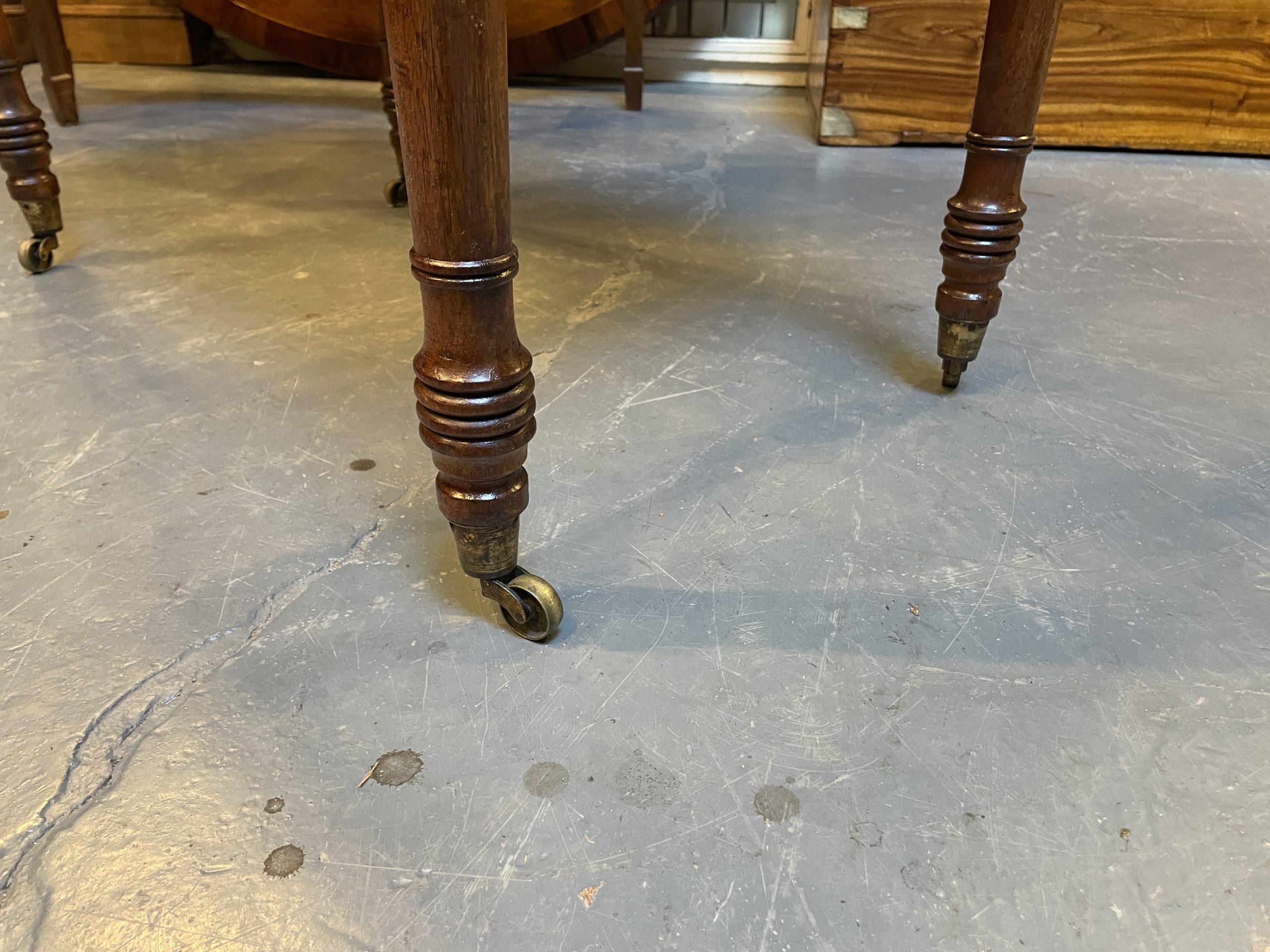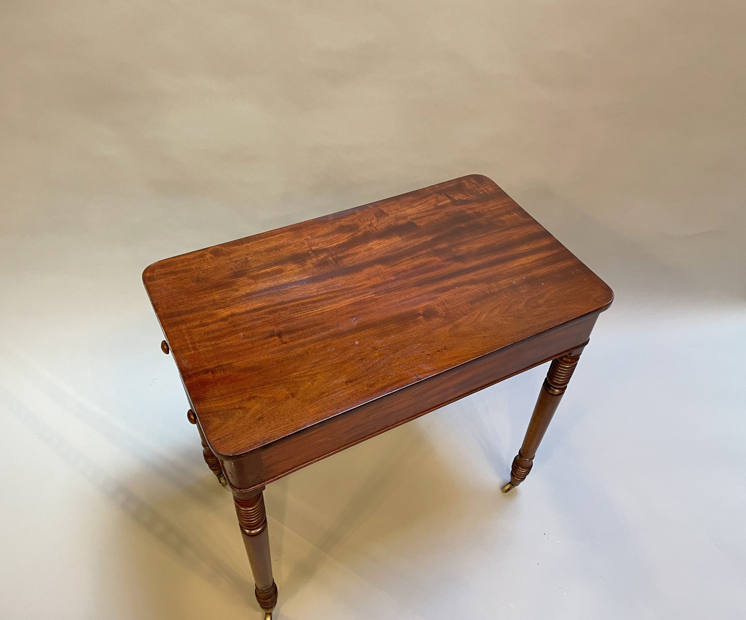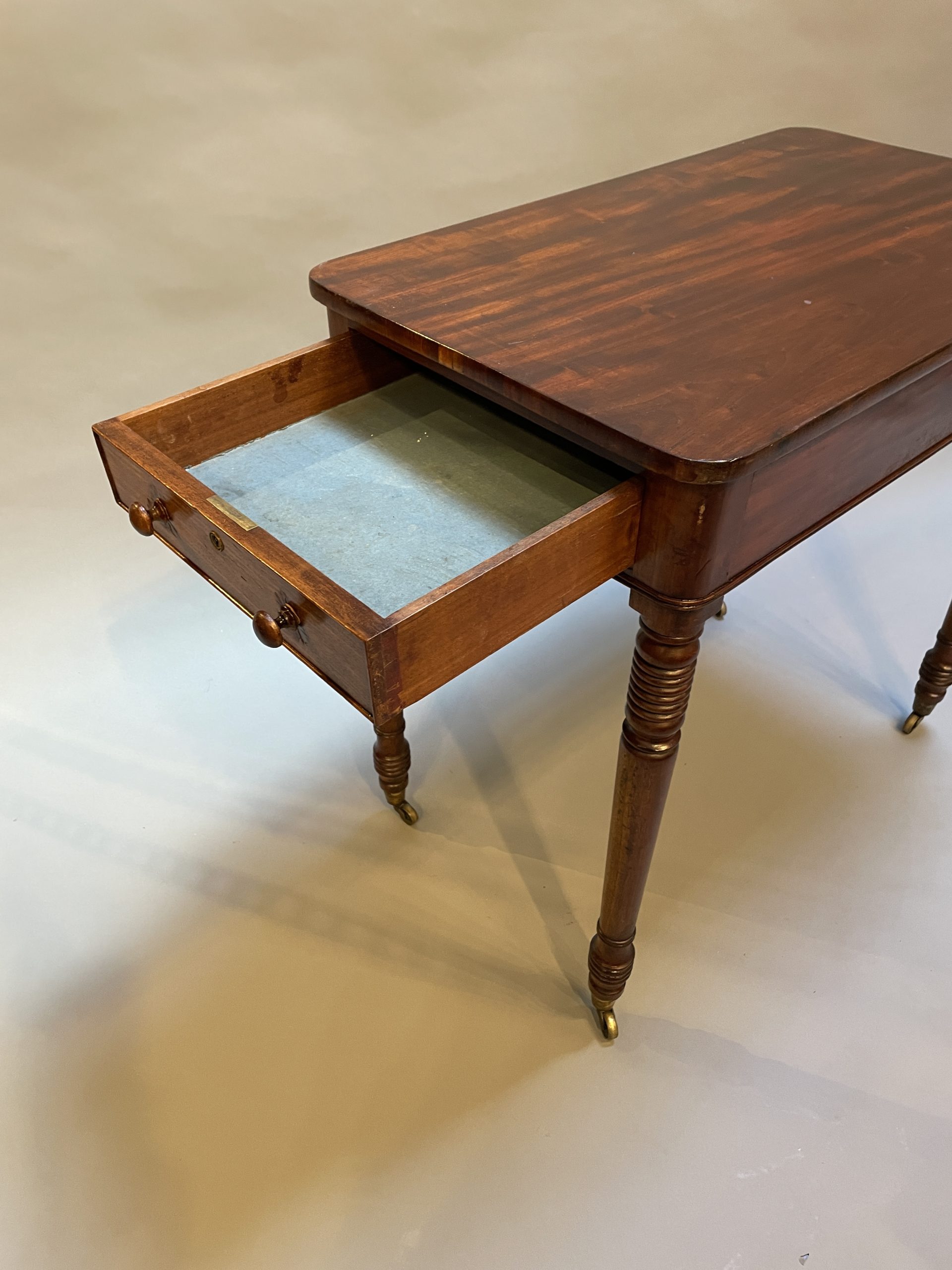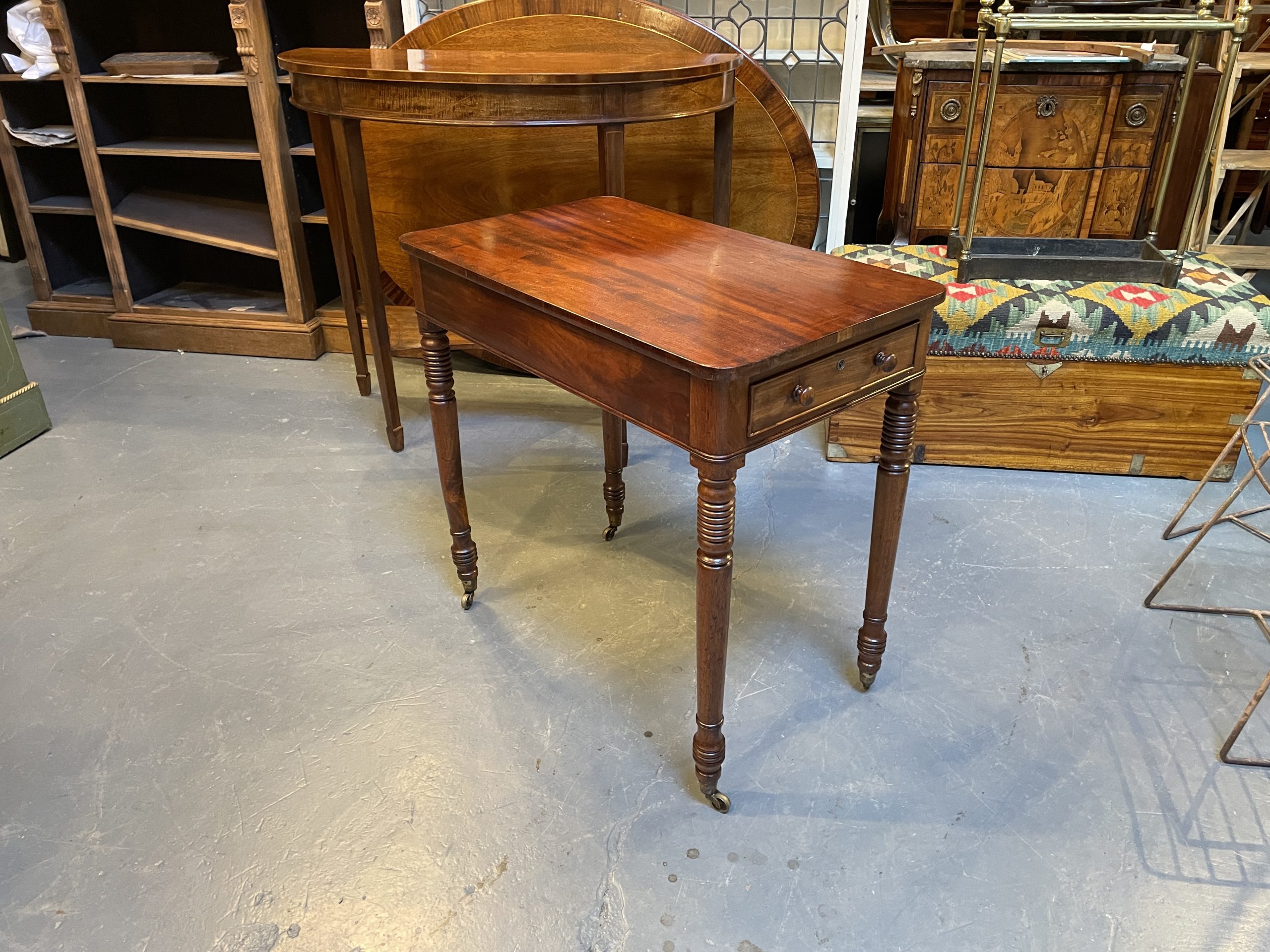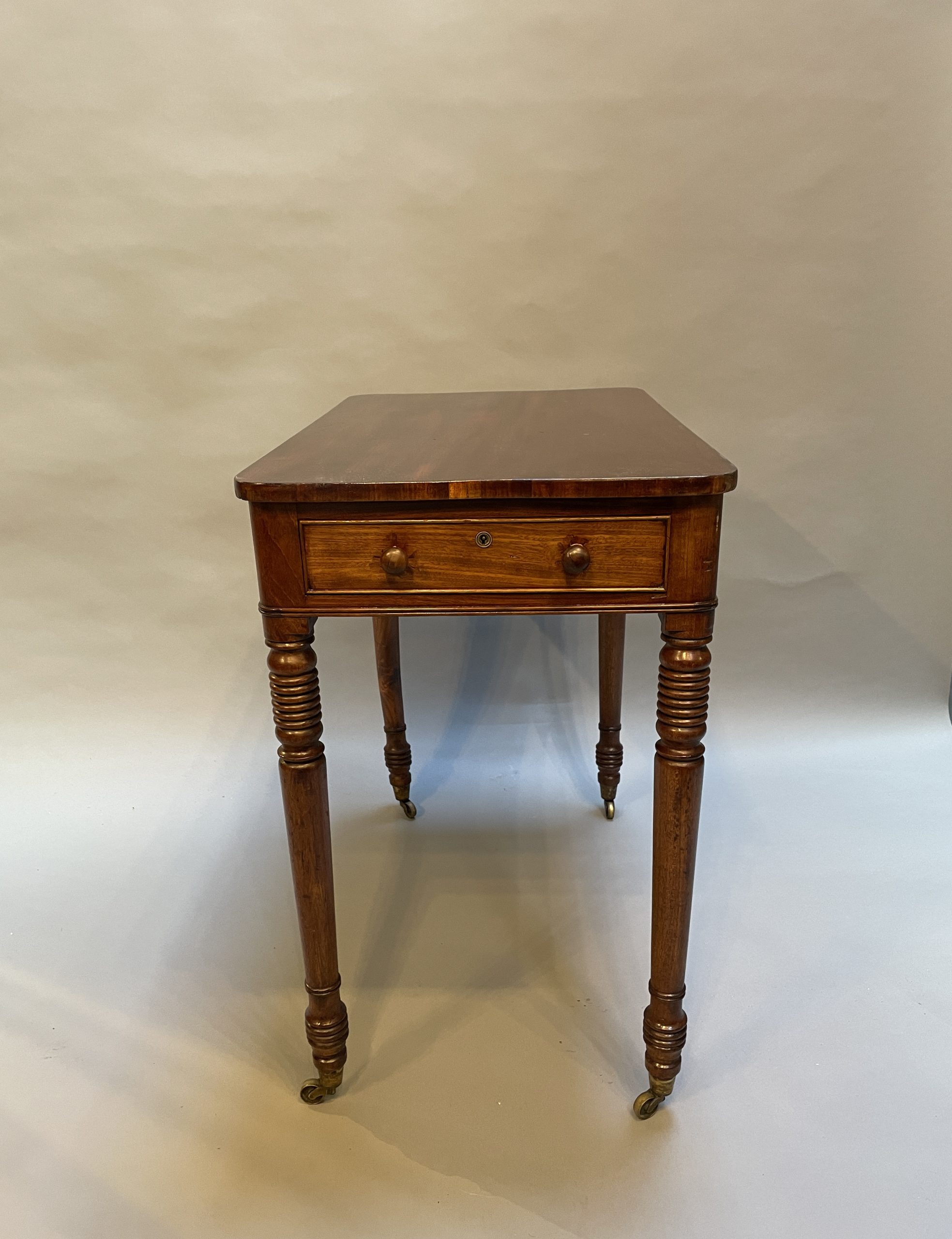 Well figured mahogany, the rectangular top with single end drawer raised on ring turned supports to castors.