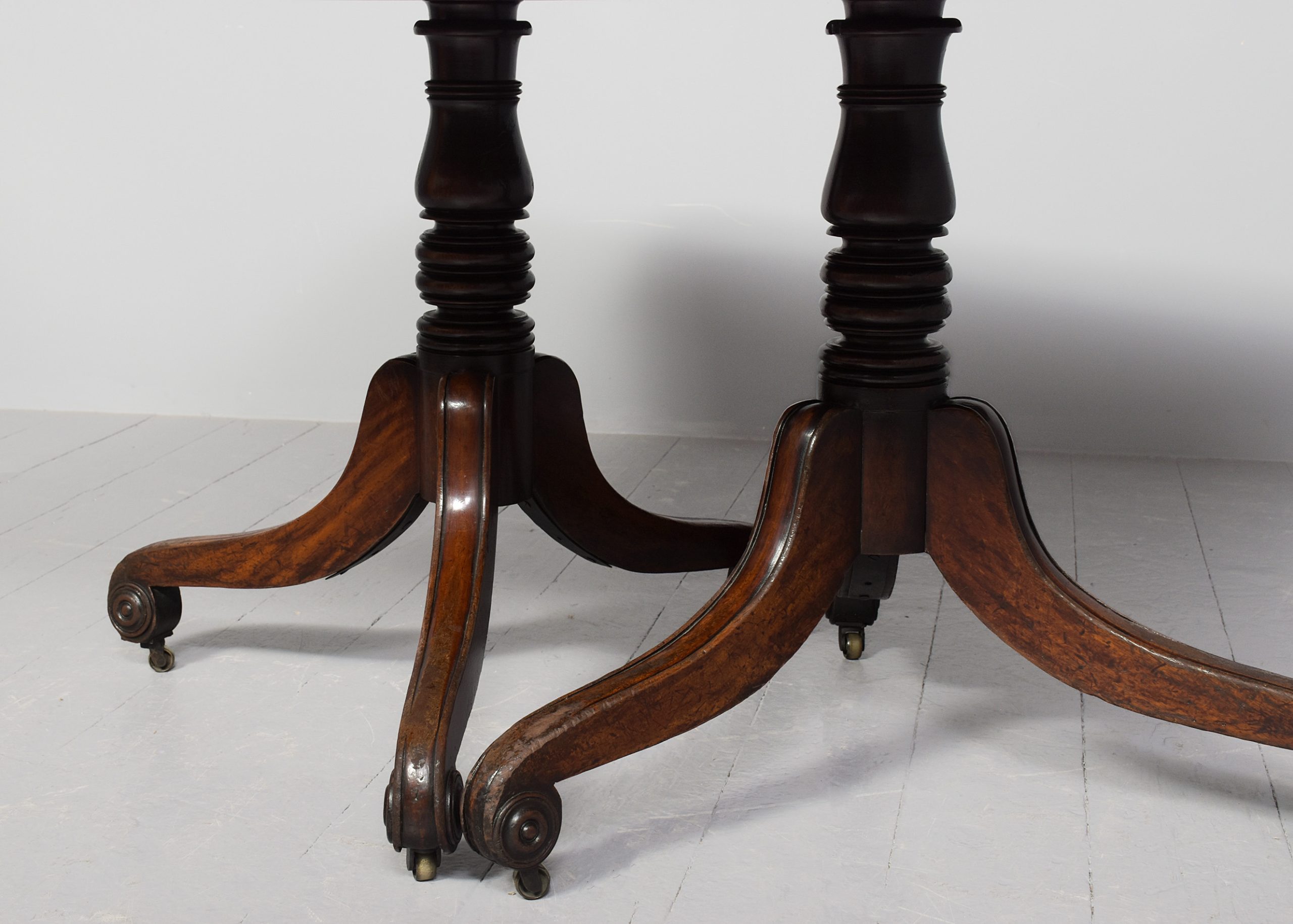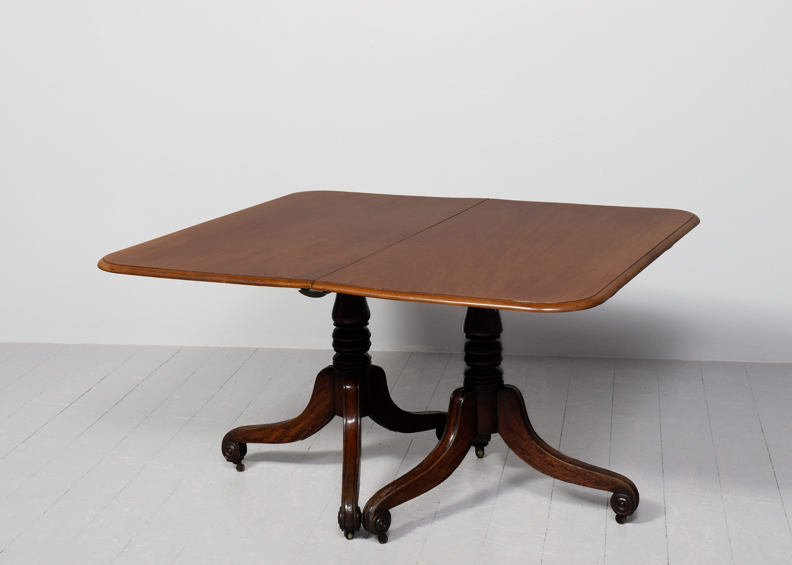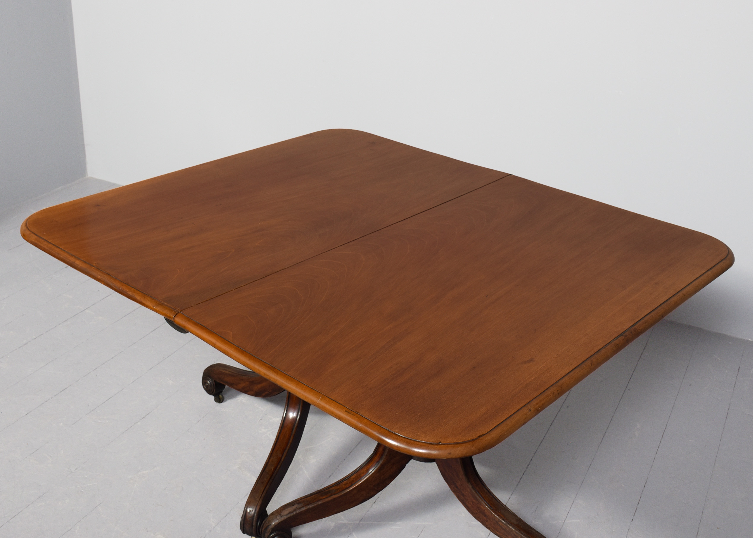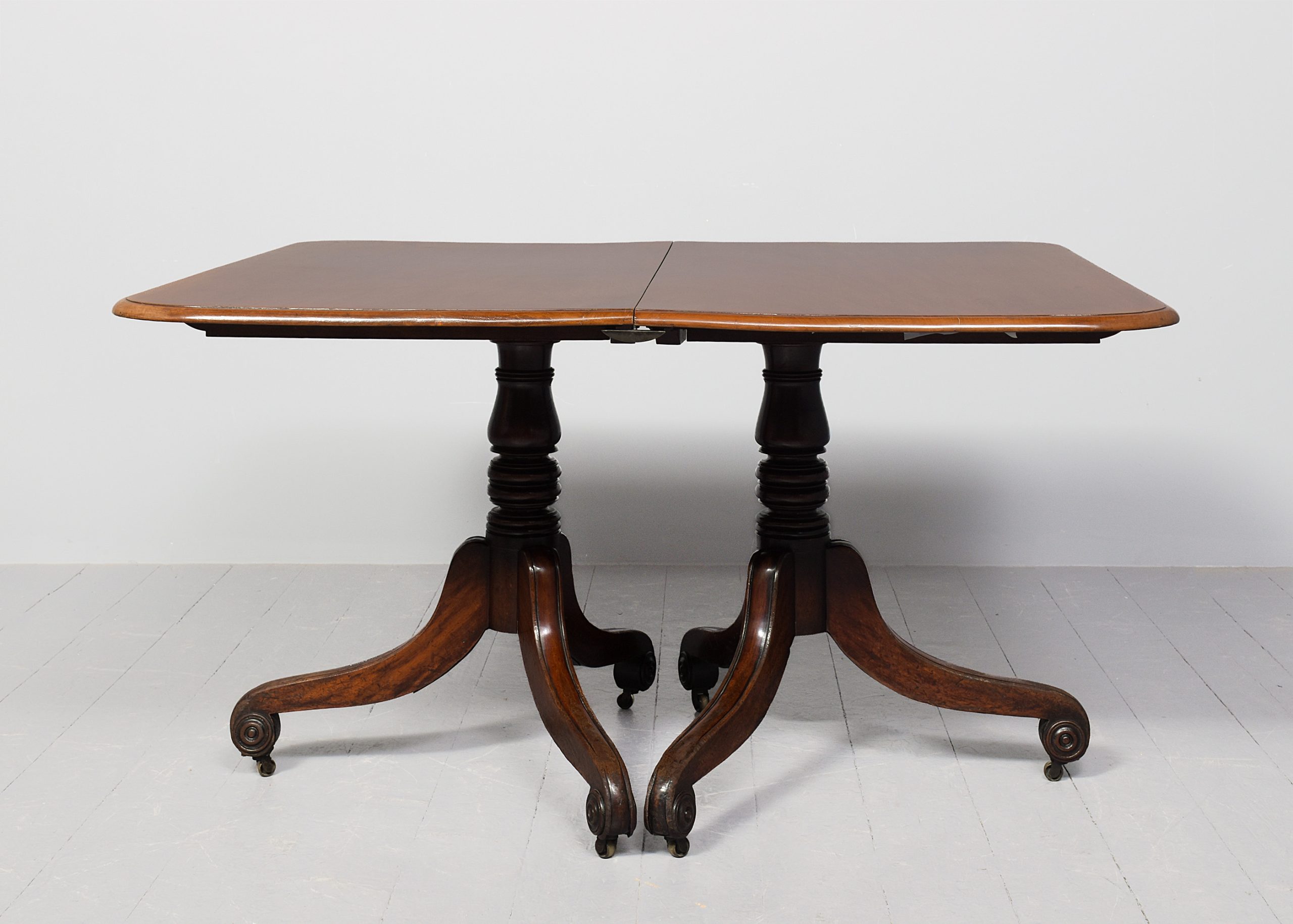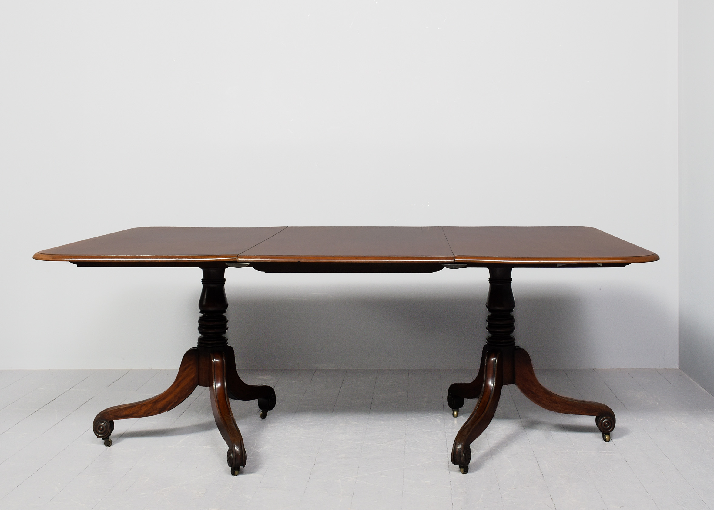 Circa 1825. A quality mahogany twin pillar dining table with extra originalleaf, the top in figured mahogany with a simple moulded fore-edge and rounded corners, the additional leaf is held in place by brass keepers and pull-out slides, resting on stylish, turned, tapering stems issuing three downward-facing saber legs with reeding on the fore-edges, finishing on a curled foot with rondels on each side, with brass castors, the table is clean, sturdy and functional.