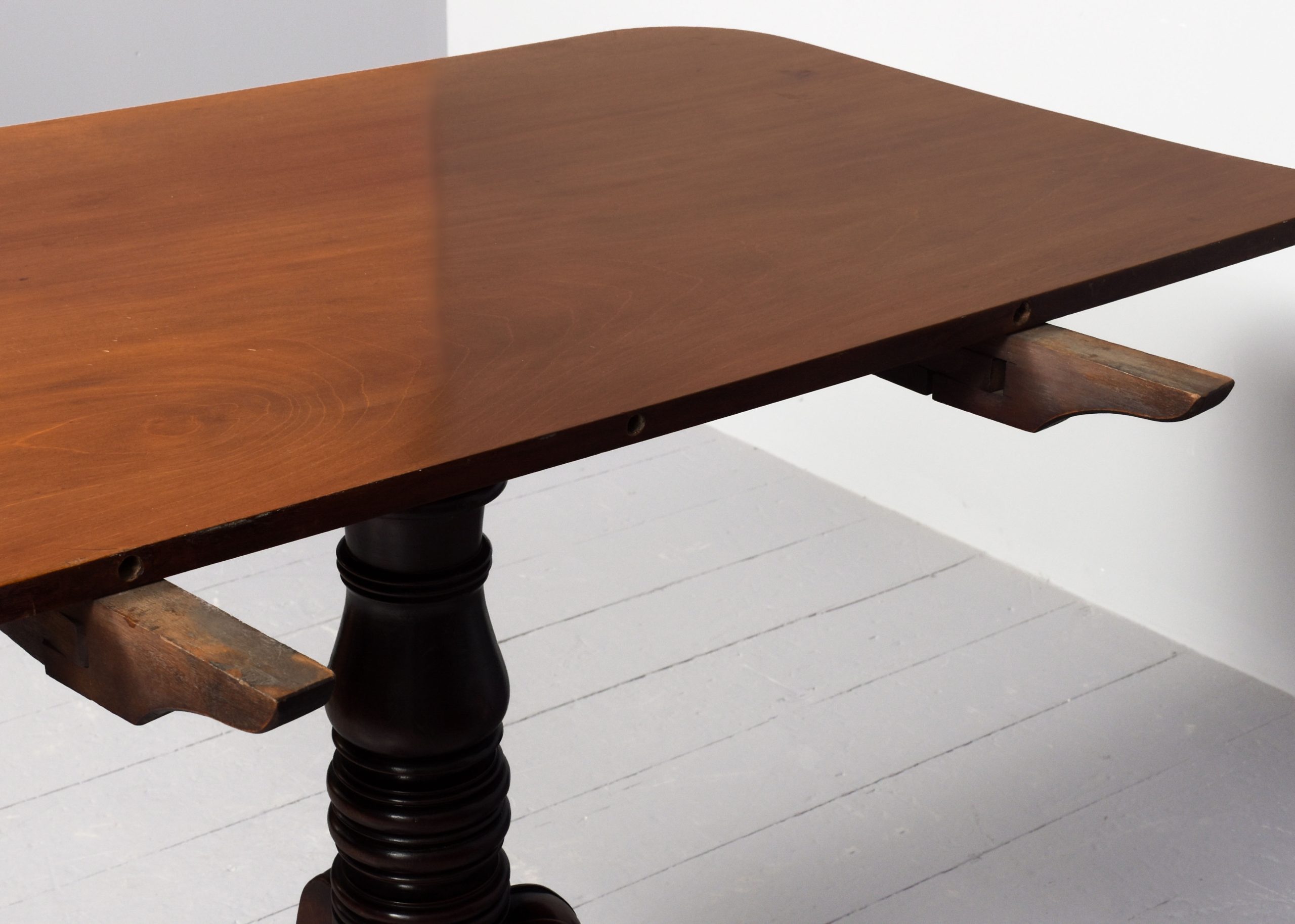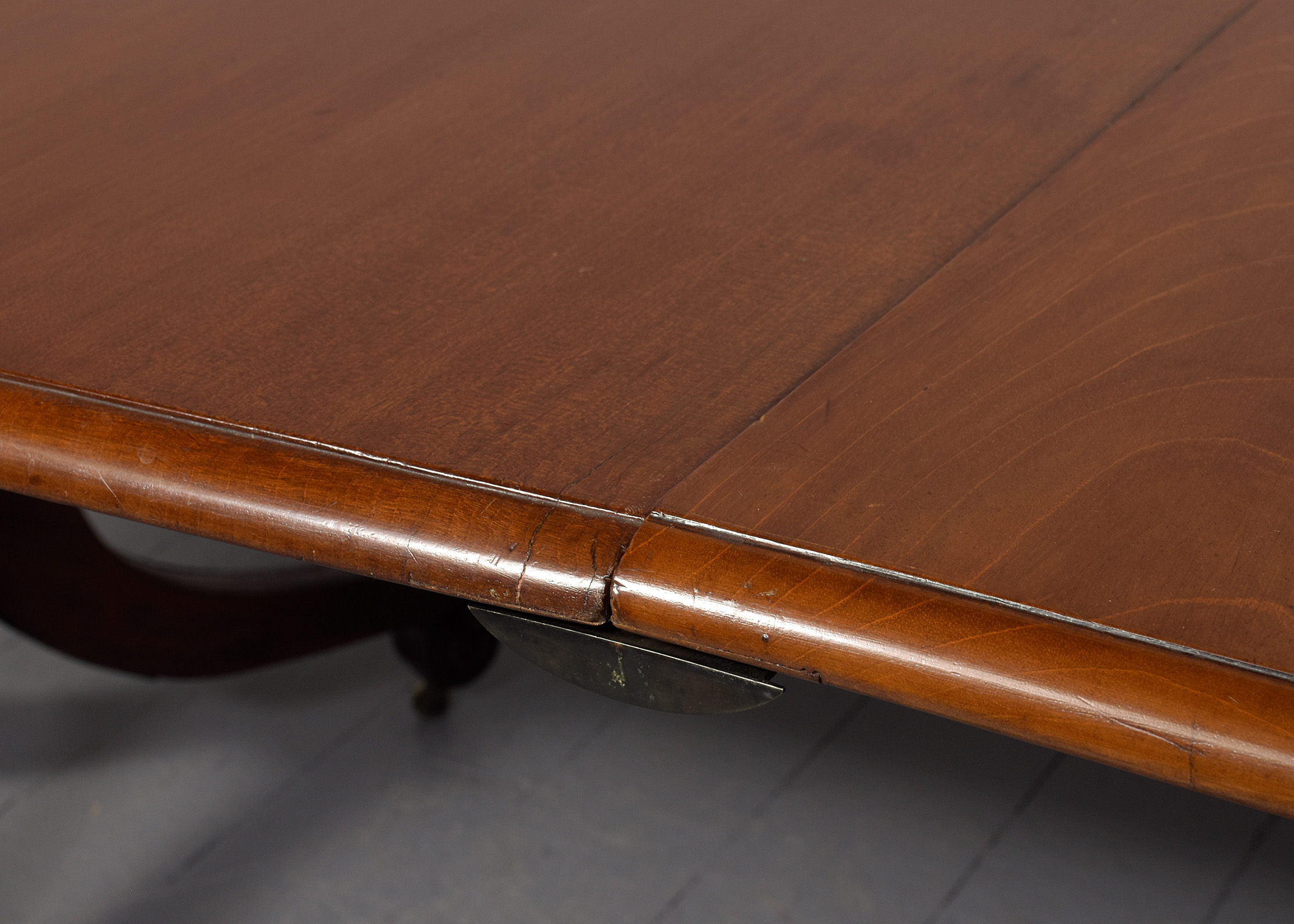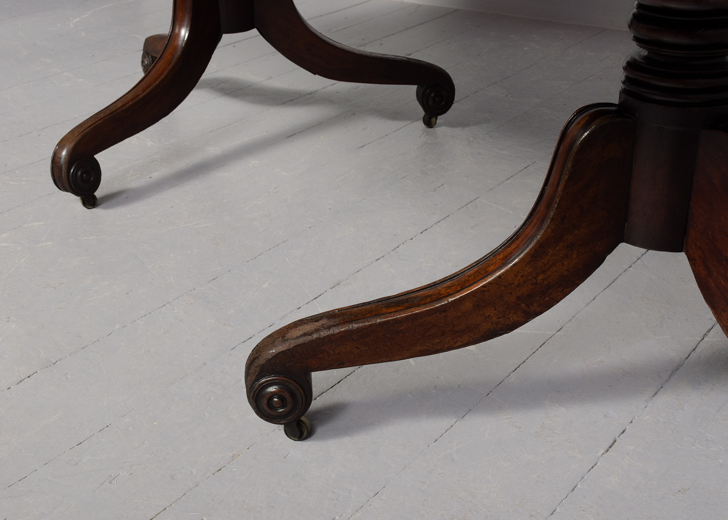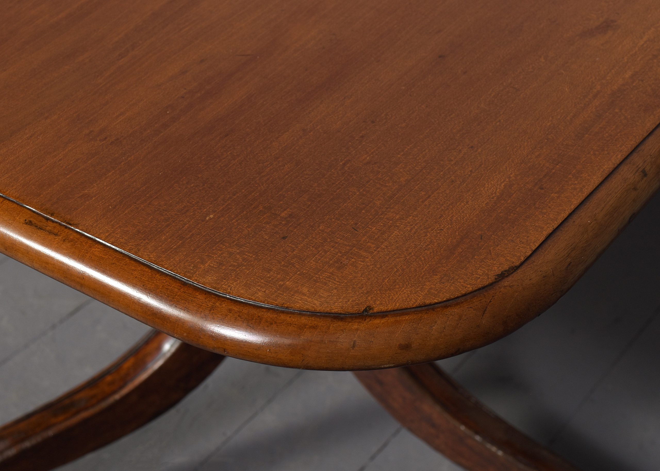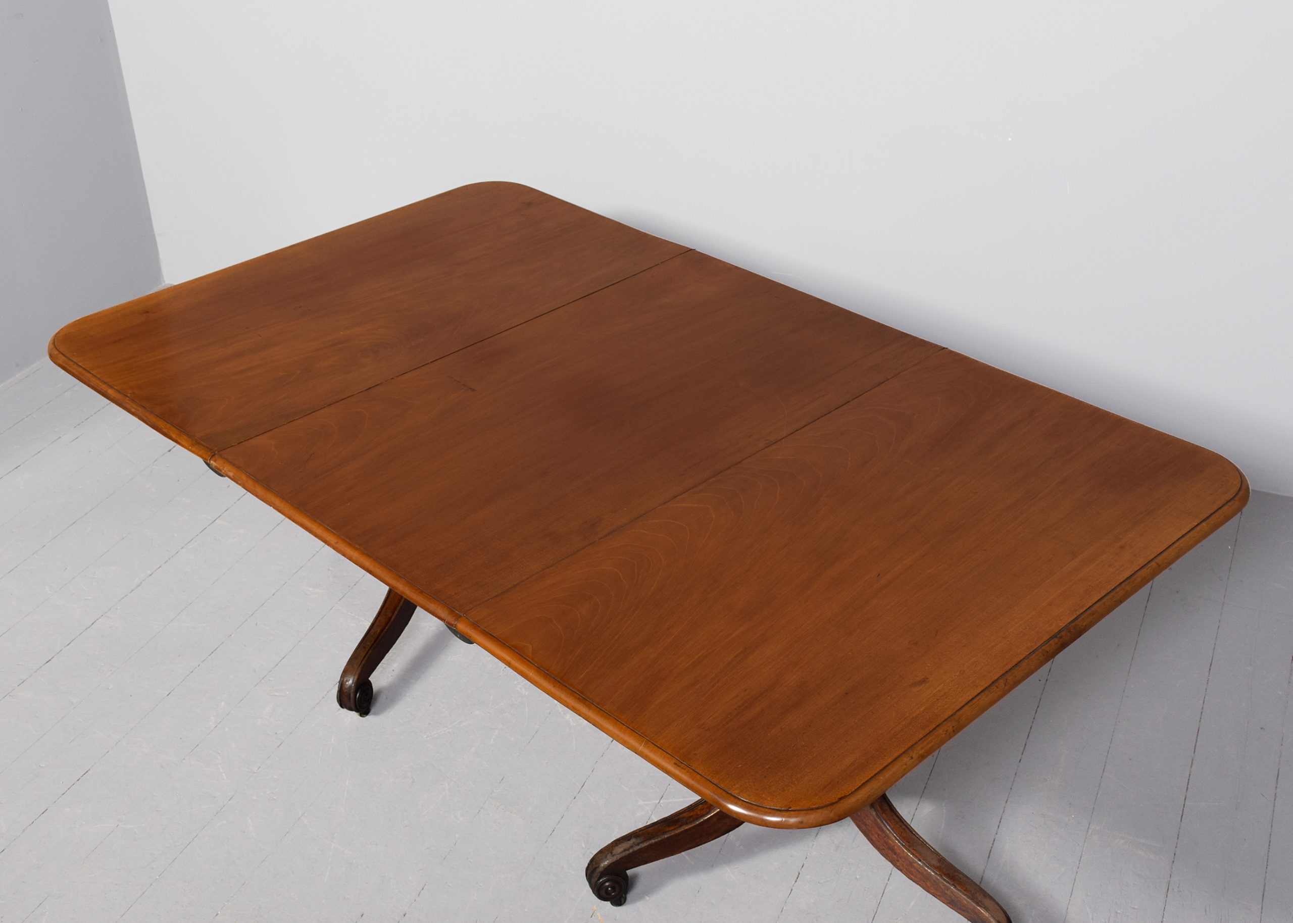 Circa 1825. A quality mahogany twin pillar dining table with extra originalleaf, the top in figured mahogany with a simple moulded fore-edge and rounded corners, the additional leaf is held in place by brass keepers and pull-out slides, resting on stylish, turned, tapering stems issuing three downward-facing saber legs with reeding on the fore-edges, finishing on a curled foot with rondels on each side, with brass castors, the table is clean, sturdy and functional.