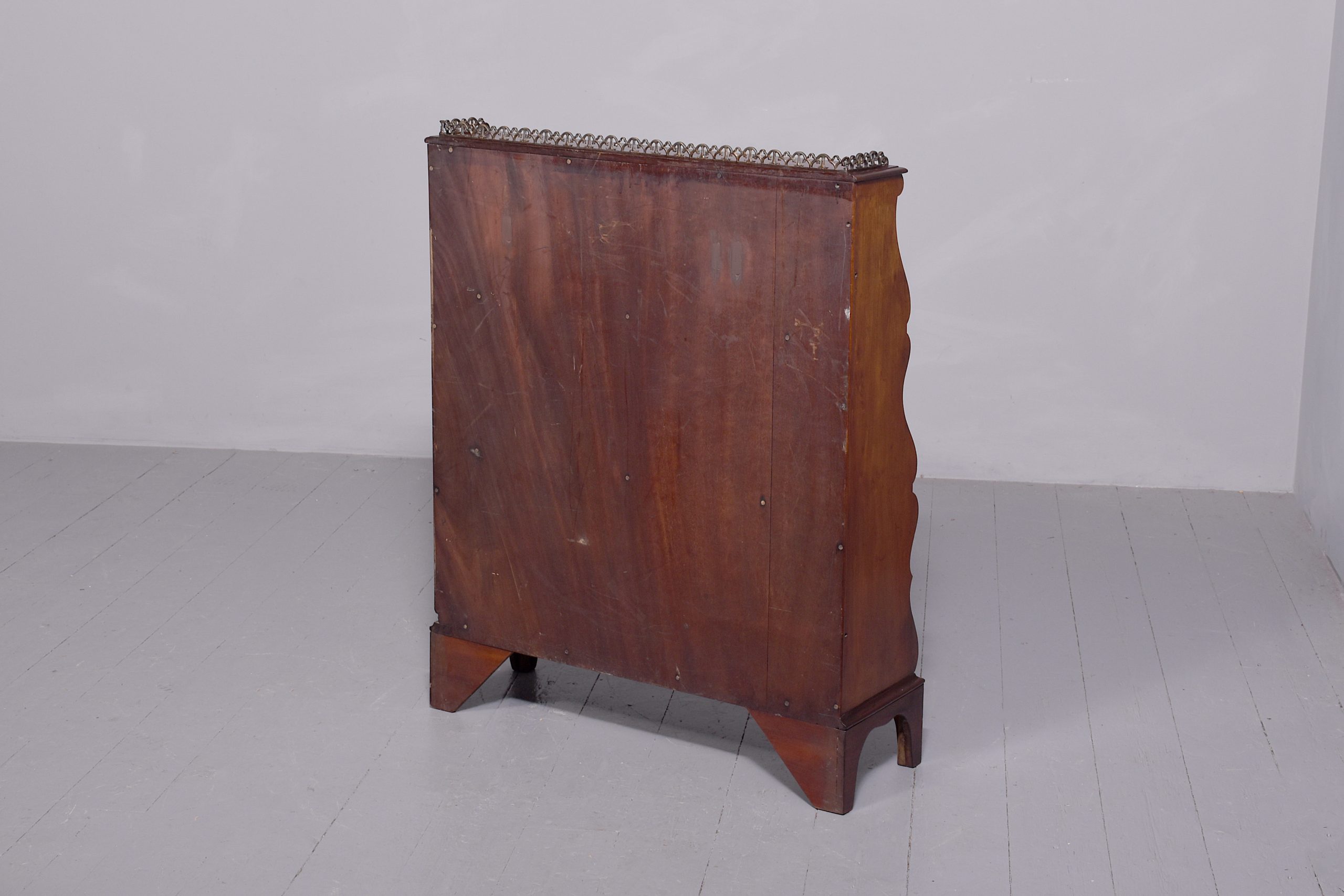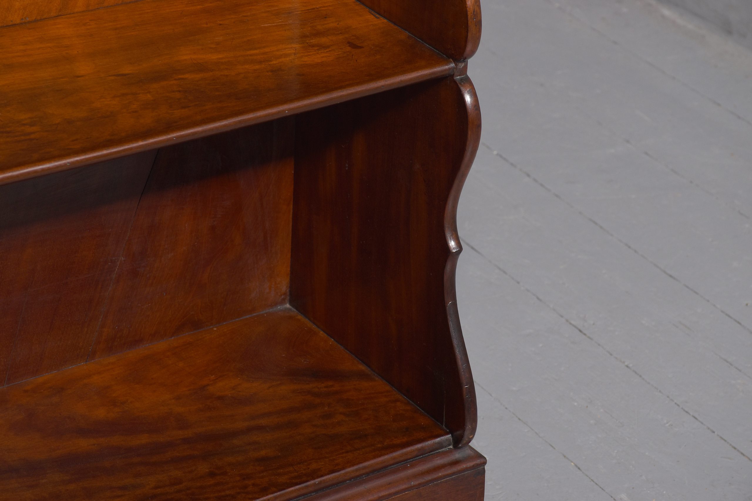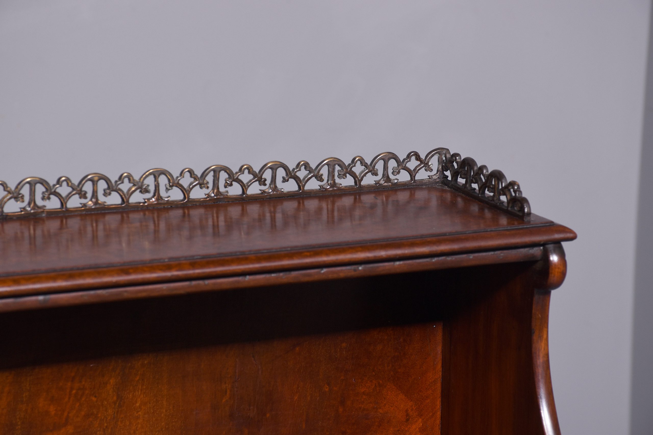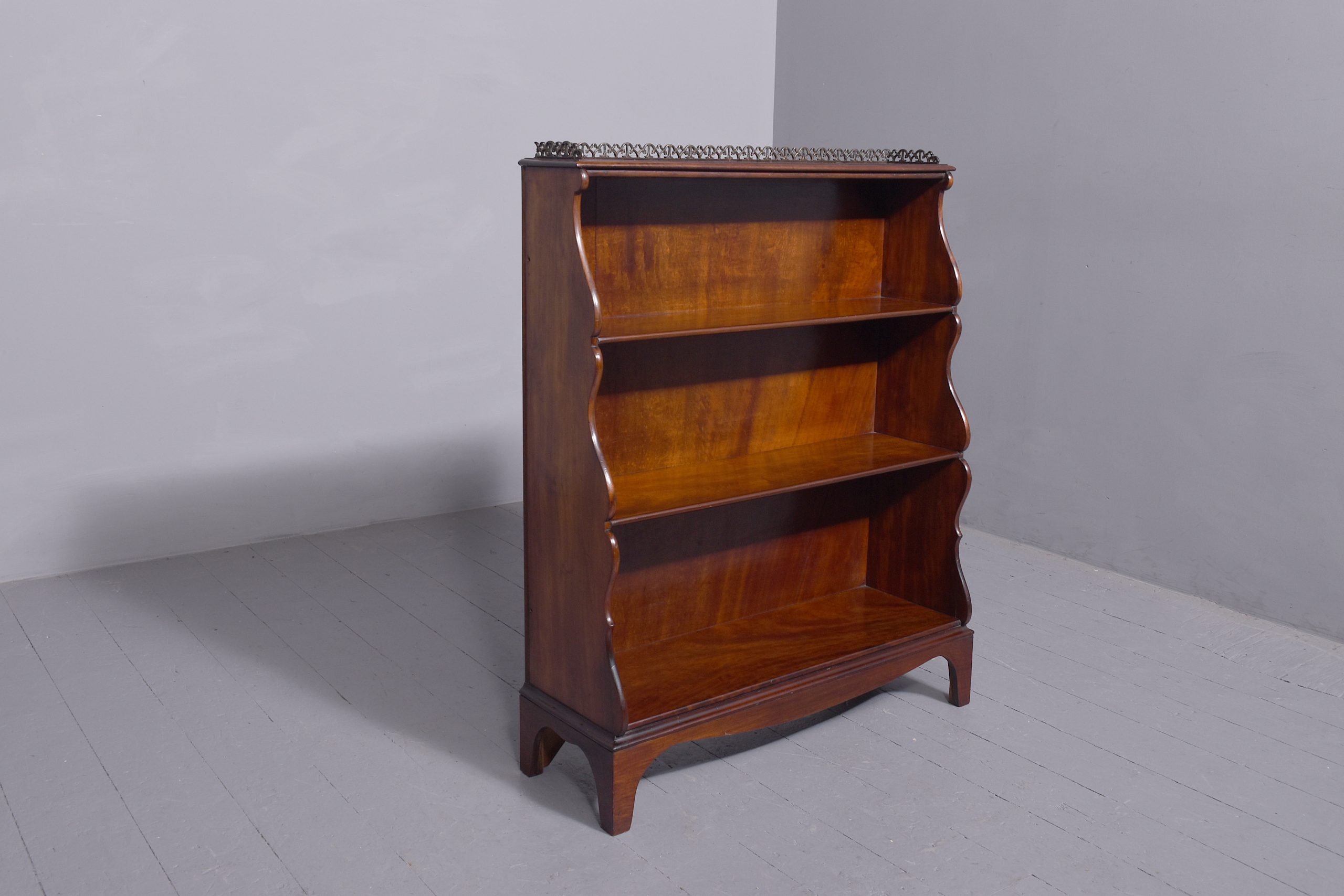 Circa 1820 and later, a George IV shaped front waterfall open front bookcase, the top with a wonderful cast and gilded pierced brass gallery and an elegant moulded fore-edge, the front with three graduating shelves with a shaped and wavy gables, beneath the bottom shelf is simple moulding and shaped frieze, resting on four French bracket feet.