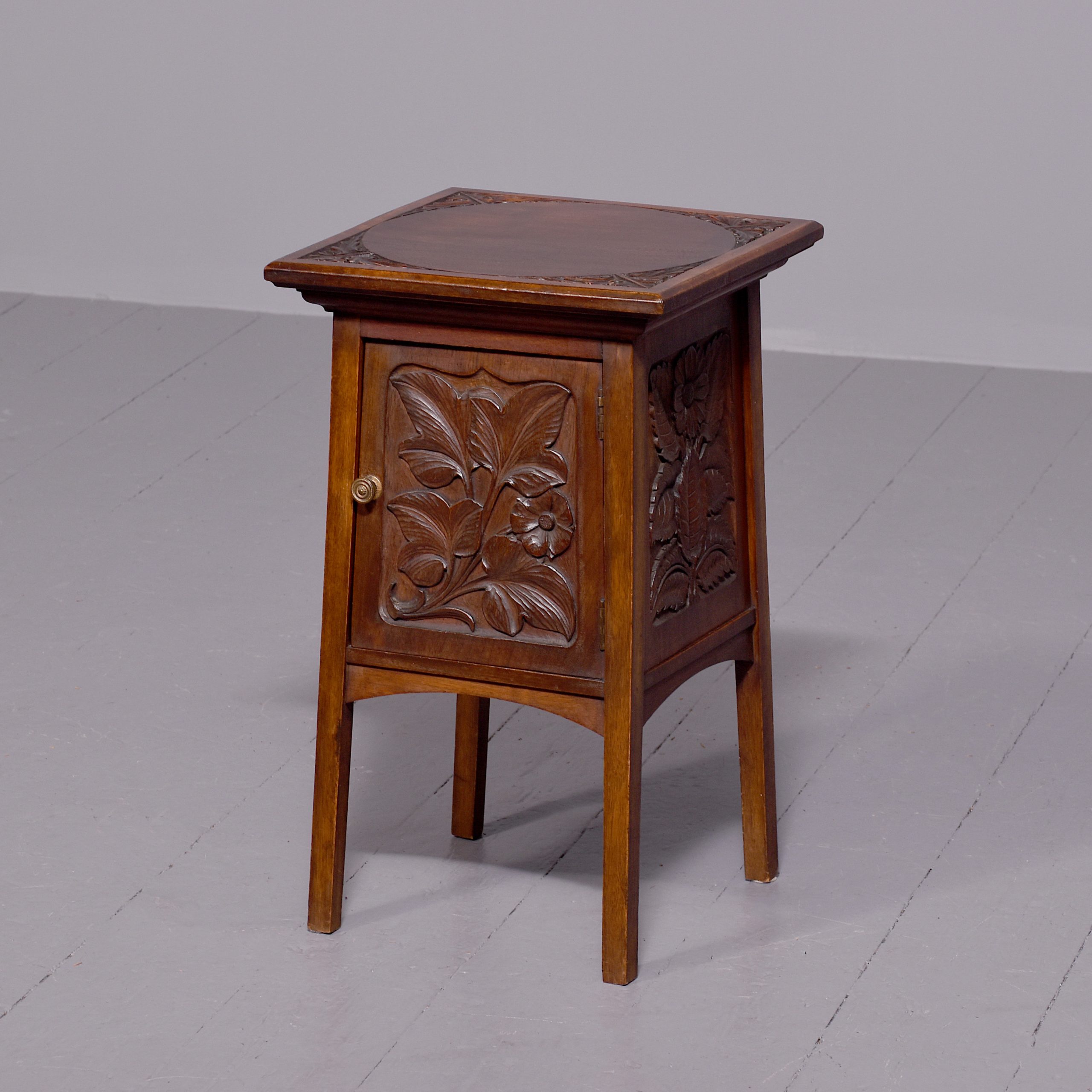 Circa 1890. Arts and Crafts neat-size, mahogany carved side table with cupboard. The rectangular top In fine figured Spanish mahogany with foliate carved margins, and a moulded rim above a finely foliate-carved single door with flowers and a brass handle, opening to cupboards. The sides and back carved with different flowers including thistles (Scottish made?). All supported on tapering square legs.