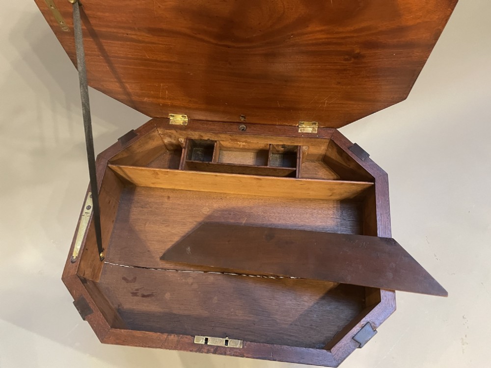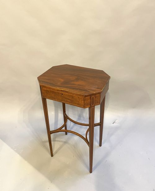 Early C19th figured mahogany with boxwood stringing of lozenge shape, the hinged top revealing interior with compartment and drawer, raised on tapering supports united by convex stretchers.