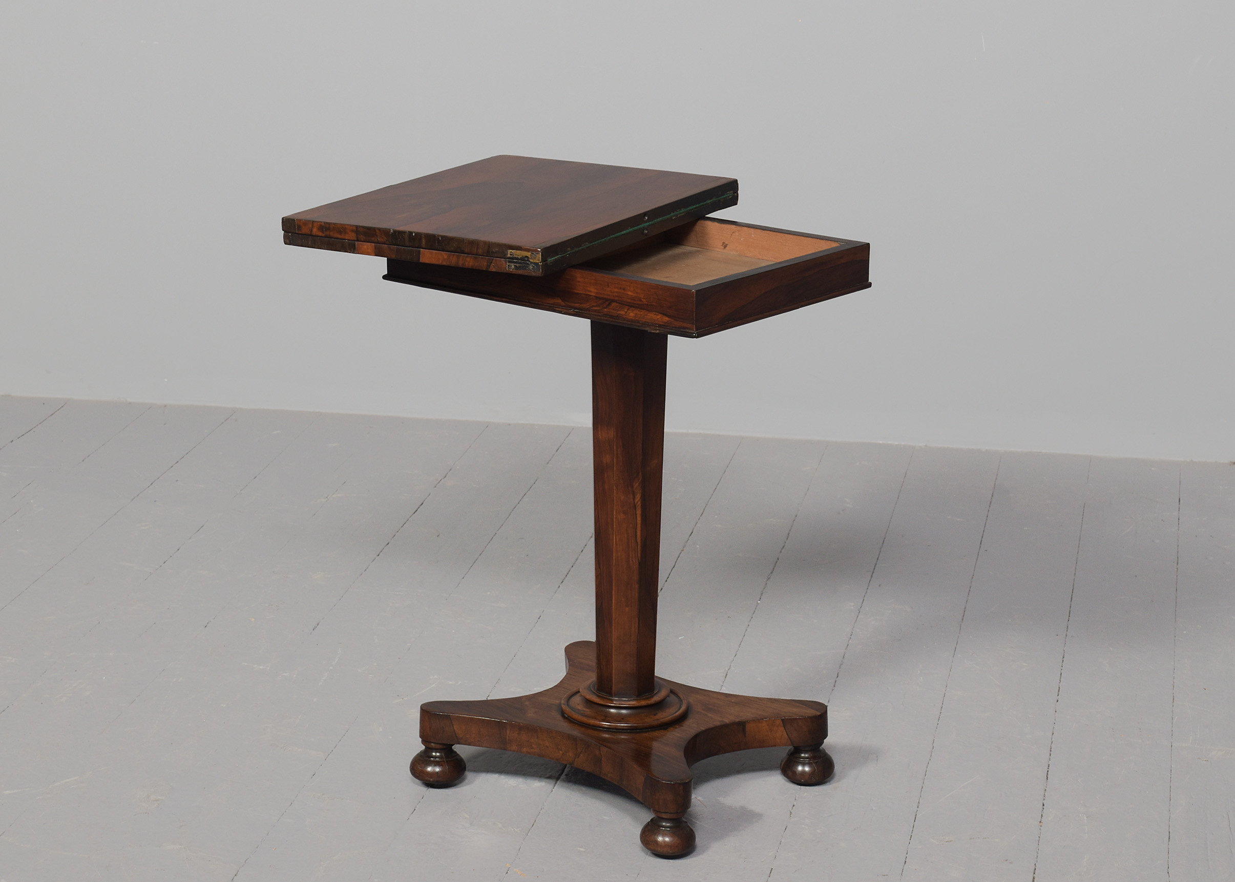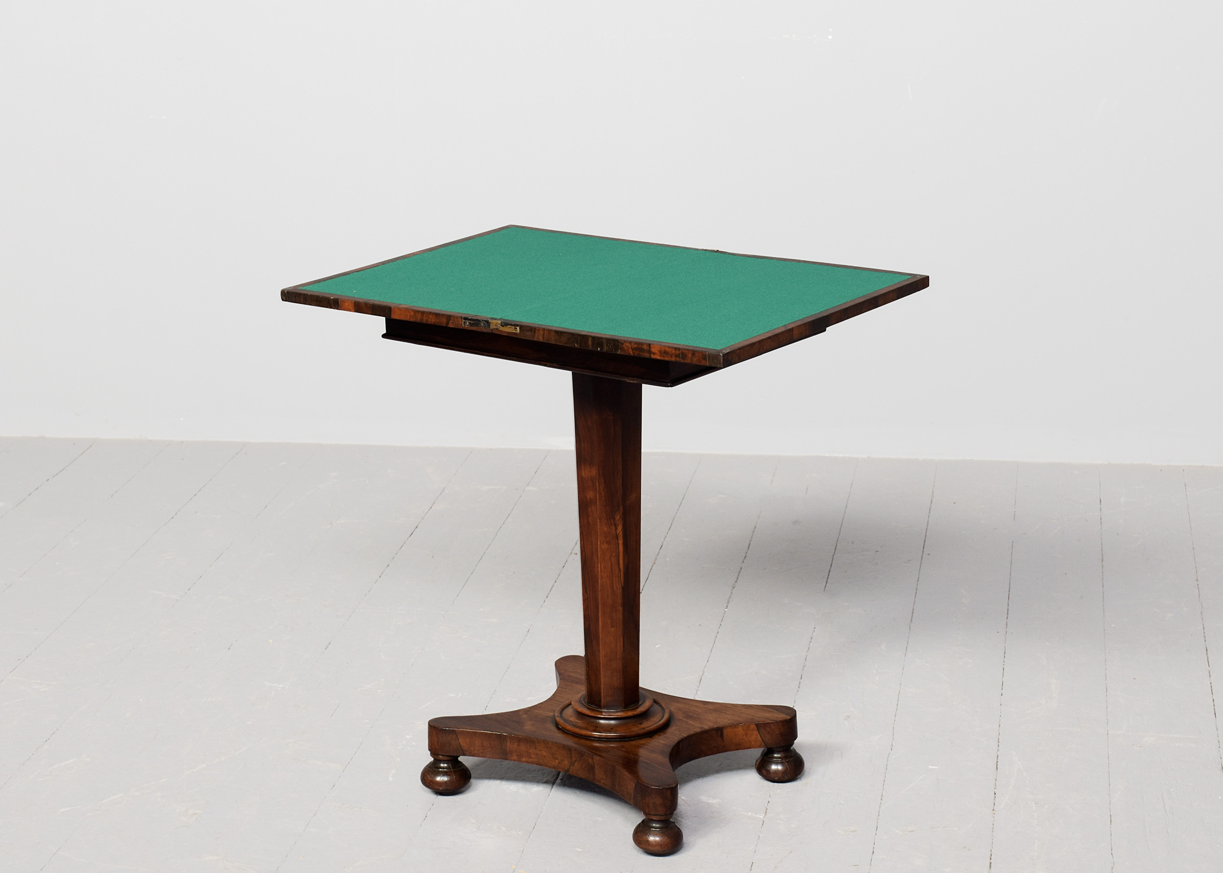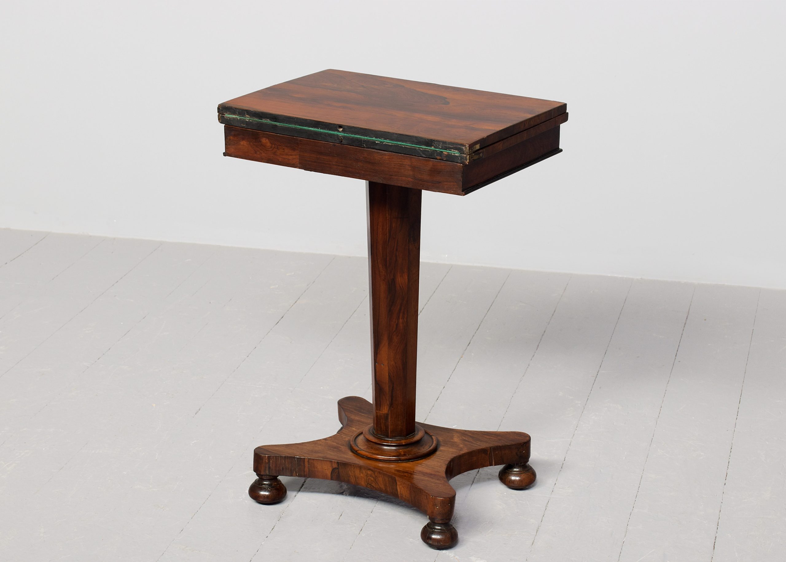 Circa 1825. A quality George IV Rosewood turnover card table of diminutive proportions, the rectangular top in finely figured rosewood with simple fore-edge, is hinged and swivels and opens to reveal a felt-lined interior, crossbanded in rosewood with small storage beneath the top, with a beaded frieze, supported on a tapering rosewood octagonal column, on a concave quatrefoil platform base with a circular bezel, resting on four squat bun feet with original concealed castors.