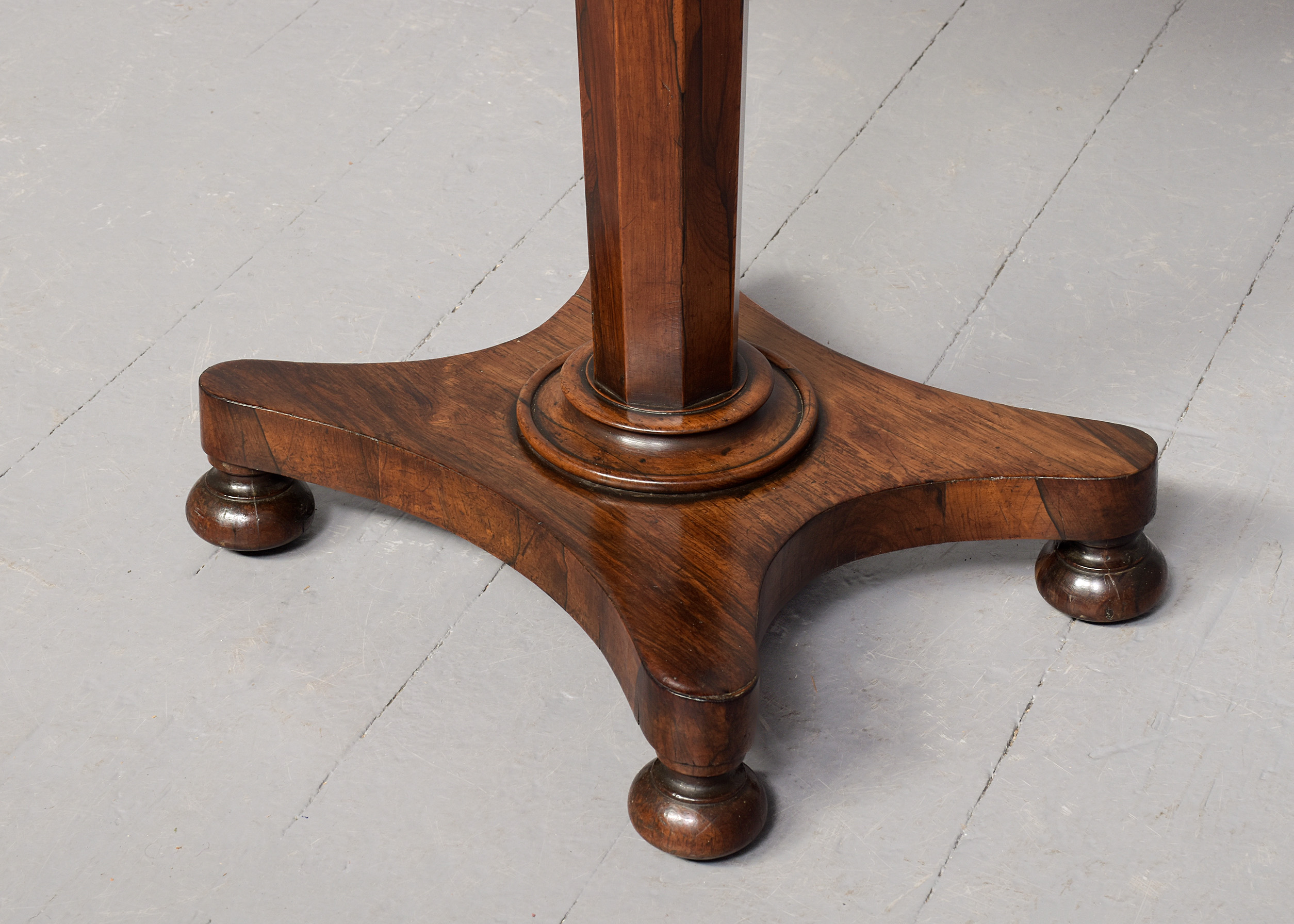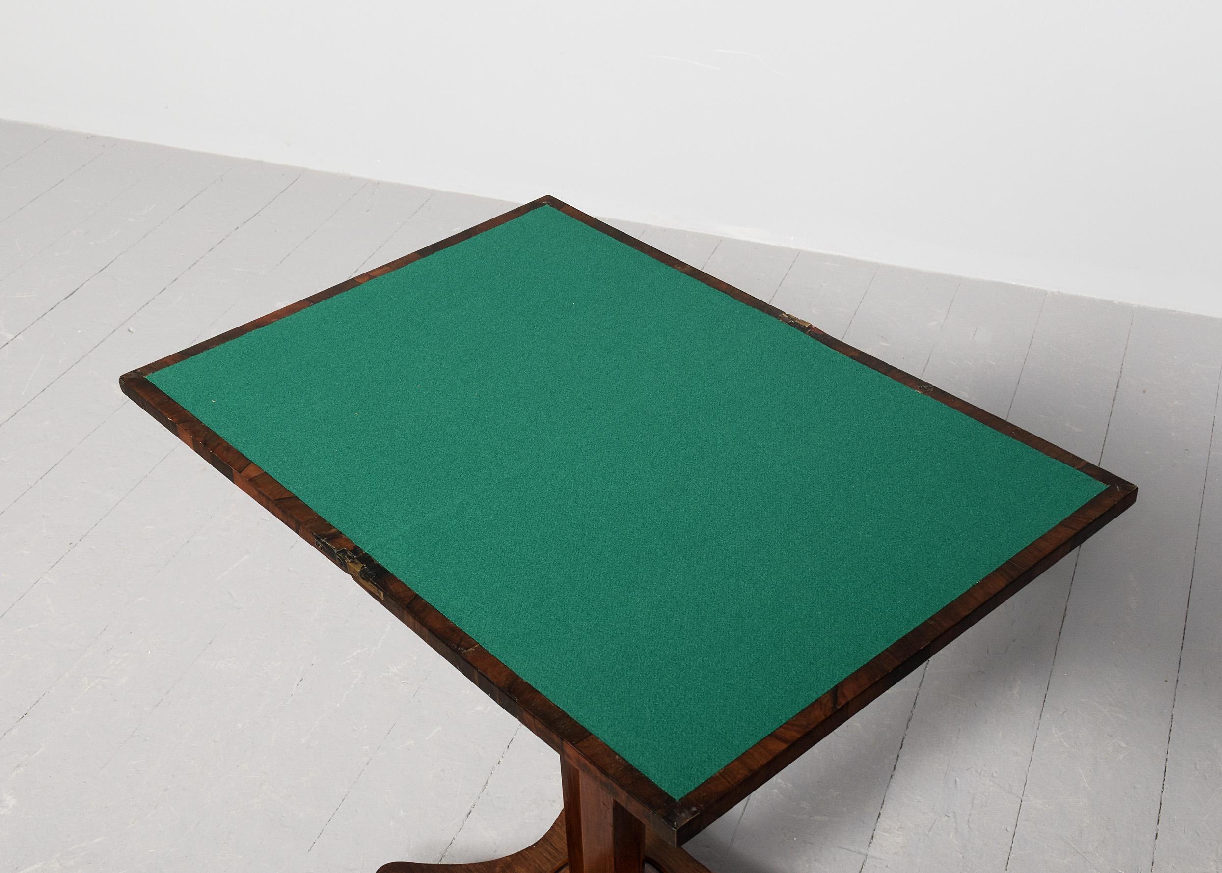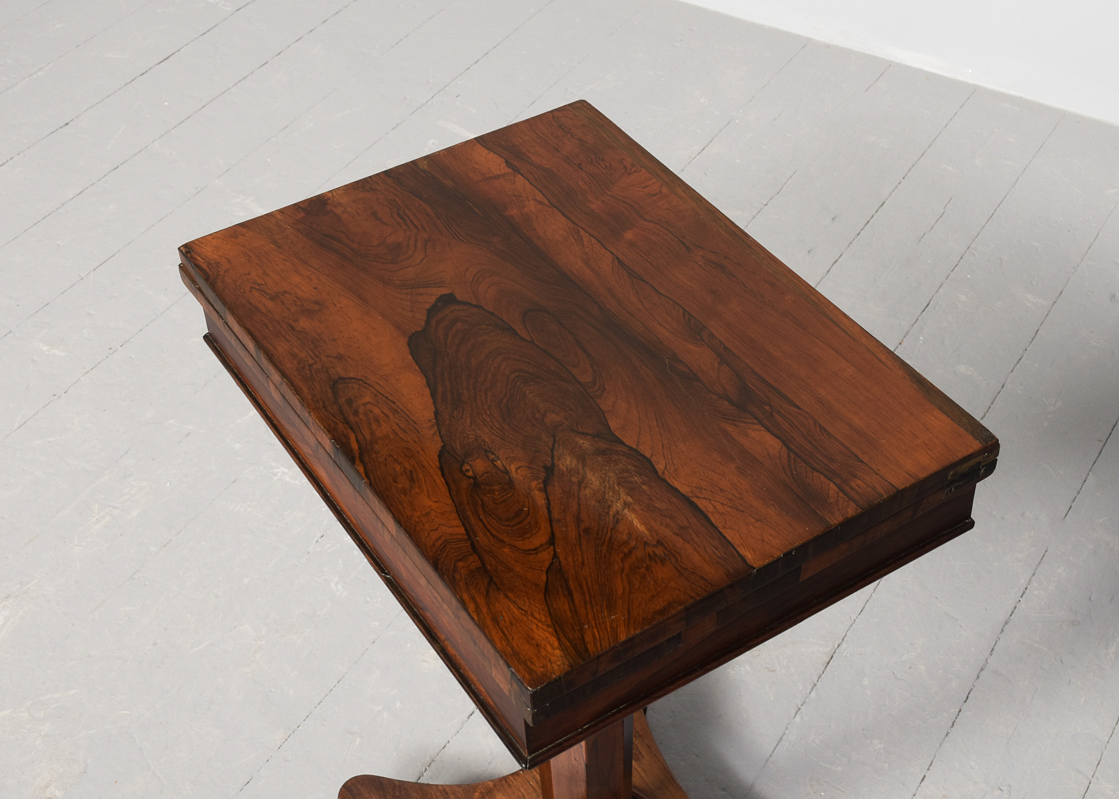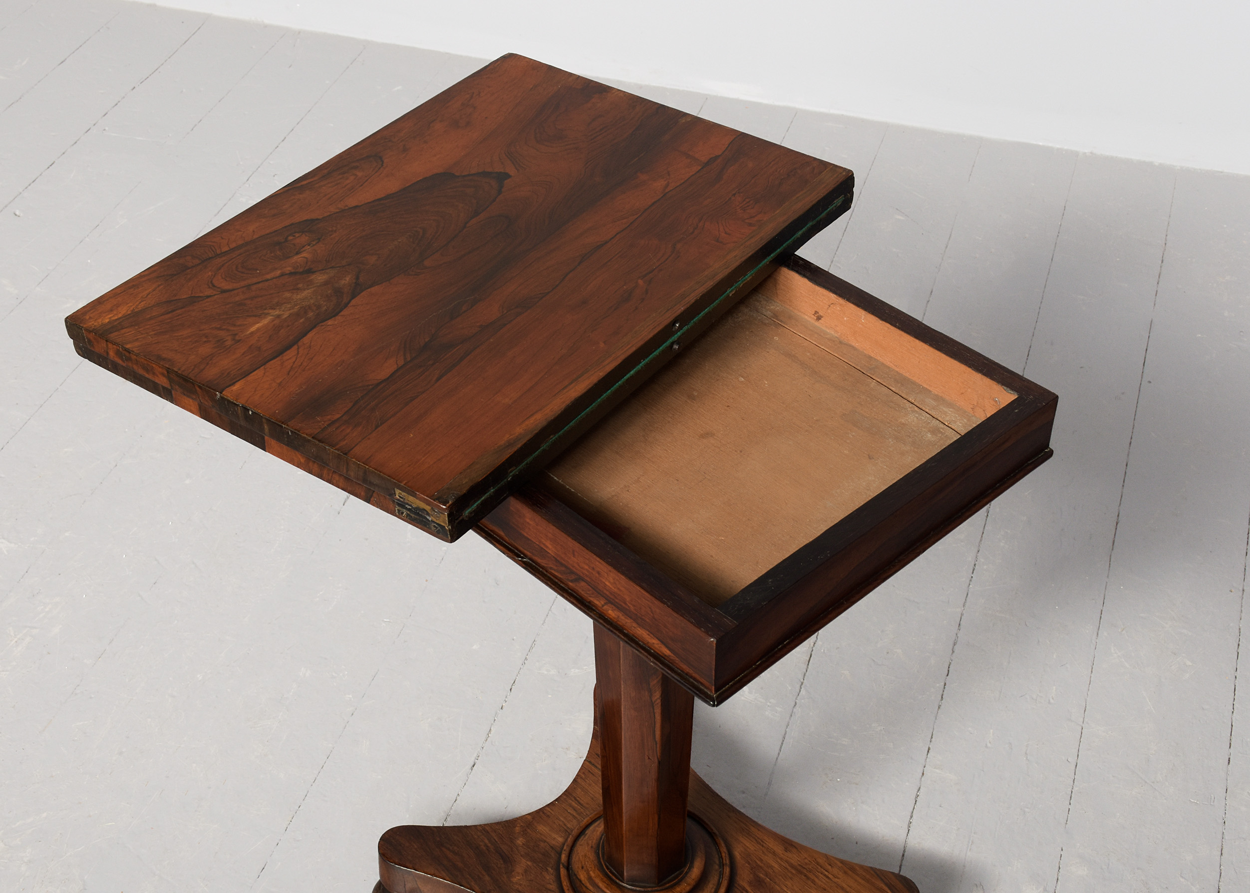Circa 1825. A quality George IV Rosewood turnover card table of diminutive proportions, the rectangular top in finely figured rosewood with simple fore-edge, is hinged and swivels and opens to reveal a felt-lined interior, crossbanded in rosewood with small storage beneath the top, with a beaded frieze, supported on a tapering rosewood octagonal column, on a concave quatrefoil platform base with a circular bezel, resting on four squat bun feet with original concealed castors.