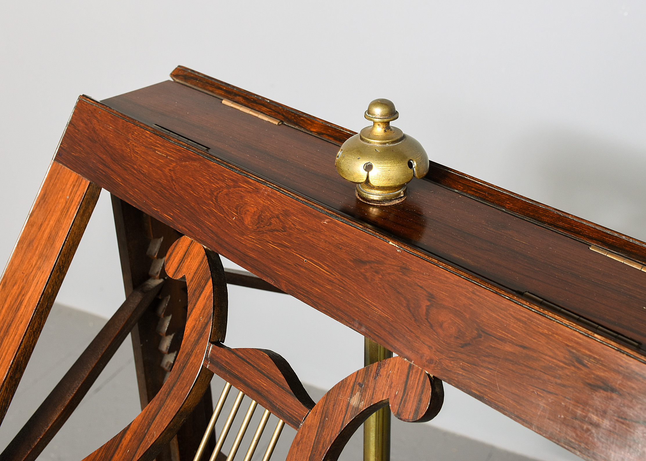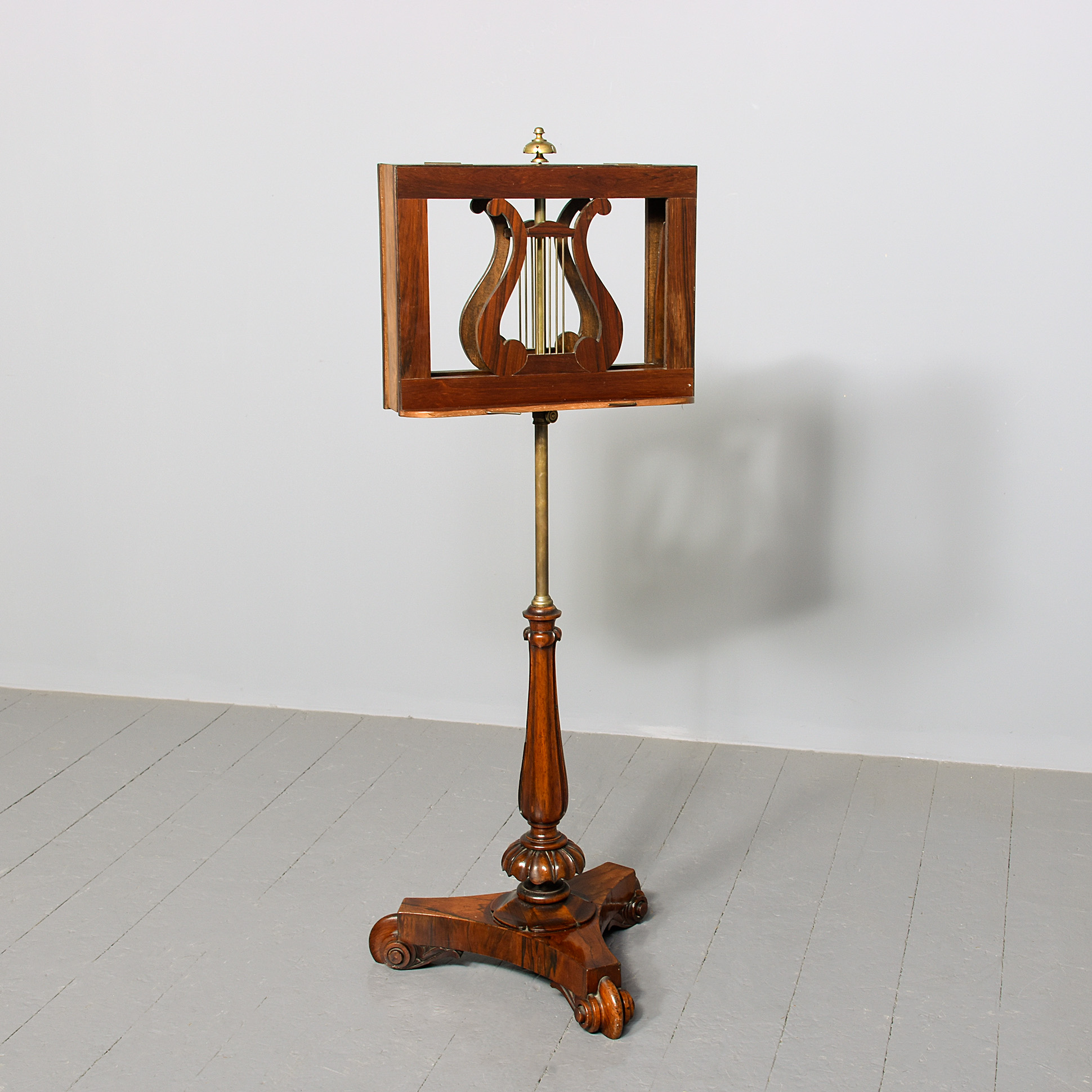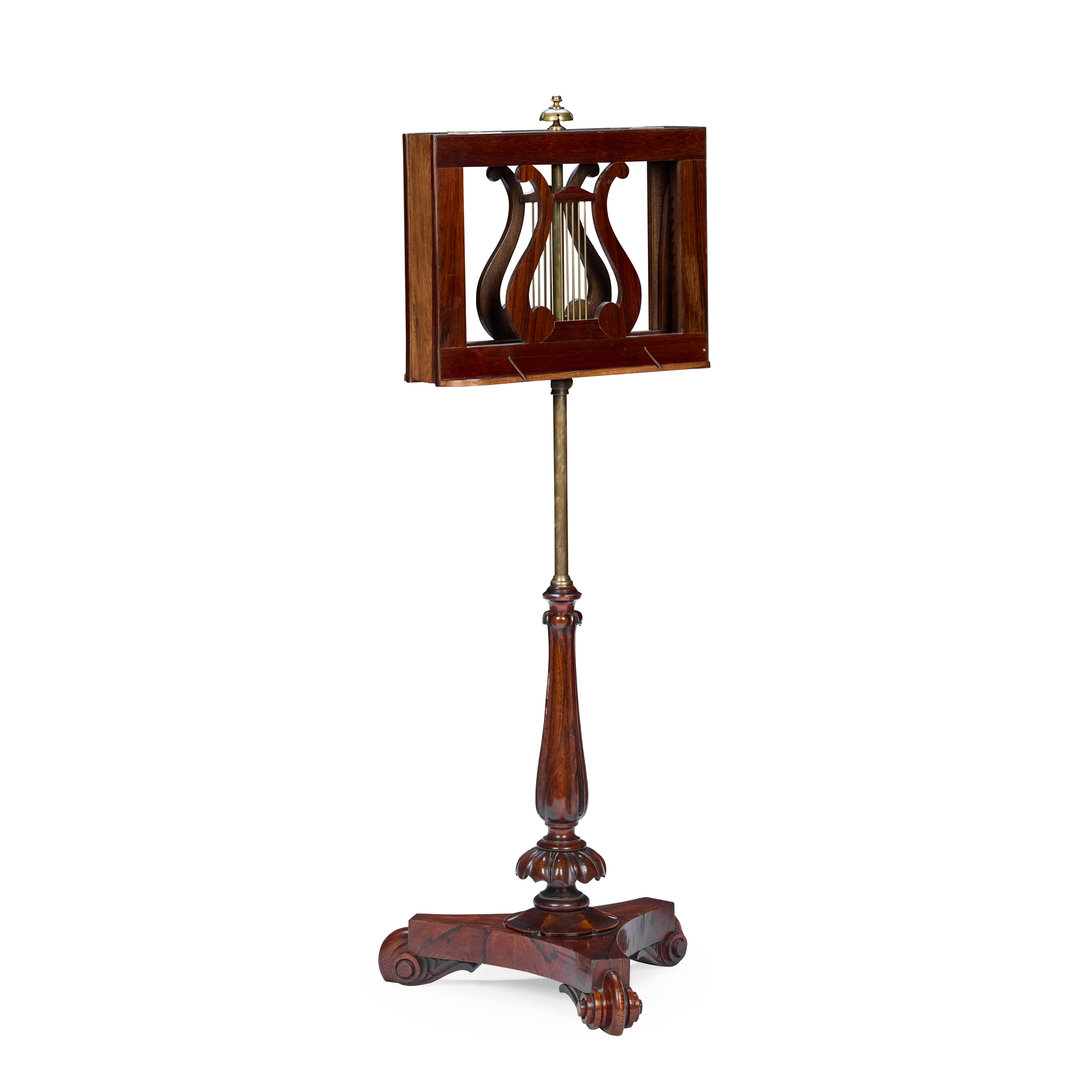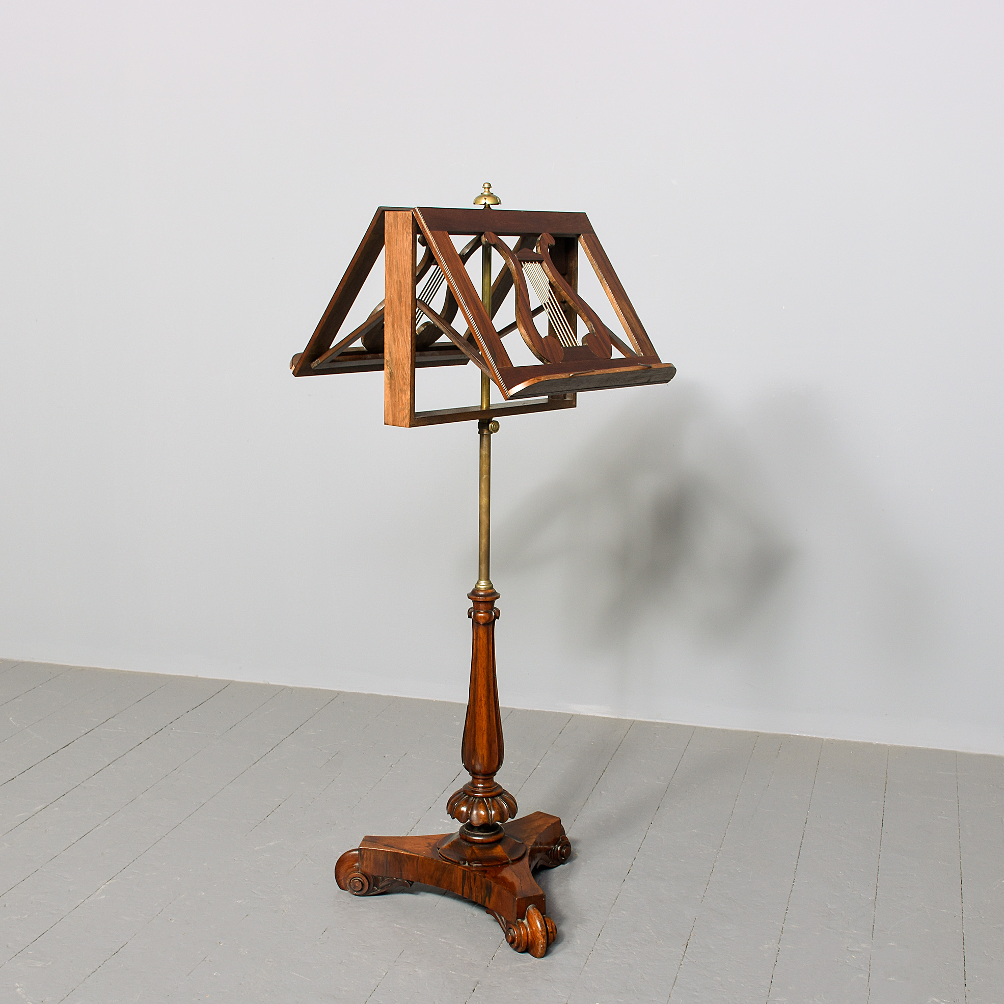 Circa 1825. A quality George IV Rosewood and brass duet stand, the rectangular top with a pair of sheet music brackets which are adjustable surmounted by a cast brass finial, centered with pair of rosewood shaped lyres with brass strings and a small lip with brass rods for holding the sheet music in place, supported on a brass rail, resting on a fluted tapering stem with foliate carving towards the base, all on a tripartite concave platform base supported on scrolling toes.