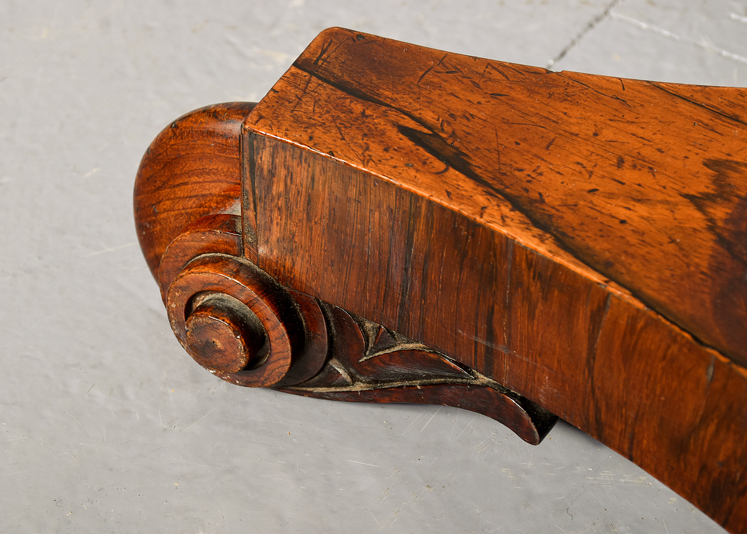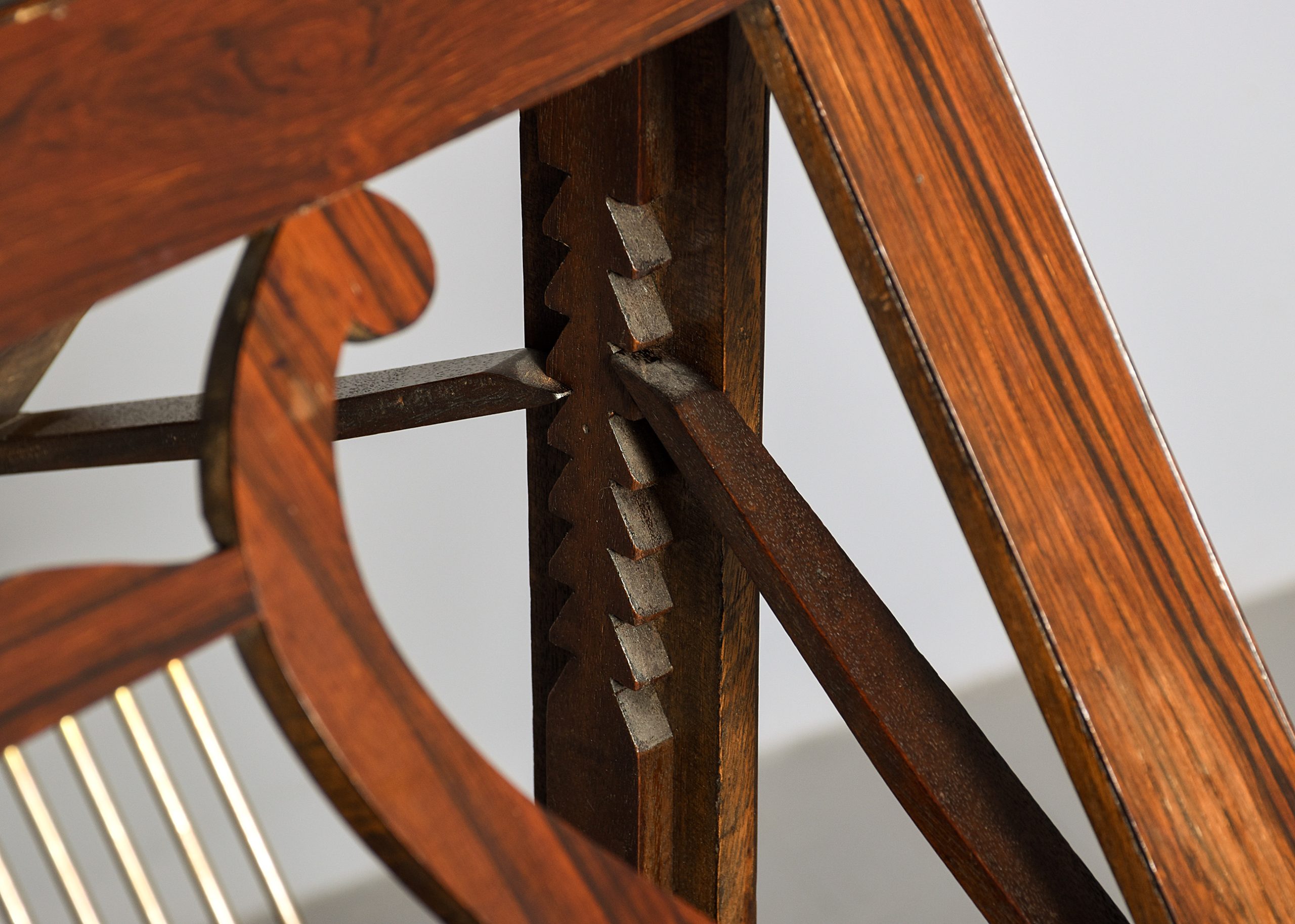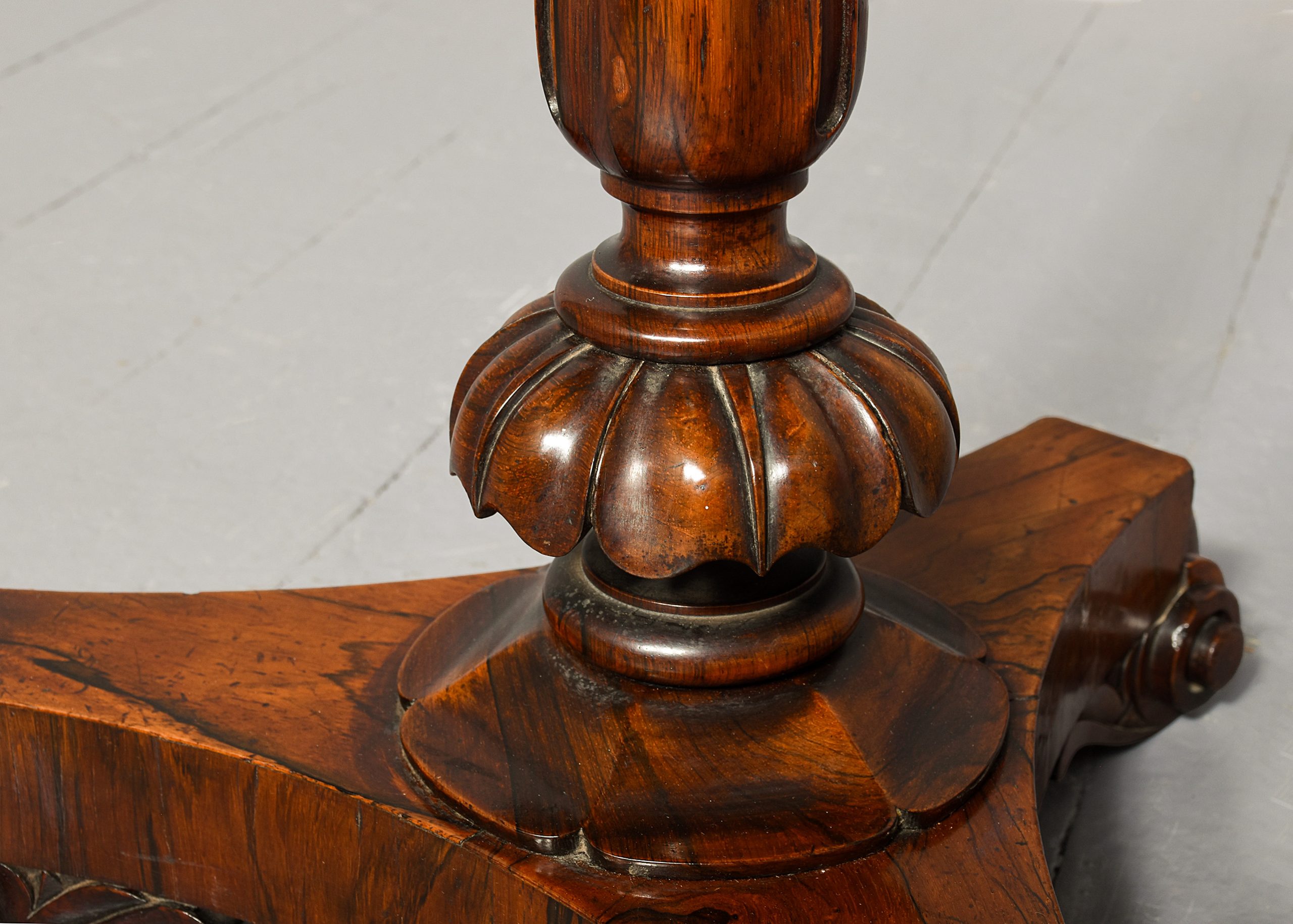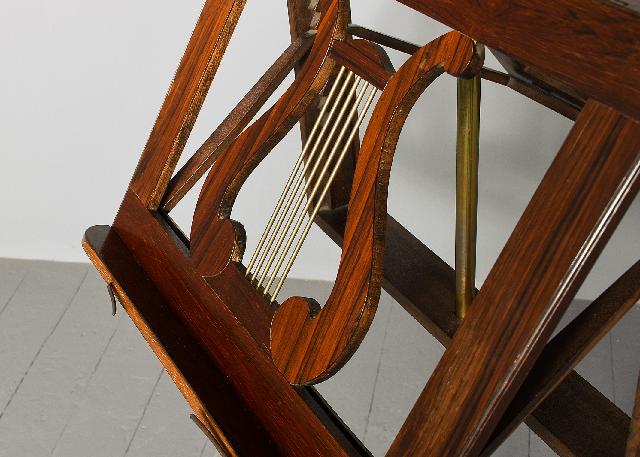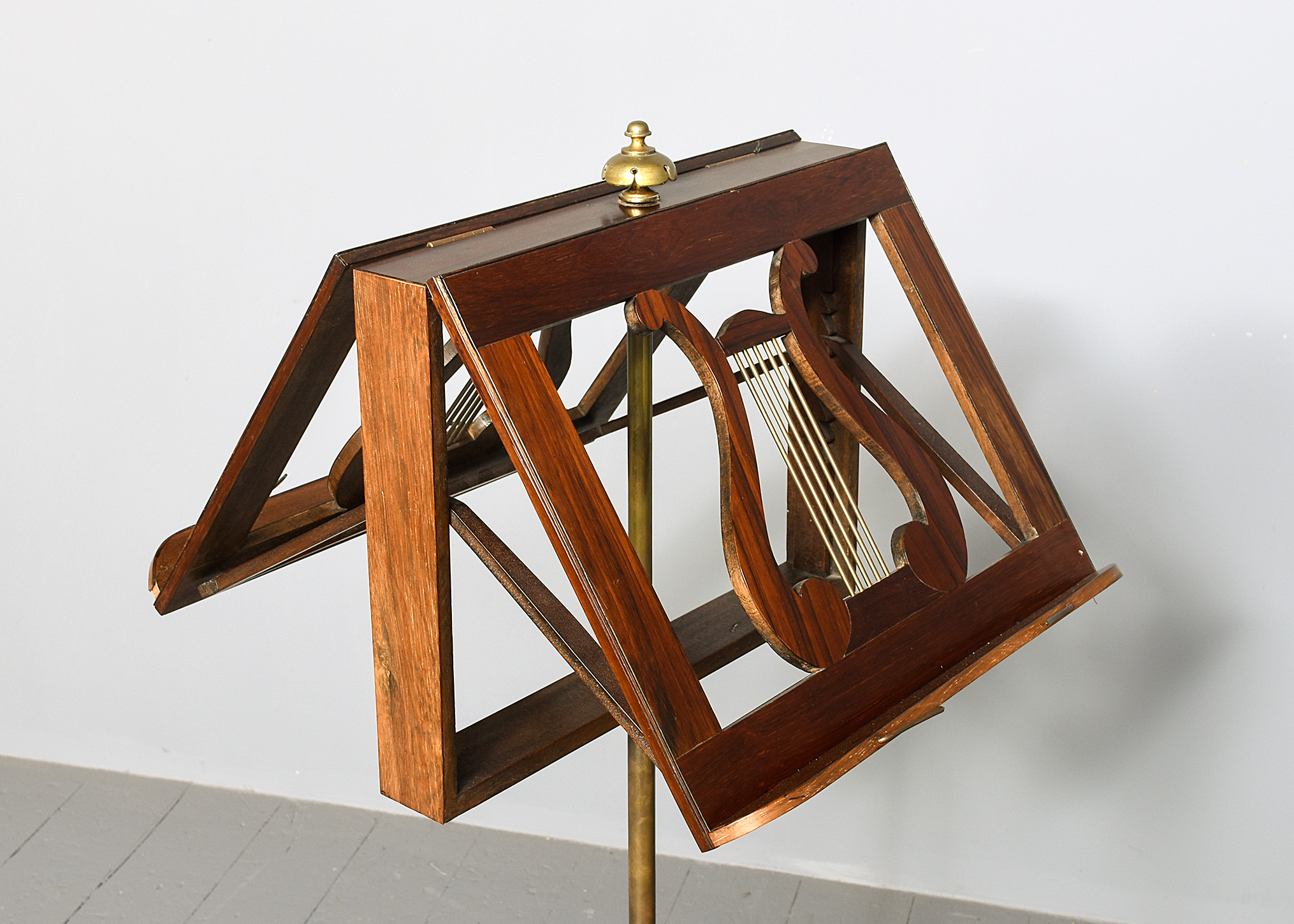 Circa 1825. A quality George IV Rosewood and brass duet stand, the rectangular top with a pair of sheet music brackets which are adjustable surmounted by a cast brass finial, centered with pair of rosewood shaped lyres with brass strings and a small lip with brass rods for holding the sheet music in place, supported on a brass rail, resting on a fluted tapering stem with foliate carving towards the base, all on a tripartite concave platform base supported on scrolling toes.