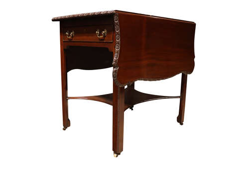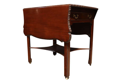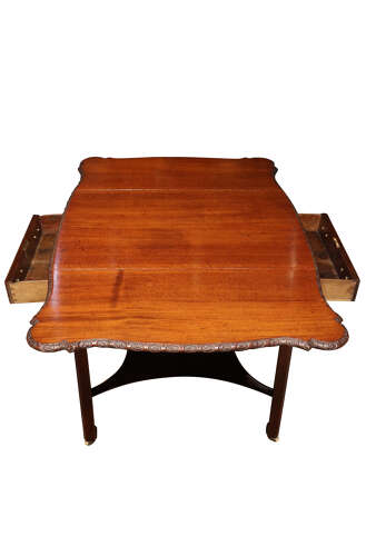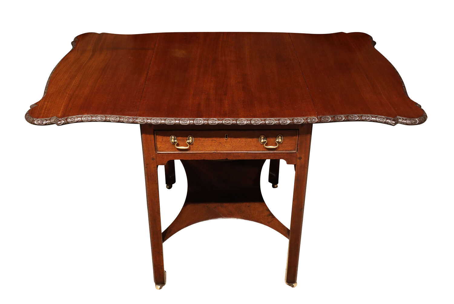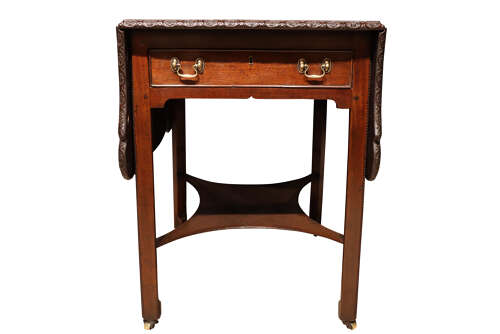 A fine Georgian drop-leaf occasional table constructed in richly coloured Cuban mahogany, the rectangular top fitted with hinged leaves and finished with a crisply carved moulded edge, centred by a repeating rosette motif.