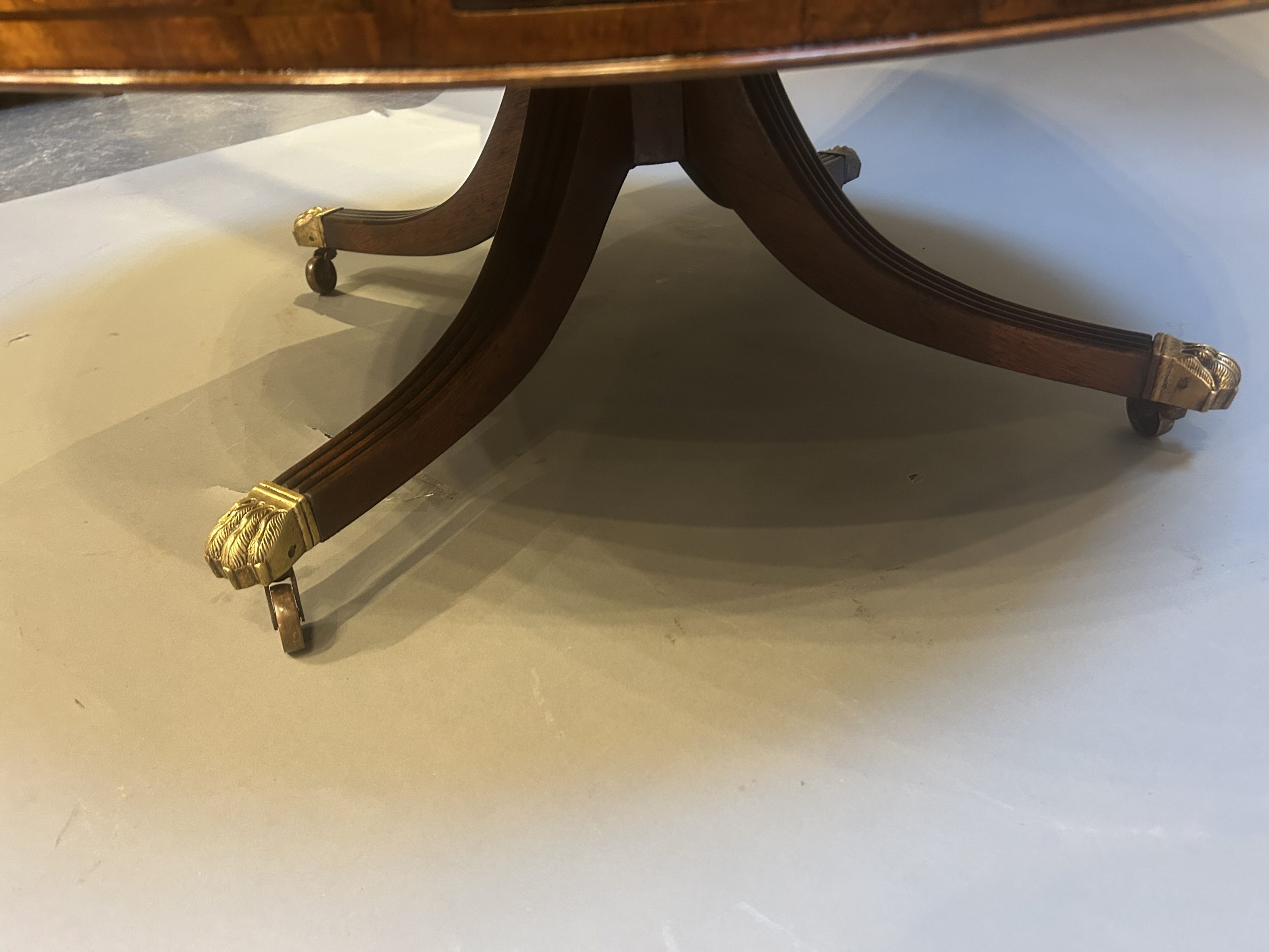 In the Georgian taste, figured mahogany inset with leather lining , the deep frieze fitted 4 drawers with ring pull handles raised on (adapted) quatraform base of 4 swept legs to brass castors.