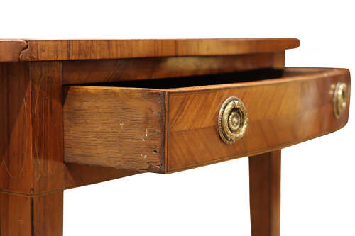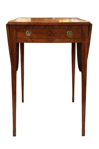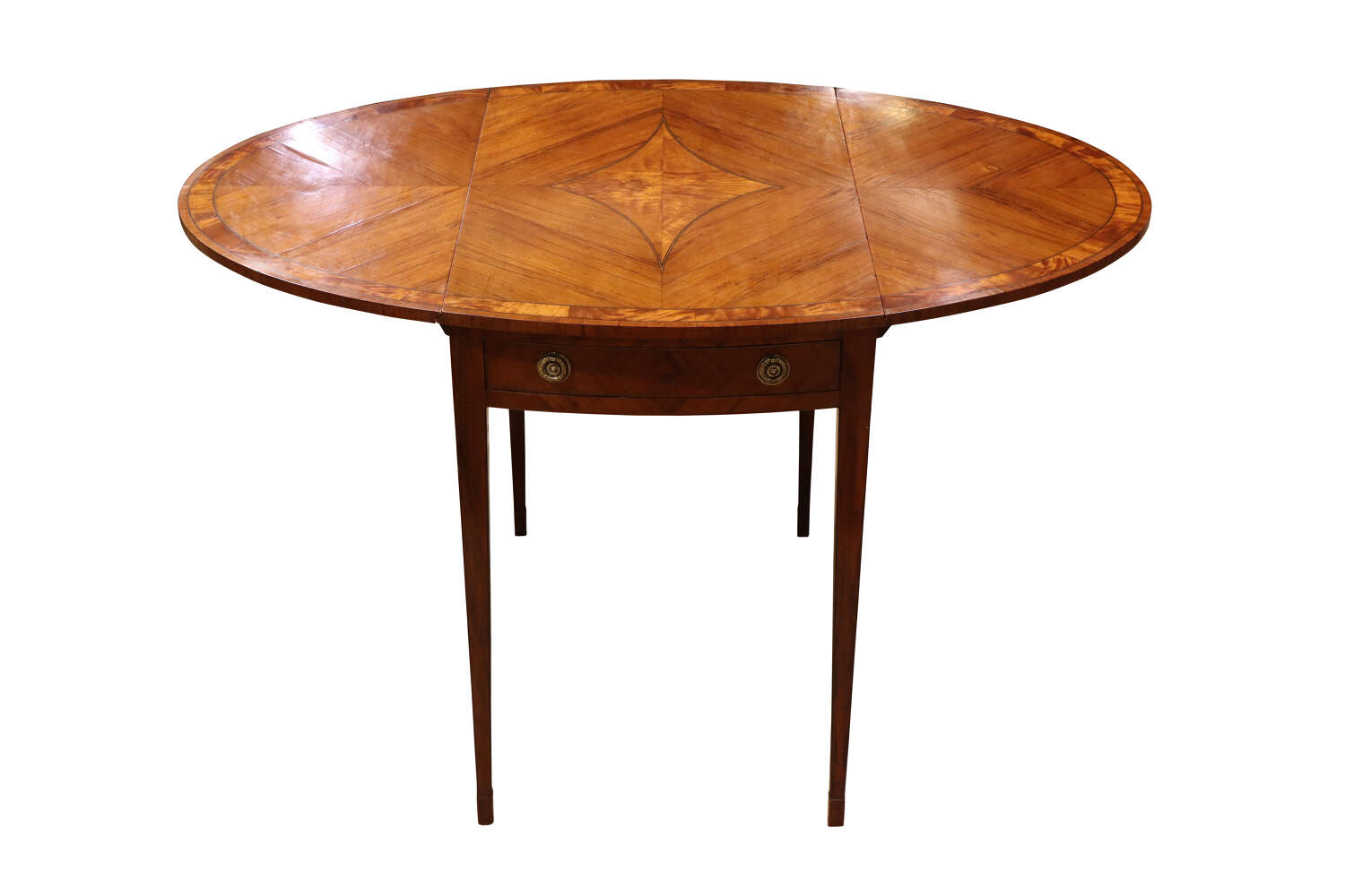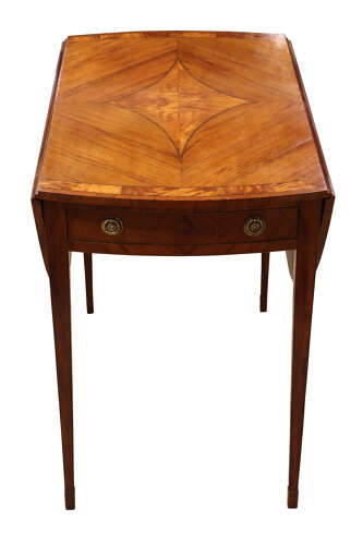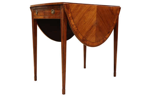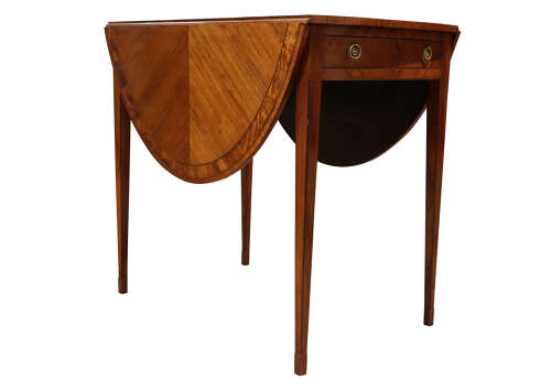 A fine late Georgian Pembroke table, the well-figured kingwood top inlaid with satinwood banding and diamond-shaped panel to the centre. The twin drop-leaves supported by hinged brackets, over a single frieze drawer fitted with gilt-brass rosette handles and matched by a dummy drawer to the reverse. Raised on elegant square tapering legs with line inlay.