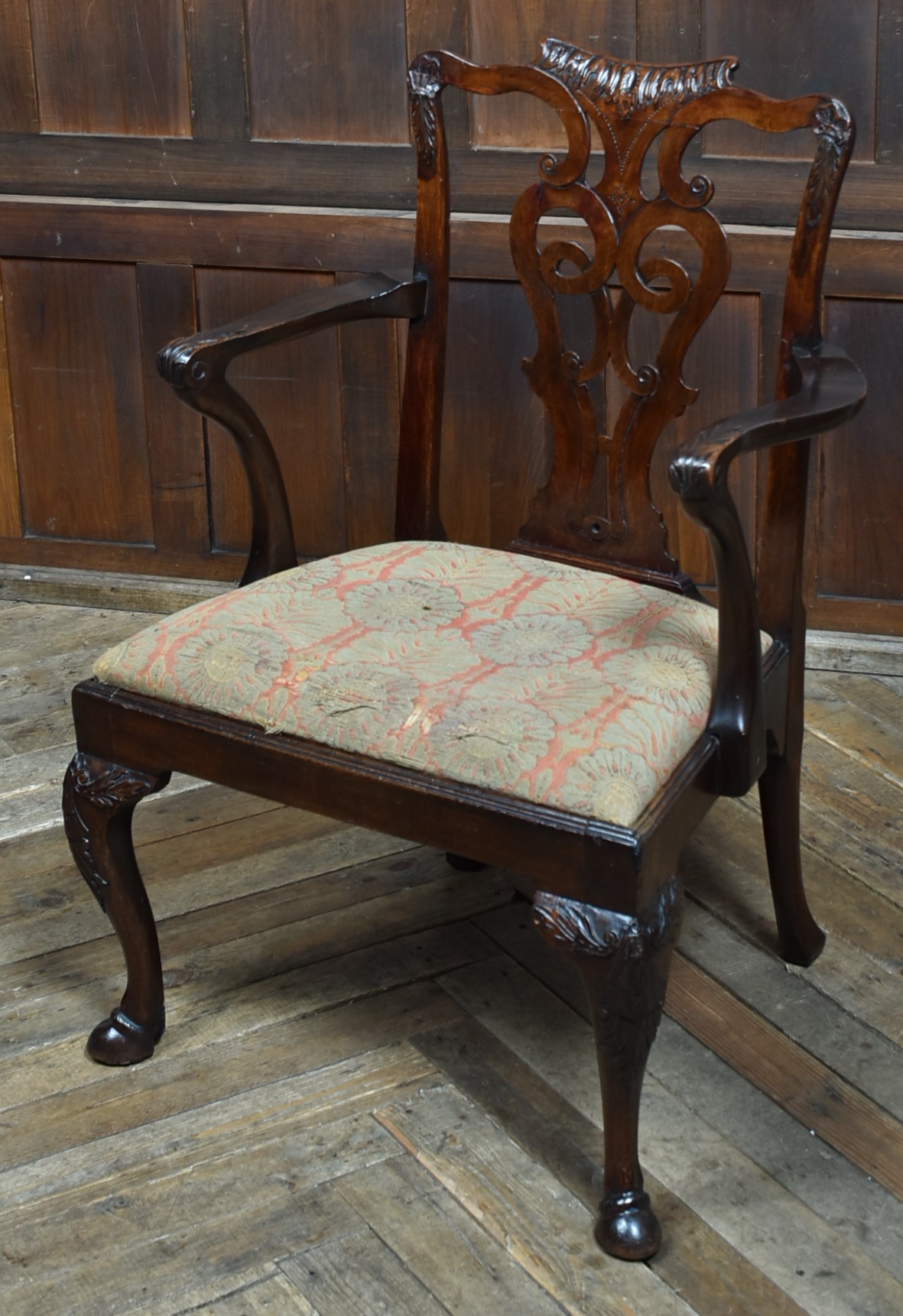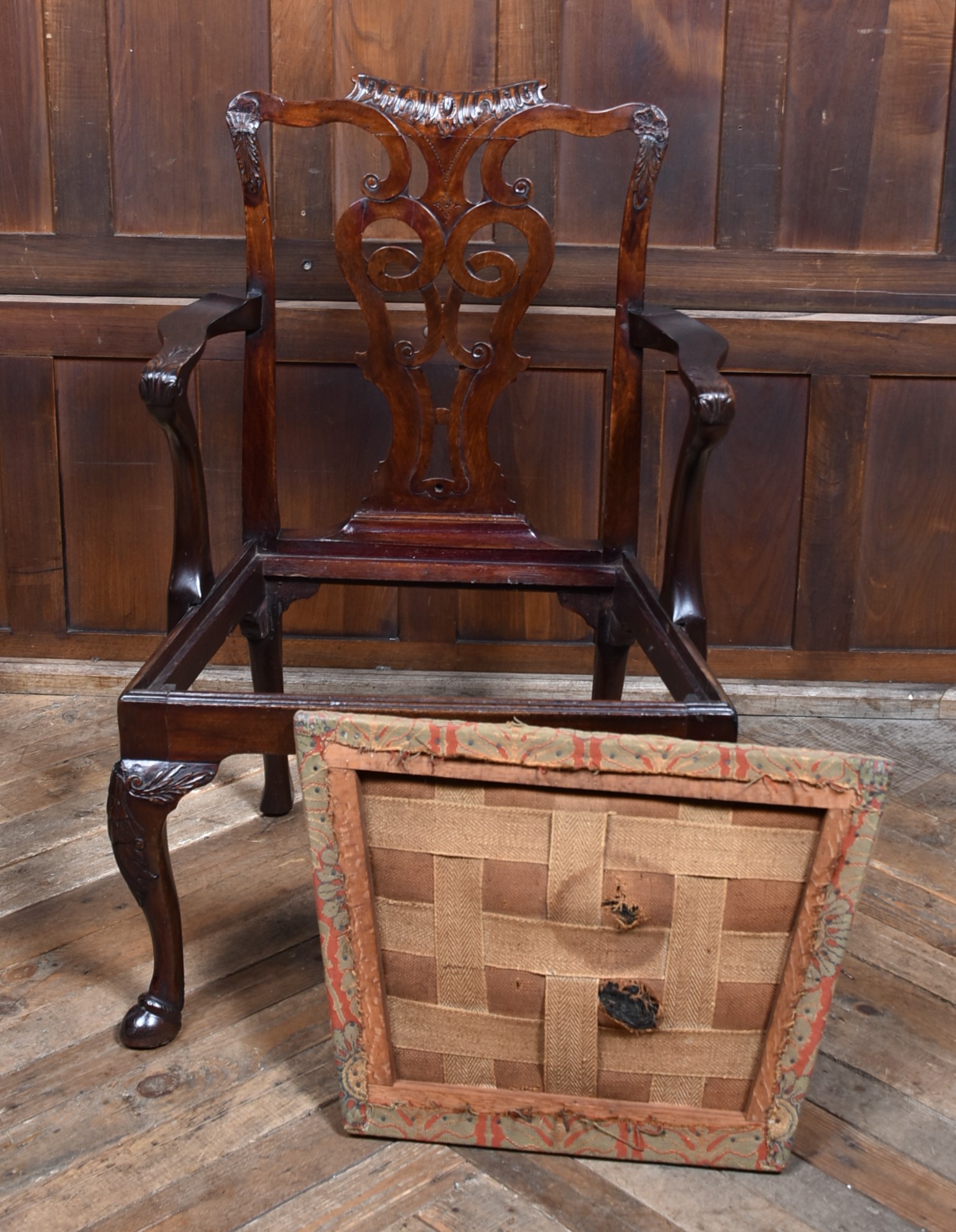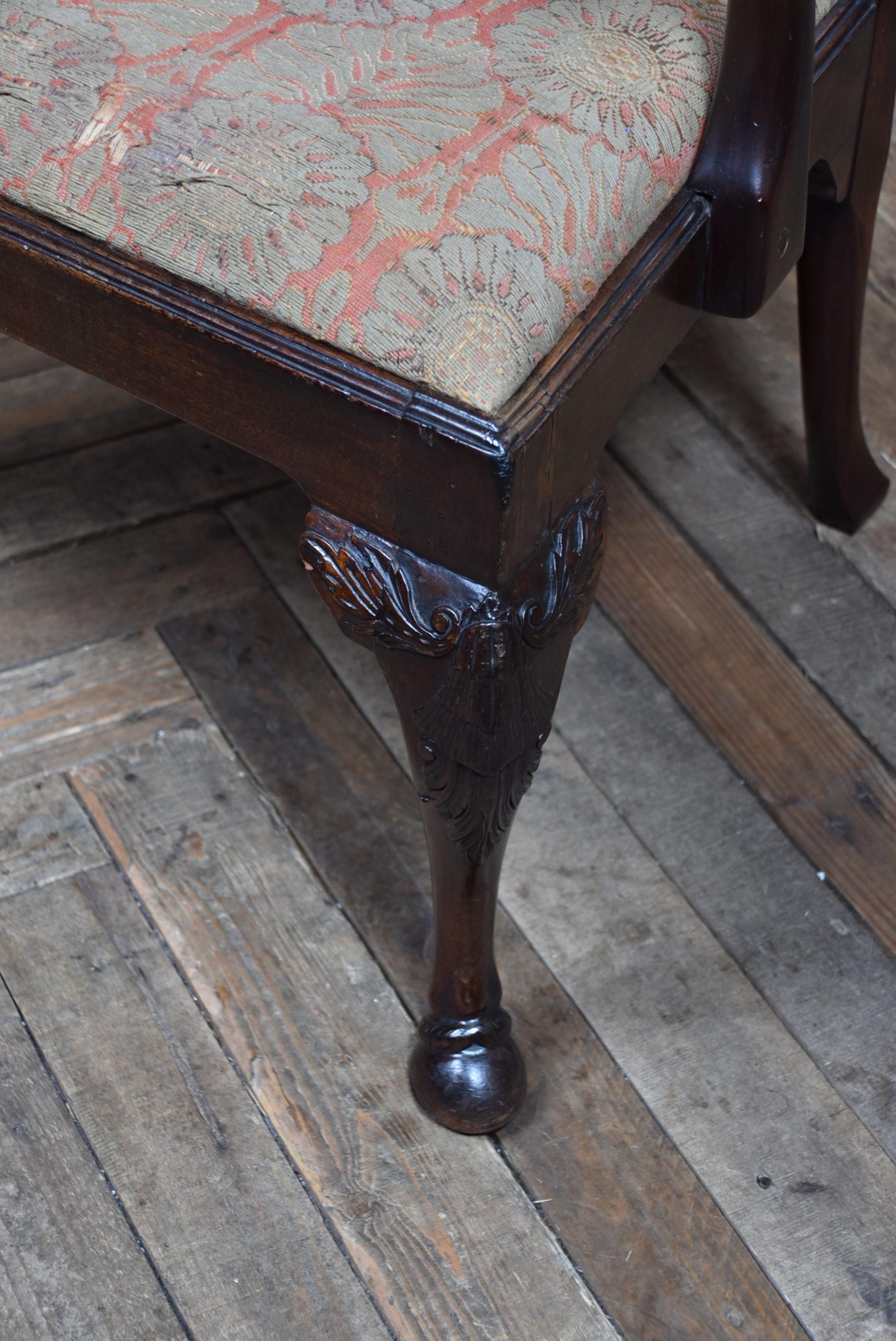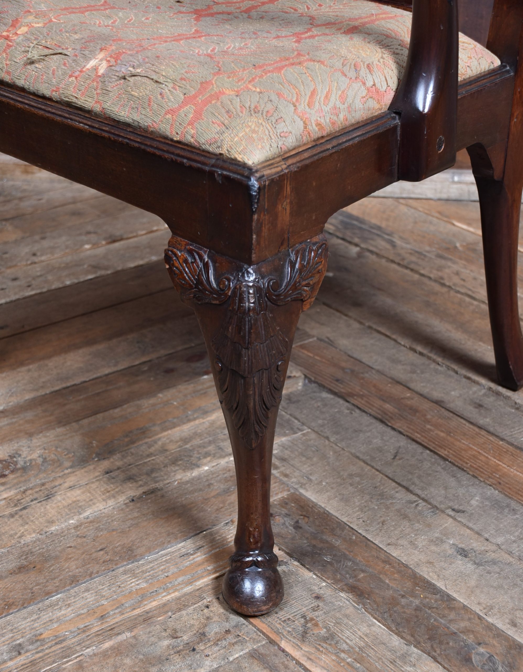 A Georgian mahogany bedroom chair with a finely carved back and elegant cabriole legs, the front pair enriched with carved knees that flow into distinctive hoof feet. The seat height is 47cm, and the drop-in seat pad is straightforward to re-cover to suit individual taste. A graceful and well-proportioned piece that brings period charm and decorative detail to any interior.
